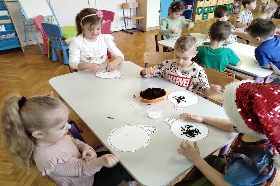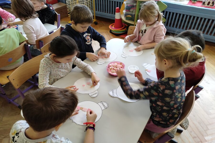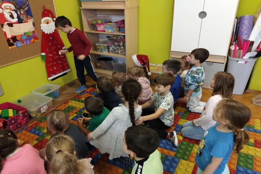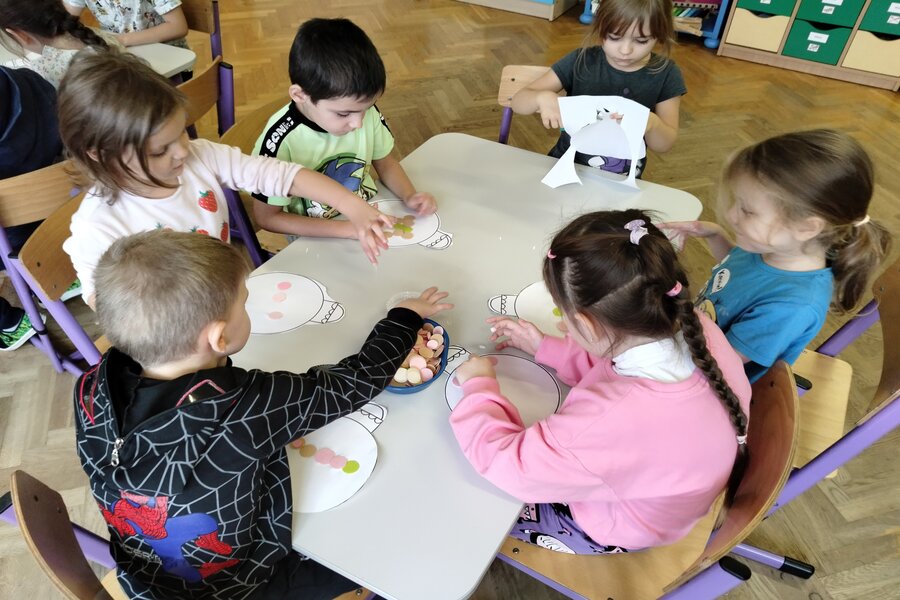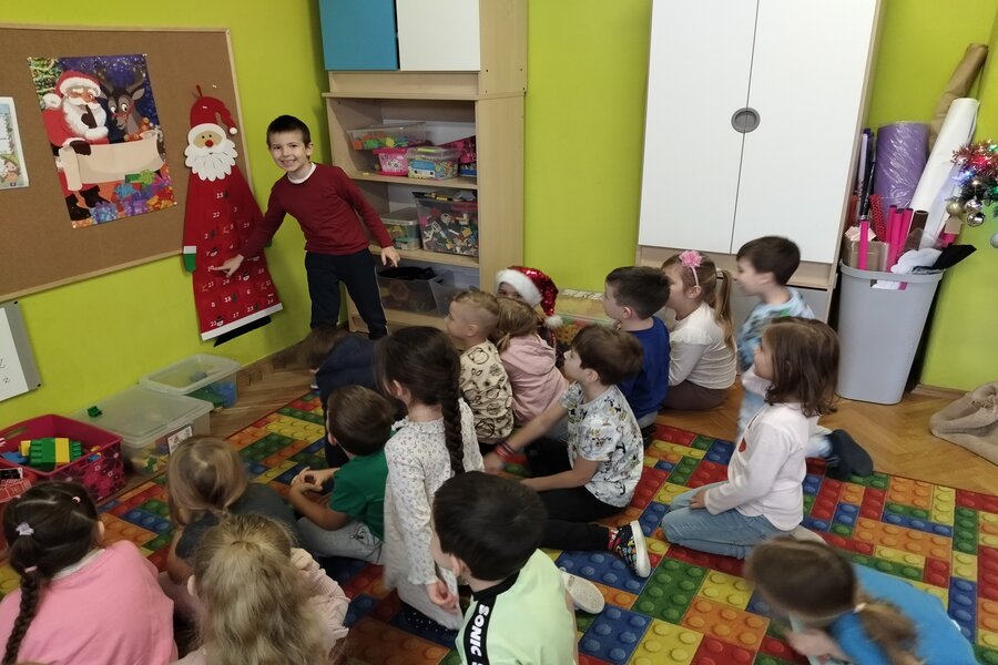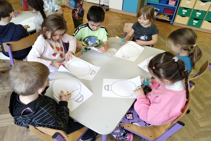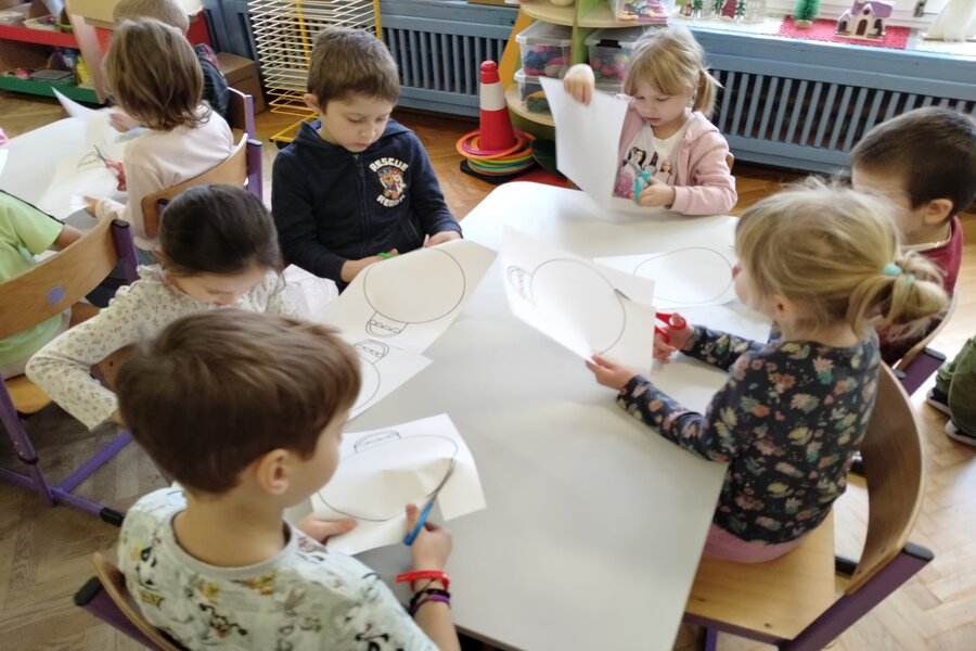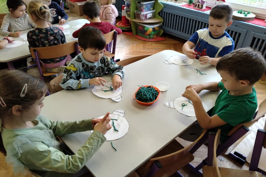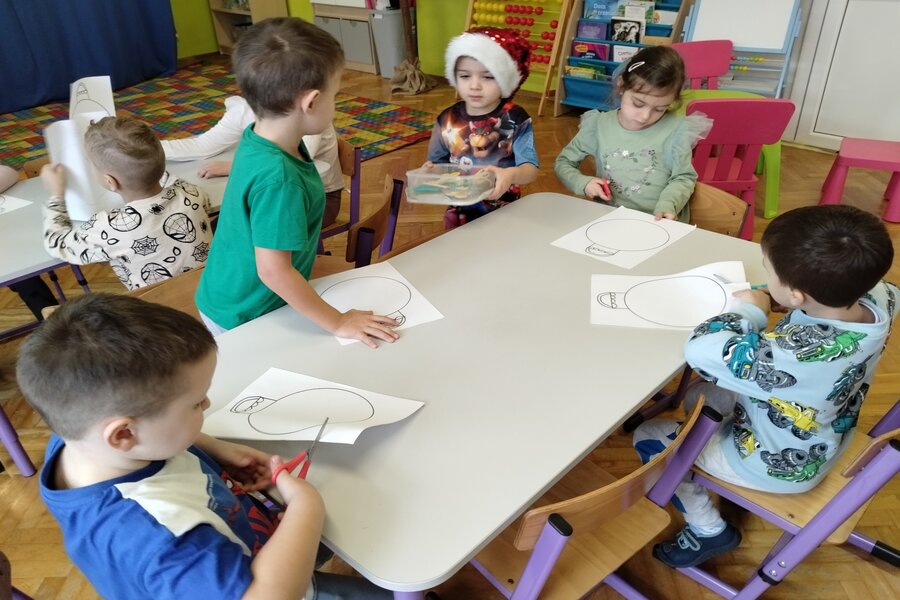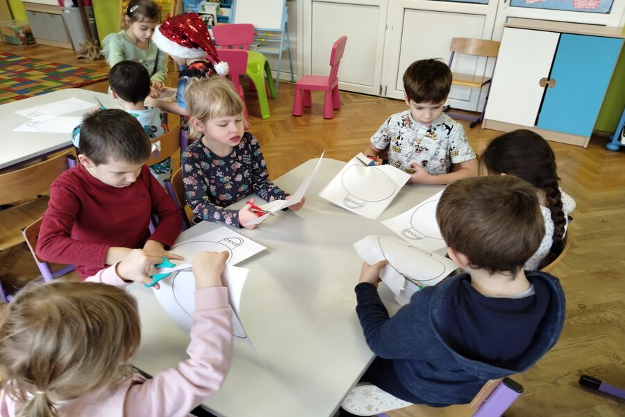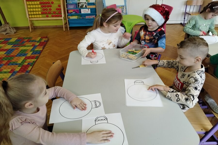 Dzisiaj zostało wylosowane kolejne zadanie z naszego adwentowego kalendarza. Wszyscy zrobili piękne prace plastyczne w postaci bombki choinkowej. Truskawki ozdabiały je kształtami koła i kwadratu oraz kolorowymi włóczkami. Przedszkolaki pokazały iż koordynację wzrokowo - ruchową podczas wycinania nożyczkami mają już opanowaną nie tylko podczas ich trzymania ale cięcia po linii by zachować kształt koła - bombki. Kolorowe ozdoby choinkowe wyszły bardzo ładnie a kolejne zadanie zostało zrealizowane.