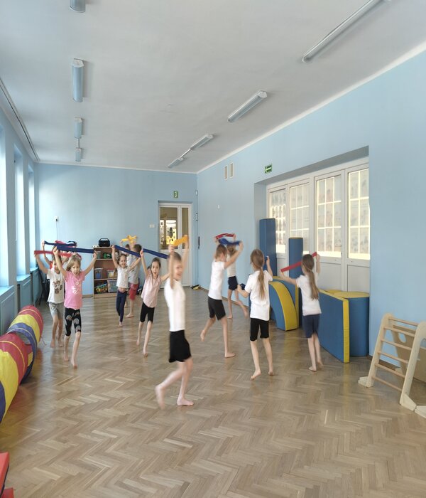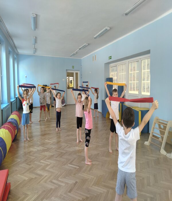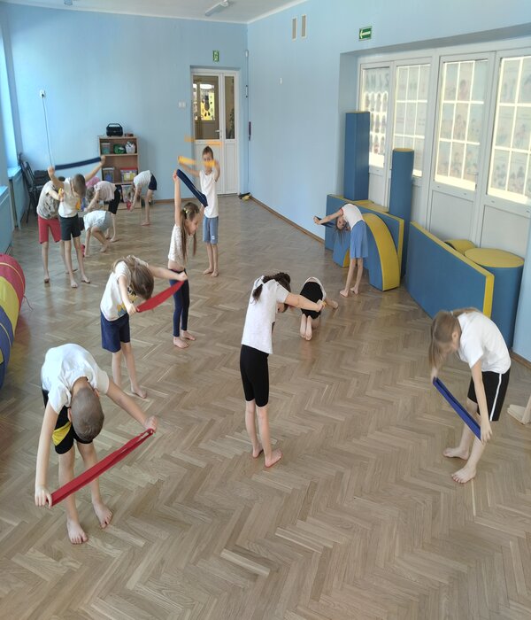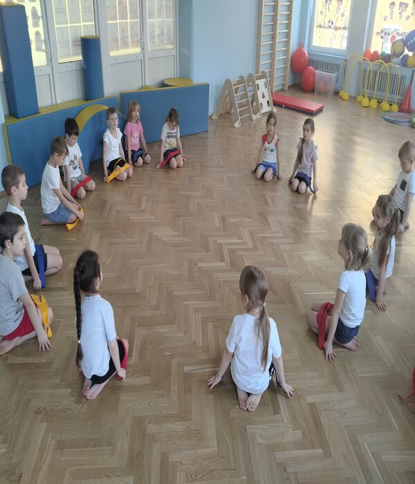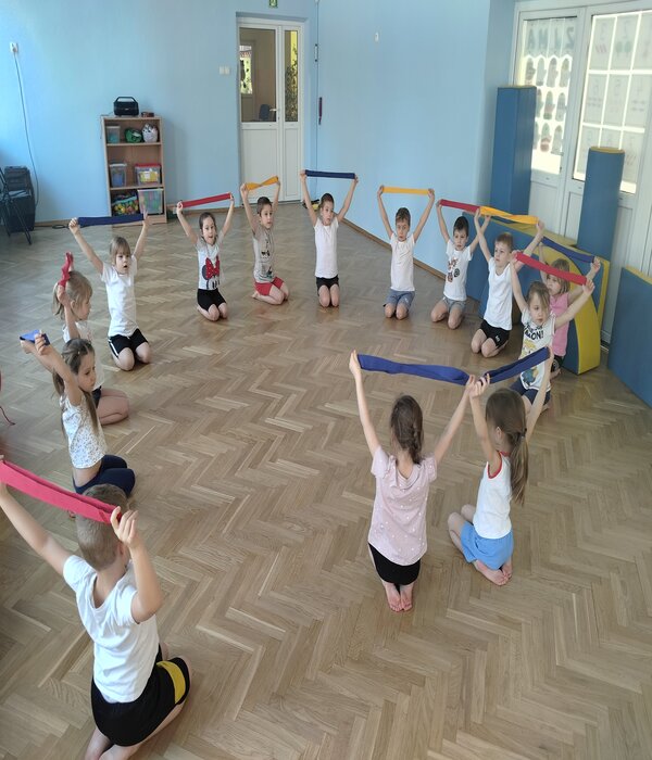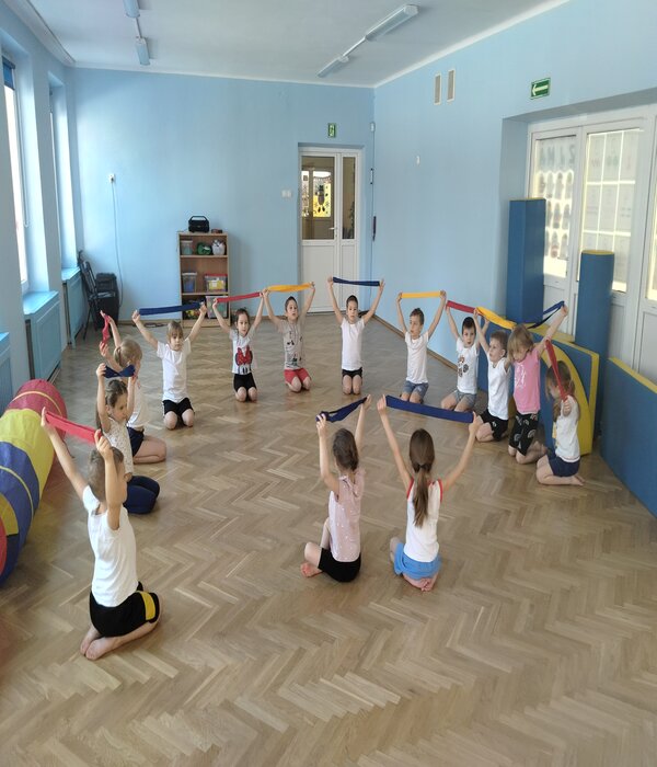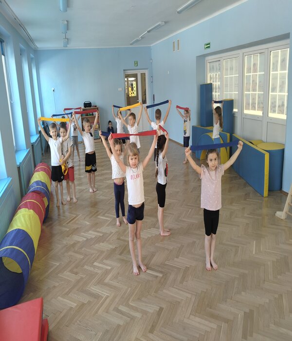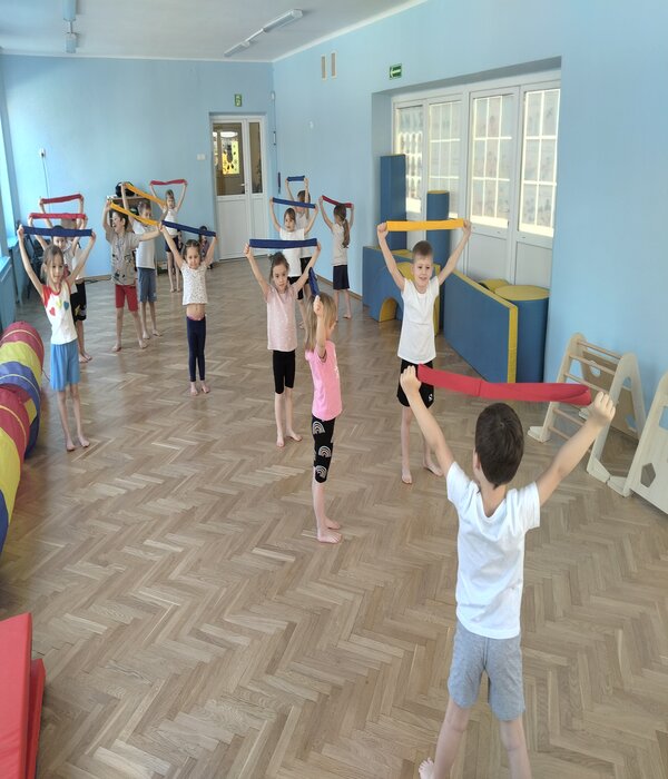 Truskawki jak zawszę rozpoczęły znanym im już wierszykiem swoją przygodę z ćwiczeniami i rozgrzewką. Dbając o swoje zdrowie i kondycję fizyczną. Dzisiaj wybraliśmy się na salę gimnastyczną by poćwiczyć z szarfami. Przedszkolaki wzmacniały swoje mięśnie, koordynację ruchową oraz prawidłową postawę dobrze się przy tym bawiąc. Popatrzcie sami jak nasi mali sportowcy ćwiczą z przyrządem.