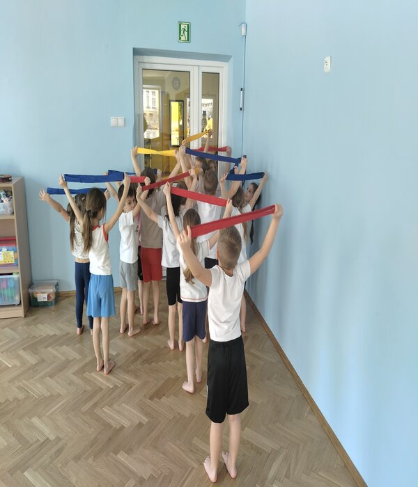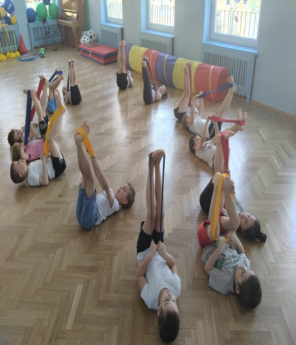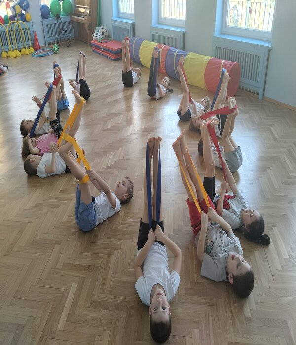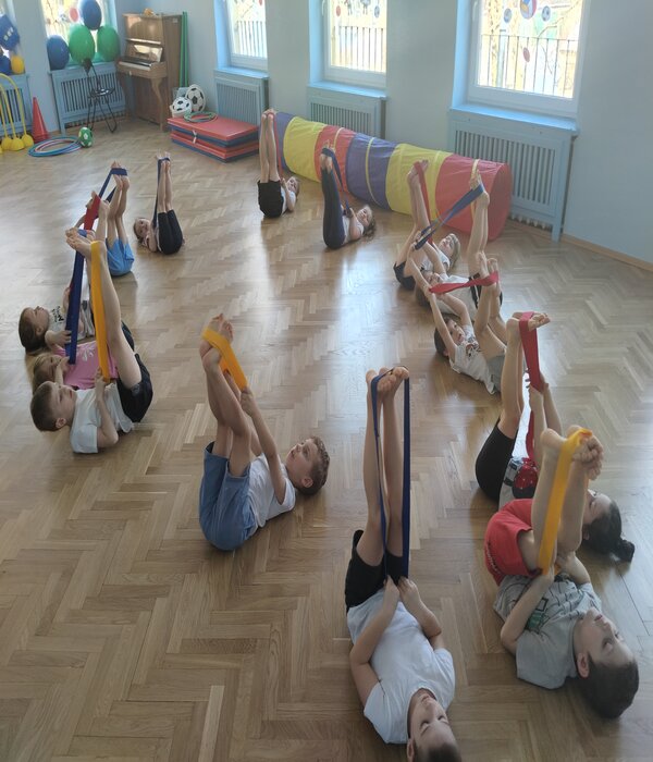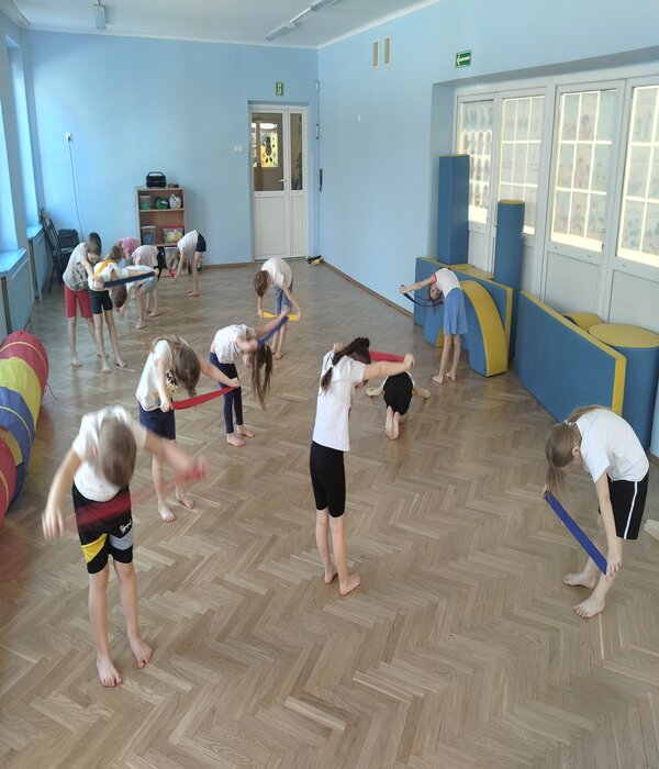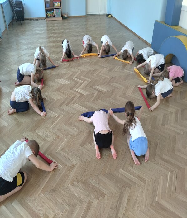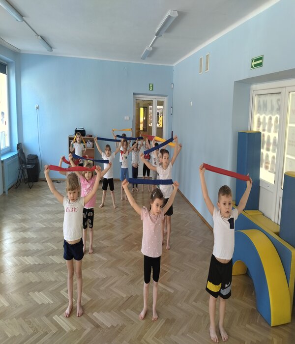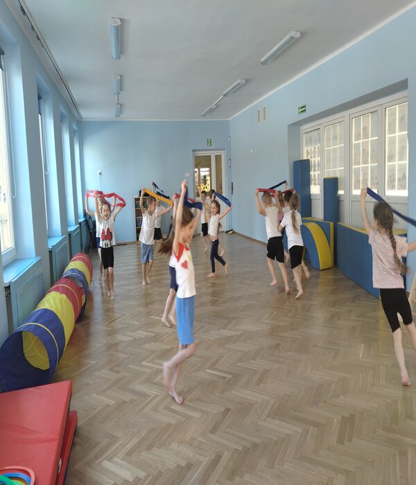 Truskawki jak zawszę rozpoczęły znanym im już wierszykiem swoją przygodę z ćwiczeniami i rozgrzewką. Dbając o swoje zdrowie i kondycję fizyczną. Dzisiaj wybraliśmy się na salę gimnastyczną by poćwiczyć z szarfami. Przedszkolaki wzmacniały swoje mięśnie, koordynację ruchową oraz prawidłową postawę dobrze się przy tym bawiąc. Popatrzcie sami jak nasi mali sportowcy ćwiczą z przyrządem.