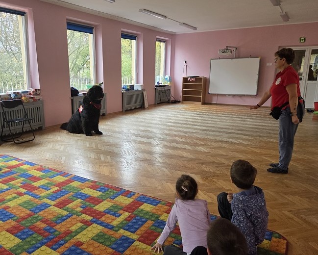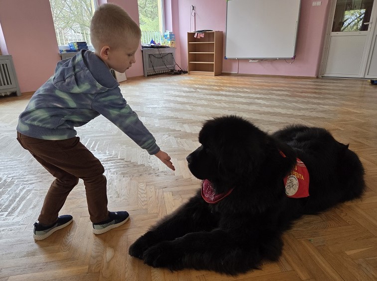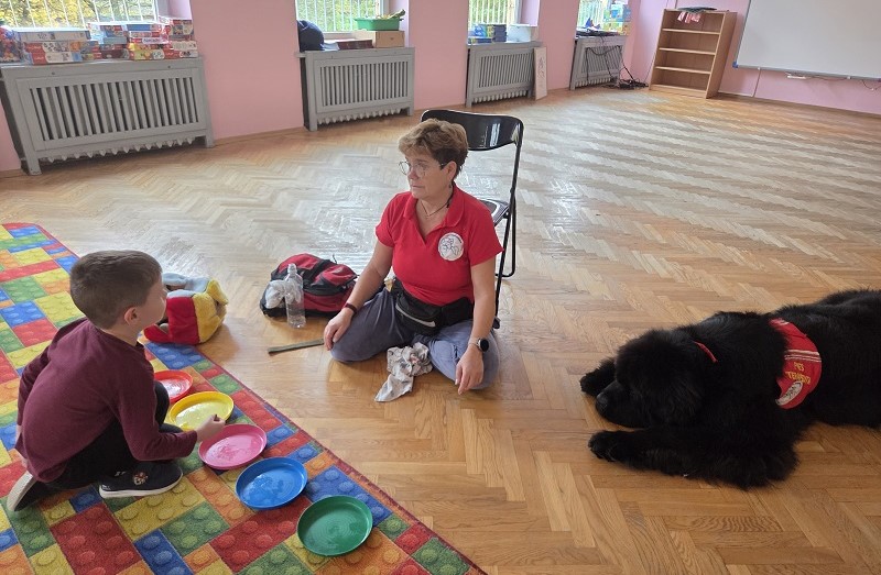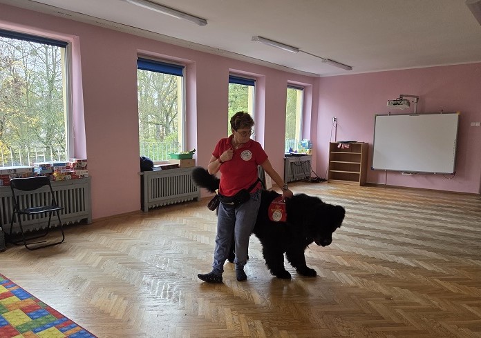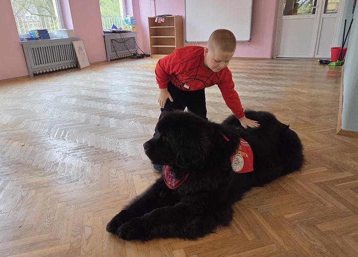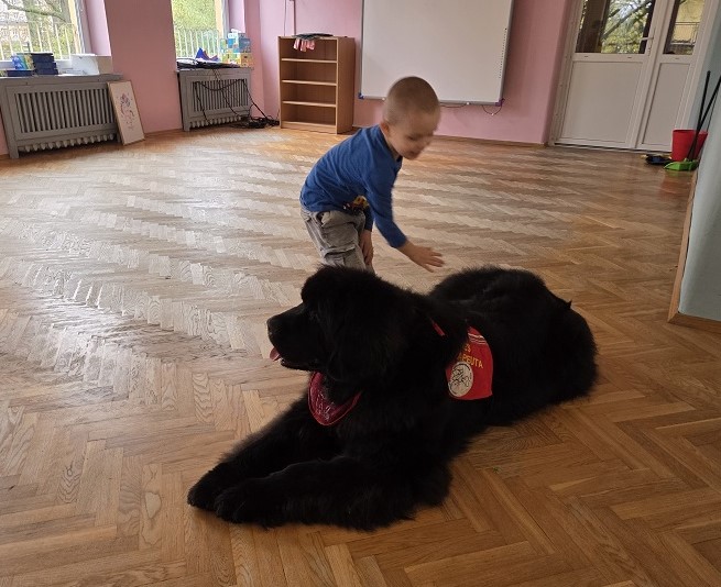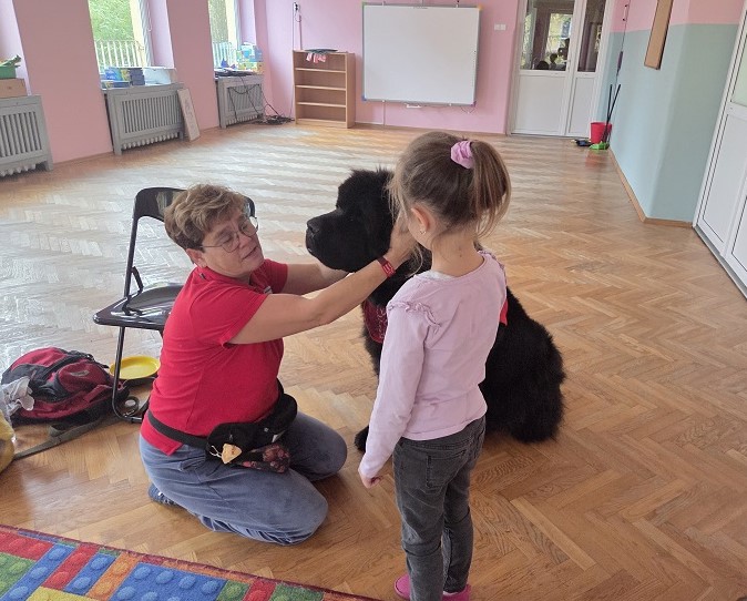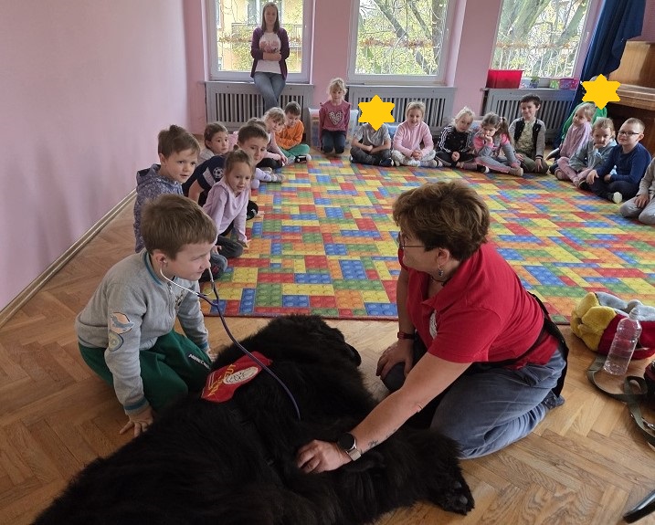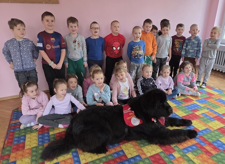 W dniu 28 października 2025r. w grupie Biedronek odbyły się zajęcia dogoterapii, czyli terapia z udziałem psa Teodora. W ramach zajęć dzieci mają okazje do kontaktu z wykwalifikowanym psem terapeutycznymi i do wykonania różnych zadań i ćwiczeń. Podczas zajęć dzieci uczą się między innymi jak prawidłowo podejść do psa, jak go głaskać i jak z nim się bawić. Dogoterapia ma wiele korzyści dla dzieci, przede wszystkim pomaga w poprawie stanu emocjonalnego i wzmaga poczucie własnej wartości. Kontakt z psem pomaga dzieciom w odczuwaniu miłości, przyjaźni i bezpieczeństwa. Obecność psa Teodora na zajęciach sprawił dzieciom dużo radości i wyzwolił spontaniczne reakcje.