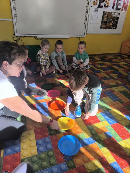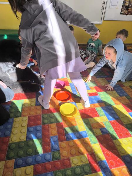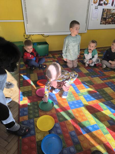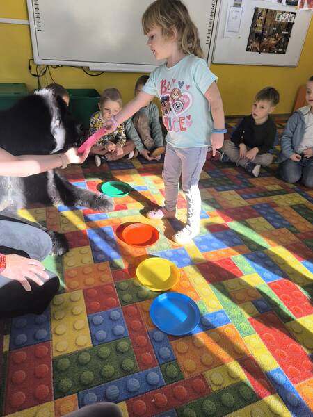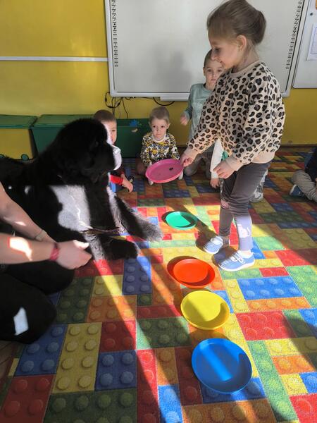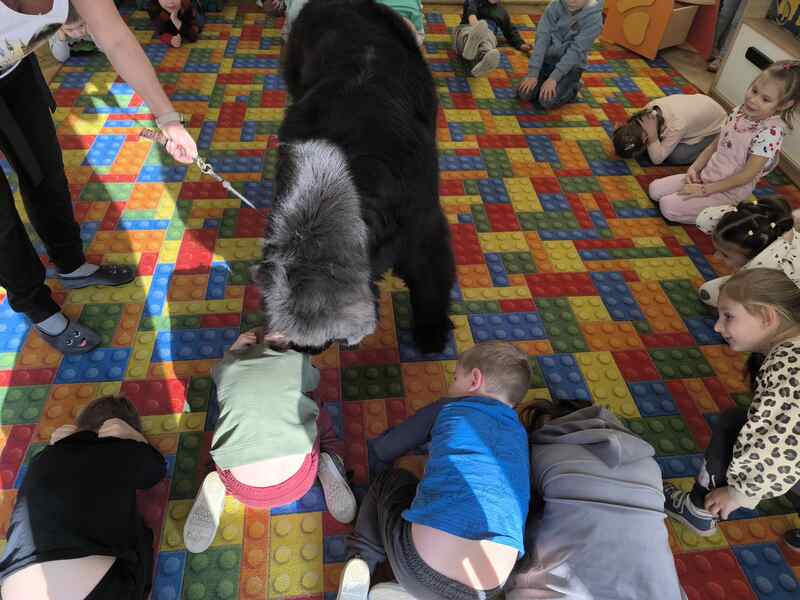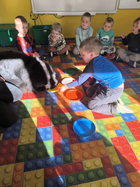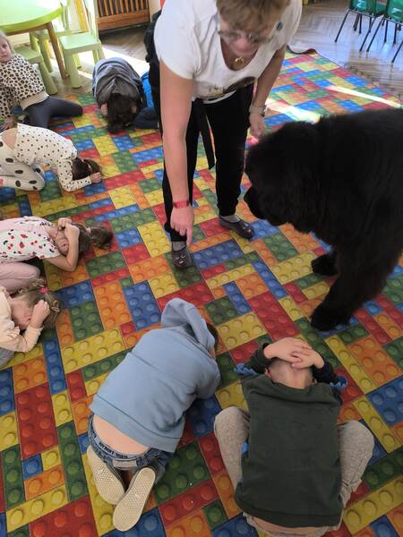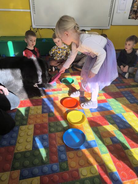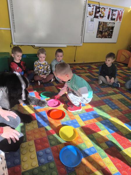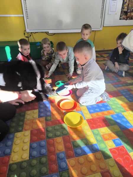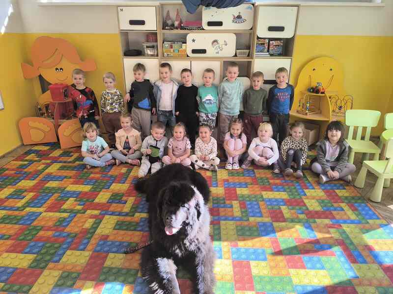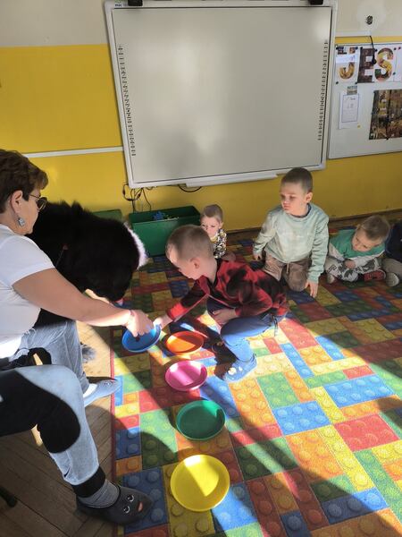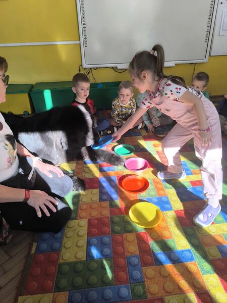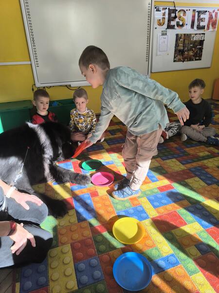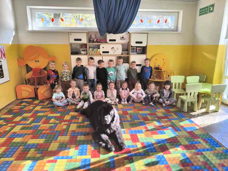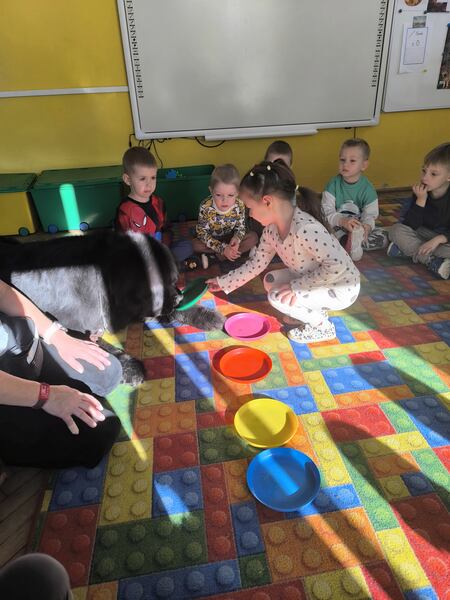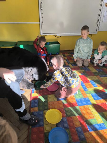 4 listopada do naszej grupy zawitał wyjątkowy gość - pies terapeuta Tadzik. Podczas zajęć dogoterapii dzieci poznały zasady bezpiecznego kontaktu z z psem, dowiedziały się, jak rozumieć jego zachowanie i jak o niego dbać. Każdy przedszkolak mógł pogłaskać Tadzika, wykonać z nim ciekawe zadania oraz poczęstować go pysznymi smaczkami. Spotkanie było pełne radości, uśmiechu i ciepła - a Tadzik zyskał wielu małych przyjaciół.