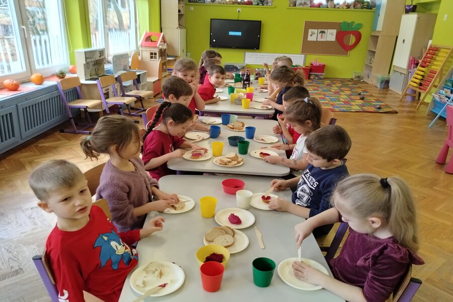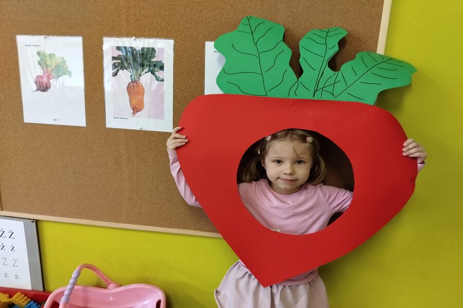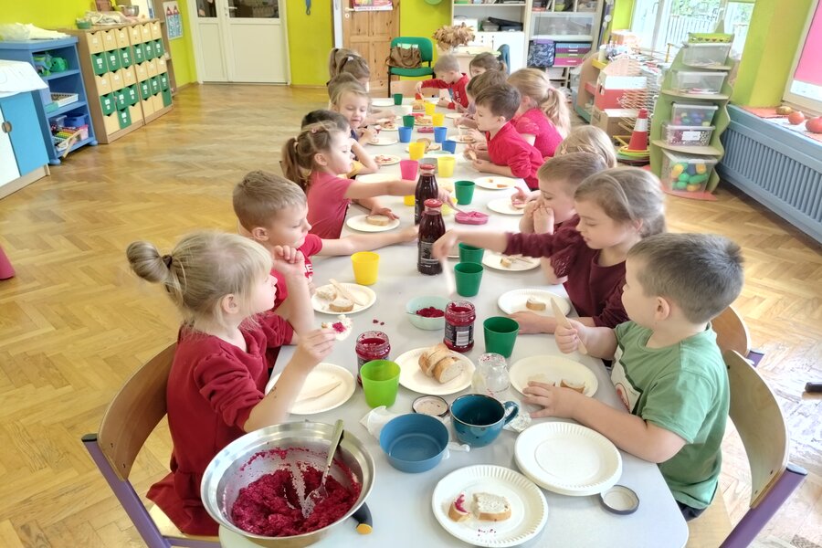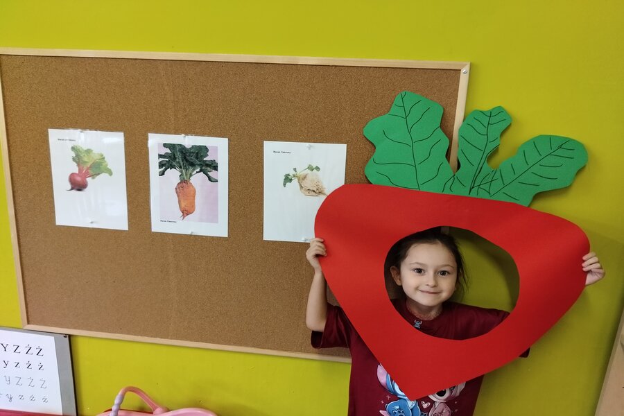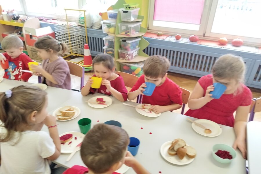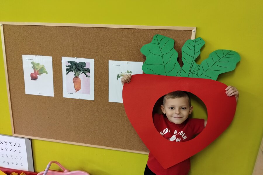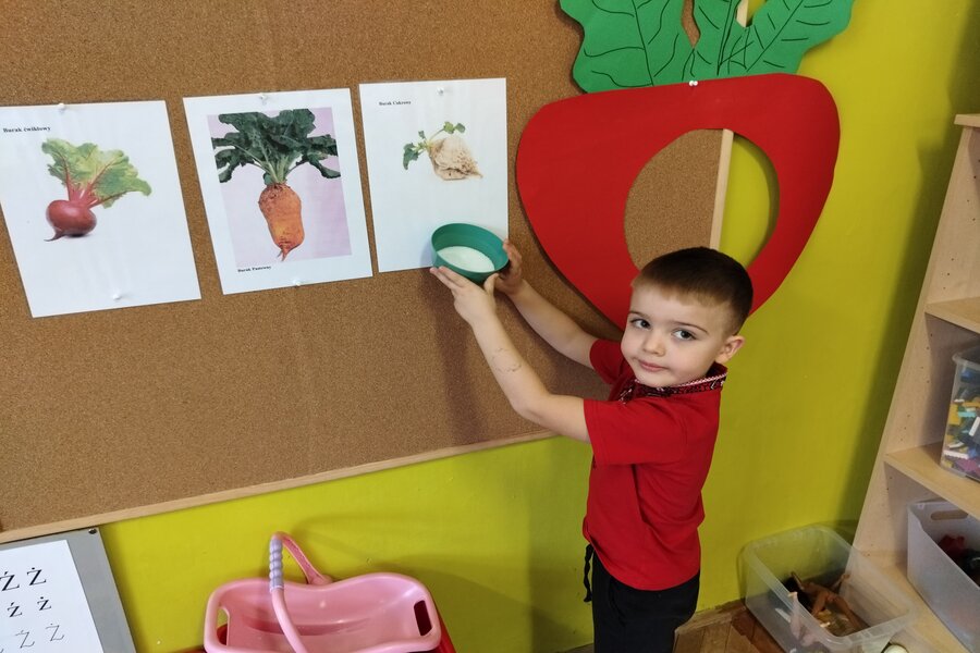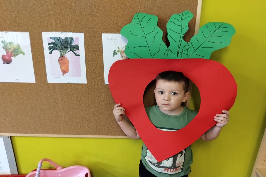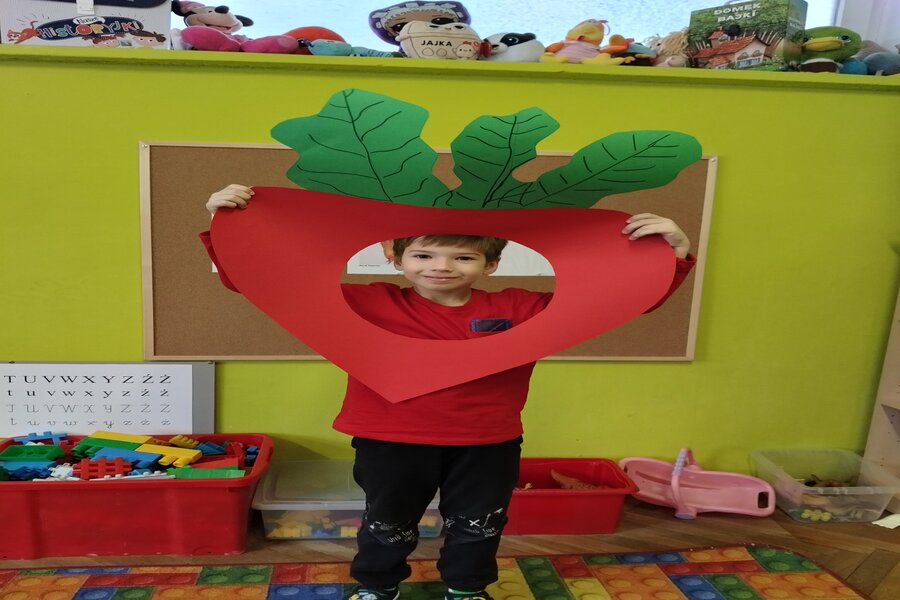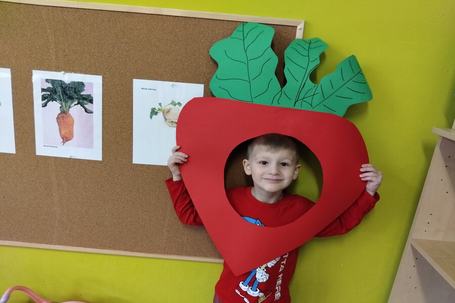 Dzień Buraka obchodzony jest 24 listopada i ma na celu promowanie zdrowego stylu życia oraz zachęcanie dzieci do poznawania warzyw. Dlatego dzisiaj nasze truskawki nie tylko ubrały się w barwy buraczkowe ale także przyniosły buraki ćwikłowe do przedszkola. Wszyscy wspólnie wysłuchaliśmy bajki edukacyjnej pt. ,,Częstujcie się - Burak'' z której dowiedzieliśmy się skąd pochodzi to warzywo, jak można je uprawiać i do czego je używamy w codziennym życiu. Przedszkolaki poznały trzy rodzaje buraków min.: cukrowego i smakowały cukru, pastewnego o którym dowiedziały się iż uprawiany jest na paszę hodowlaną dla zwierząt oraz bohatera dnia buraka ćwikłowego. Wszyscy od rana zrobili sobie zdjęcie w naszej warzywnej fotobudce, tańczyli w parach do piosenki ,,Hop sa sa buraka masz Ty i Ja''. Przedszkolaki wspólnie poznały produkty z buraka takie jak ćwikła, humus oraz sok. Nie wszystkim smakowało wszystko co znalazło się na kanapce czy w kubeczku ale każda truskaweczka spróbowała i wybrała coś dla siebie. Wszyscy mogli też sprawdzić czy burak jest ciężki czy lekki a może twardy albo miękki, bawiąc się przy tym znakomicie. Na koniec w zespołach wykonaliśmy plakat ,,Buraka ćwikłowego'', prace można podziwiać w szatni na tablicy naszej grupy.