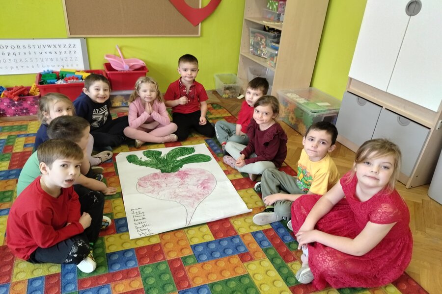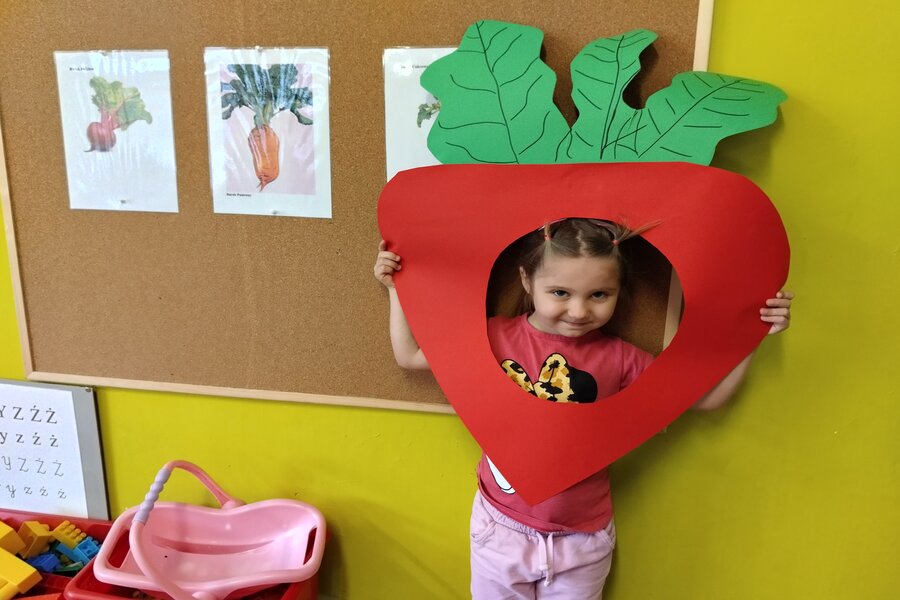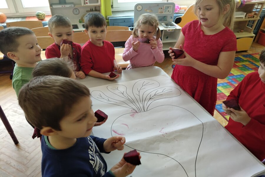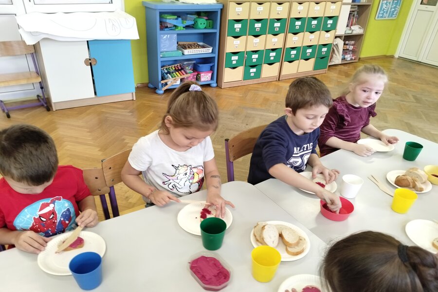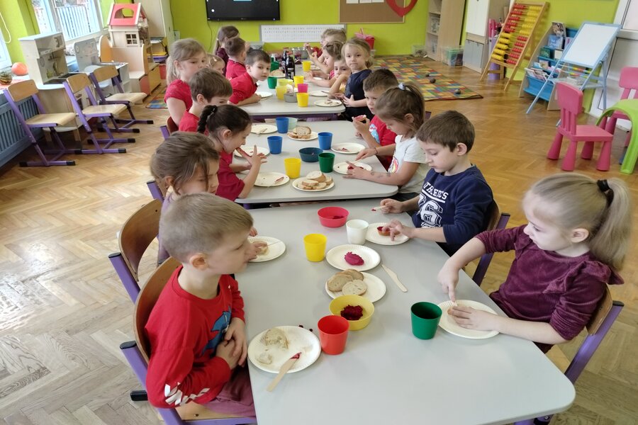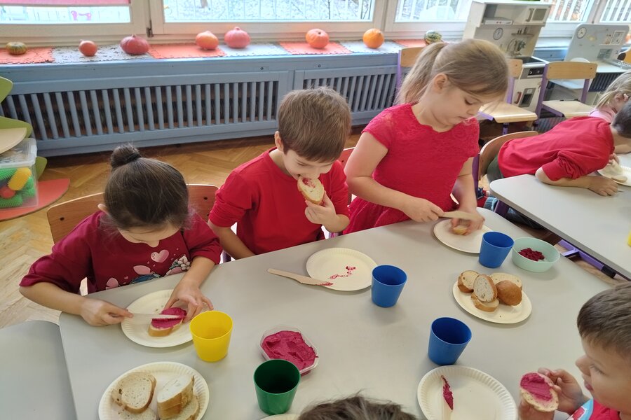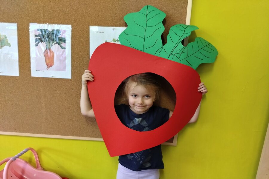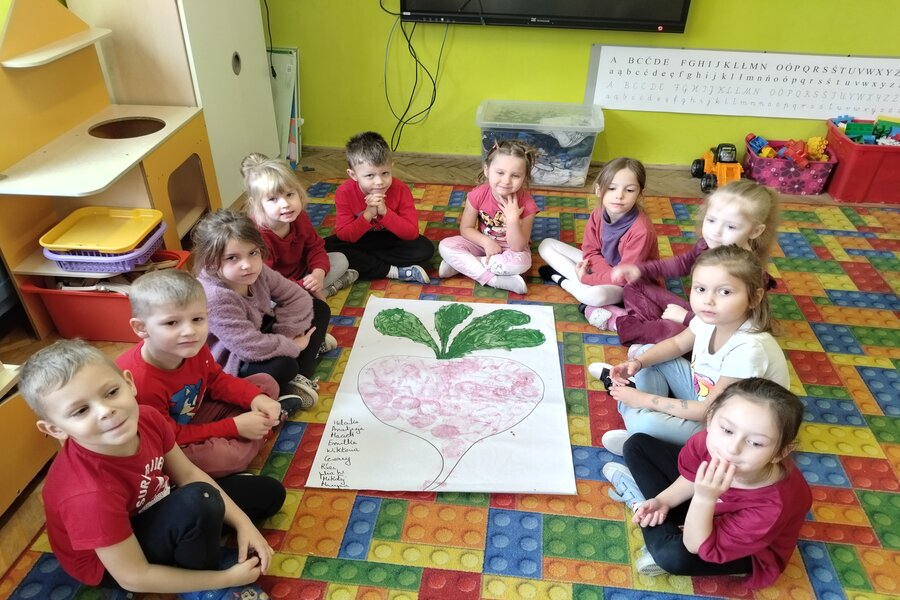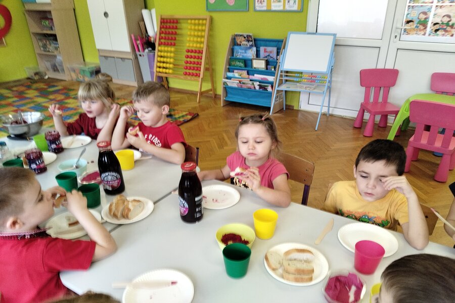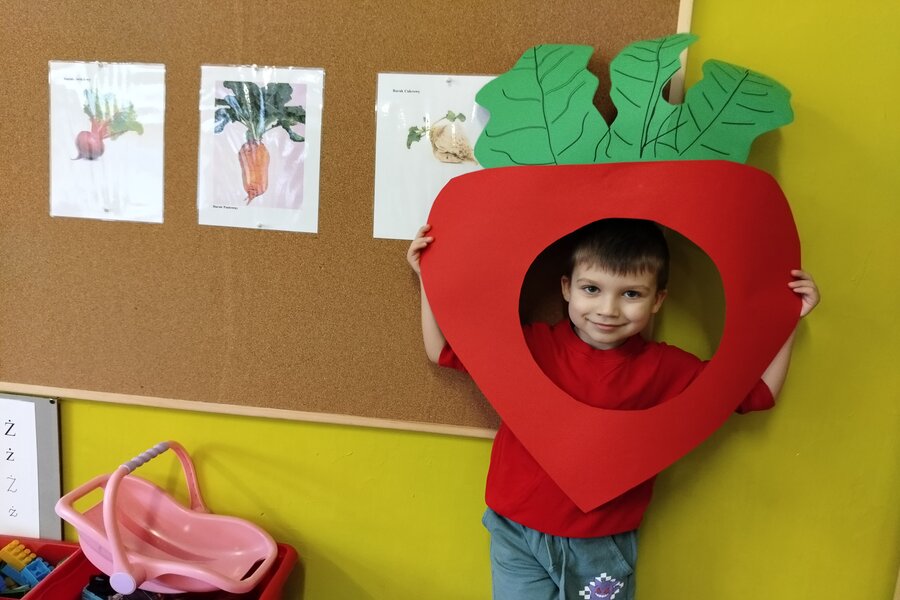 Dzień Buraka obchodzony jest 24 listopada i ma na celu promowanie zdrowego stylu życia oraz zachęcanie dzieci do poznawania warzyw. Dlatego dzisiaj nasze truskawki nie tylko ubrały się w barwy buraczkowe ale także przyniosły buraki ćwikłowe do przedszkola. Wszyscy wspólnie wysłuchaliśmy bajki edukacyjnej pt. ,,Częstujcie się - Burak'' z której dowiedzieliśmy się skąd pochodzi to warzywo, jak można je uprawiać i do czego je używamy w codziennym życiu. Przedszkolaki poznały trzy rodzaje buraków min.: cukrowego i smakowały cukru, pastewnego o którym dowiedziały się iż uprawiany jest na paszę hodowlaną dla zwierząt oraz bohatera dnia buraka ćwikłowego. Wszyscy od rana zrobili sobie zdjęcie w naszej warzywnej fotobudce, tańczyli w parach do piosenki ,,Hop sa sa buraka masz Ty i Ja''. Przedszkolaki wspólnie poznały produkty z buraka takie jak ćwikła, humus oraz sok. Nie wszystkim smakowało wszystko co znalazło się na kanapce czy w kubeczku ale każda truskaweczka spróbowała i wybrała coś dla siebie. Wszyscy mogli też sprawdzić czy burak jest ciężki czy lekki a może twardy albo miękki, bawiąc się przy tym znakomicie. Na koniec w zespołach wykonaliśmy plakat ,,Buraka ćwikłowego'', prace można podziwiać w szatni na tablicy naszej grupy.