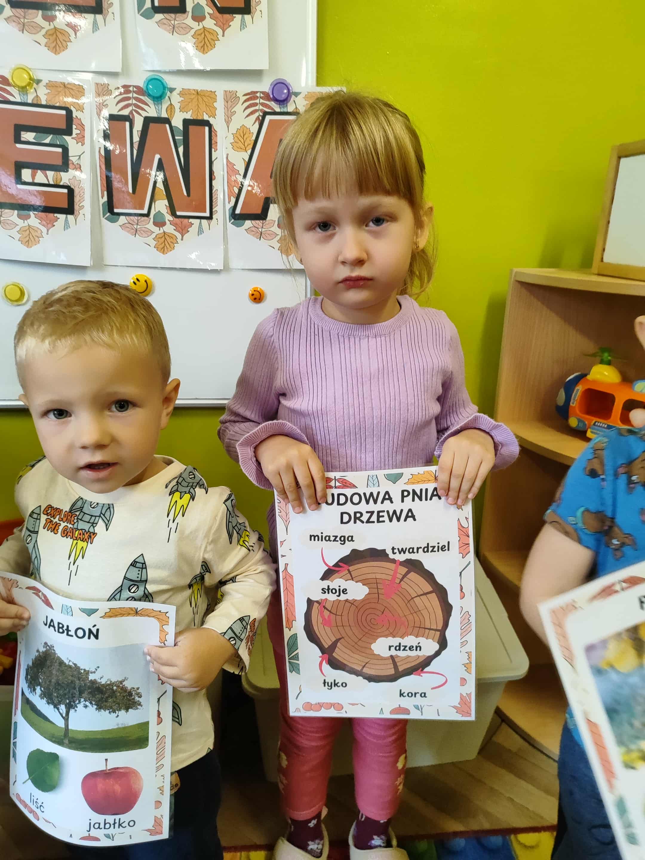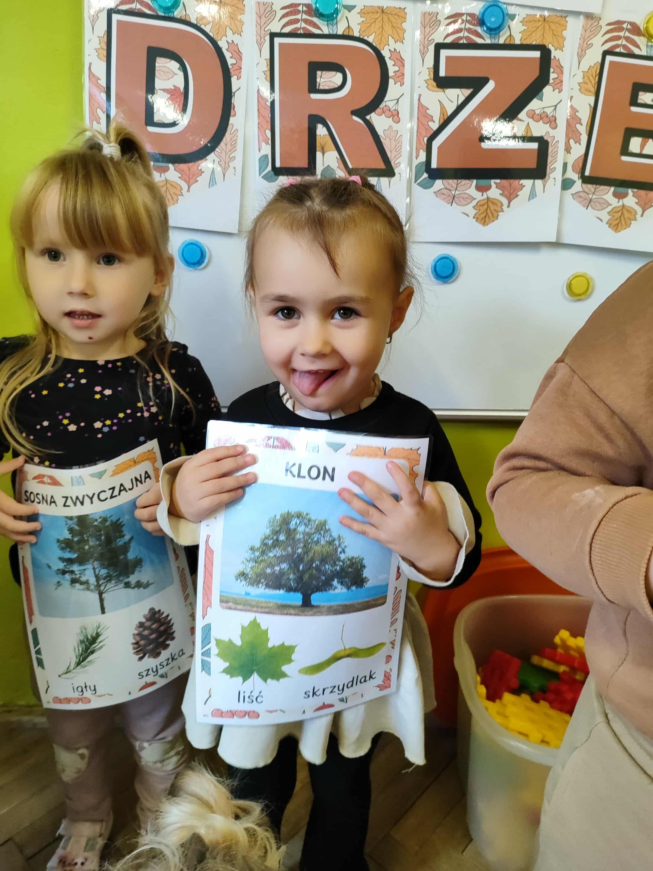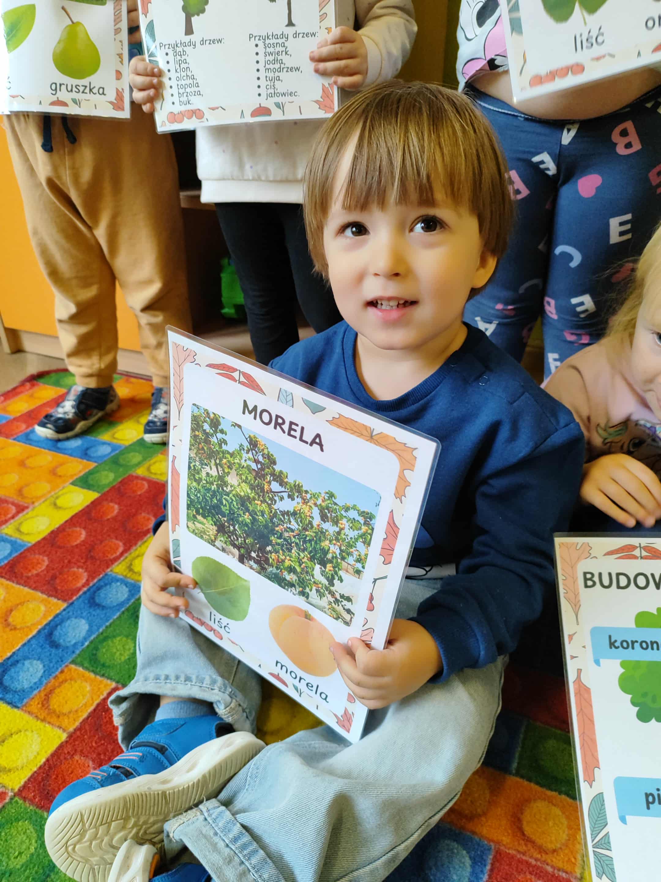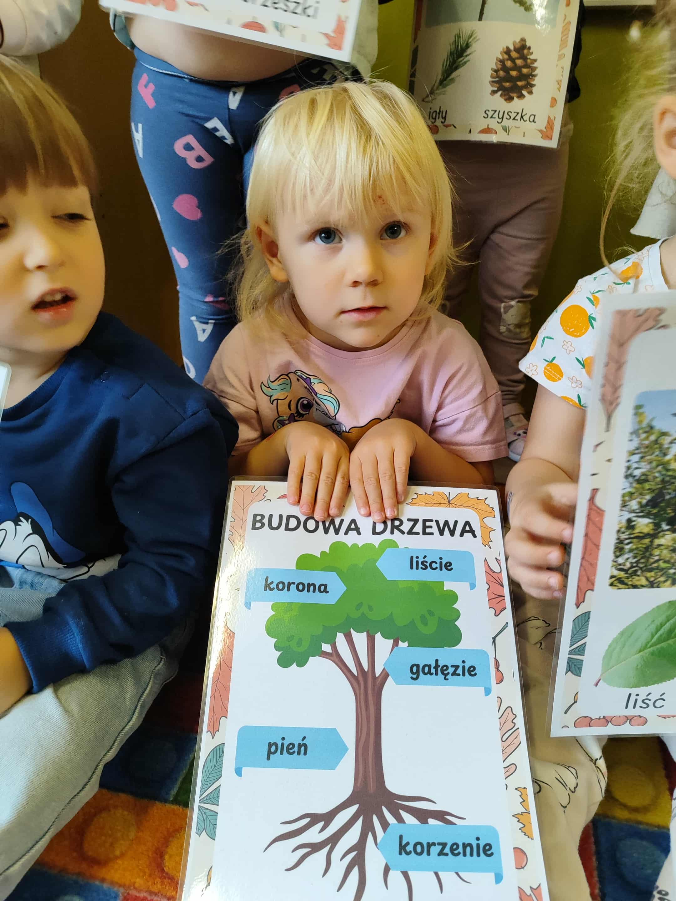 Dzieci poznały między innymi budowę drzewa, etapy jego wzrostu, nauczyły się odróżniać drzewa liściaste od iglastych, nazywać poszczególne drzewa i jego owoce- np. dąb- żołędzie, kasztanowiec- kasztany, jabłoń- jabłka itp. Dzieci wykonały piękne prace plastyczne, których bohaterem było oczywiście drzewo. W tym dniu nie zabrakło również zabaw muzycznych i ruchowych inspirowanych drzewami.