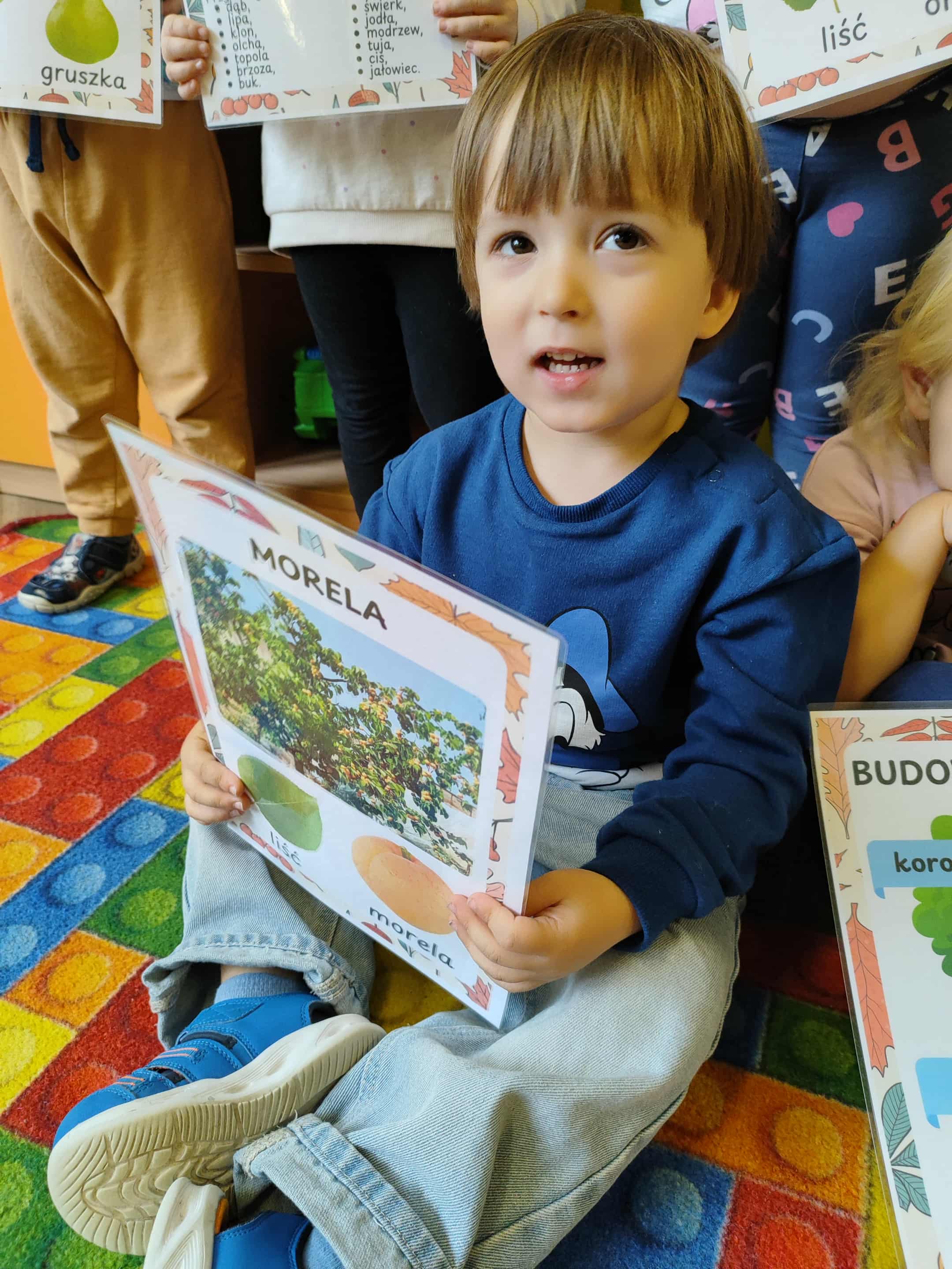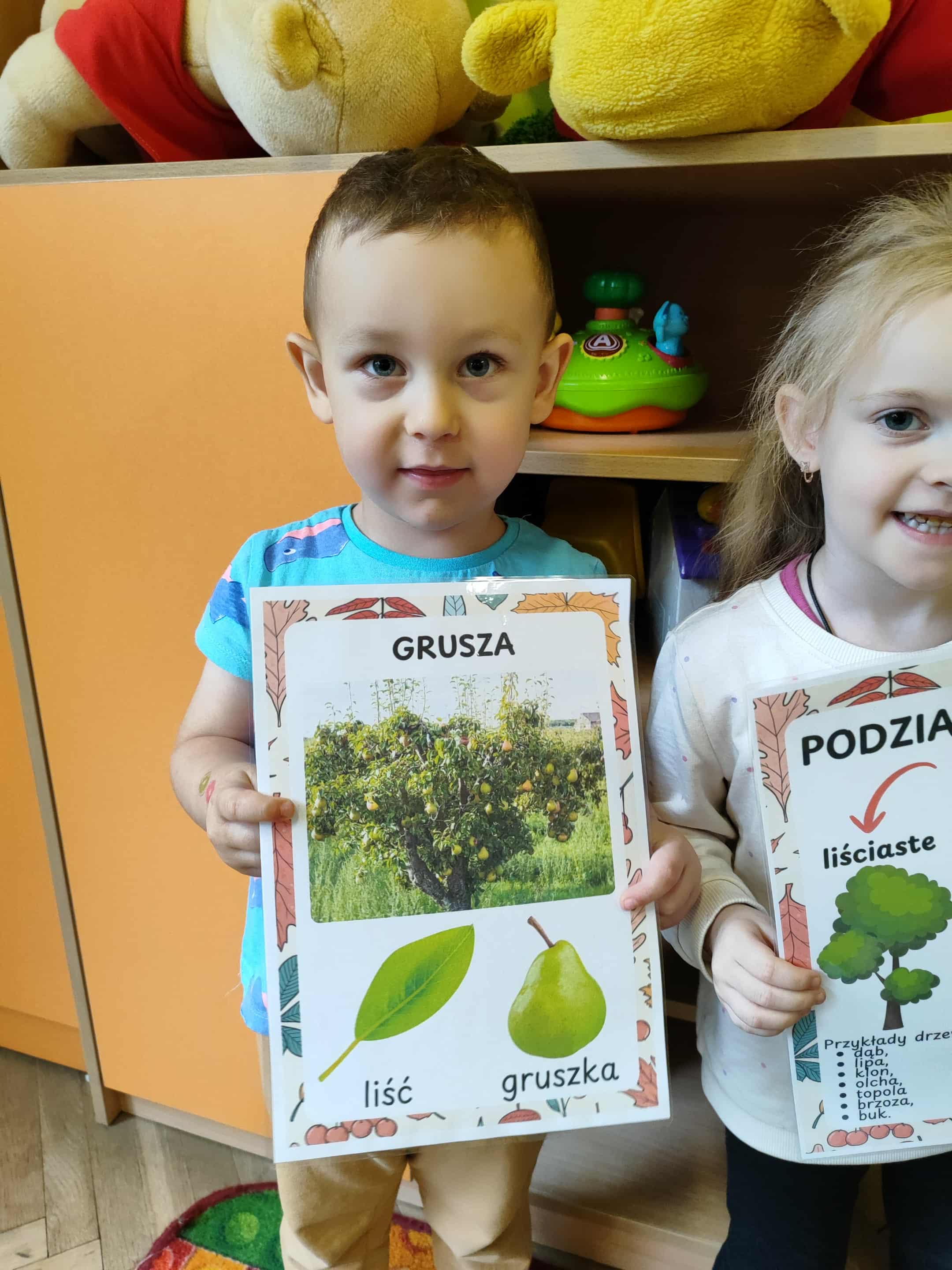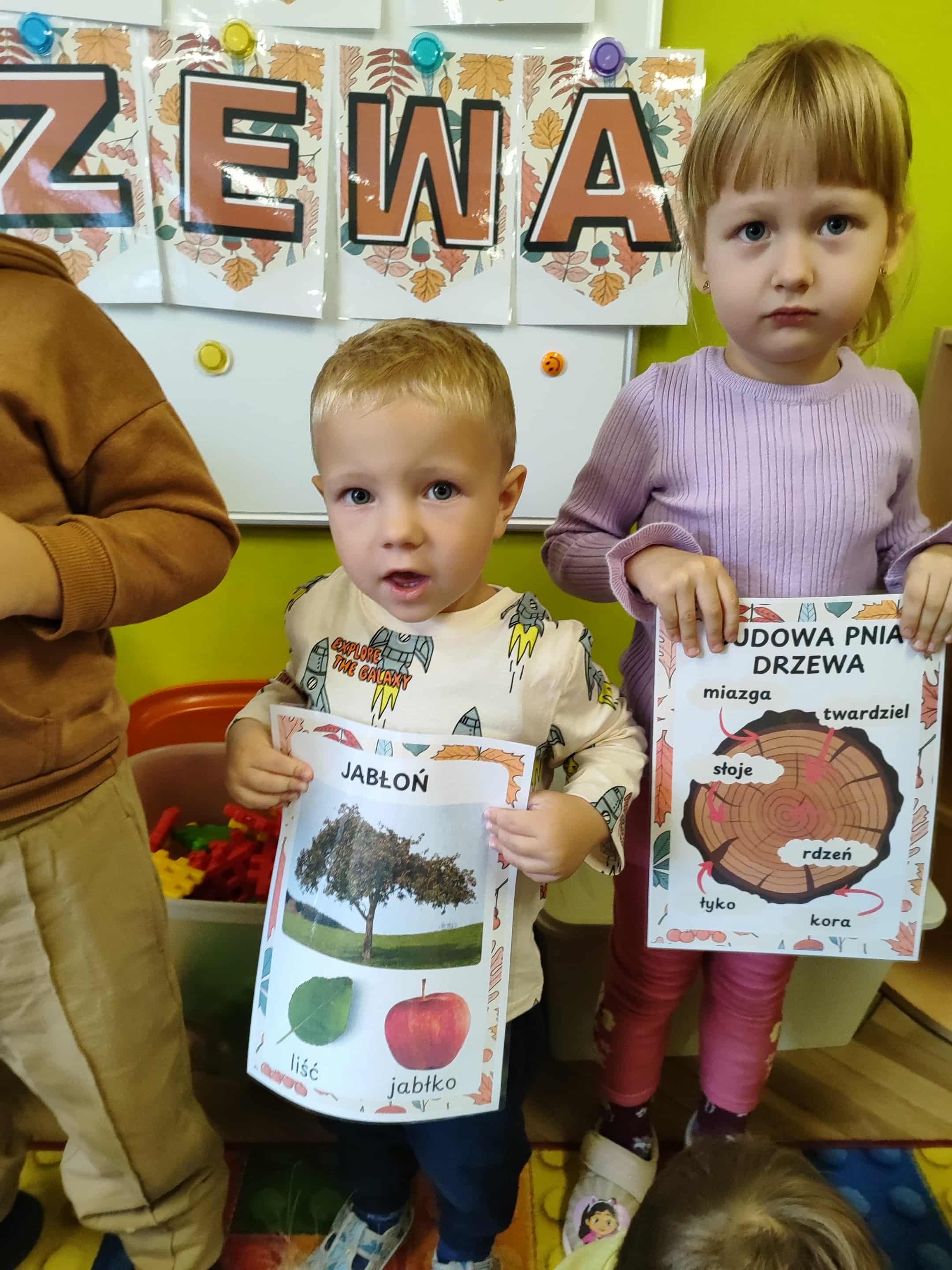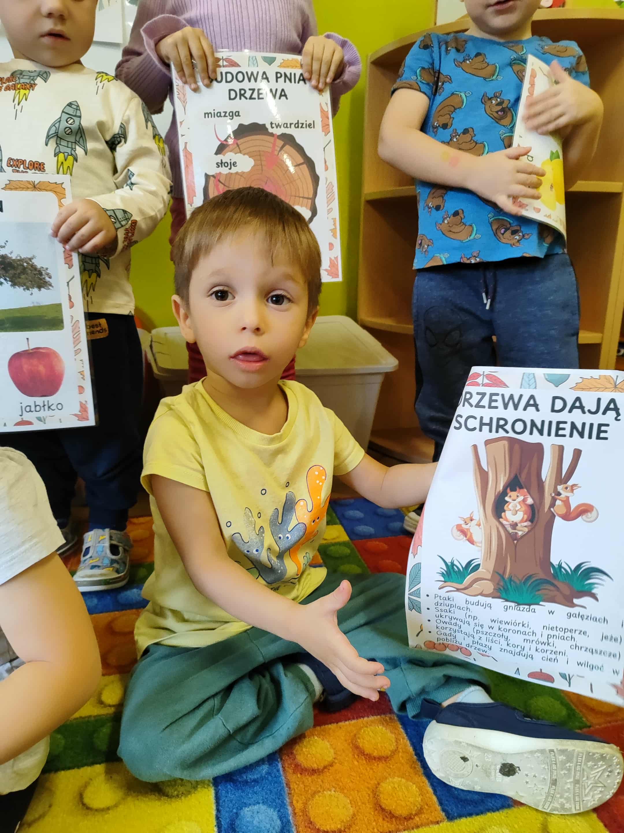 Dzieci poznały między innymi budowę drzewa, etapy jego wzrostu, nauczyły się odróżniać drzewa liściaste od iglastych, nazywać poszczególne drzewa i jego owoce- np. dąb- żołędzie, kasztanowiec- kasztany, jabłoń- jabłka itp. Dzieci wykonały piękne prace plastyczne, których bohaterem było oczywiście drzewo. W tym dniu nie zabrakło również zabaw muzycznych i ruchowych inspirowanych drzewami.