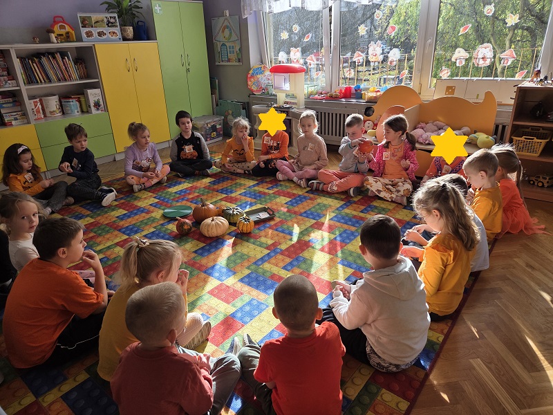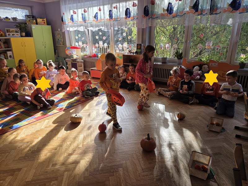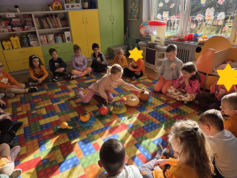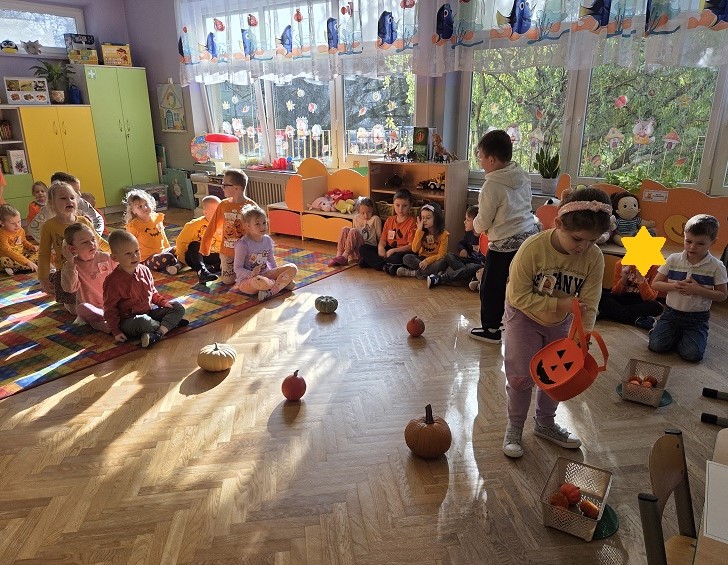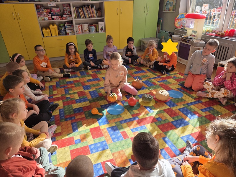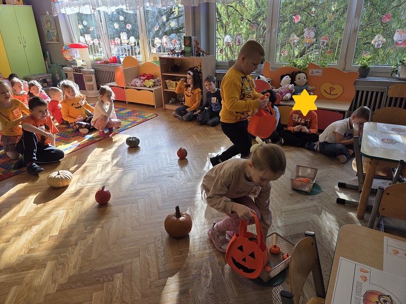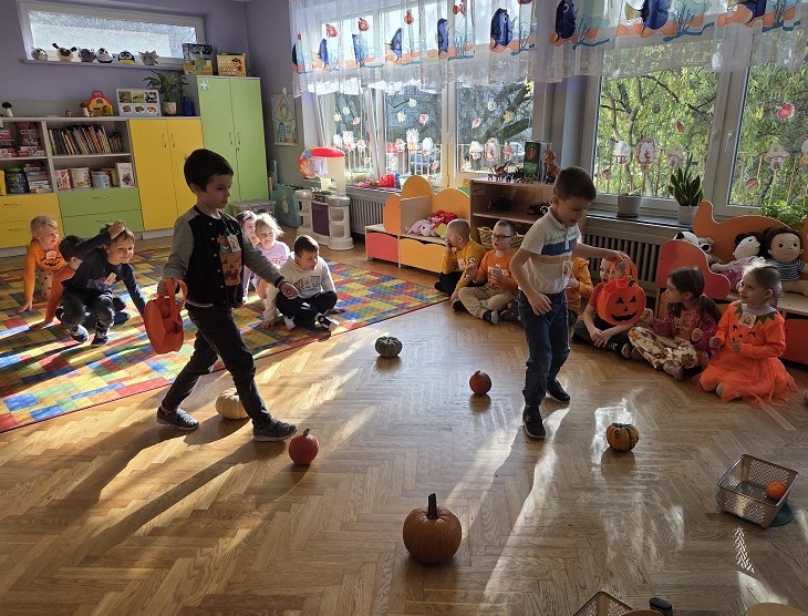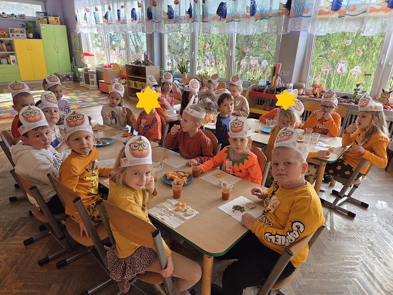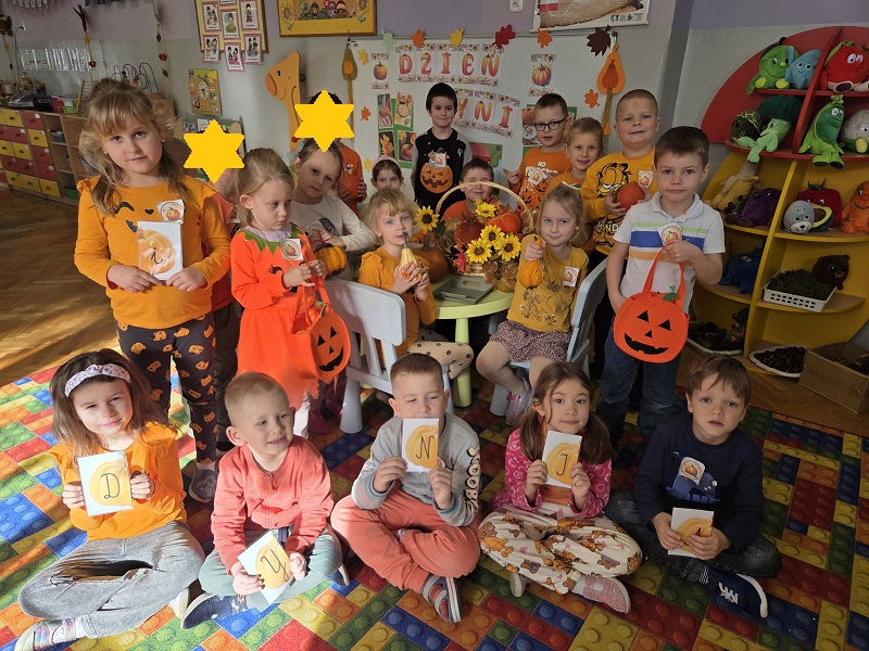 W dniu 29 października 2025r. przedszkolaki z grupy Biedronek obchodziły Dzień Dyni. To był wyjątkowy dzień, w tym dniu obowiązywał kolor pomarańczowy. Dzieci poznawały różne odmiany dyni, rozpoznawały i określały ich wielkość, wzbogaciły wiedzę na ich temat, a co najważniejsze, zapamiętały, że dynia jest zdrowym warzywem, z którego można przygotować wiele dań. Uczestniczyły w zabawach ruchowych: „Dynia parzy”, „Slalom z dynia”, „Co jest w środku ?” oraz układały obrazki z pestek dyni. Na zakończenie dnia degustowały i poznawały smaki różnych produktów w pomarańczowym kolorze - pysznych ciast: marchewkowych, dyniowych, z galaretką pomarańczową, babeczek oraz owoców: mandarynek, pomarańczy i soków owocowych.