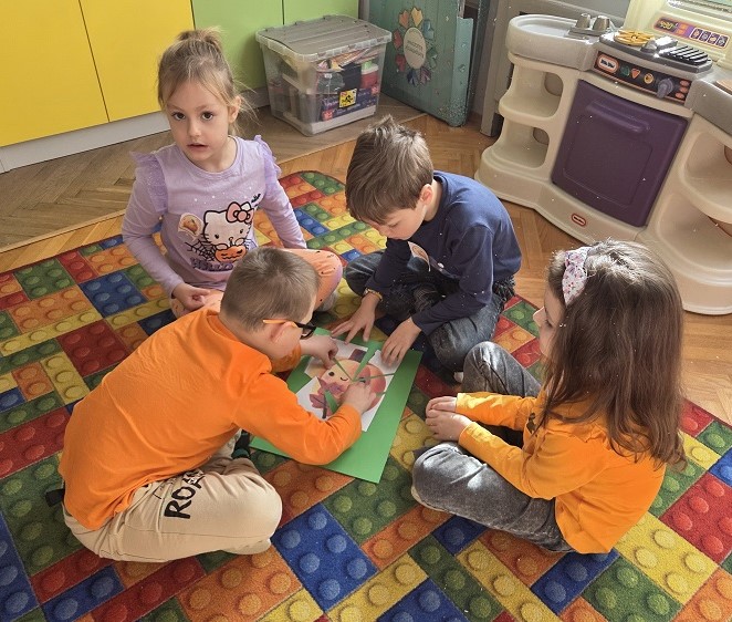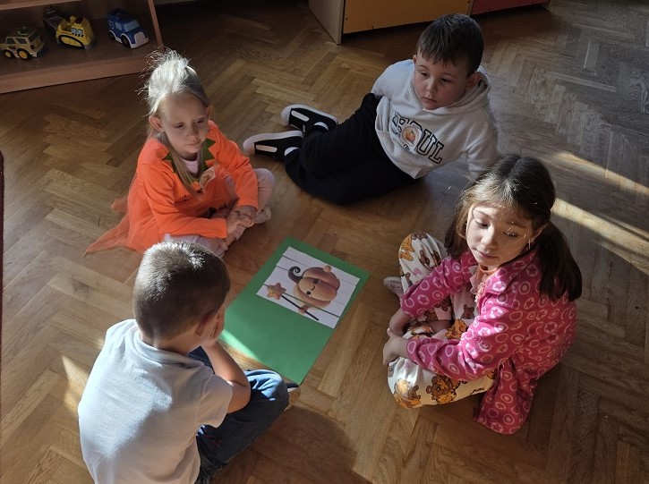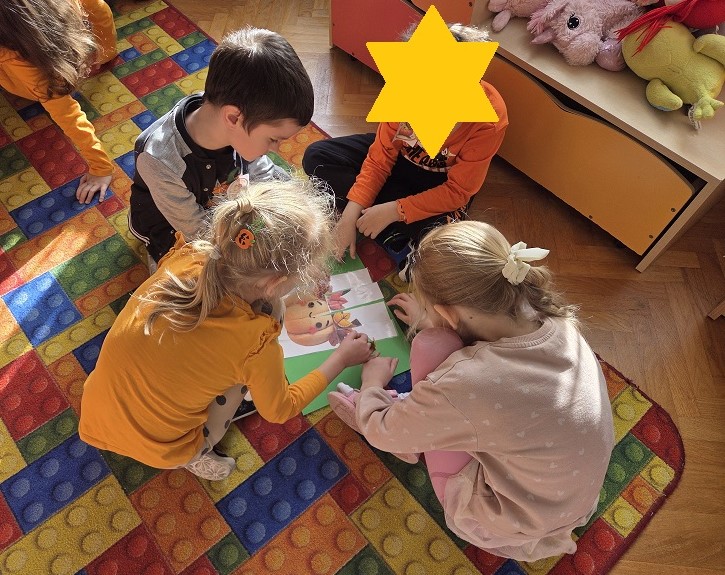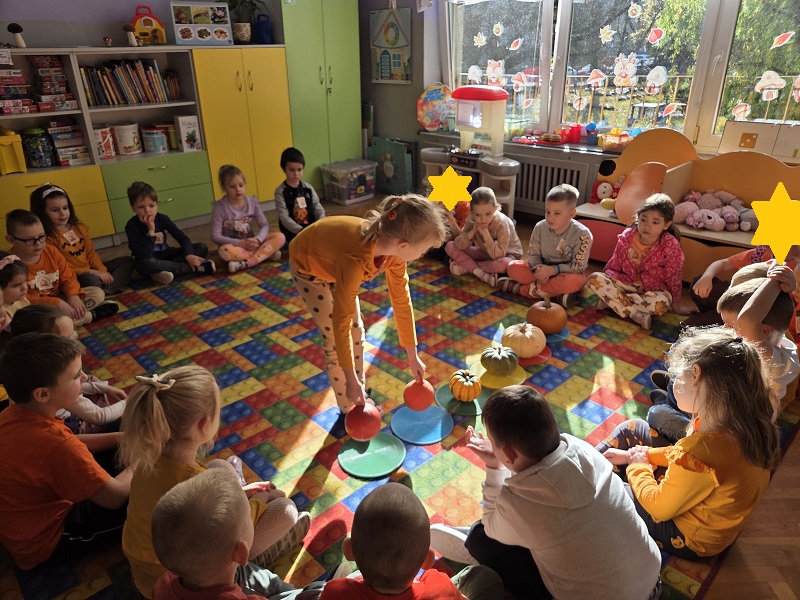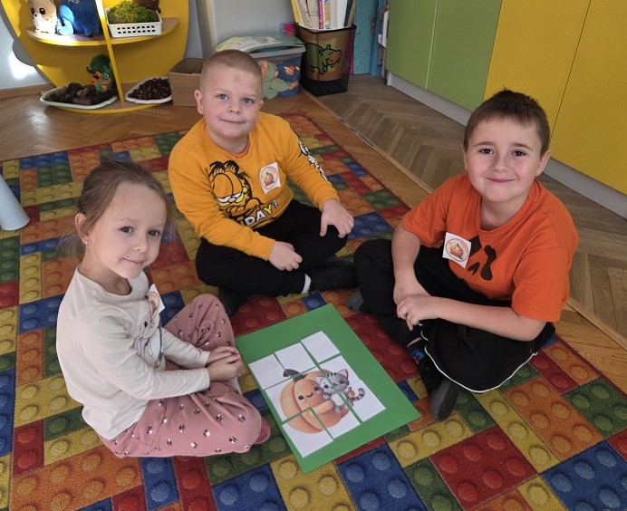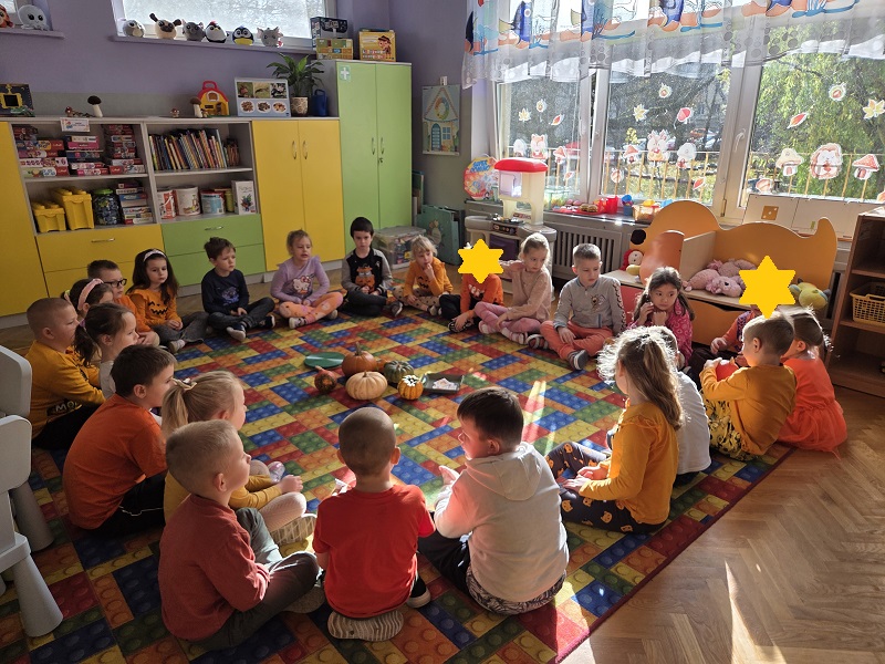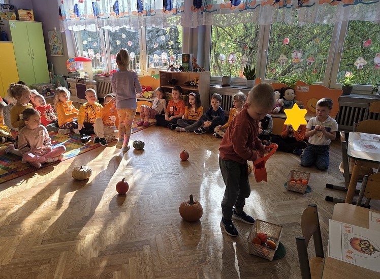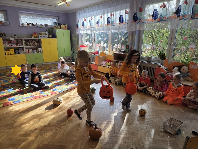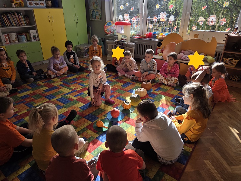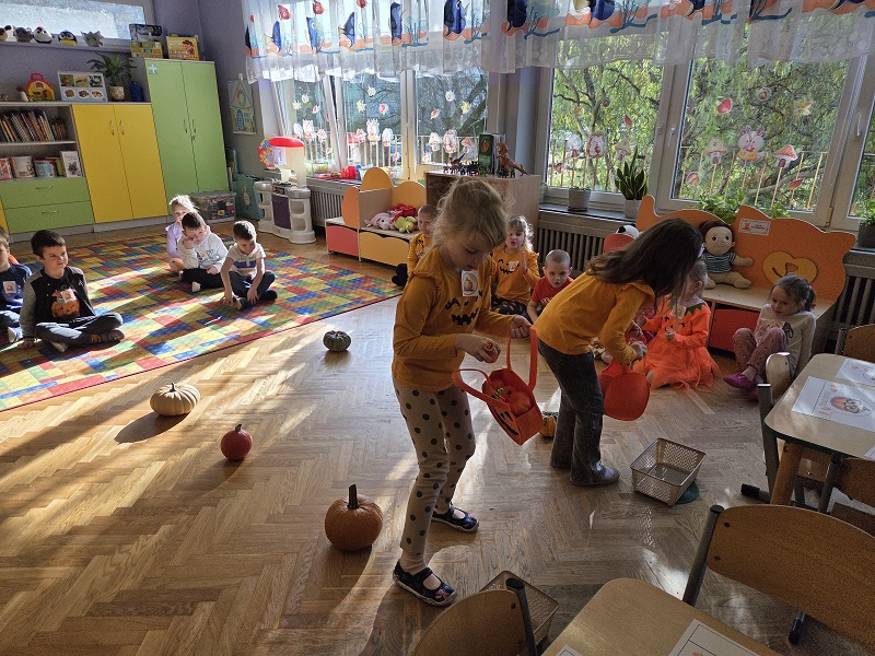 W dniu 29 października 2025r. przedszkolaki z grupy Biedronek obchodziły Dzień Dyni. To był wyjątkowy dzień, w tym dniu obowiązywał kolor pomarańczowy. Dzieci poznawały różne odmiany dyni, rozpoznawały i określały ich wielkość, wzbogaciły wiedzę na ich temat, a co najważniejsze, zapamiętały, że dynia jest zdrowym warzywem, z którego można przygotować wiele dań. Uczestniczyły w zabawach ruchowych: „Dynia parzy”, „Slalom z dynia”, „Co jest w środku ?” oraz układały obrazki z pestek dyni. Na zakończenie dnia degustowały i poznawały smaki różnych produktów w pomarańczowym kolorze - pysznych ciast: marchewkowych, dyniowych, z galaretką pomarańczową, babeczek oraz owoców: mandarynek, pomarańczy i soków owocowych.