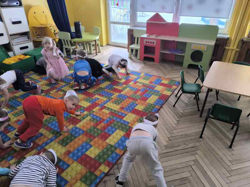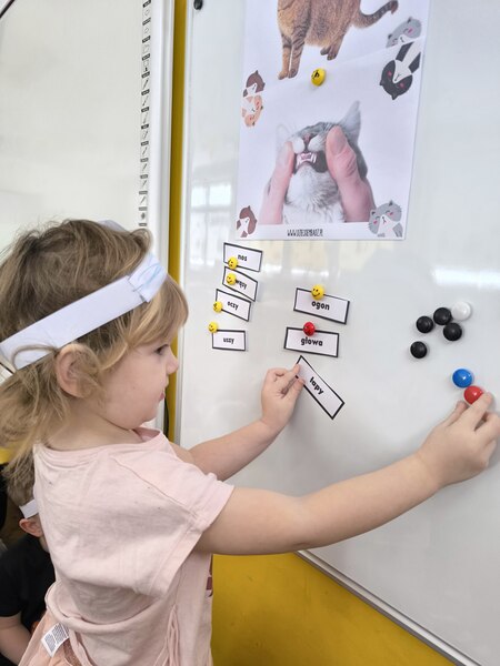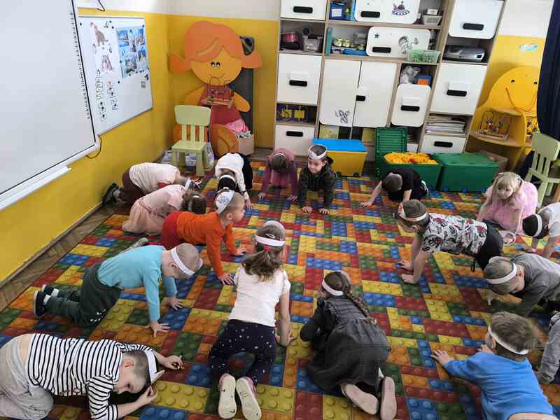 Spotkanie rozpoczęło się wspólną zabawą, przy znanej wszystkim piosence ” Uciekaj myszko do dziury”. Dzieci z zainteresowaniem oglądały ilustracje różnych kotów, nadając im imiona, rozwiązywały zagadki, słuchały wiersza ” Kotek”, aktywnie uczestniczyły w zabawie w formie opowieści ruchowej miaucząc, robiąc koci grzbiet, mrucząc i chlipiąc mleczko.