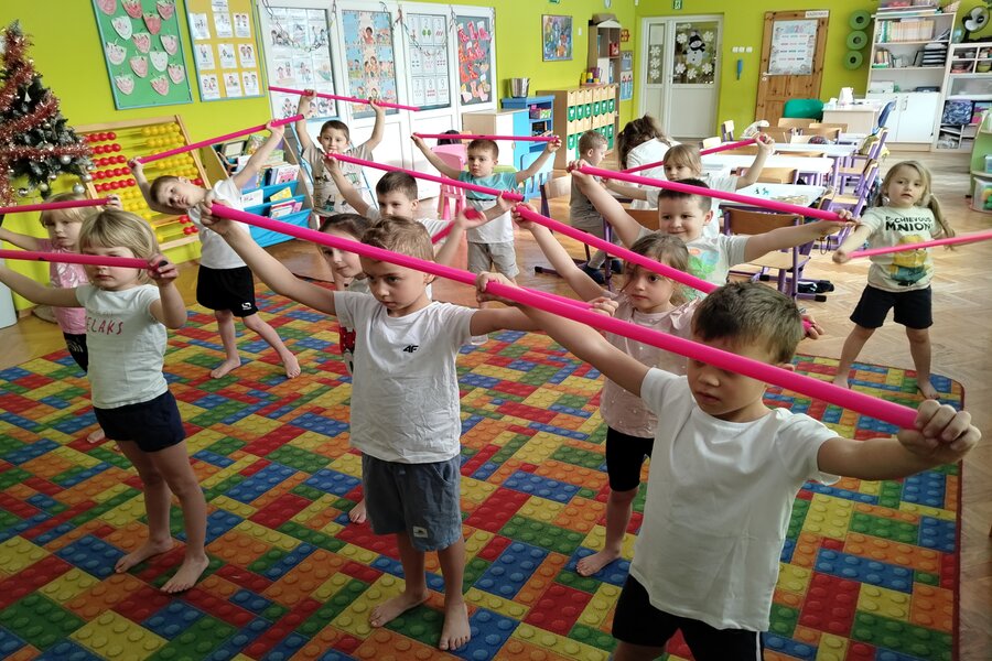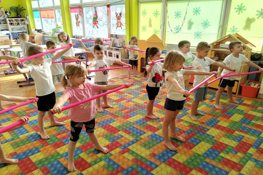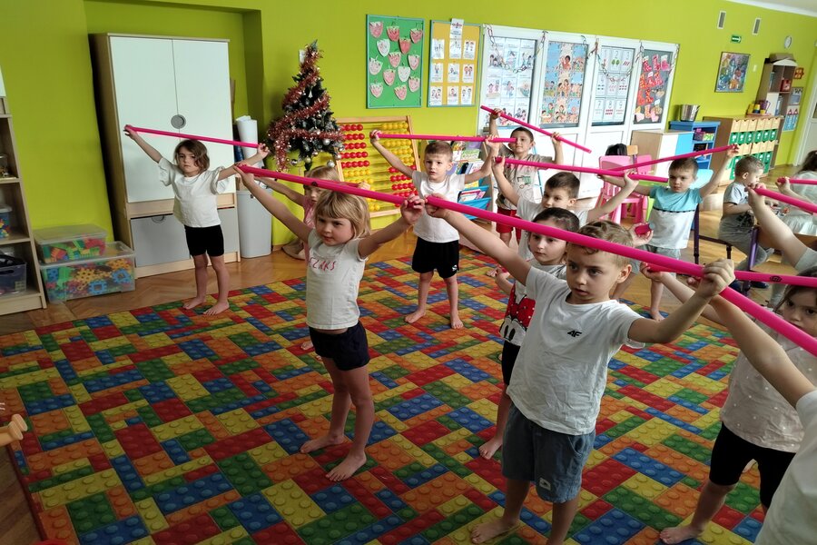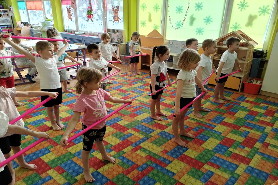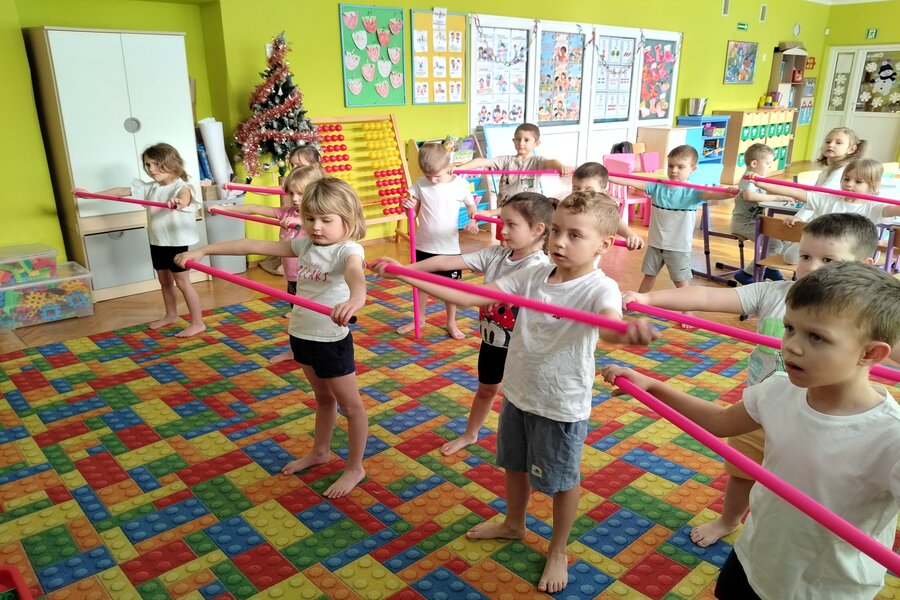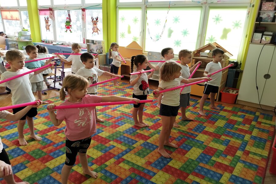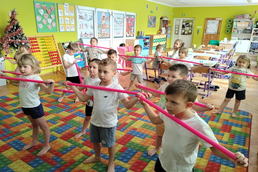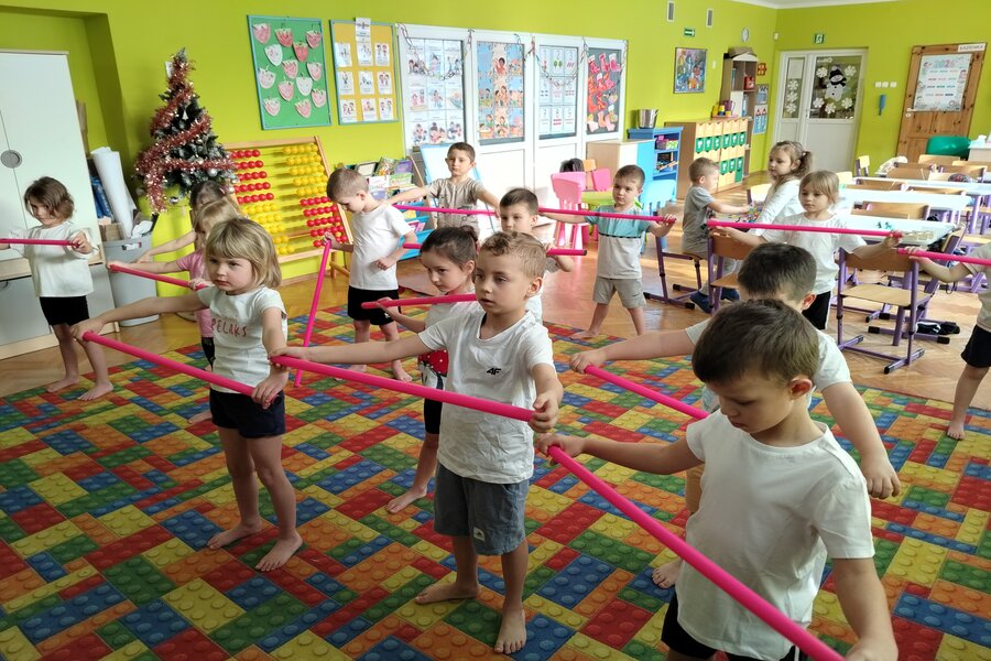 Truskawki dbają o swoją kondycję fizyczną w Nowym Roku 2026. Dzisiaj ćwiczyliśmy z laskami gimnastycznymi, które bardzo lubimy. Doskonaliliśmy swoją postawę i mięśnie posturalne kręgosłupa oraz posługiwanie się przyborem do ćwiczeń. Popatrzcie sami jak dobrze nam szło.