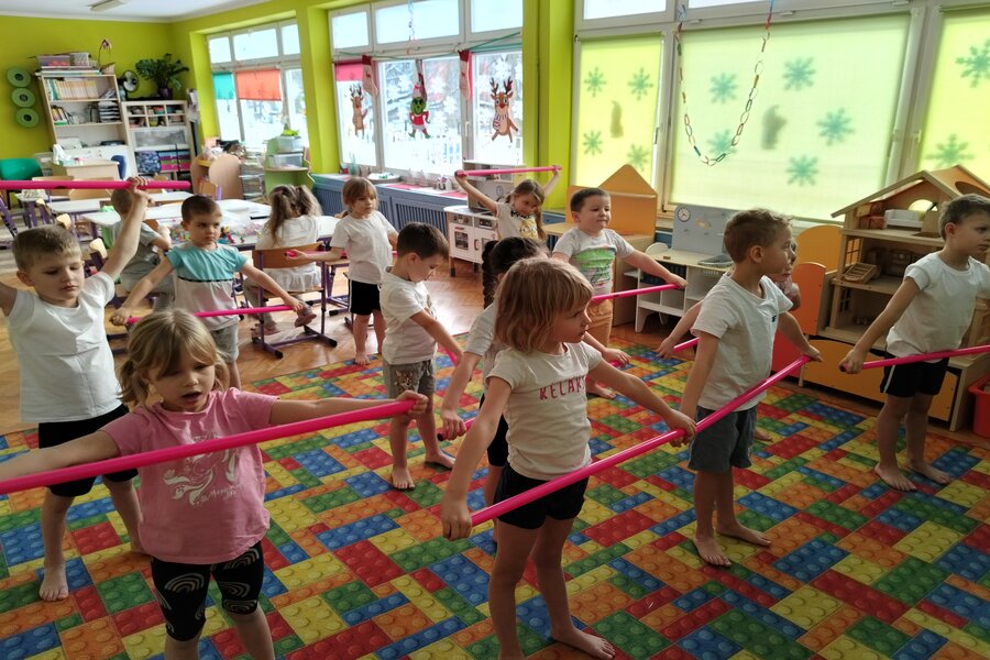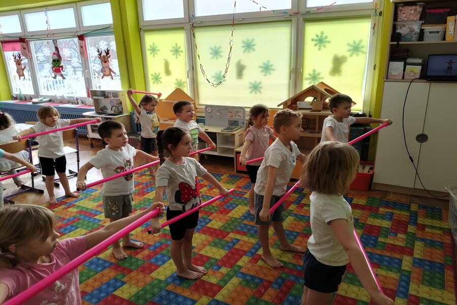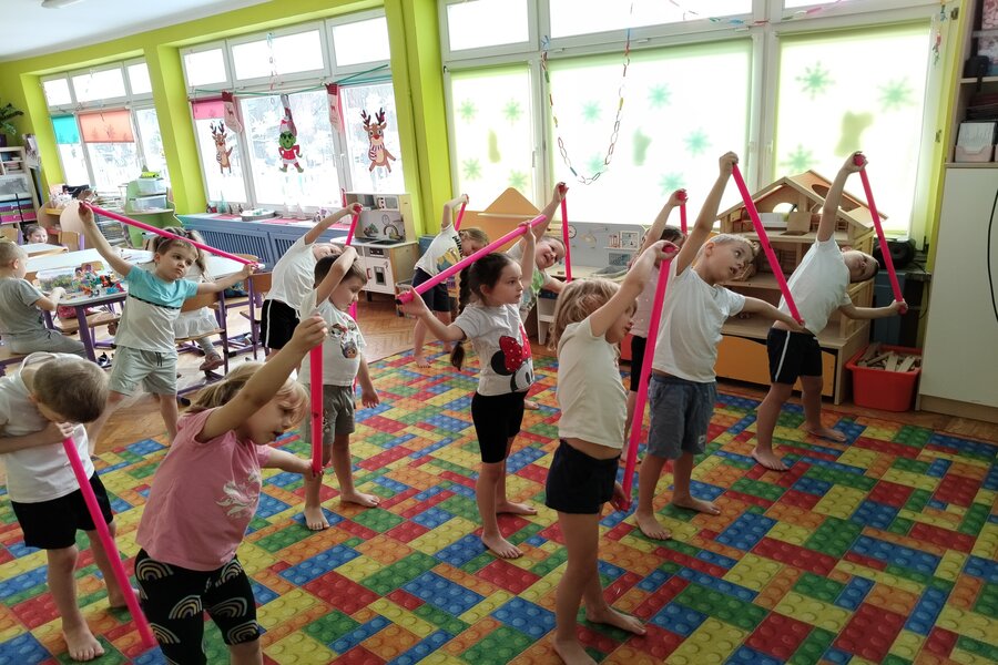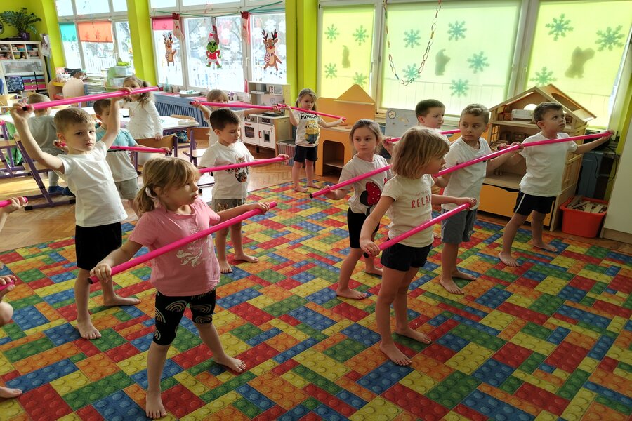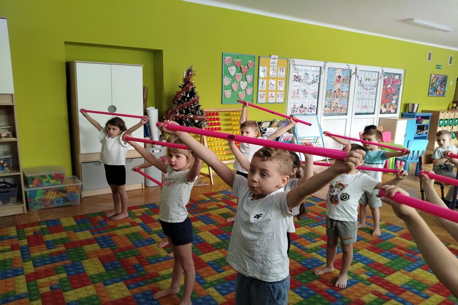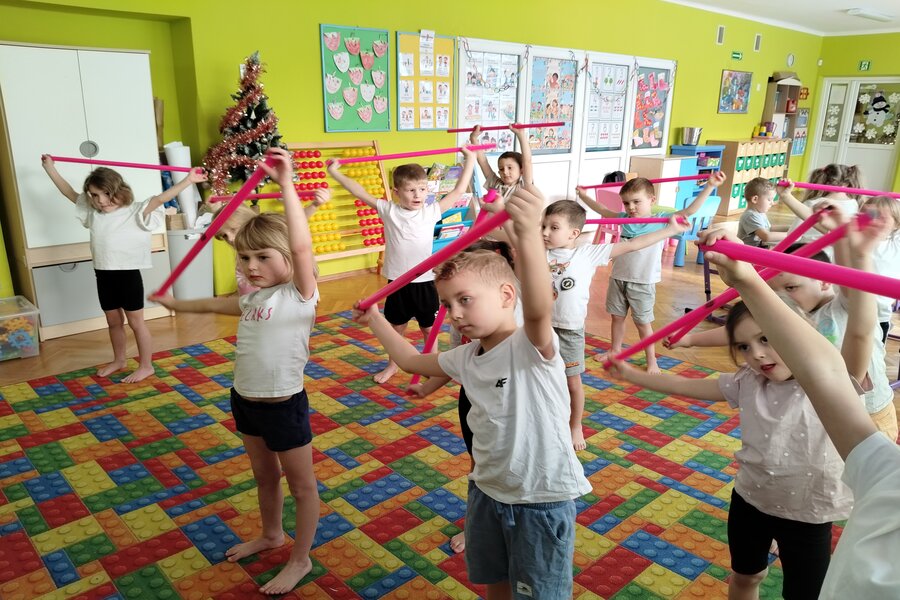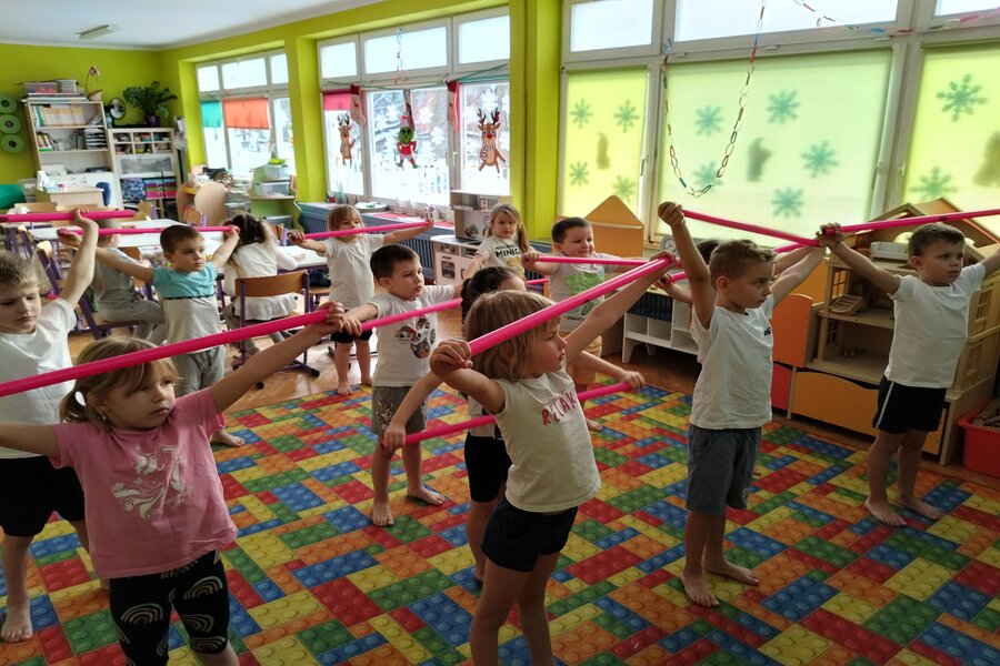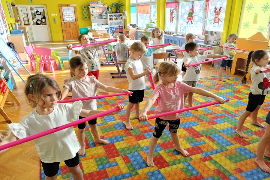 Truskawki dbają o swoją kondycję fizyczną w Nowym Roku 2026. Dzisiaj ćwiczyliśmy z laskami gimnastycznymi, które bardzo lubimy. Doskonaliliśmy swoją postawę i mięśnie posturalne kręgosłupa oraz posługiwanie się przyborem do ćwiczeń. Popatrzcie sami jak dobrze nam szło.