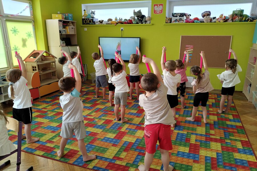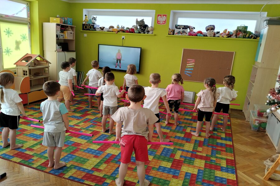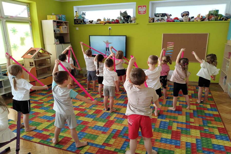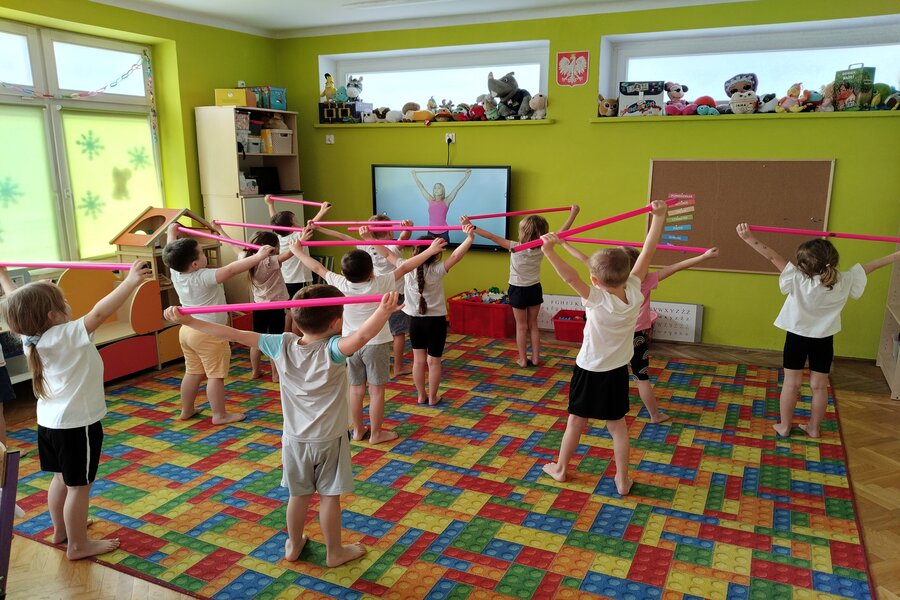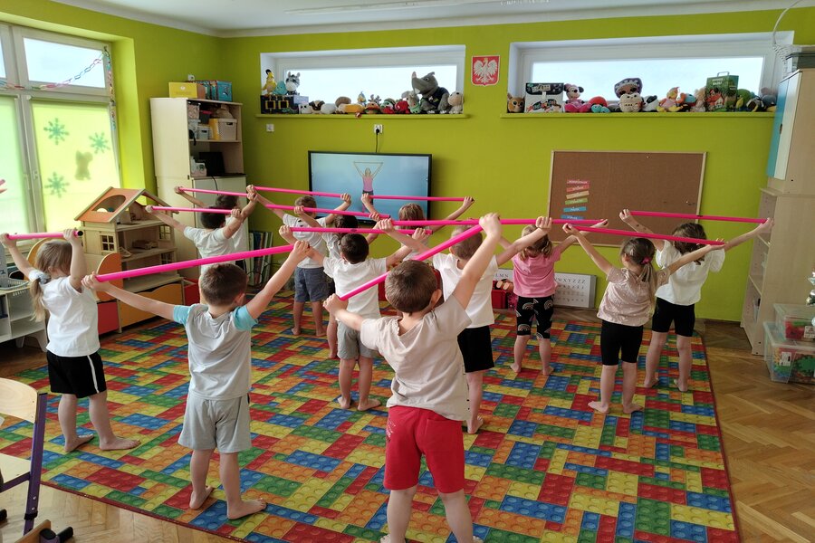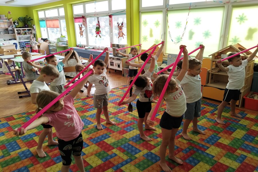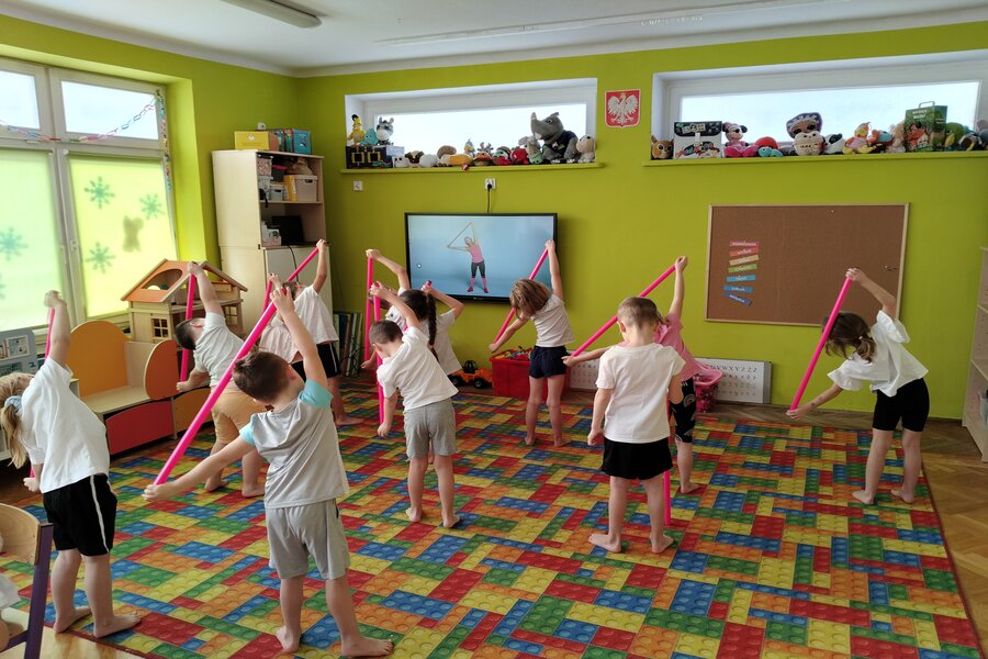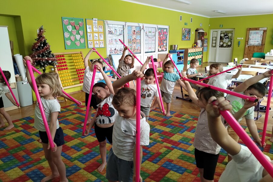 Truskawki dbają o swoją kondycję fizyczną w Nowym Roku 2026. Dzisiaj ćwiczyliśmy z laskami gimnastycznymi, które bardzo lubimy. Doskonaliliśmy swoją postawę i mięśnie posturalne kręgosłupa oraz posługiwanie się przyborem do ćwiczeń. Popatrzcie sami jak dobrze nam szło.