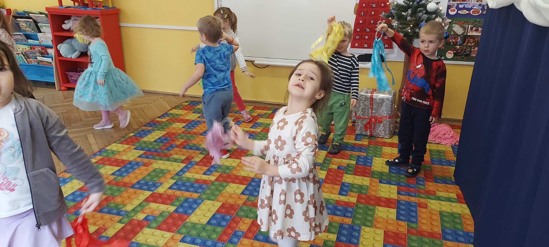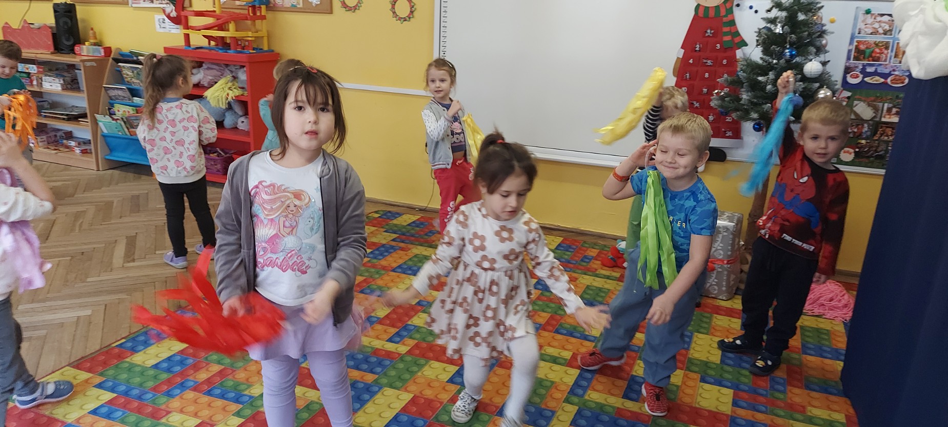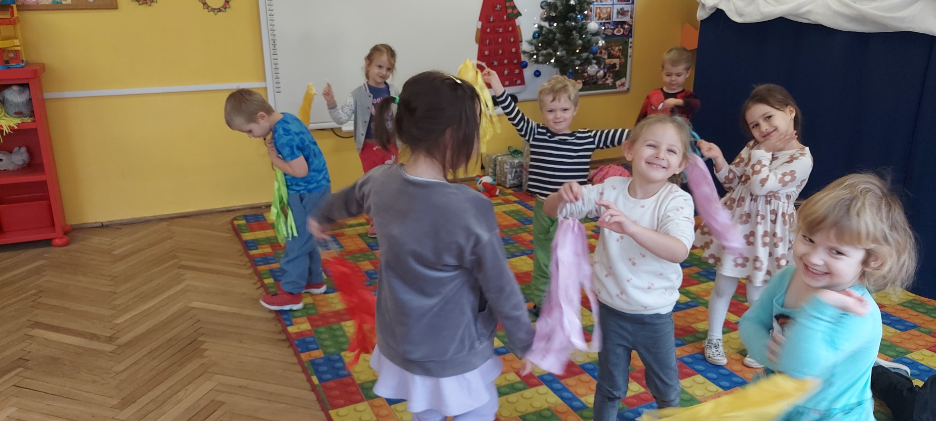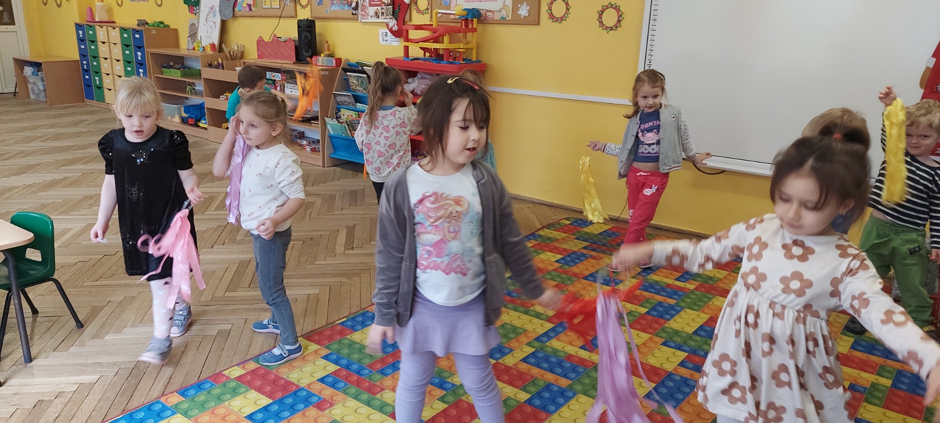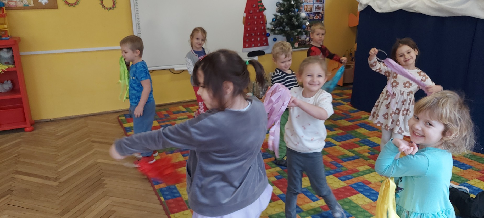 Grupa Motylków uczestniczyła w improwizacjach taneczno-muzycznych z wykorzystaniem rekwizytów. Dzieci poruszały się do muzyki, eksperymentowały z ruchem i rytmem, a kolorowe pompony pomagały im wyrażać emocje i pobudzały wyobraźnię. Zajęcia sprzyjały swobodnej ekspresji, kreatywności oraz radości ze wspólnego działania.