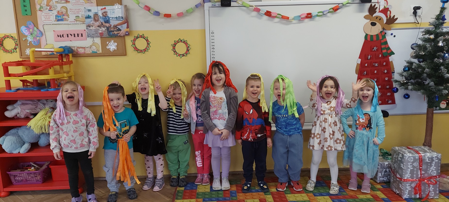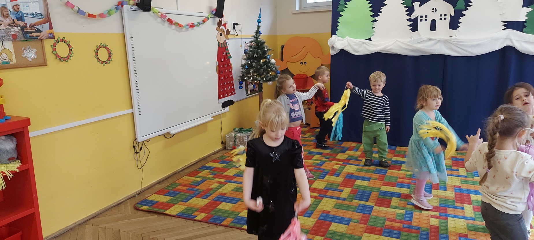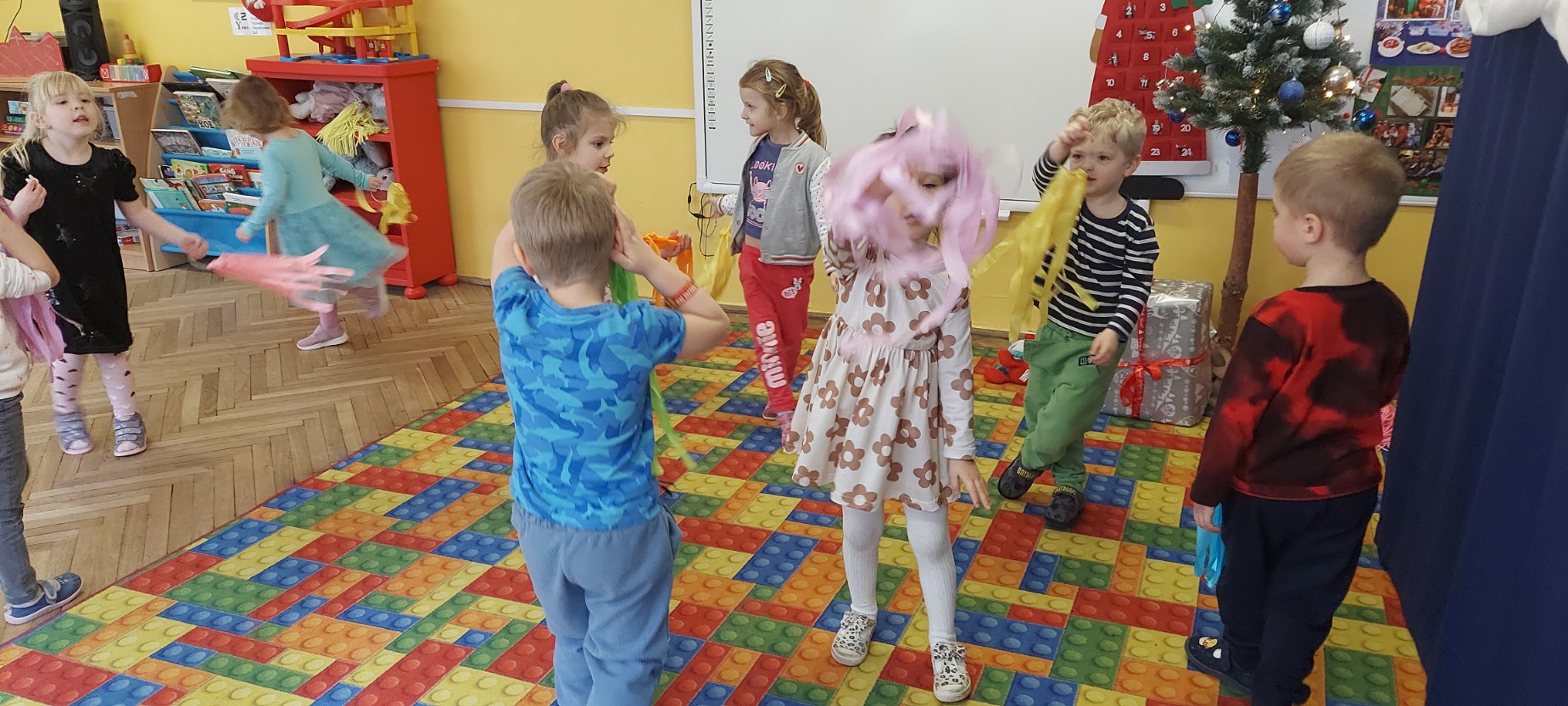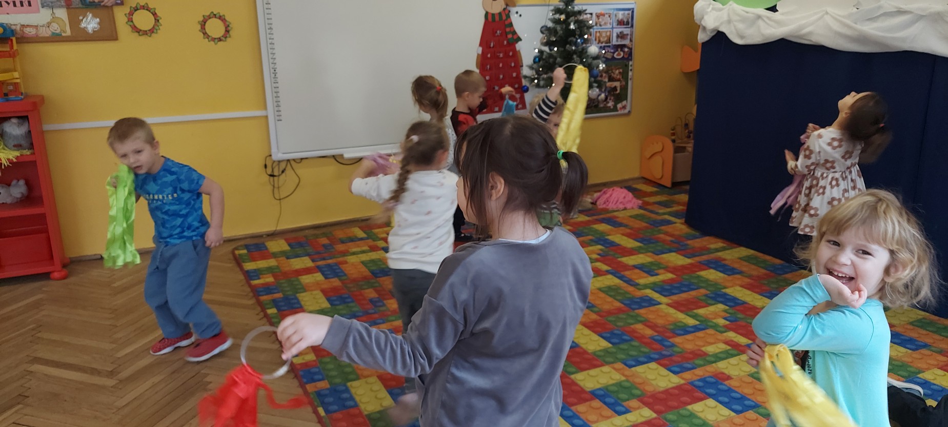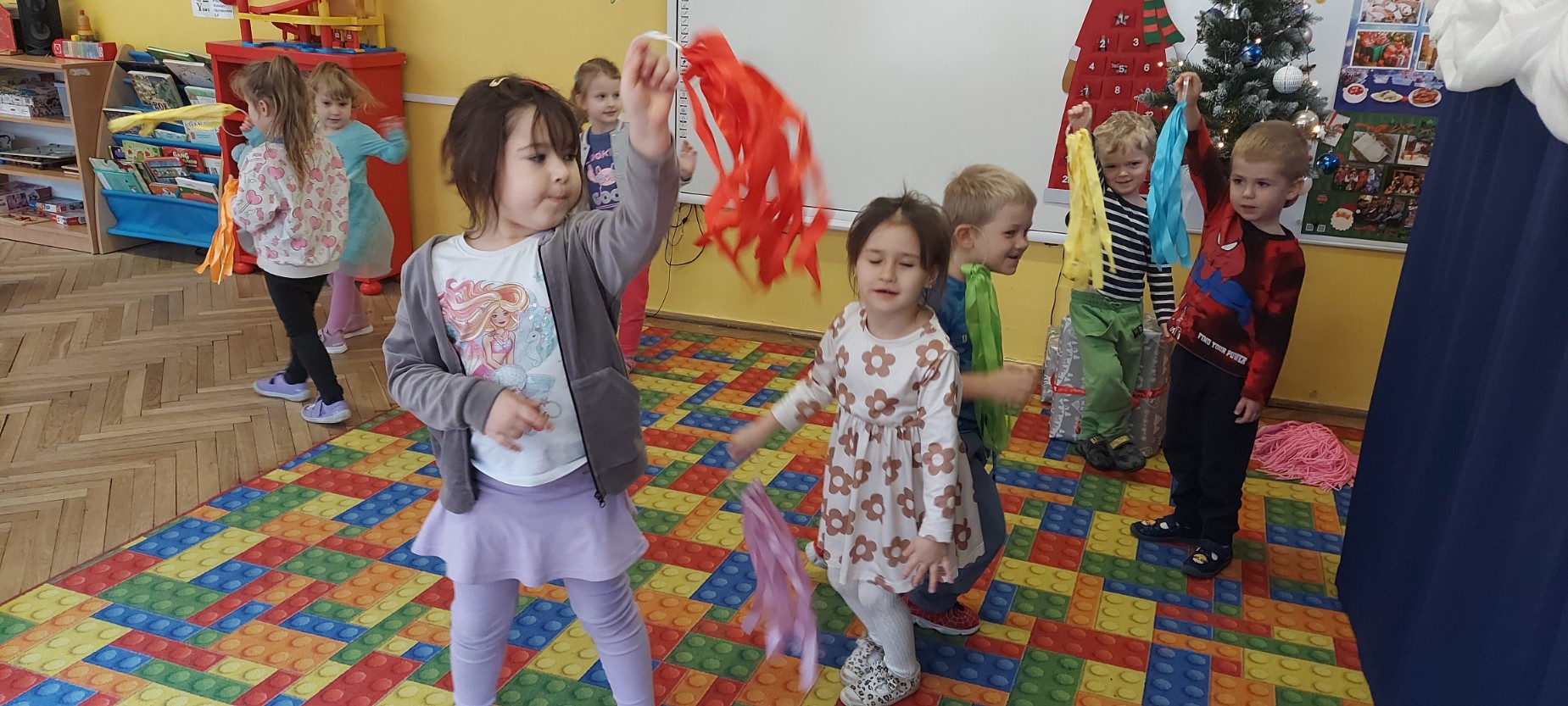 Grupa Motylków uczestniczyła w improwizacjach taneczno-muzycznych z wykorzystaniem rekwizytów. Dzieci poruszały się do muzyki, eksperymentowały z ruchem i rytmem, a kolorowe pompony pomagały im wyrażać emocje i pobudzały wyobraźnię. Zajęcia sprzyjały swobodnej ekspresji, kreatywności oraz radości ze wspólnego działania.