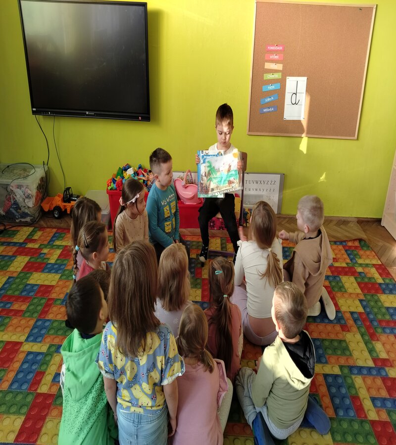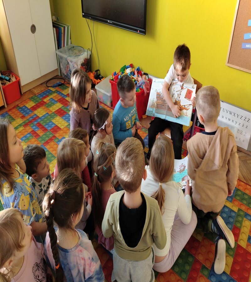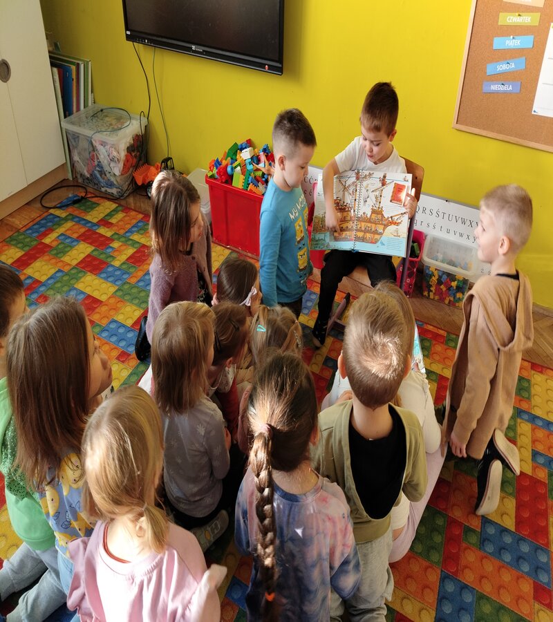 Początek tygodnia u truskawek to jak zawsze kontynuowana akcja ,,Wędrująca książka'' w ramach innowacji ,,Przedszkolak w krainie liter''. Dzisiaj nasz Viktor opowiedział o czytanej w domu wspólnie książce z rodzicami. ,,Prawdziwi piraci'' bo tak brzmiał tytuł lektury, którą nam przedstawił to piękna książka opowiadająca o życiu piratów na statku, tym czym się zajmowali i co robili z łupami. Viktor pokazywał ukryte okienka w książce i z wielkim zaangażowaniem opowiadał o przygodach piratów. Przedszkolaki były zafascynowane książką i jej budową - ukryte okienka a dziewczynki pięknym rysunkiem z kryształkiem. Czekamy na kolejne ciekawe opowieści.