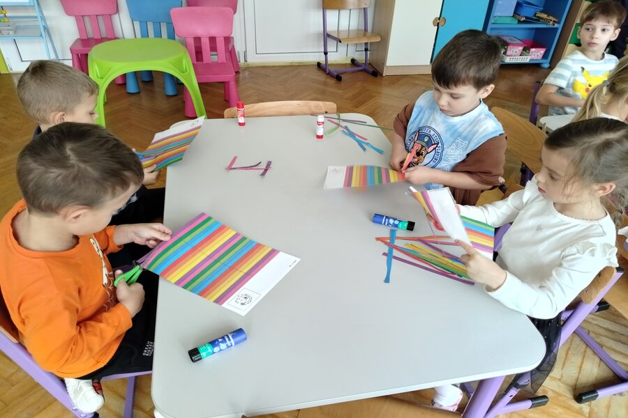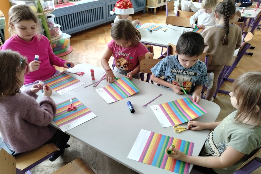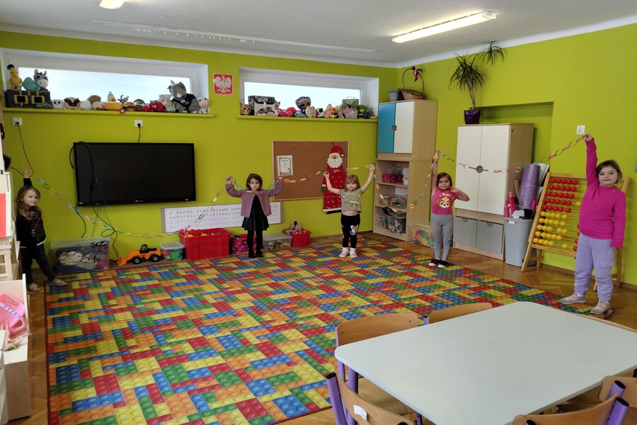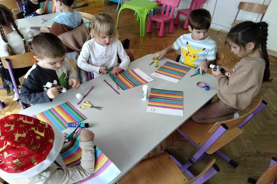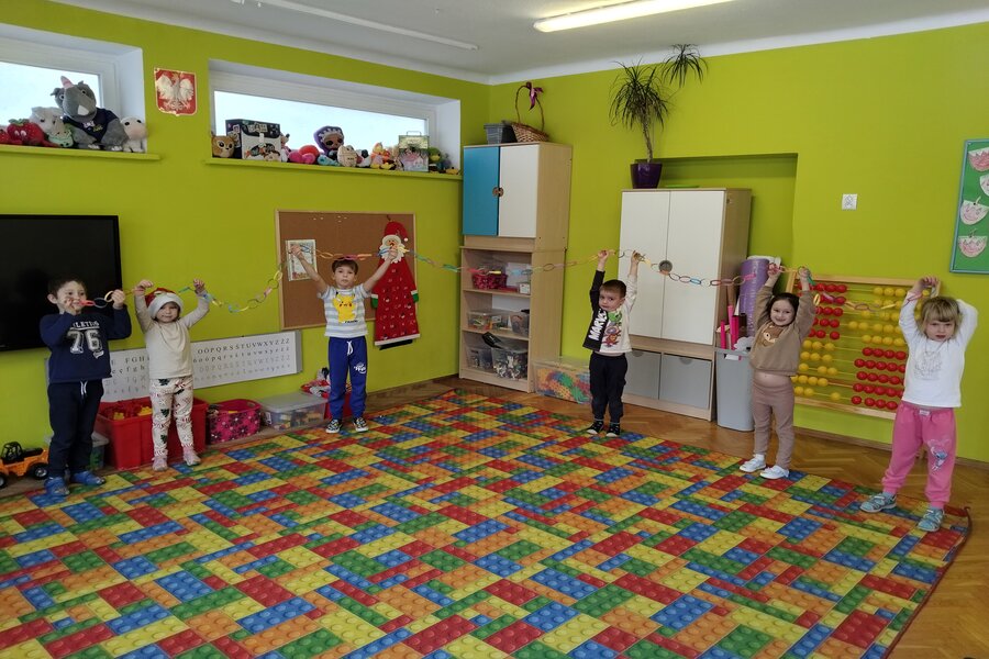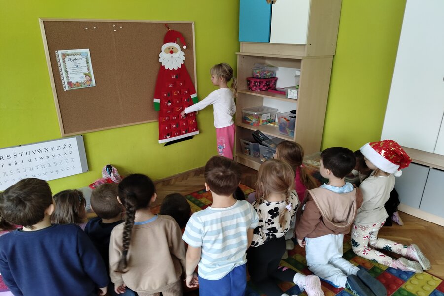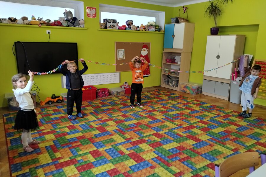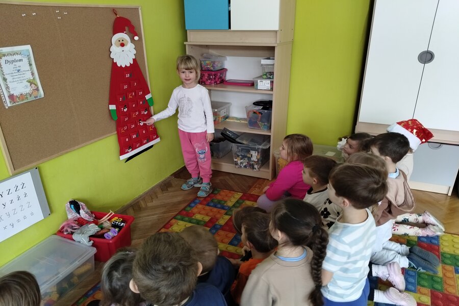 Truskawki rozpoczęły znaną im już tradycję odliczania do Świąt Bożego Narodzenia. Dzisiaj w klasie zawisł znanym przedszkolakom kalendarz adwentowy. Pierwsze zadanie zostało wylosowane - wykonać ozdobę choinkową. Wszyscy się ucieszyli bo mogli zrobić łańcuch na choinkę w małych zespołach pracując przy swoich stołach. Na koniec mogliśmy porównać długość powstałych łańcuchów p i ozdobić nimi naszą salę.