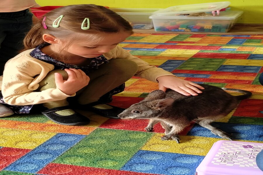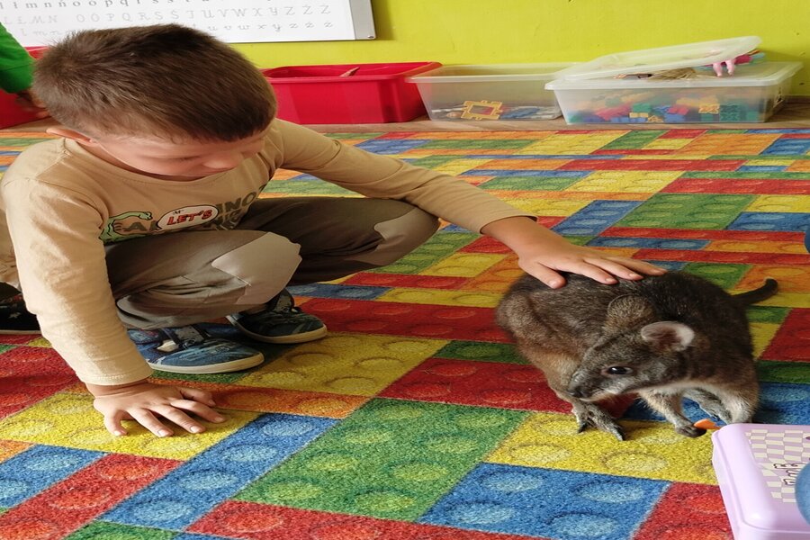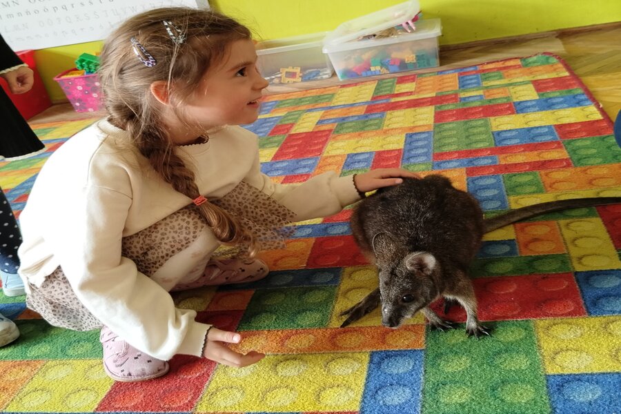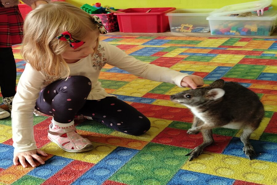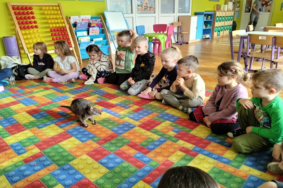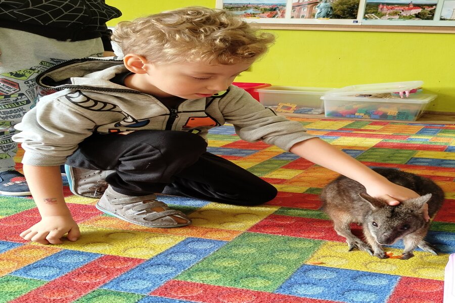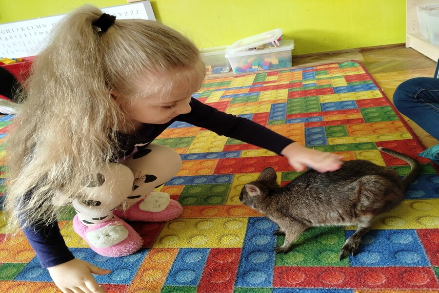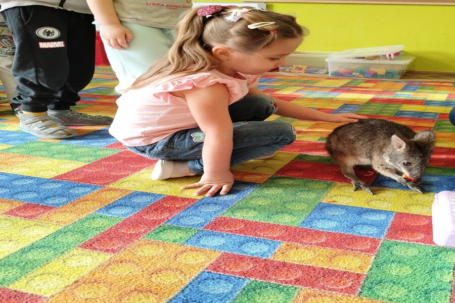 Dzisiaj naszą grupę odwiedził bardzo miły gość z Fundacji Mali Odkrywcy a był nim kangurek miniaturka o imieniu Willy. Pani zajmująca się kangurkiem powiedziała że maluszek ma dopiero jedynaście miesięcy i jest roślinożercą. Kangury występują w Australii i noszone są w torbie mamy przez sześć miesięcy. Kangurek Willy okazał się bardzo towarzyski i przedszkolaki mogły go pogłaskać choć lubi on odpoczywać w ciągu dnia zwłaszcza po jedzeniu spać lub leżeć na swoim ogonie. Każdy kto ma duży przydomowy ogródek mógłby mieć takiego Willego w domu pod warunkiem iż miał by zezwolenie potrzebne do trzymania zwierząt egzotycznych. Wszyscy czekamy na odwiedziny kolejnych zwierzaków w naszej grupie.