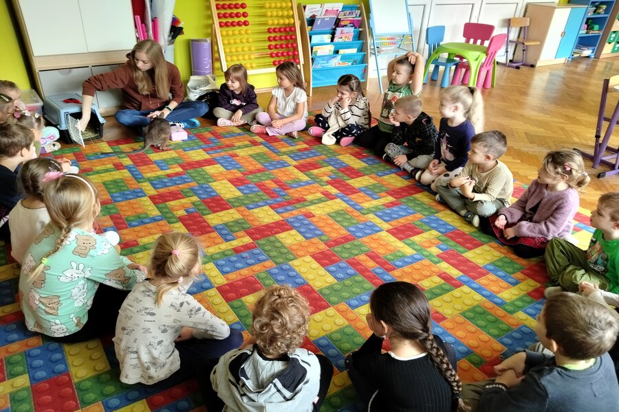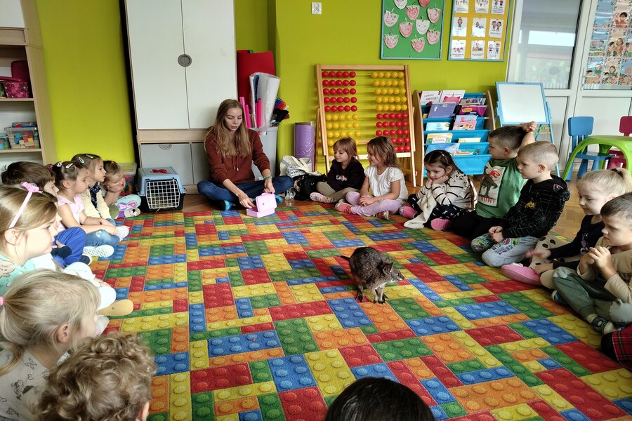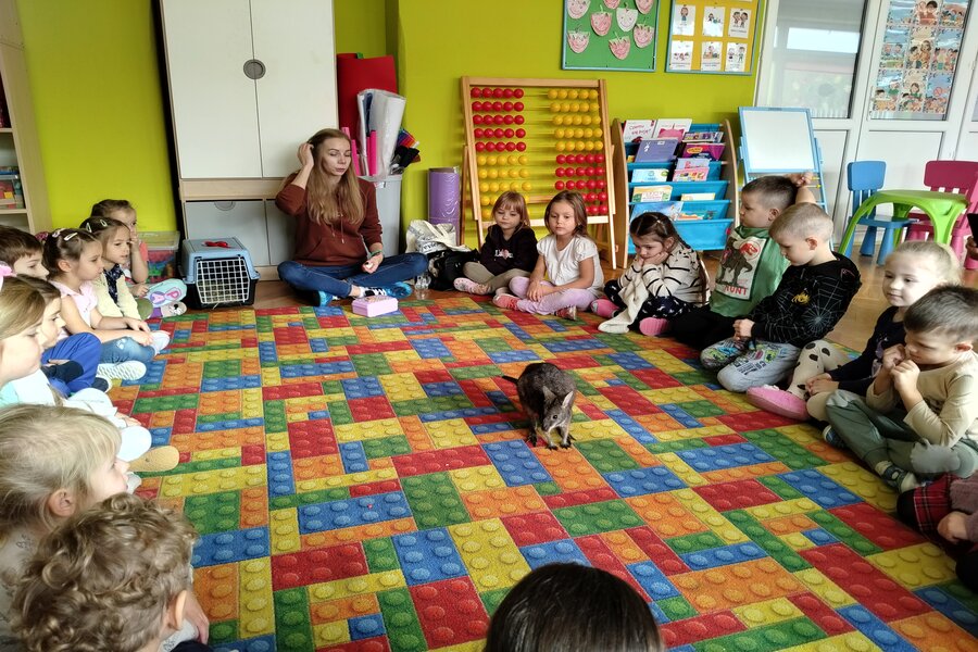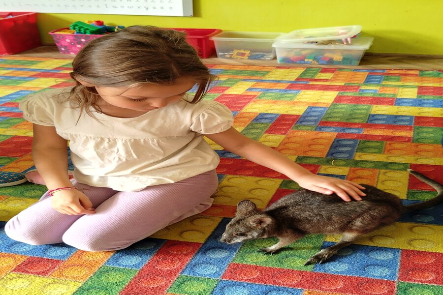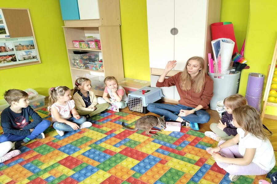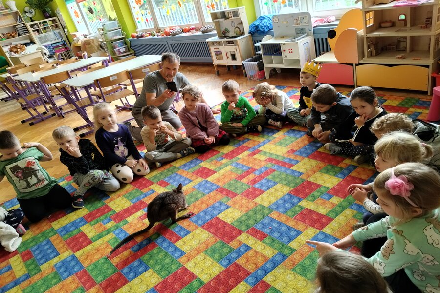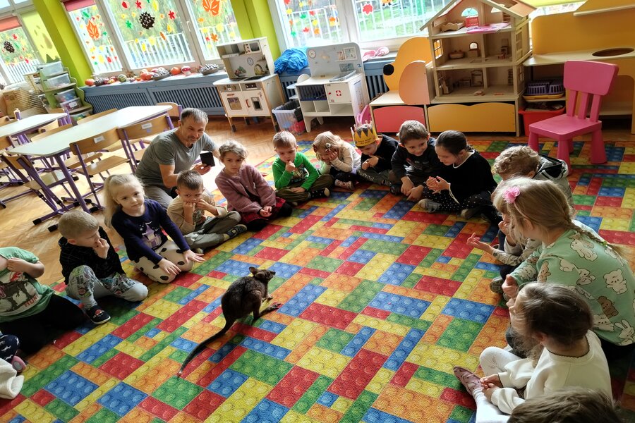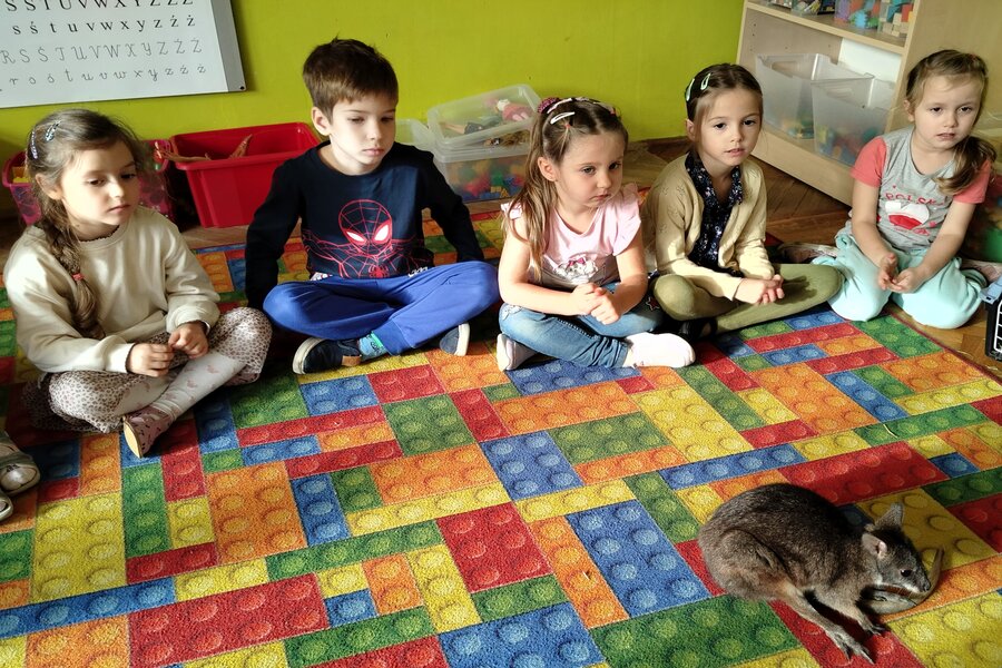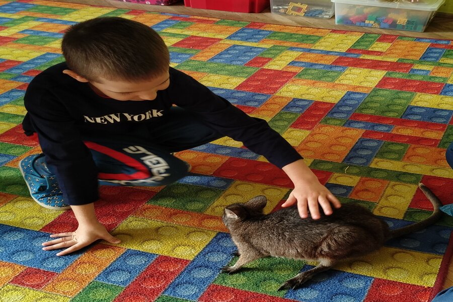 Dzisiaj naszą grupę odwiedził bardzo miły gość z Fundacji Mali Odkrywcy a był nim kangurek miniaturka o imieniu Willy. Pani zajmująca się kangurkiem powiedziała że maluszek ma dopiero jedynaście miesięcy i jest roślinożercą. Kangury występują w Australii i noszone są w torbie mamy przez sześć miesięcy. Kangurek Willy okazał się bardzo towarzyski i przedszkolaki mogły go pogłaskać choć lubi on odpoczywać w ciągu dnia zwłaszcza po jedzeniu spać lub leżeć na swoim ogonie. Każdy kto ma duży przydomowy ogródek mógłby mieć takiego Willego w domu pod warunkiem iż miał by zezwolenie potrzebne do trzymania zwierząt egzotycznych. Wszyscy czekamy na odwiedziny kolejnych zwierzaków w naszej grupie.