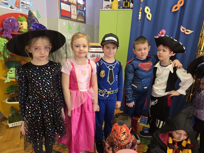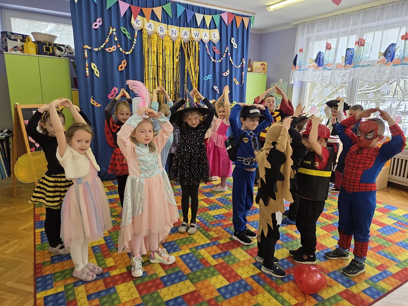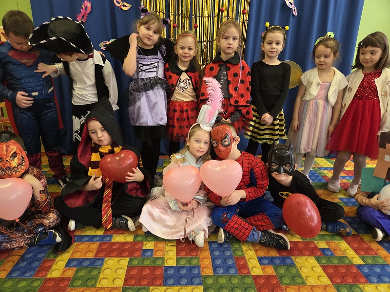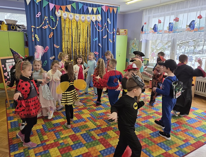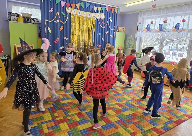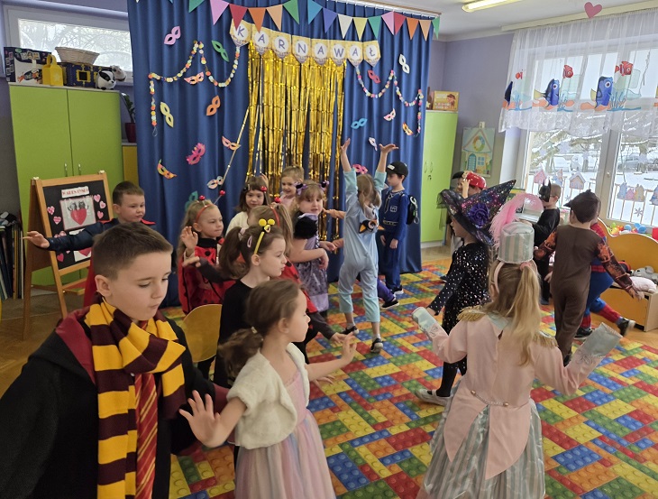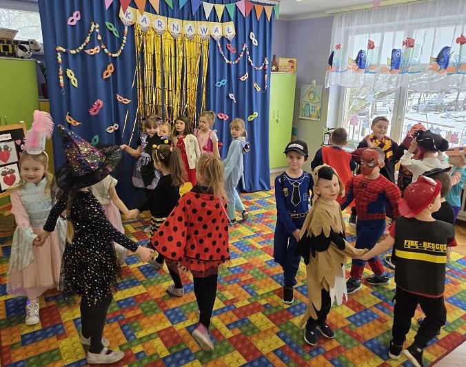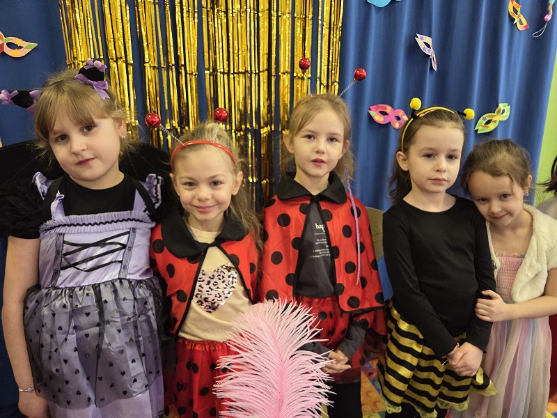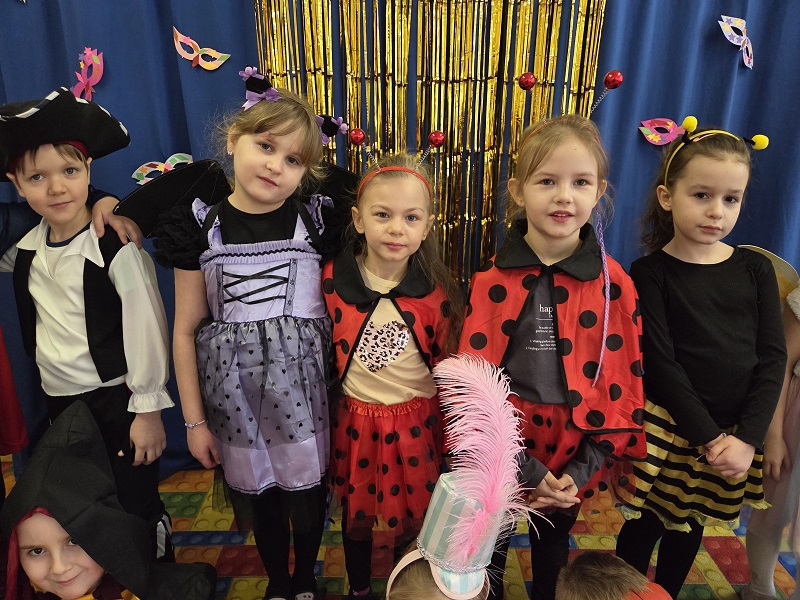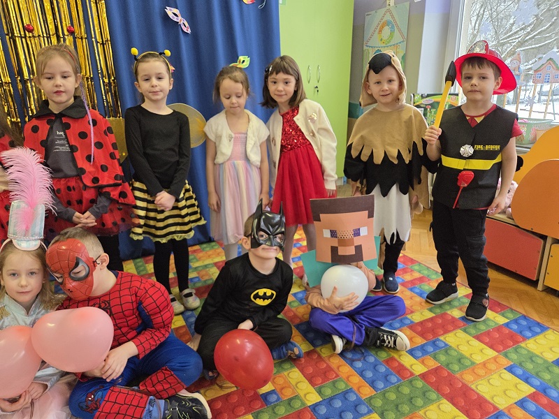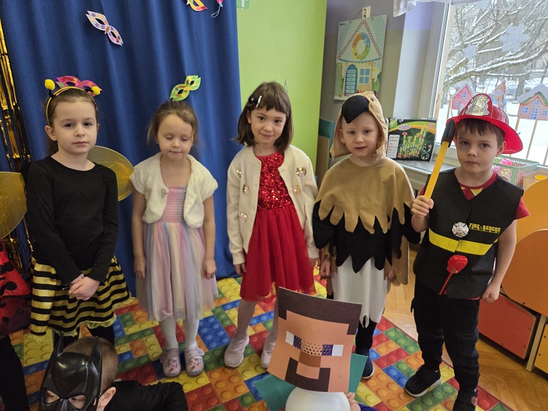 Przedszkolaki z grupy Biedronek uczestniczyły w zabawach karnawałowych, biorąc udział w konkurencjach zręcznościowych, zabawach ruchowych i tanecznych. Dzieci przebrane były za bohaterów znanych bajek i filmów, wróżki, królewny, czarownice i zwierzęta.