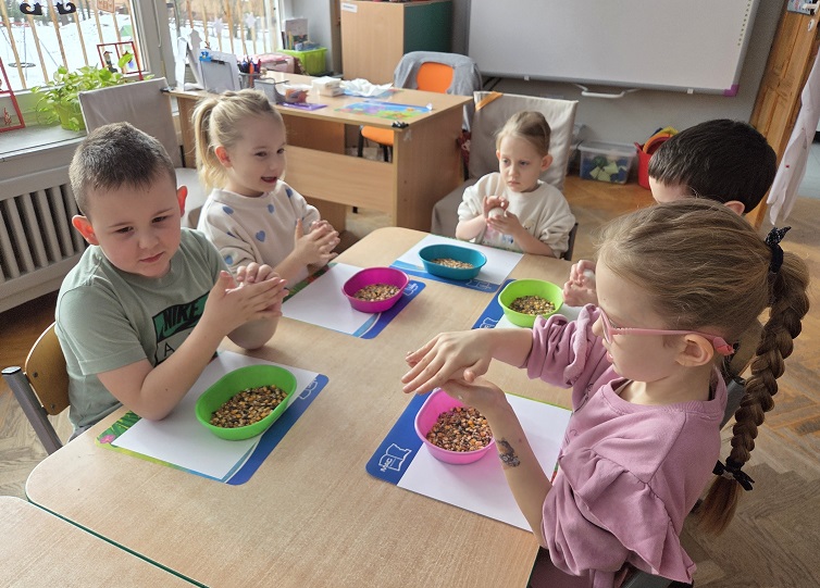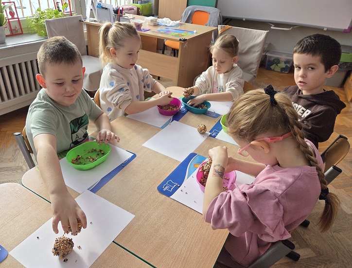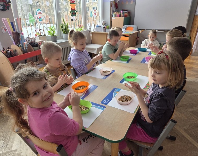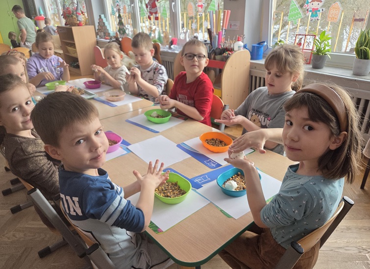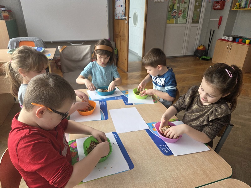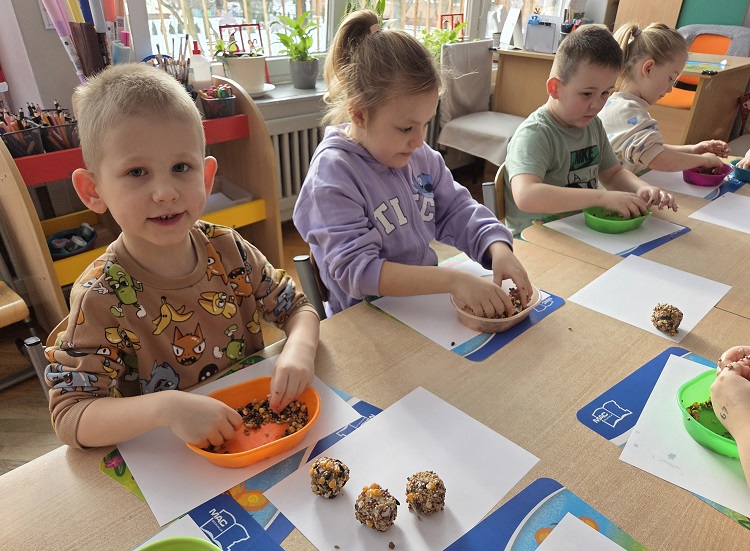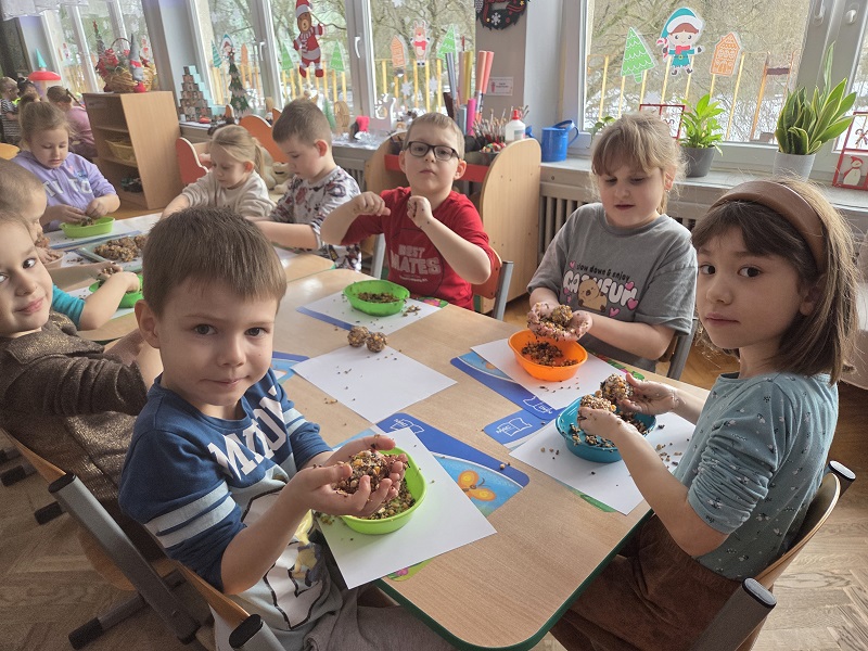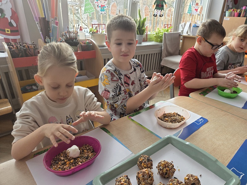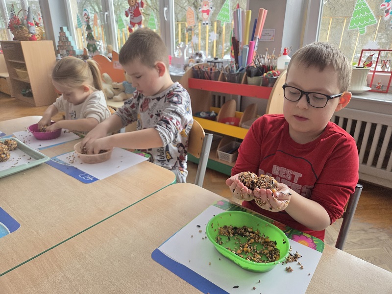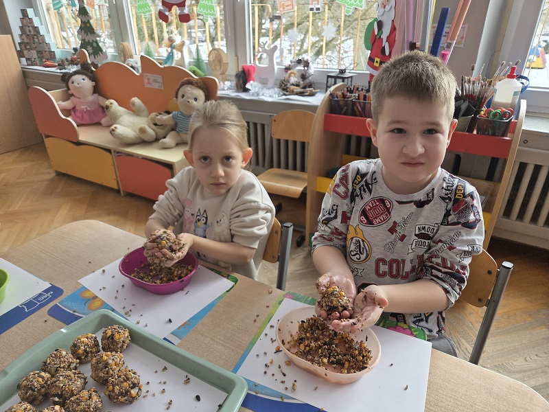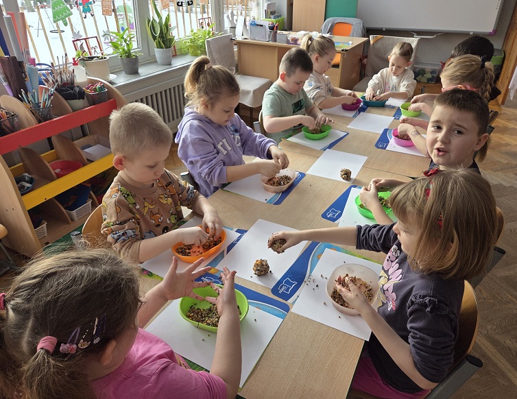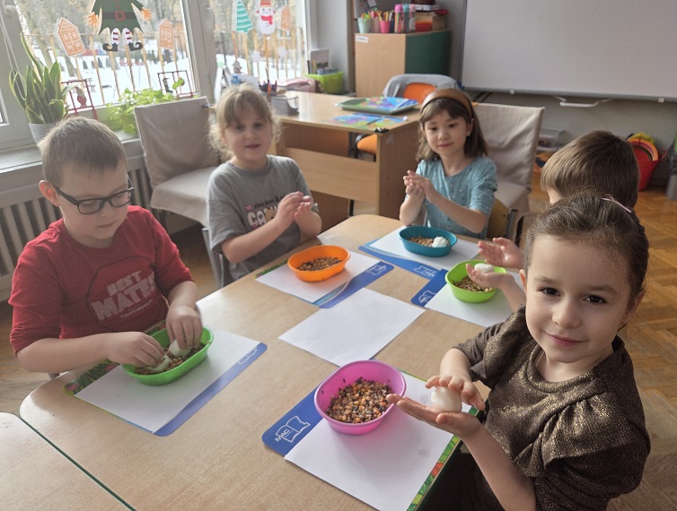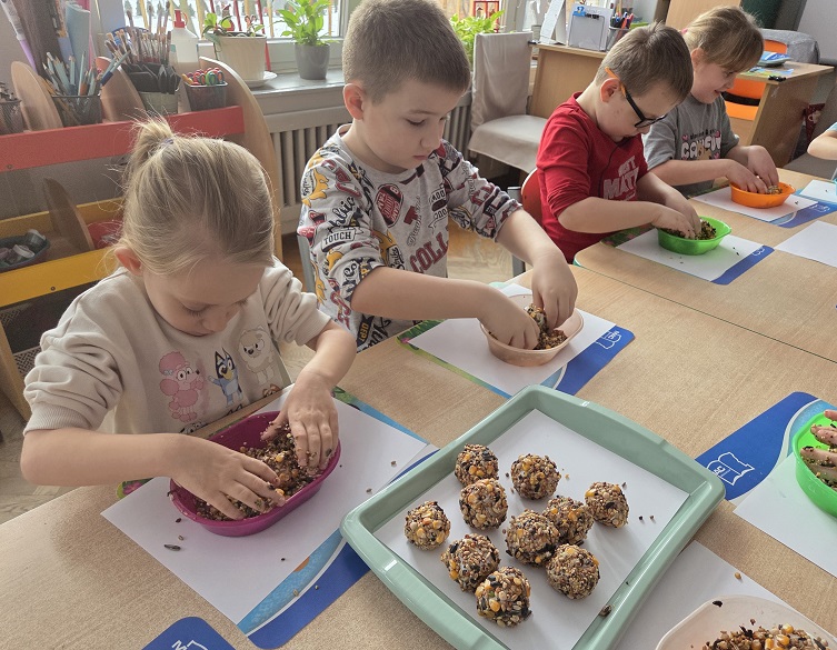 Grupa Biedronek wykonała kolejne zadanie, w ramach projektu - "Jestem Małym Przyjacielem Przyrody", tym razem przedszkolaki wzięły udział w warsztatach z robienia kul tłuszczowych dla ptaków, z wykorzystaniem smalcu, nasion słonecznika, mieszanki zbóż, kukurydzy i innych ptasich przysmaków. Dzieci z zaangażowaniem pracowały nad wykonaniem kul, które po ostudzeniu zostaną zawieszone w przedszkolnym ogrodzie.