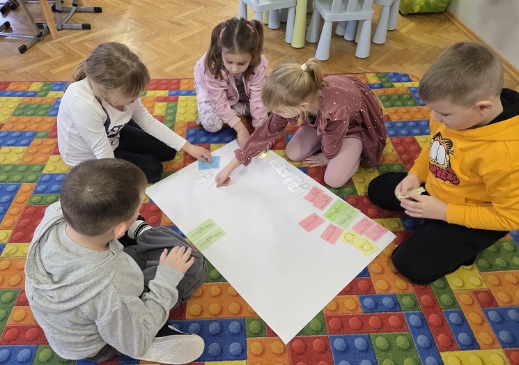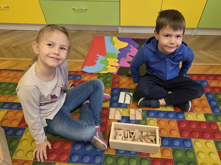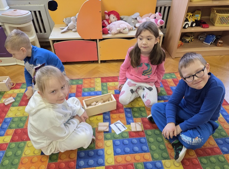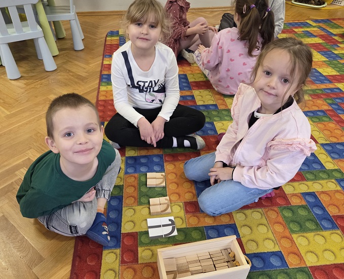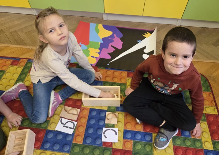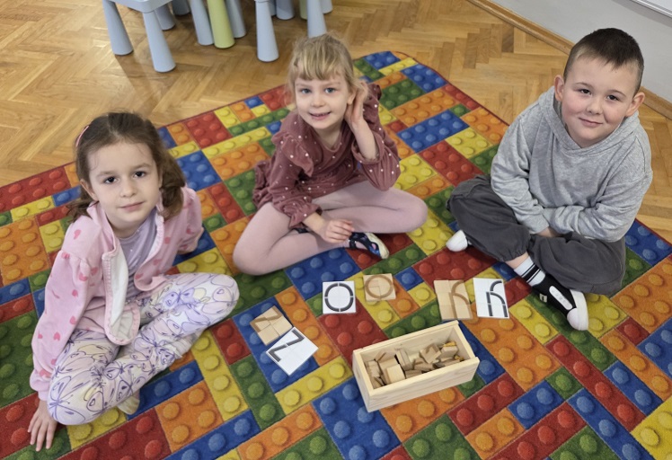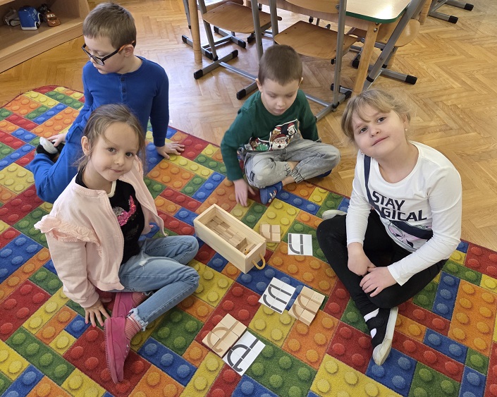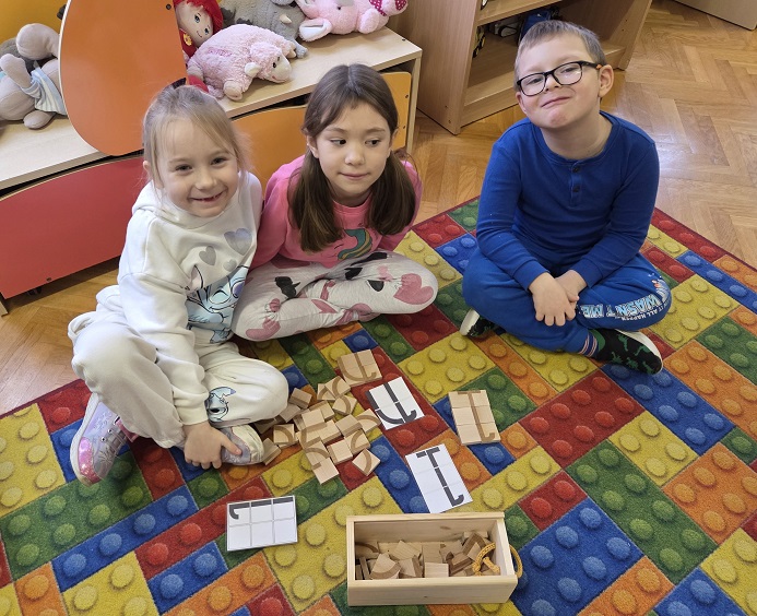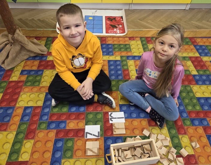 Przedszkolaki z grupy Biedronek utrwalając poznane litery: u i n, słuchają wierszy: "Wizyta w muzeum", "Nosalowe królestwo", wykonują ćwiczenia językowe i słowne, układają litery z klocków konstrukcyjnych w małych zespołach oraz uczestniczą w zabawach w parach: "Moja ulubiona litera", "Literowe pary", "Jaka to litera?", kontynuując realizację innowacji pedagogicznej "Skuteczne Zdziwienie - Wyzwalające Myślenie".