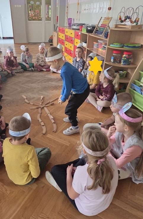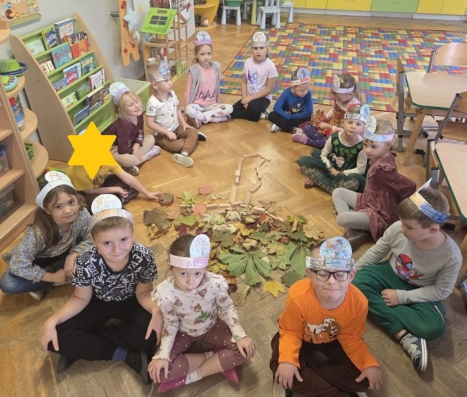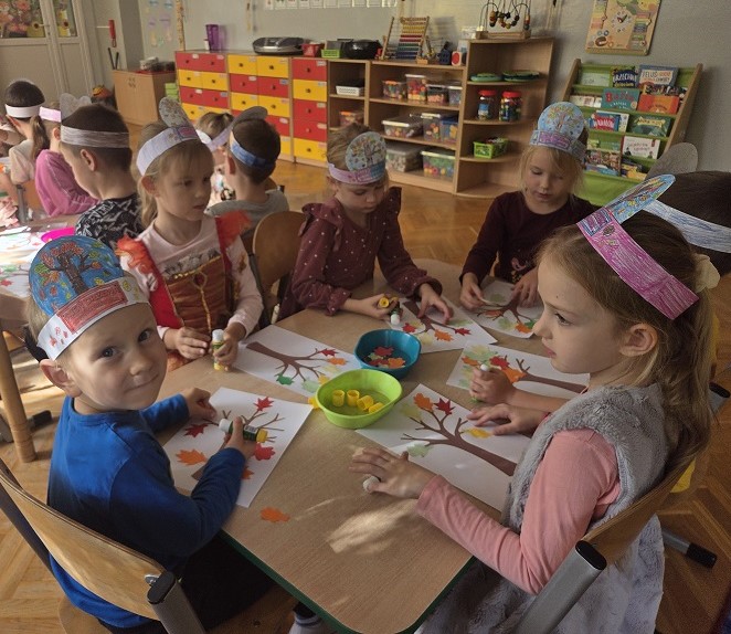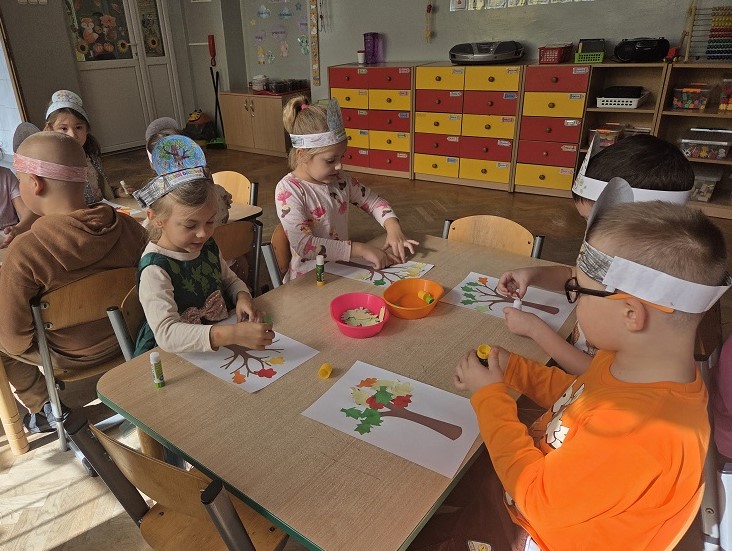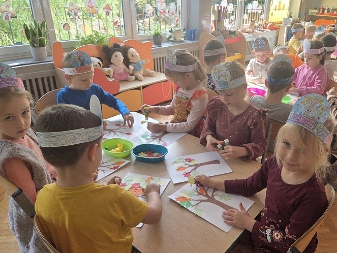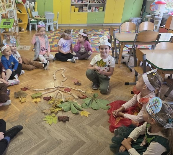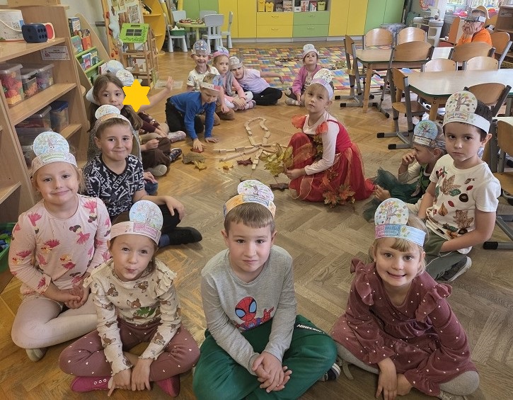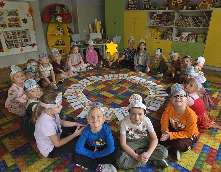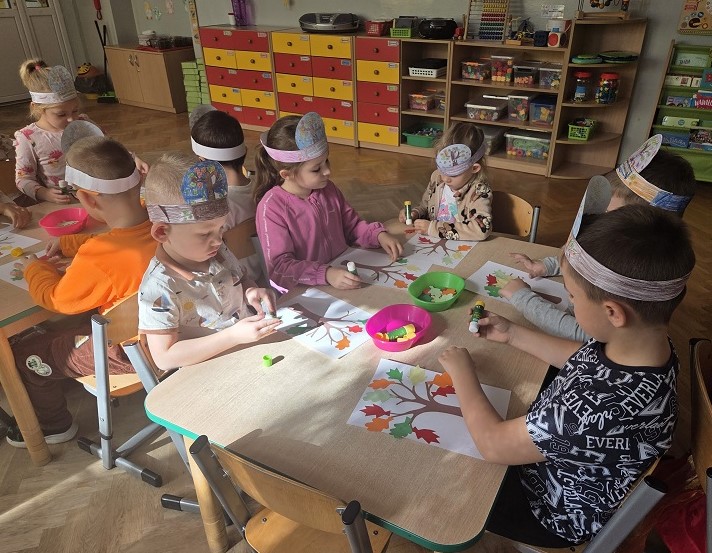 10 października 2025r. grupa Biedronek świętowała Dzień Drzewa, w ramach realizacji projektu - "Jestem Małym Przyjacielem Przyrody". Przedszkolaki z ciekawością wysłuchały bajki E. Piotrowskiej „Bajka o drzewie”, ukazującej historię pewnego drzewa, które od najmniejszej roślinki jest uczestnikiem wielkiego cyklu zmian w przyrodzie. Dowiedziały się jak ważne są drzewa w życiu człowieka oraz co powinniśmy robić, by je chronić i o nie dbać. Następnie rozmawialiśmy o różnych gatunkach drzew liściastych i iglastych, ich rodzajach i nazwach, rozpoznawaliśmy drzewa jakie można spotkać w ogrodzie przedszkolnym oraz tworzyliśmy drzewo z materiałów przyrodniczych. Bawiliśmy się do utworu „Kolorowe listki”, uczestnicząc w zabawach ruchowych i poszukujących. Dzieci tworzyły "Jesienne drzewo" oraz opaskę z motywem przewodnim zajęć.