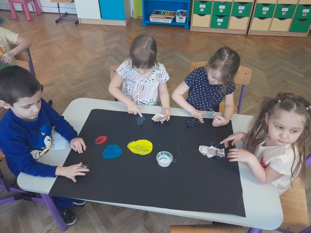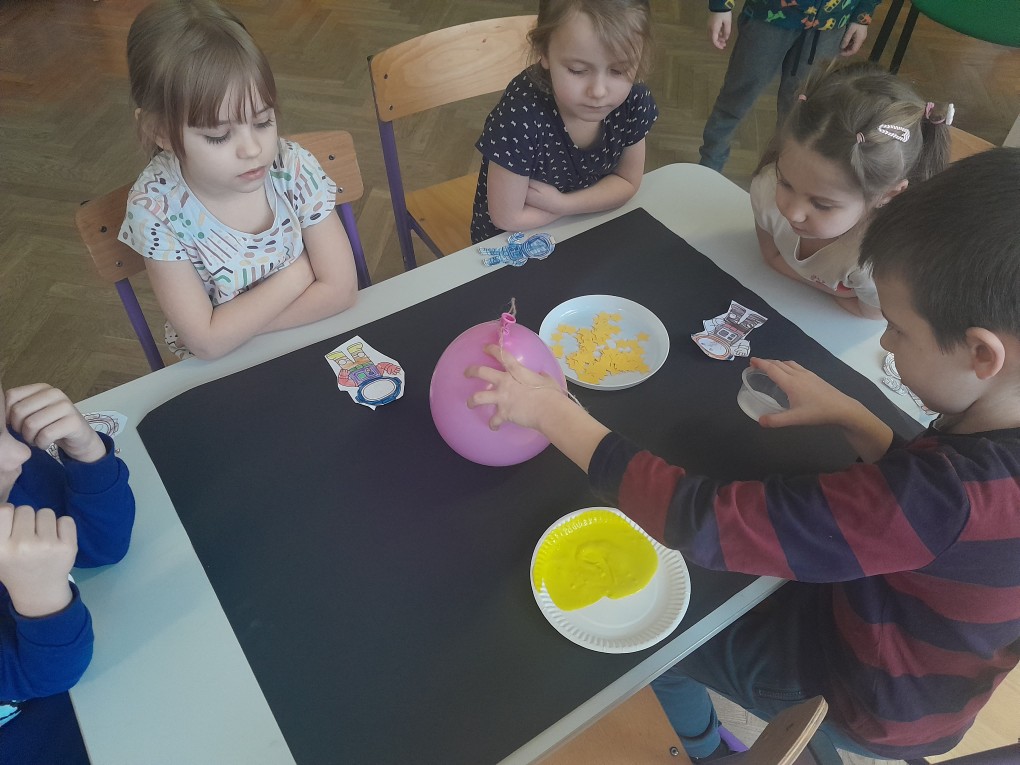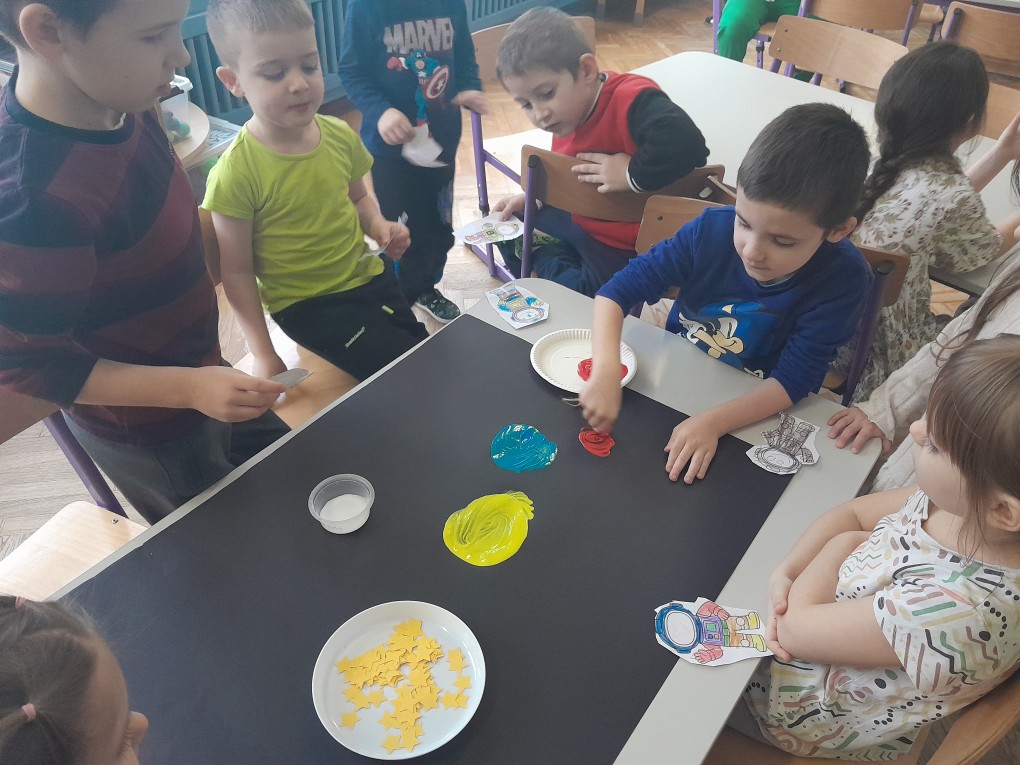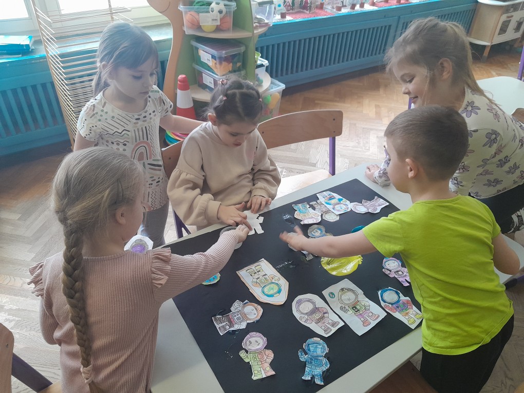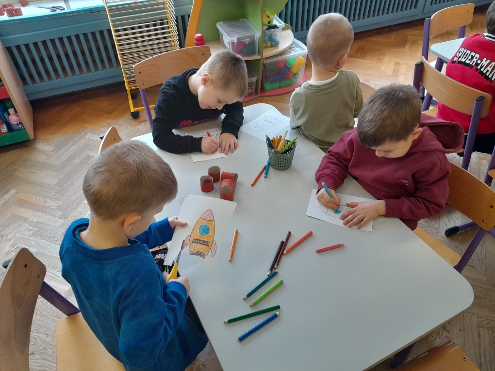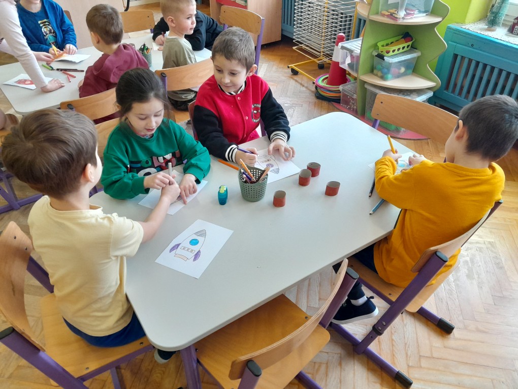 Dzieci układały również puzzle o tematyce kosmicznej, ćwicząc przy tym współpracę, cierpliwość i umiejętność wspólnego działania. Dużo radości sprawiło im także tworzenie rakiet z liter swojego imienia – w ten sposób utrwalały znajomość liter i rozwijały gotowość do nauki czytania. Jak zawsze nie zabrakło kreatywnych prac plastycznych – powstały piękne rakiety i rozgwieżdżone niebo.
