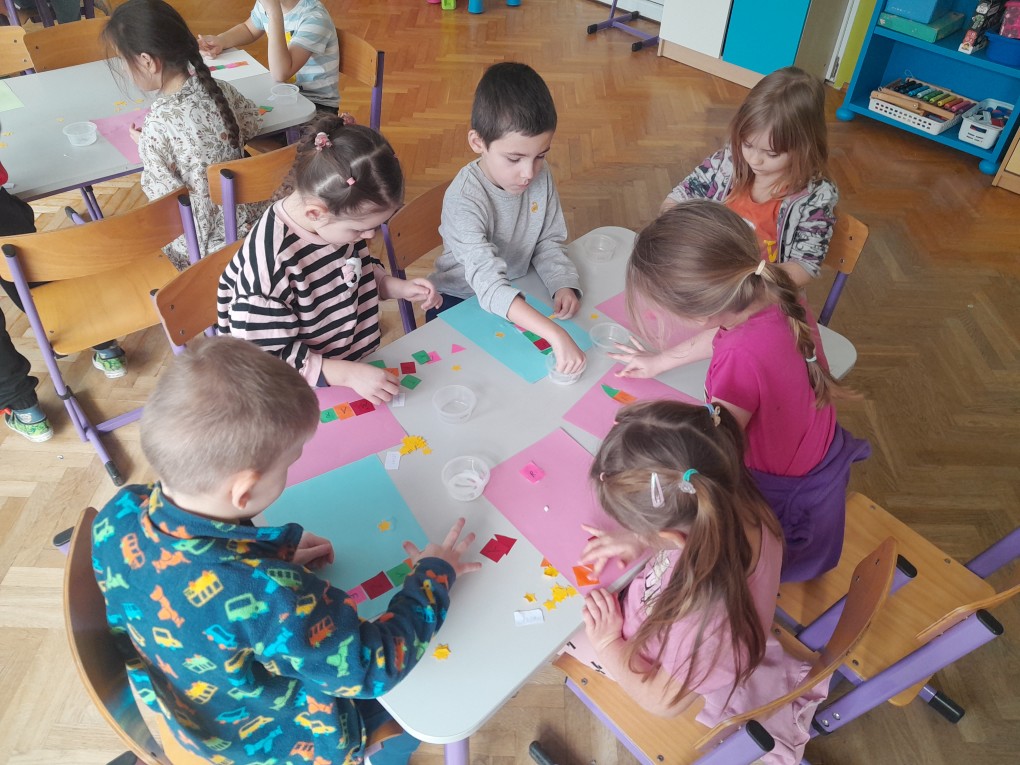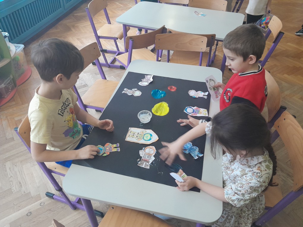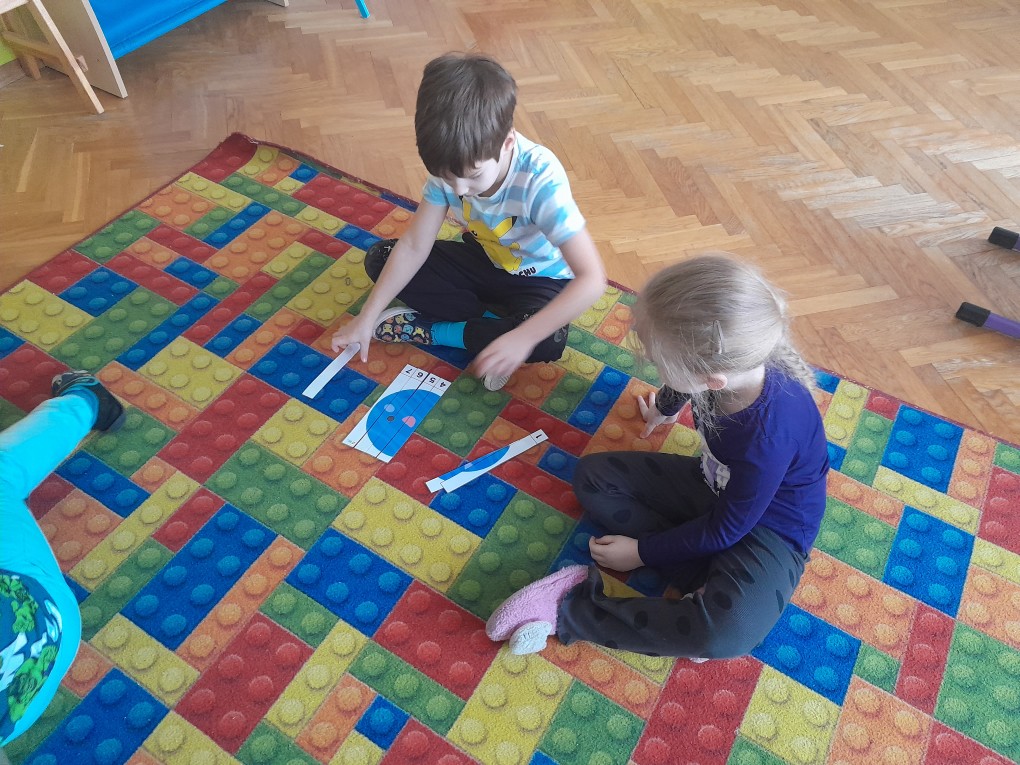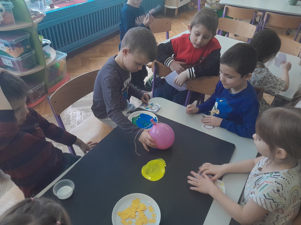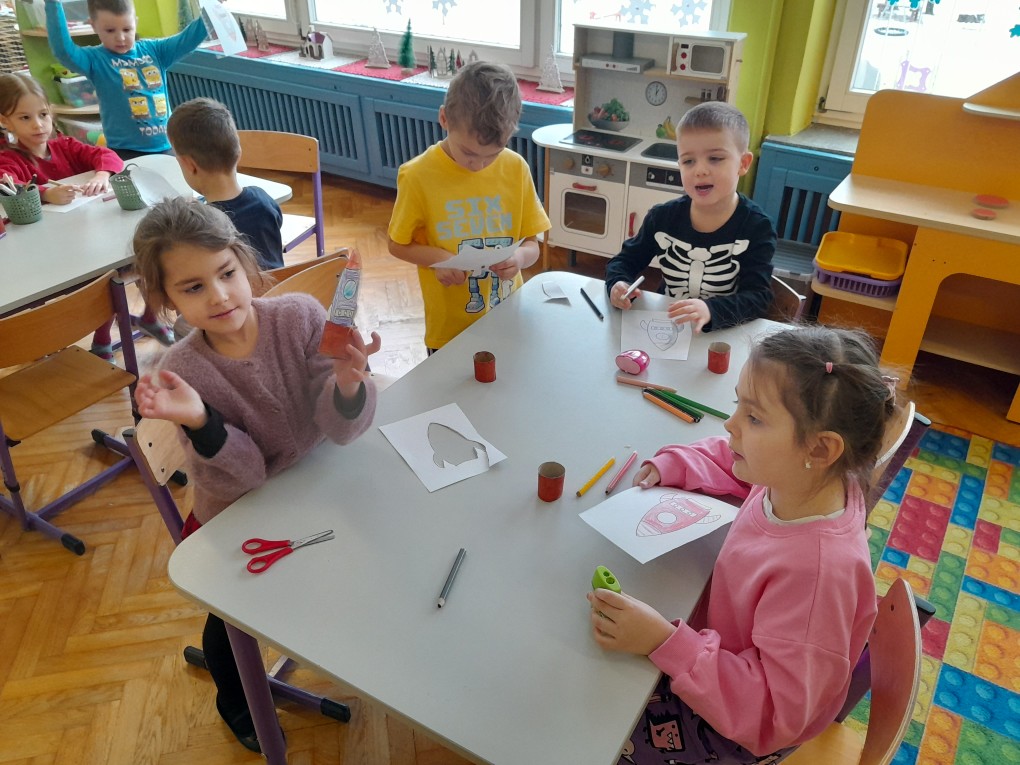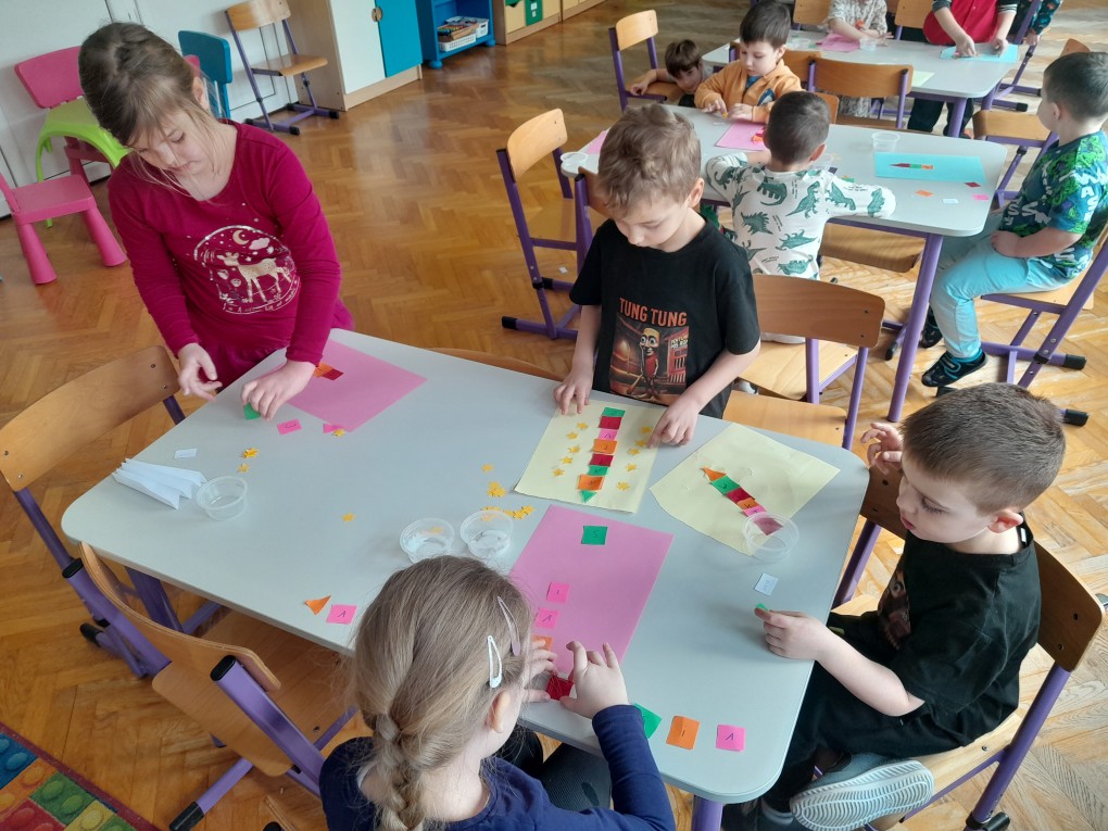 Dzieci układały również puzzle o tematyce kosmicznej, ćwicząc przy tym współpracę, cierpliwość i umiejętność wspólnego działania. Dużo radości sprawiło im także tworzenie rakiet z liter swojego imienia – w ten sposób utrwalały znajomość liter i rozwijały gotowość do nauki czytania. Jak zawsze nie zabrakło kreatywnych prac plastycznych – powstały piękne rakiety i rozgwieżdżone niebo.