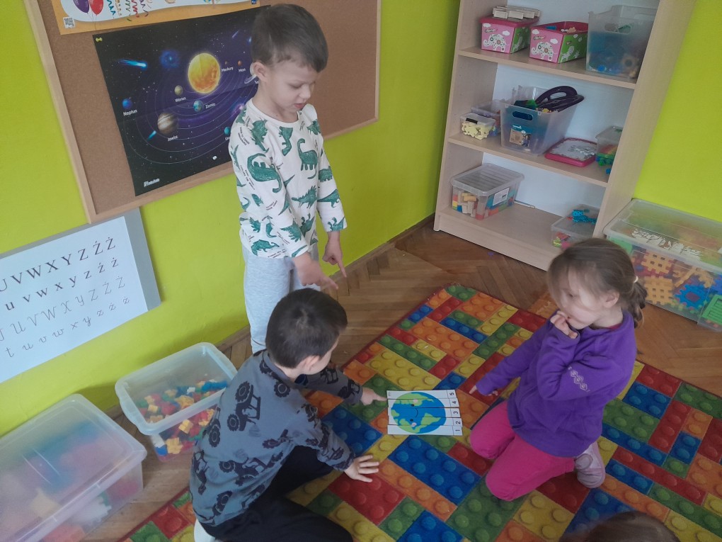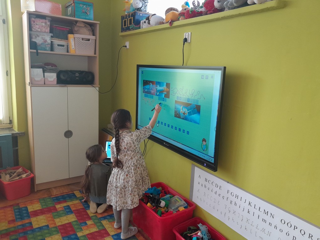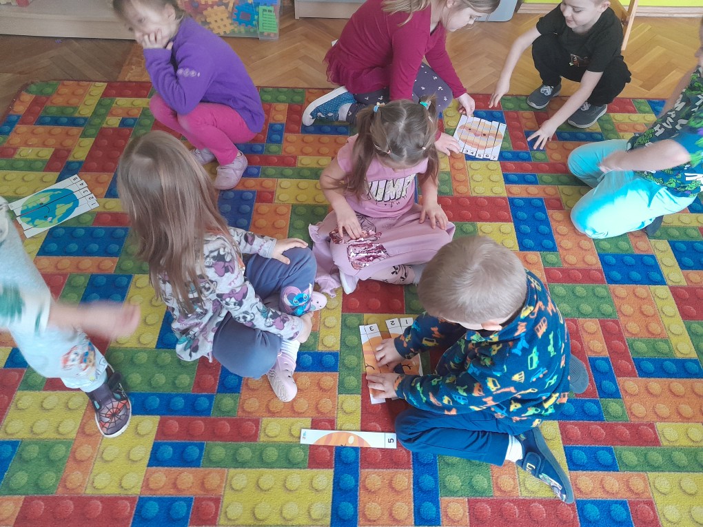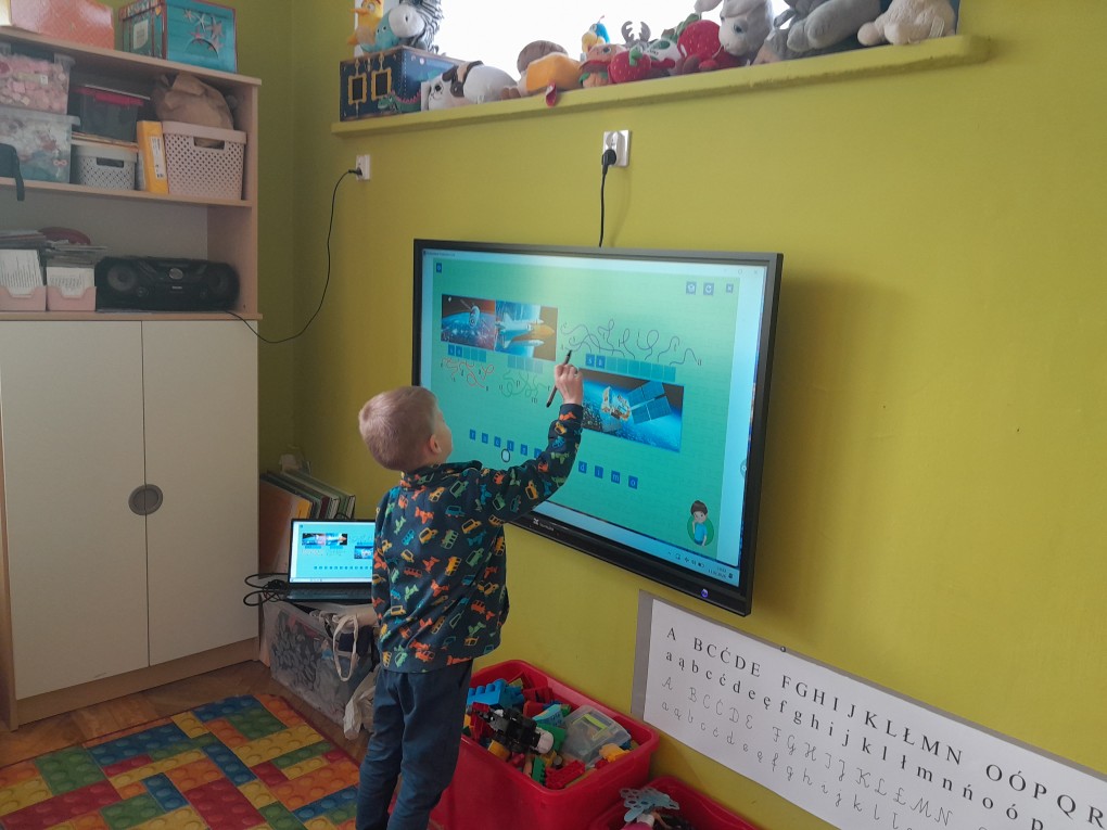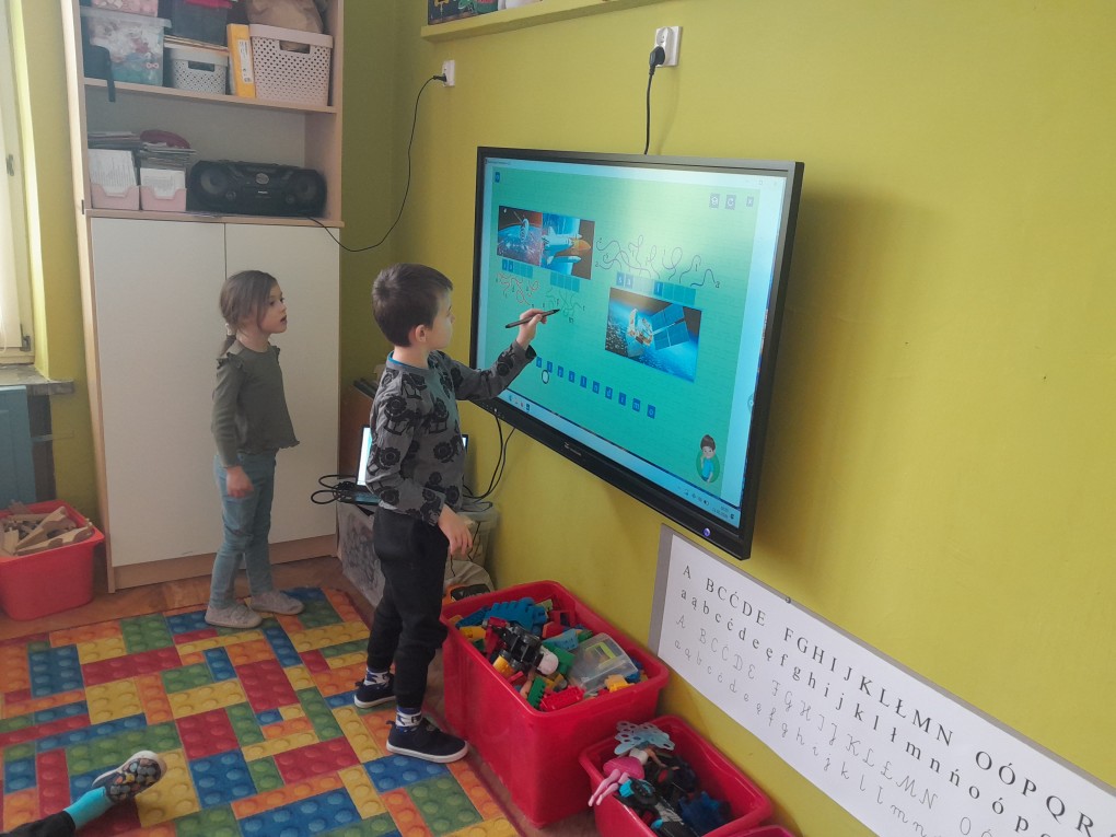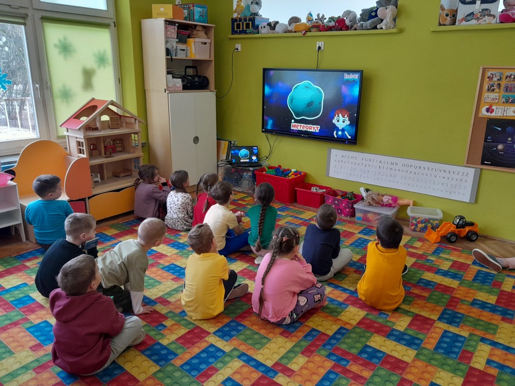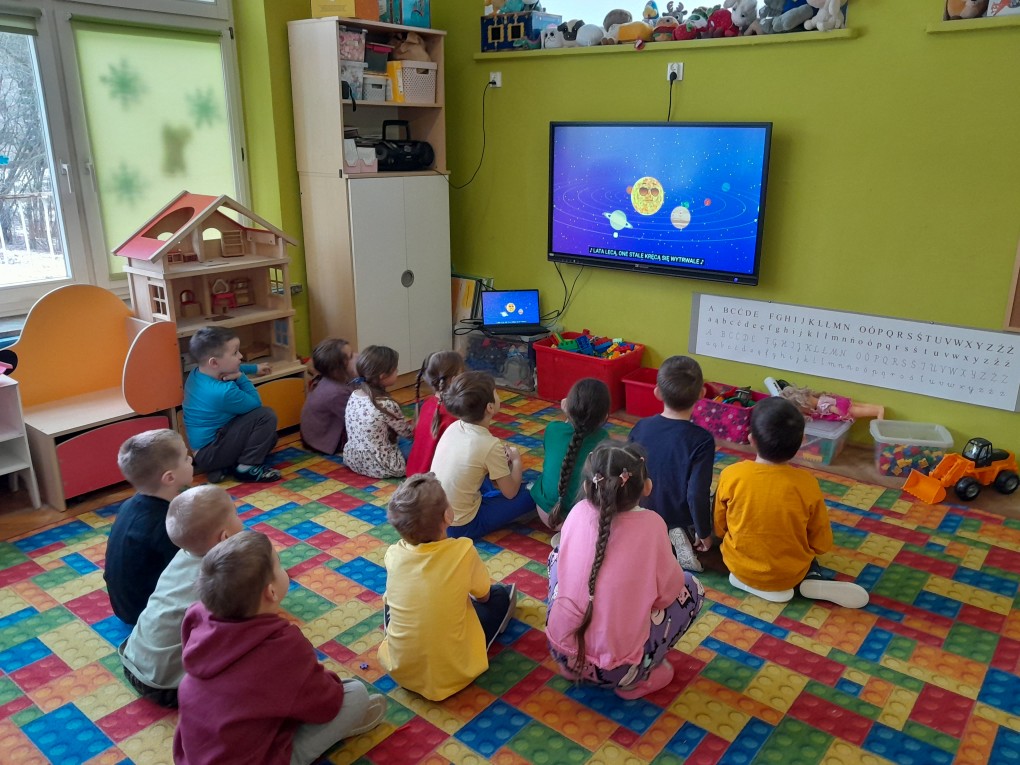 Na tablicy multimedialnej wykonywaliśmy kosmiczne zadania edukacyjne, oglądaliśmy filmy o wszechświecie oraz słuchaliśmy piosenek o planetach i gwiazdach. Nie zabrakło także matematycznych wyzwań – przeliczaliśmy gwiazdy i układaliśmy je w proste konstelacje.