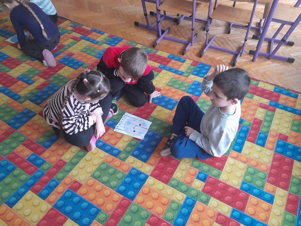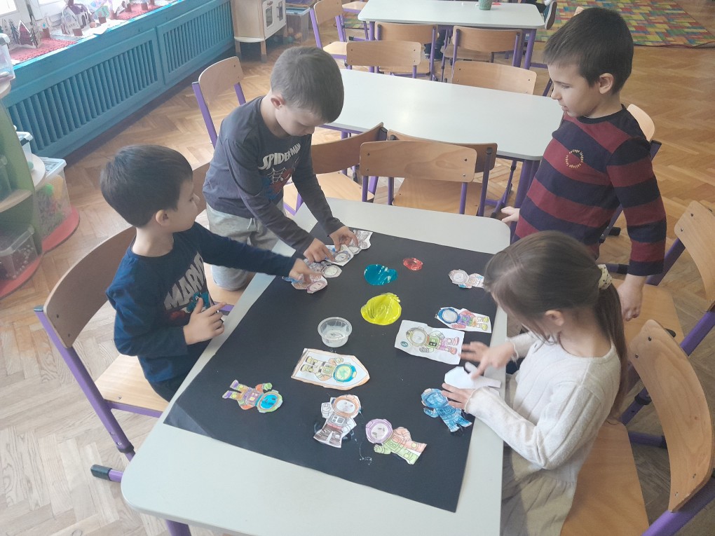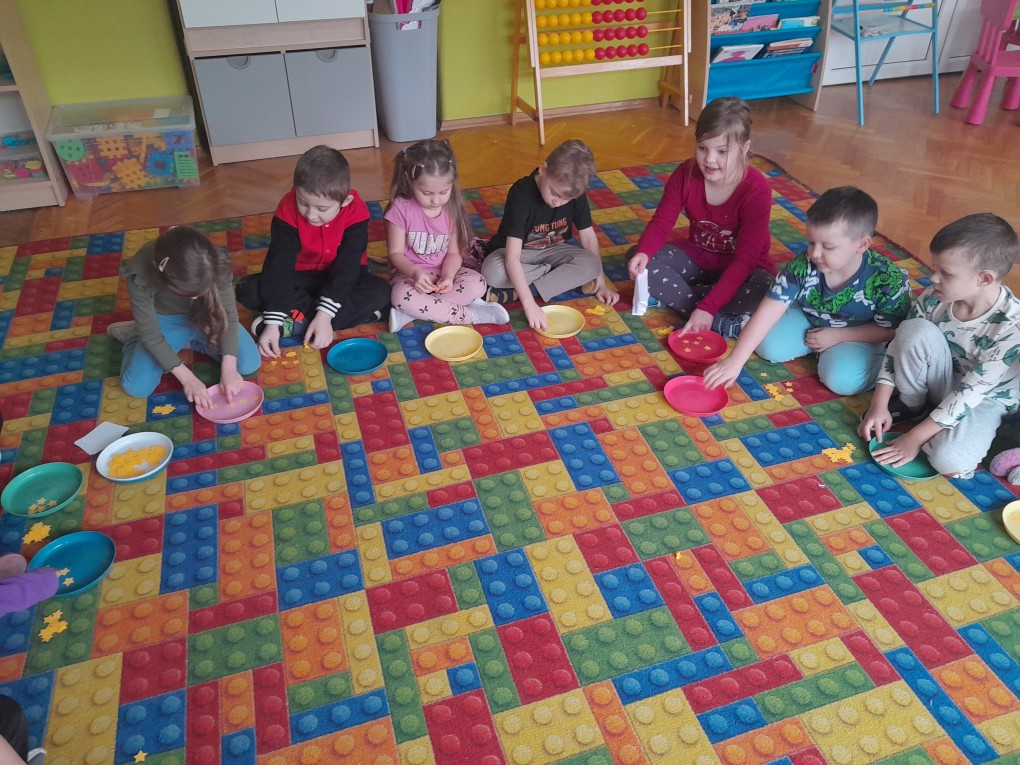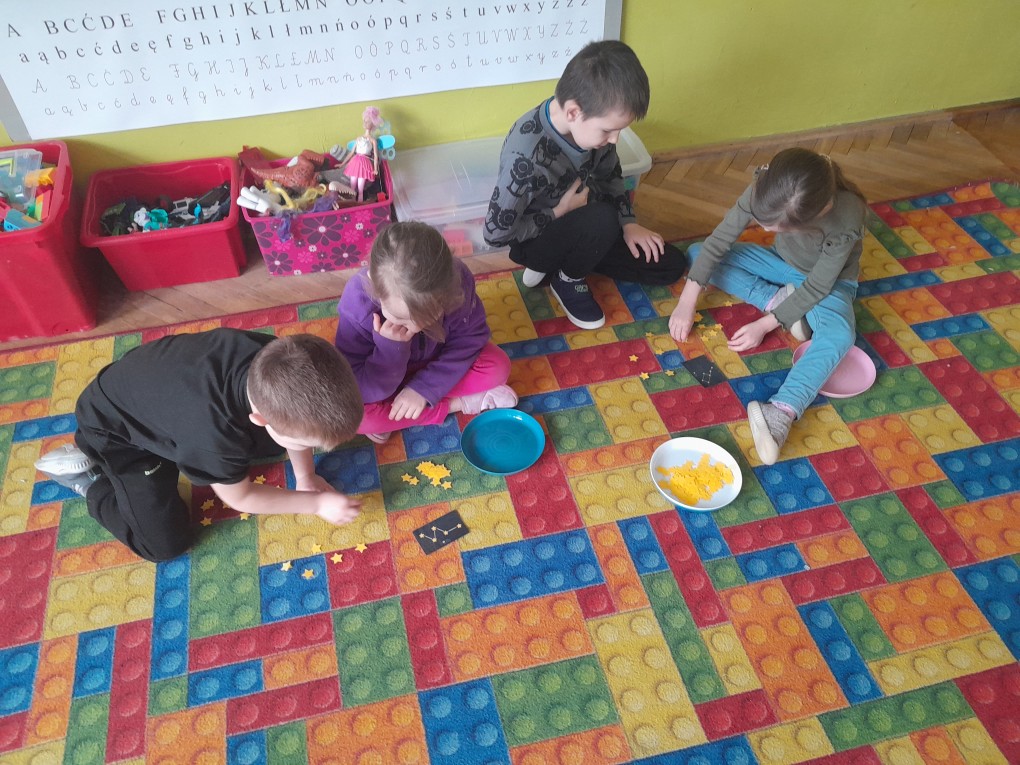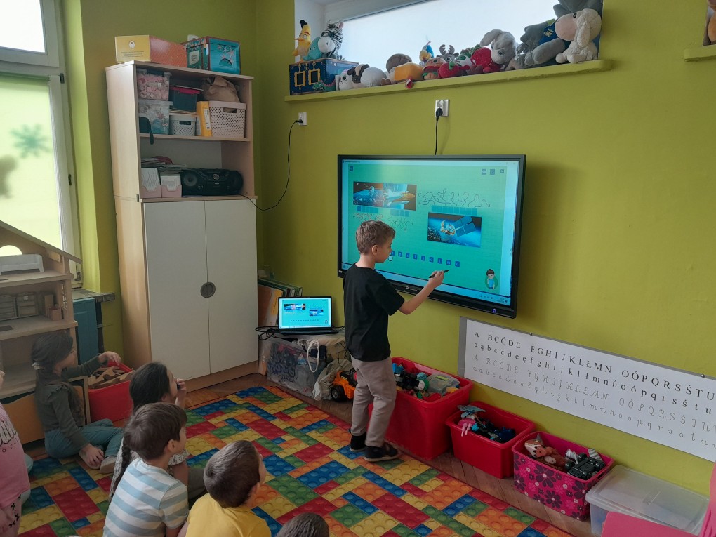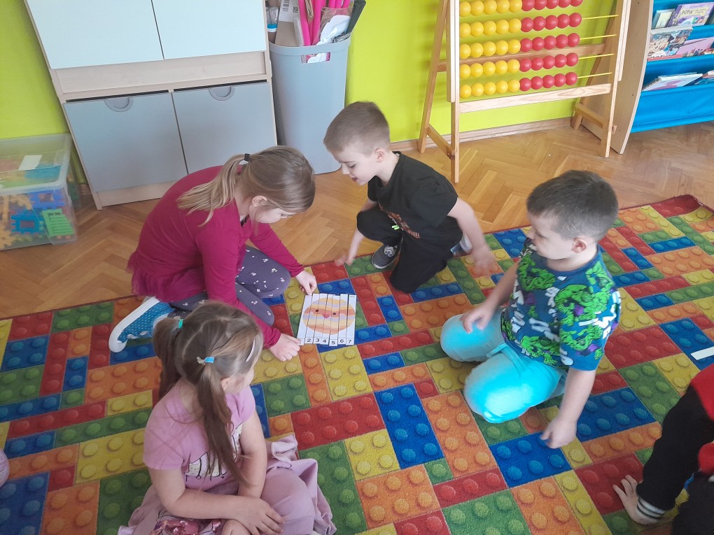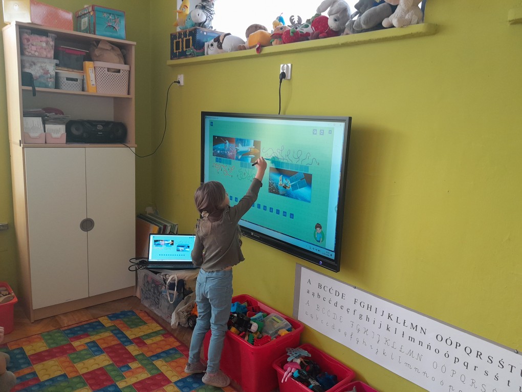 Na tablicy multimedialnej wykonywaliśmy kosmiczne zadania edukacyjne, oglądaliśmy filmy o wszechświecie oraz słuchaliśmy piosenek o planetach i gwiazdach. Nie zabrakło także matematycznych wyzwań – przeliczaliśmy gwiazdy i układaliśmy je w proste konstelacje.