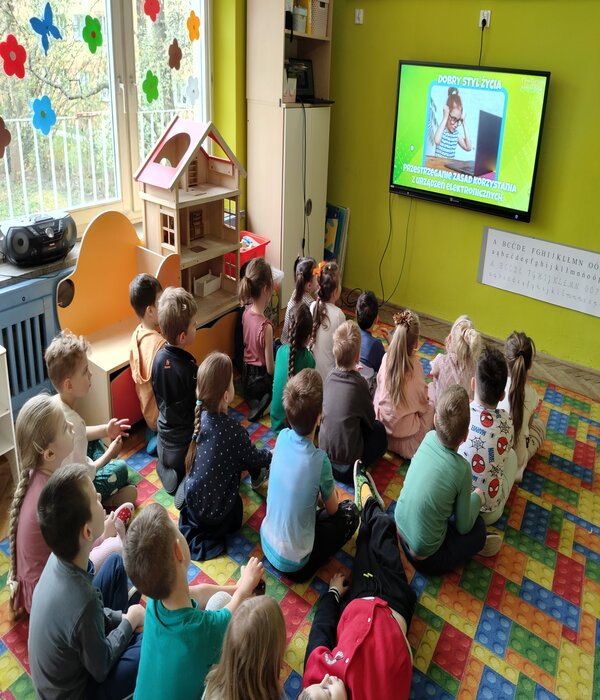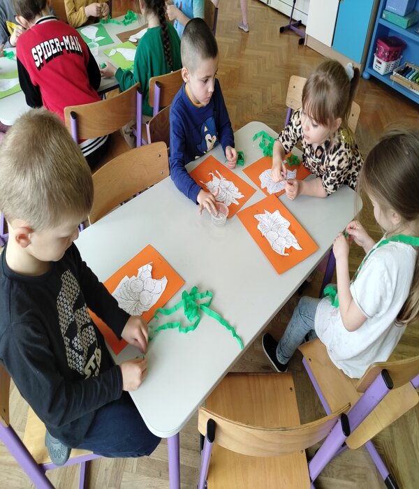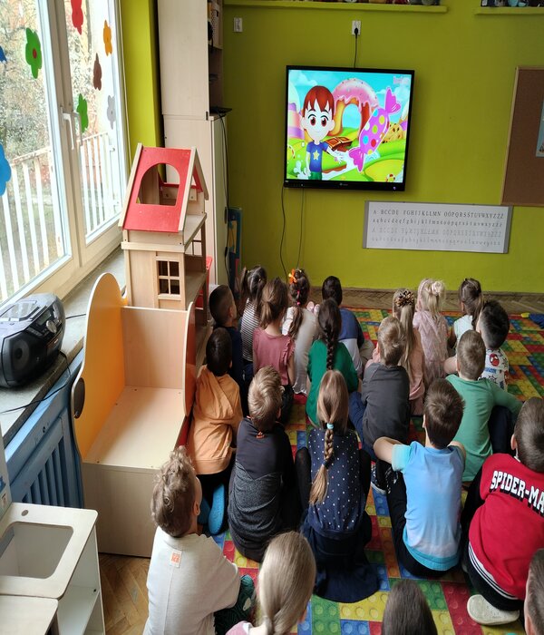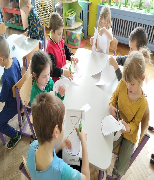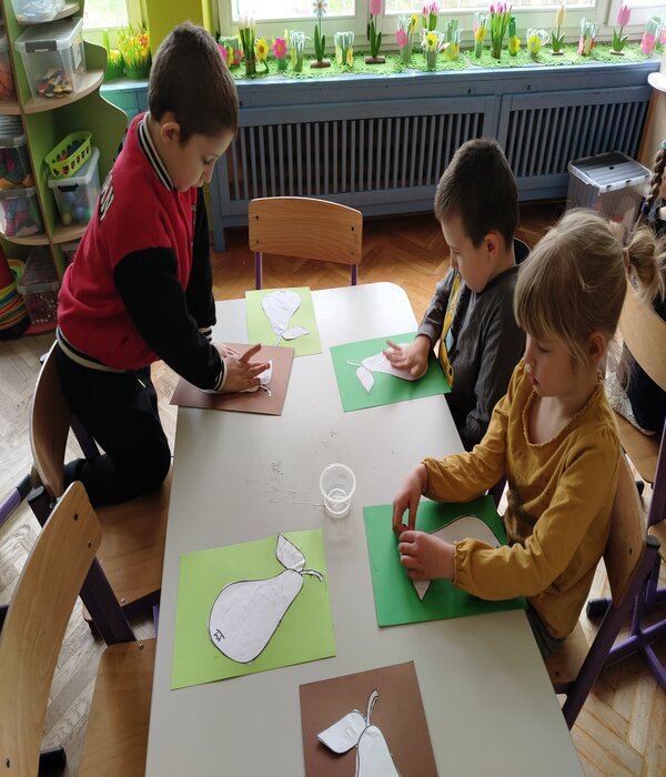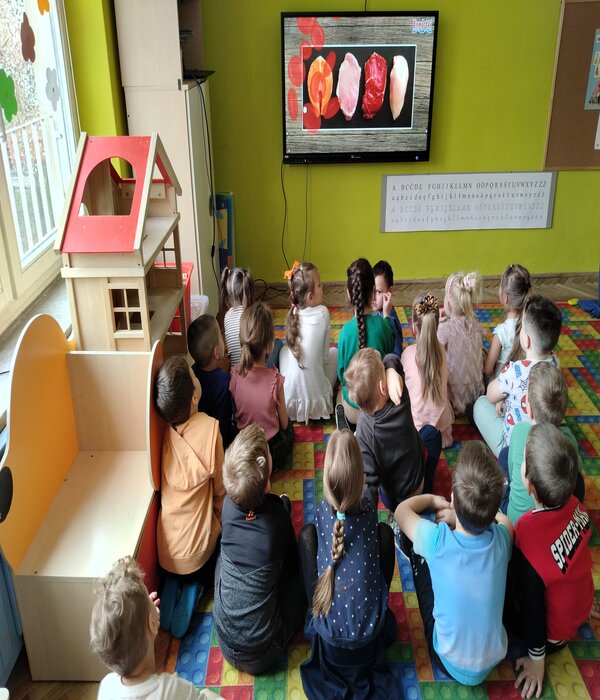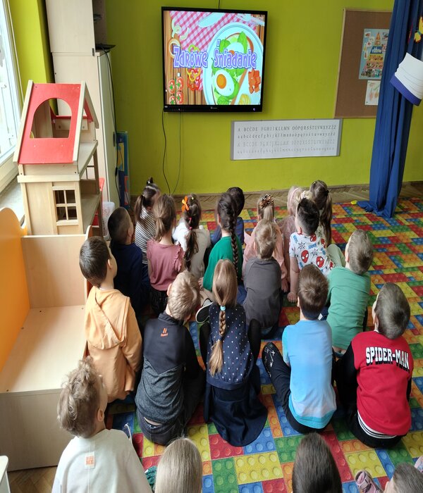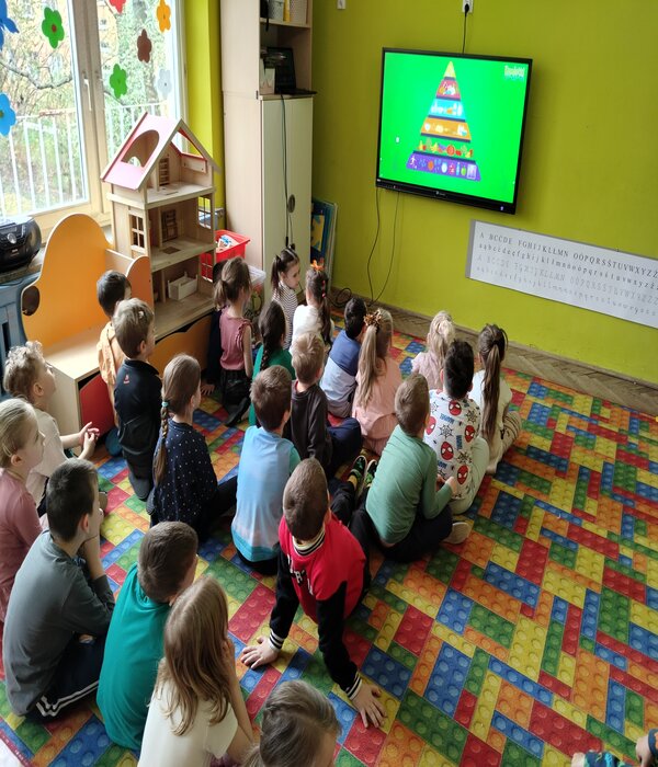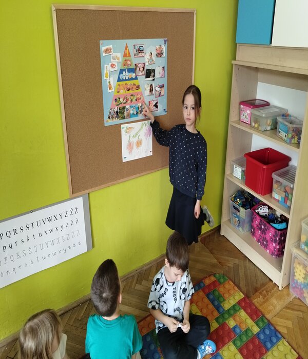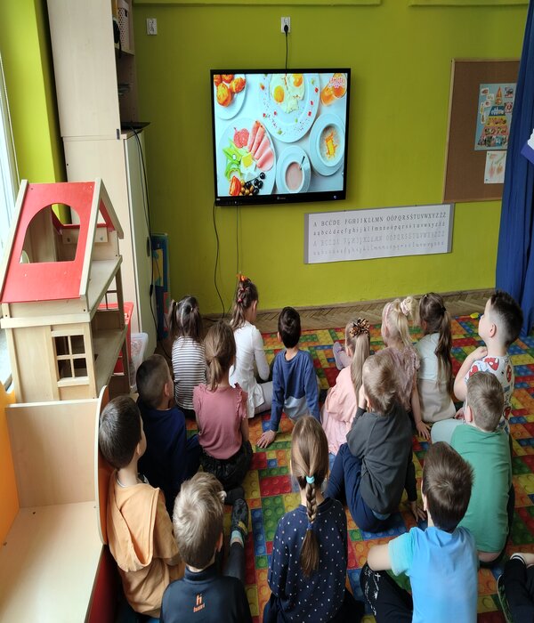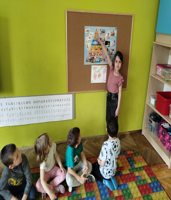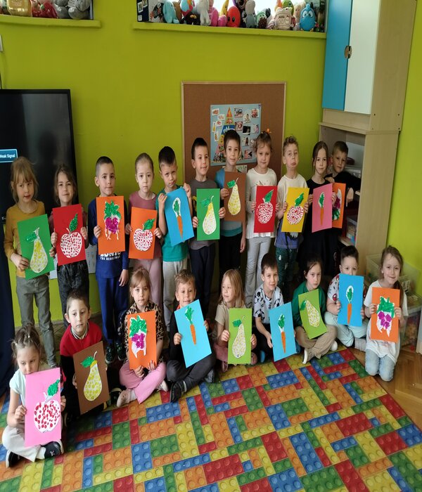Truskawki w tym tygodniu rozmawiają o zdrowiu i tym jak jedzenie wpływa na nasz organizm. Obejrzeliśmy bajkę edukacyjną o poszczególnych piętrach naszej piramidy. Wspólnie rozmawialiśmy o tym co znajduje się w naszych kuchennych lodówkach domowych. Przedszkolaki chętnie mówiły co lubią jeść na śniadanie i nie tylko, zastanawiając się jak komponować zdrowe i smaczne posiłki. Wybierały z pośród sylwet obrazków zgromadzonych na dywanie zdrowe i nie zdrowe produkty, dzieliły na sylaby ich nazwy, określały pierwszą literkę na początku wyrazu, rozwiązywały zagadki słowno-obrazkowe. Na koniec każdy stolik wybrał i wykonał pracę plastyczną warzywa lub owocu, które chciałby jeść częściej.