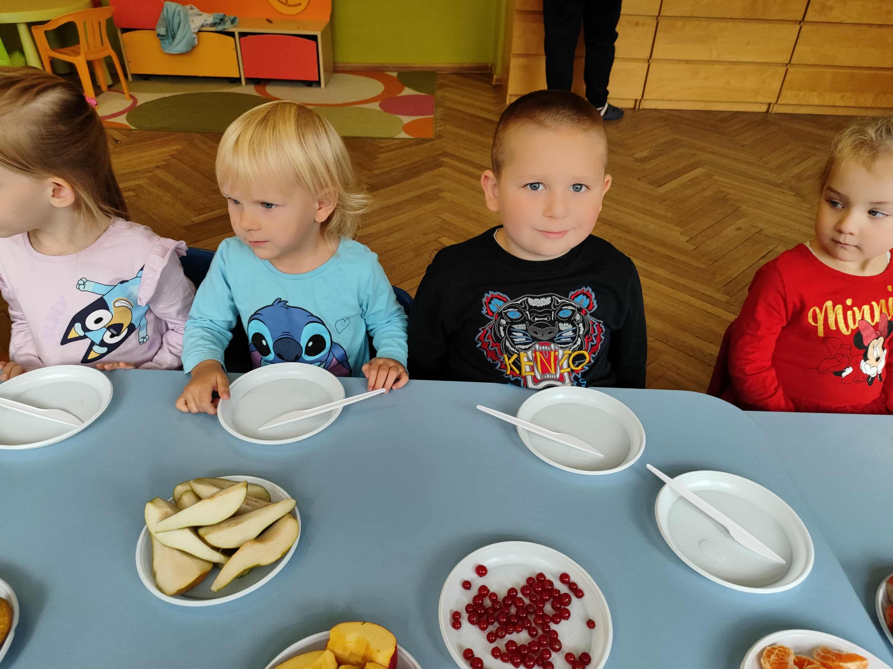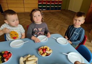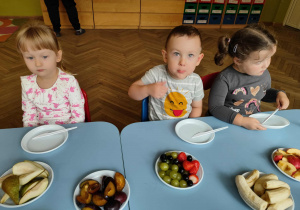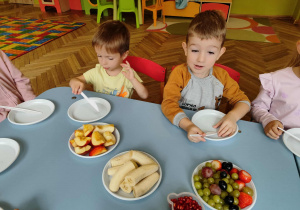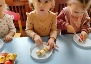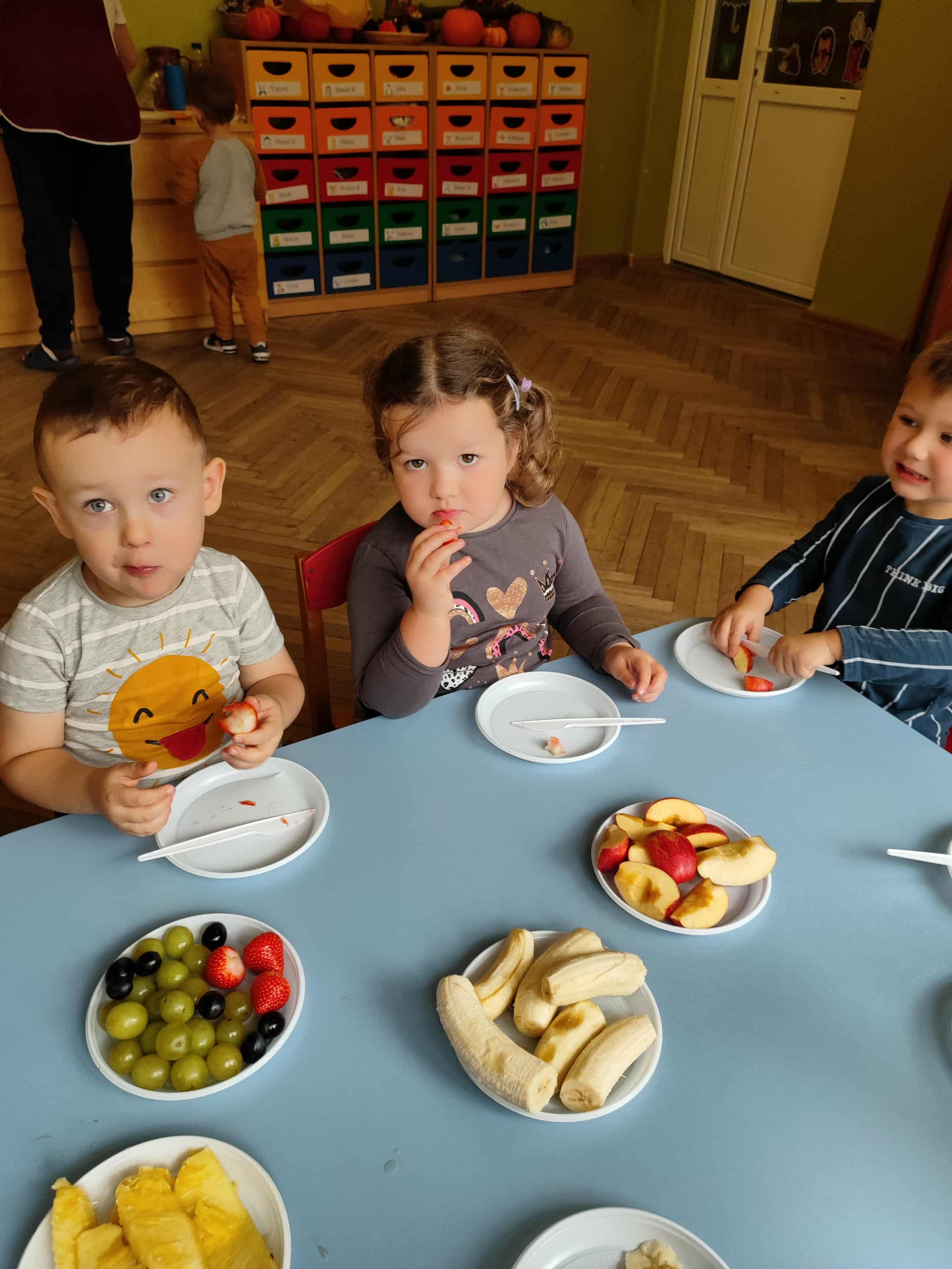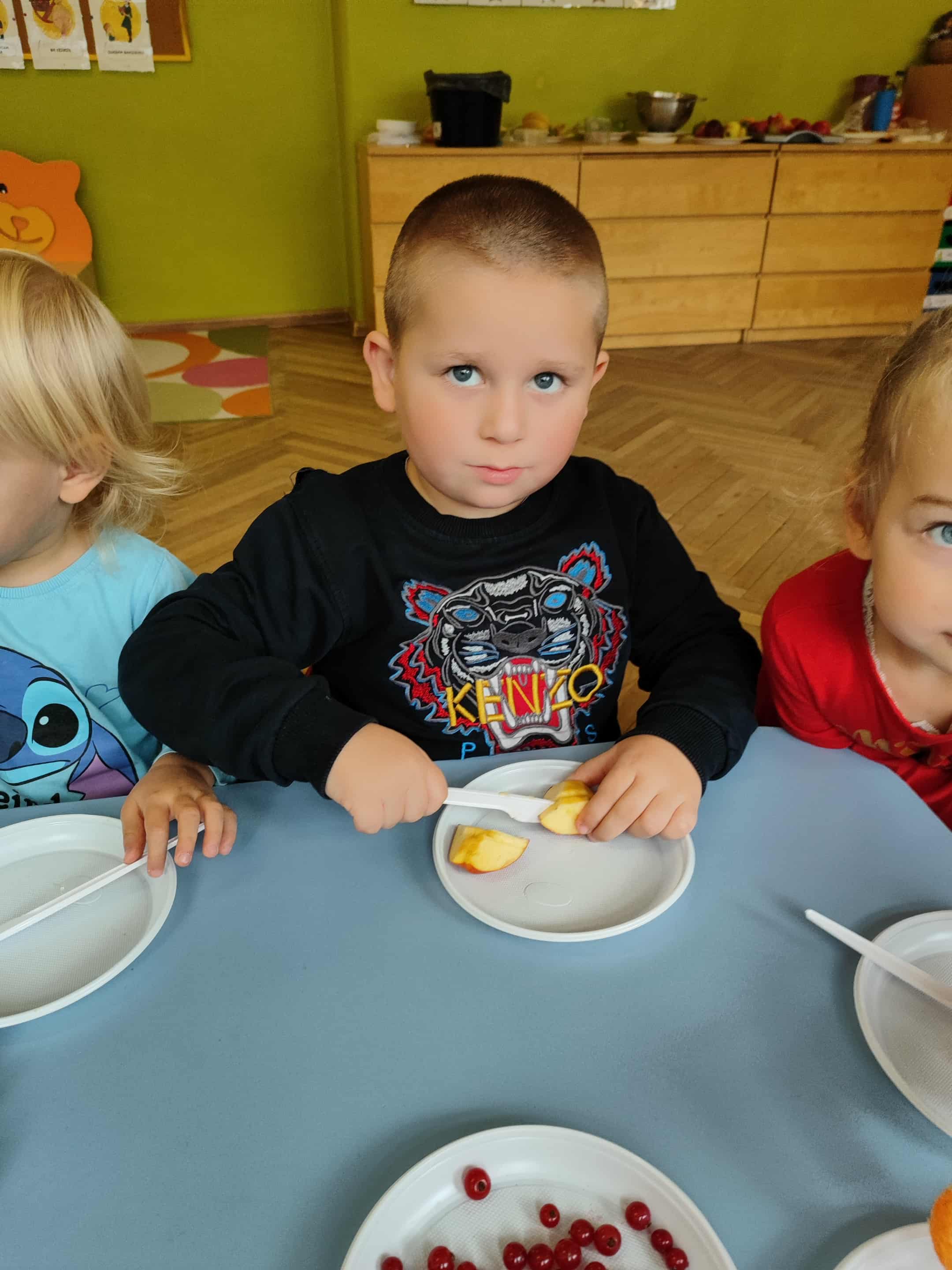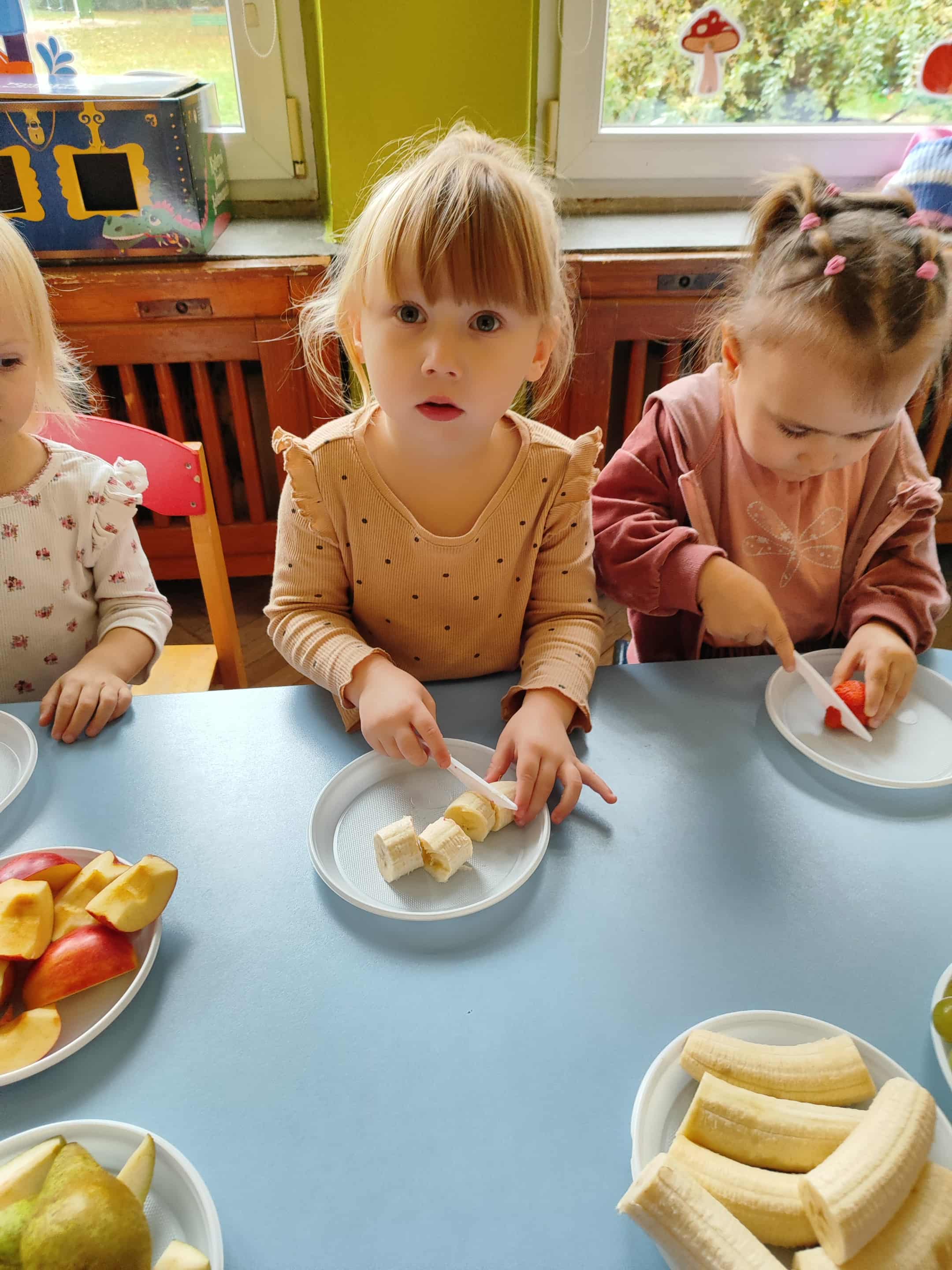 Dzieci samodzielnie kroiły i przyrządzały sałatkę owocową przestrzegając zasad bezpieczeństwa przy posługiwaniu się nożem. Własnoręcznie zrobiona sałatka wyśmienicie dzieciom smakowała.
