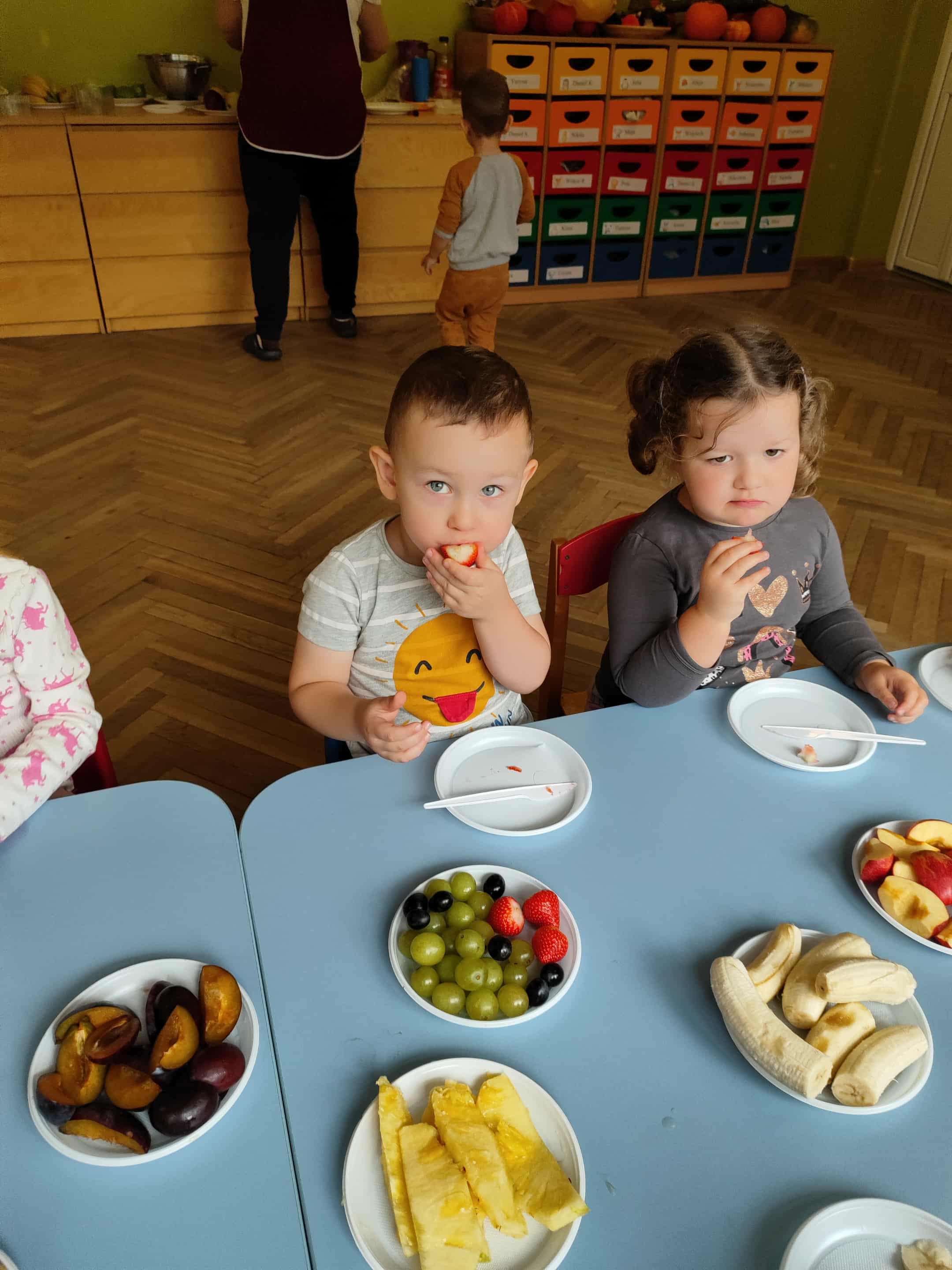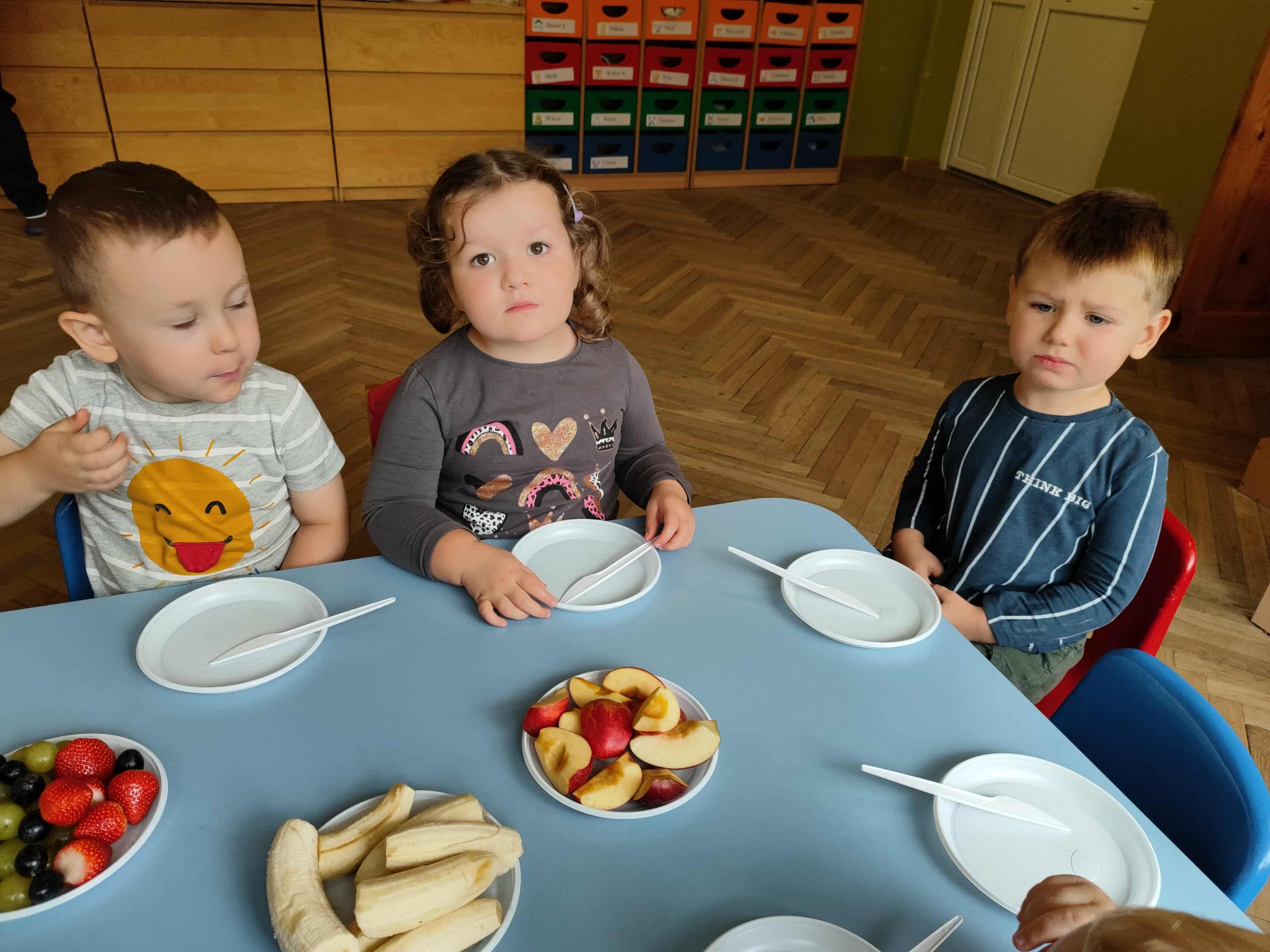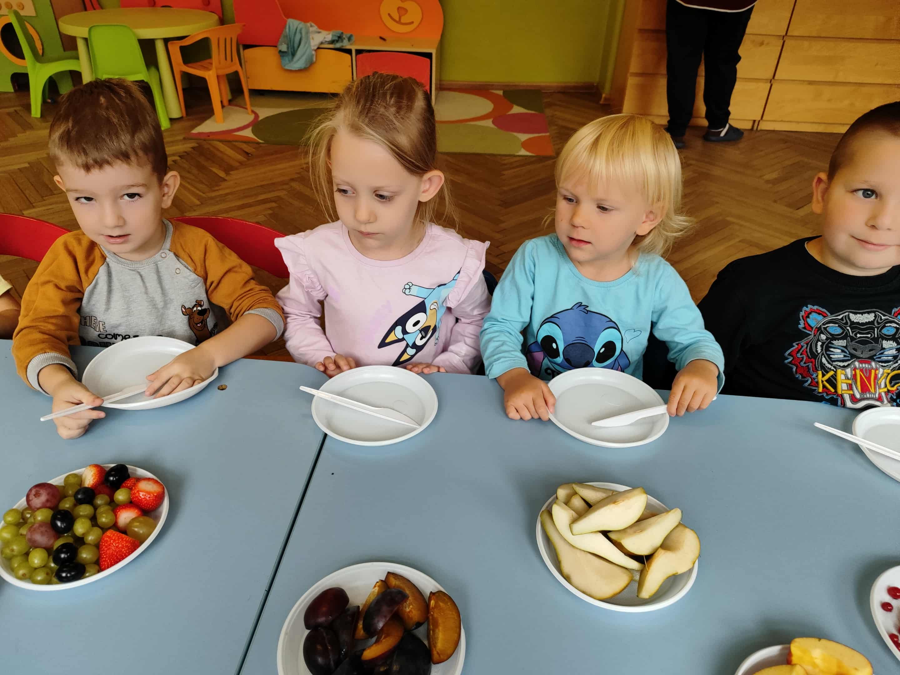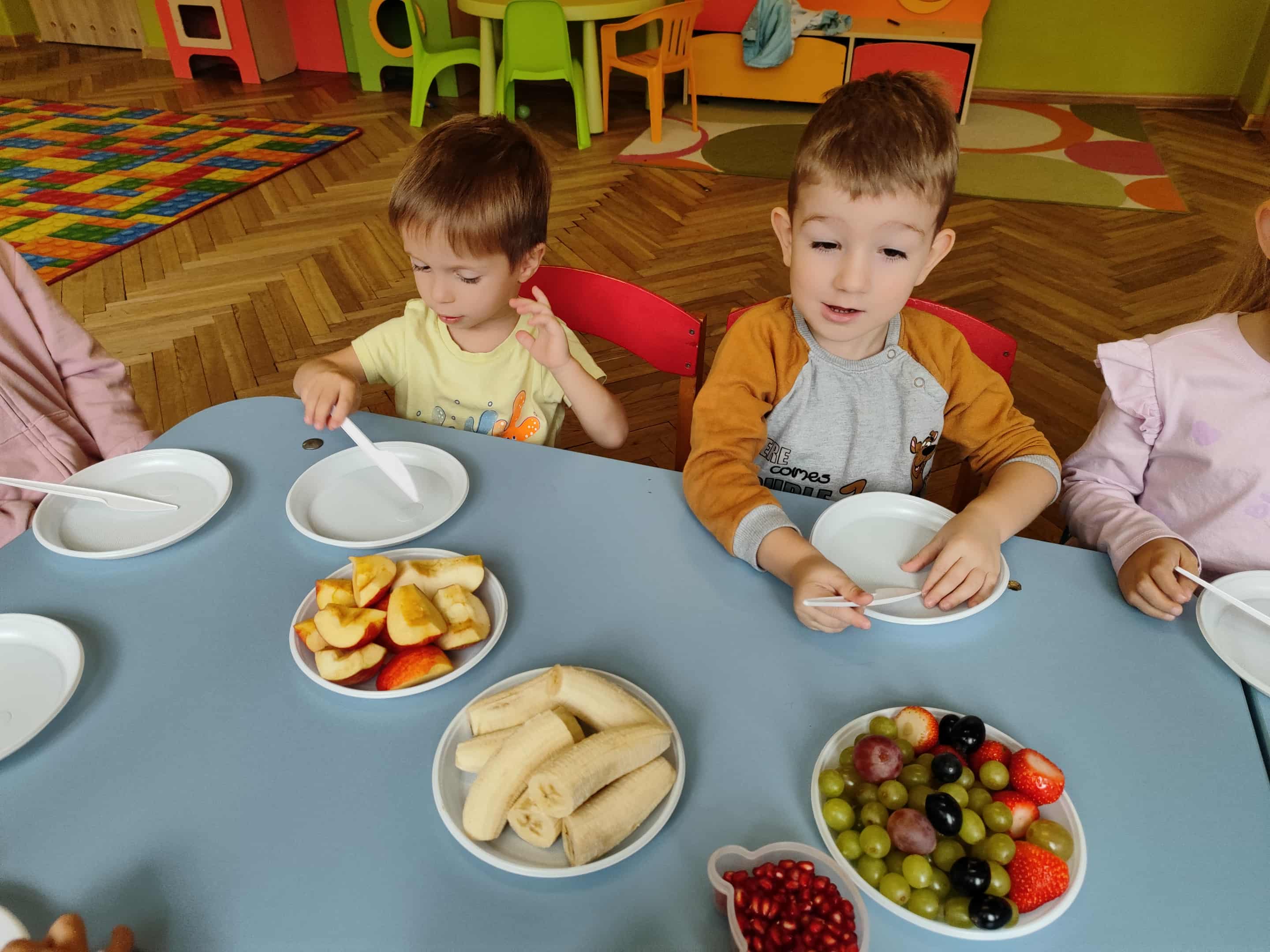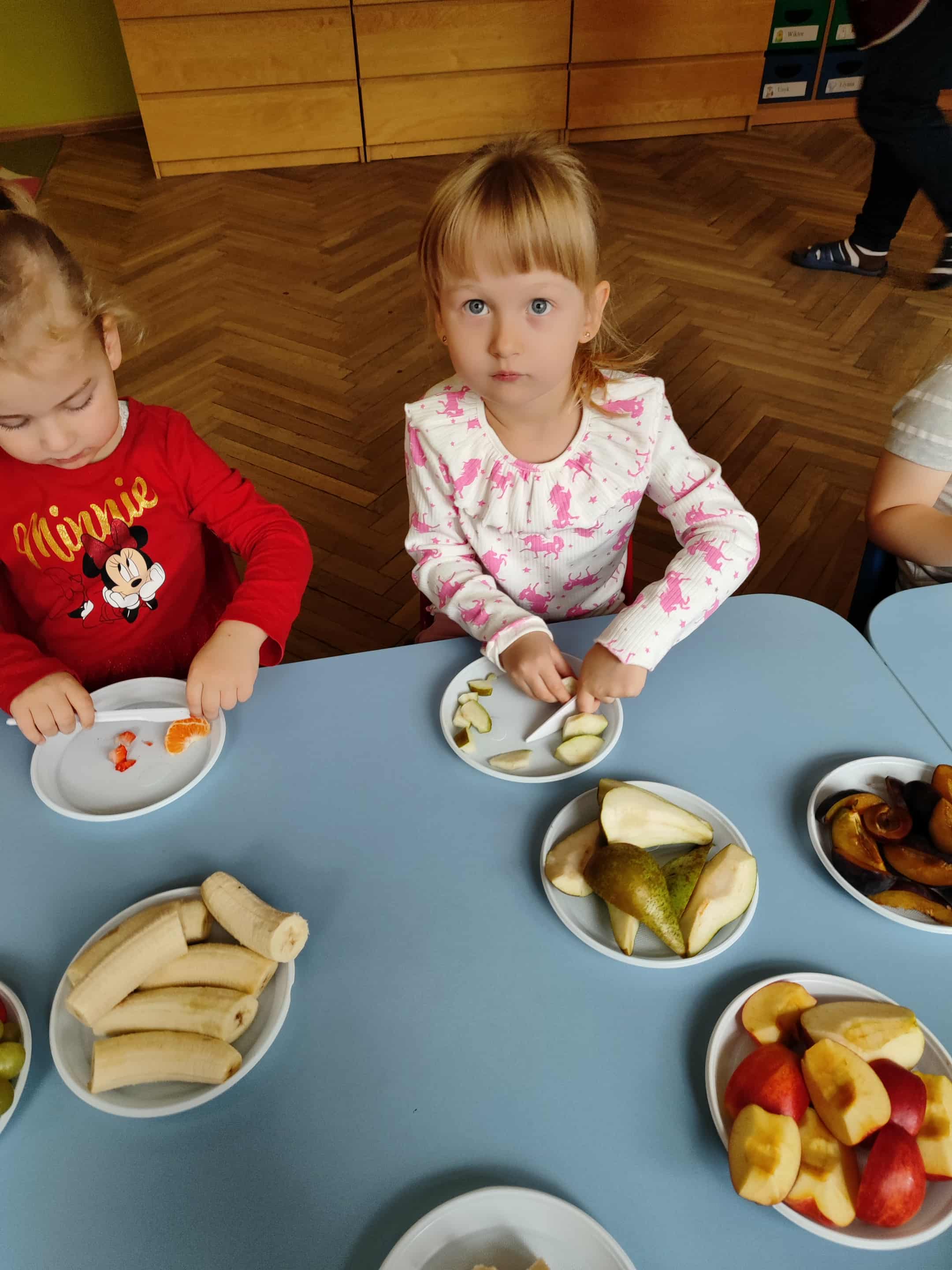 Dzieci samodzielnie kroiły i przyrządzały sałatkę owocową przestrzegając zasad bezpieczeństwa przy posługiwaniu się nożem. Własnoręcznie zrobiona sałatka wyśmienicie dzieciom smakowała.