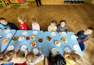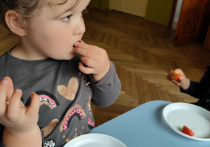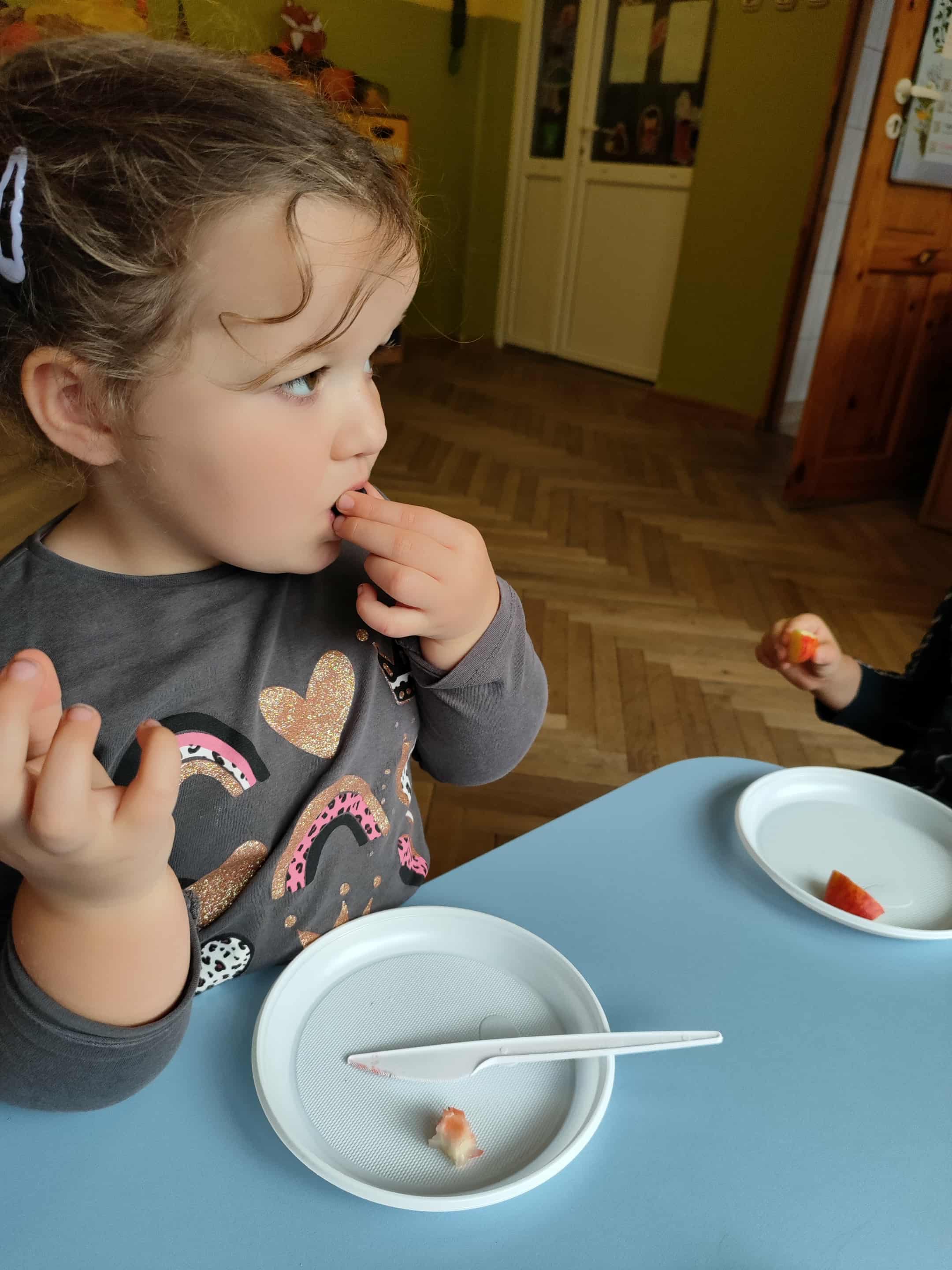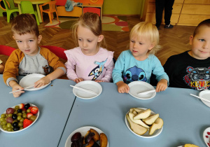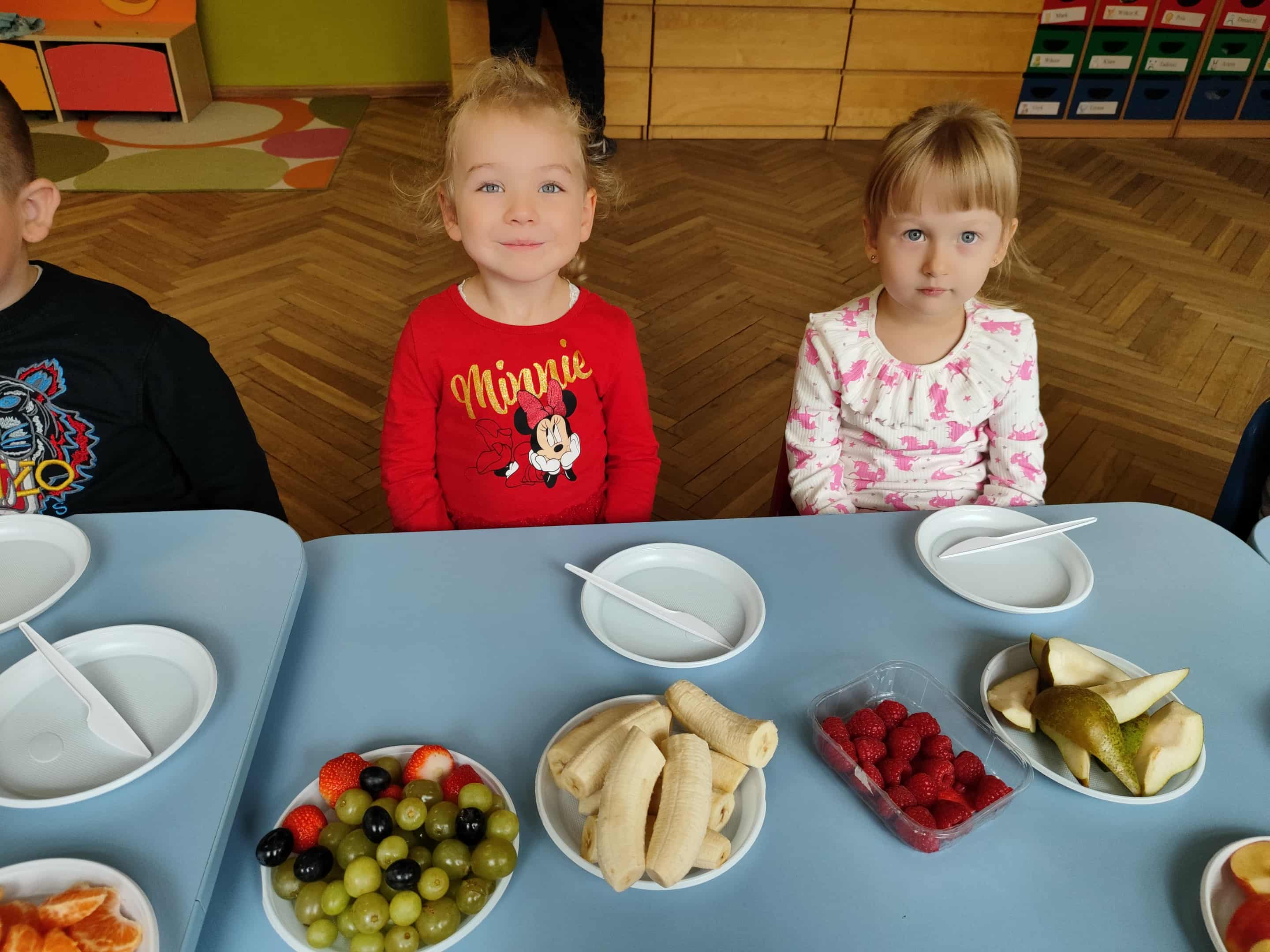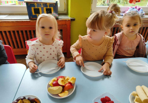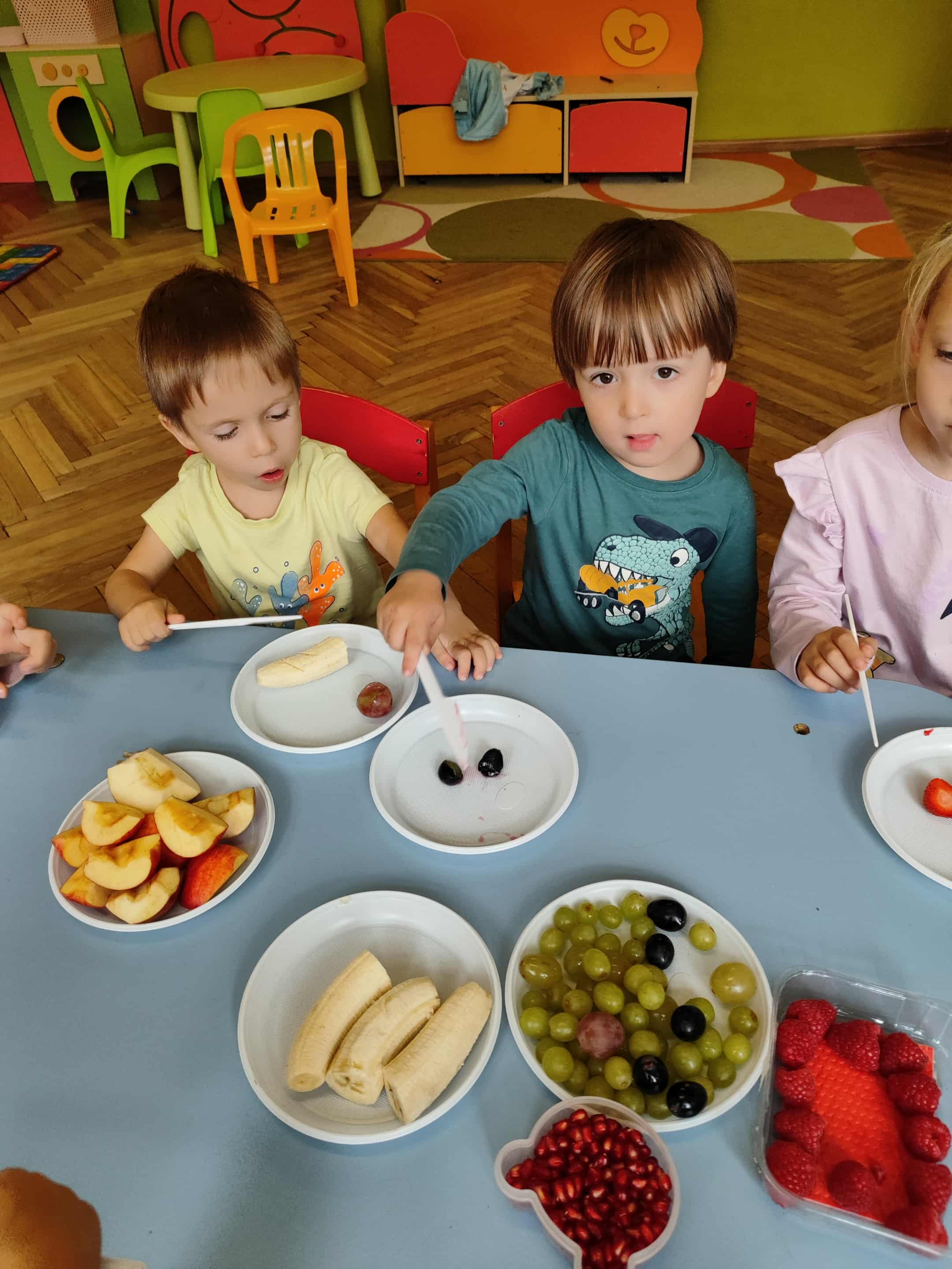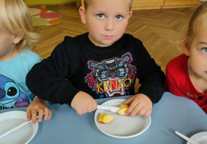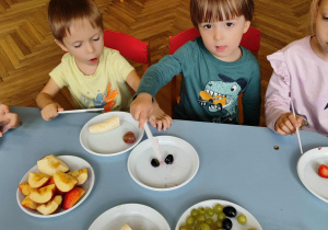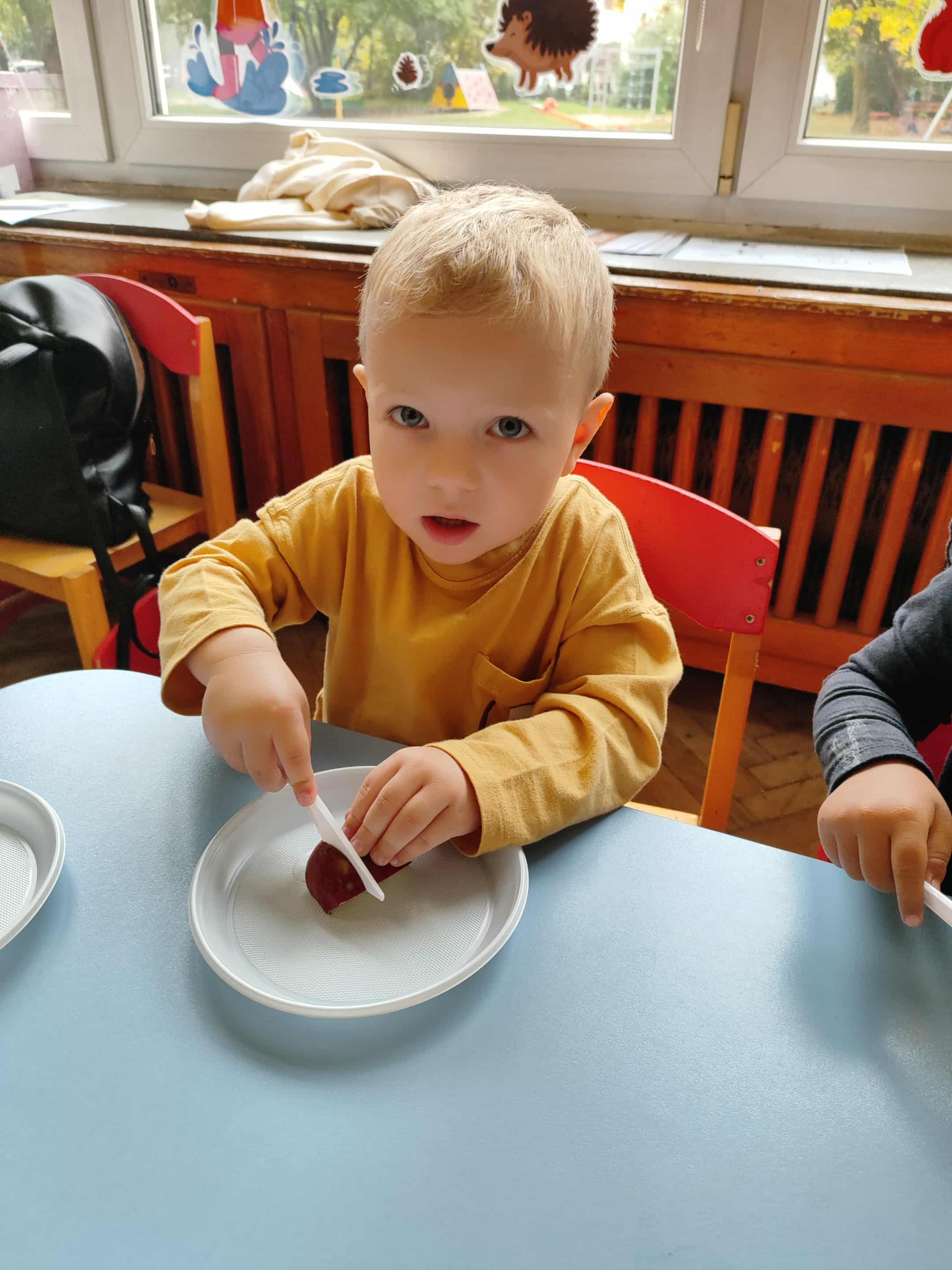 Dzieci samodzielnie kroiły i przyrządzały sałatkę owocową przestrzegając zasad bezpieczeństwa przy posługiwaniu się nożem. Własnoręcznie zrobiona sałatka wyśmienicie dzieciom smakowała.