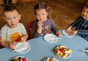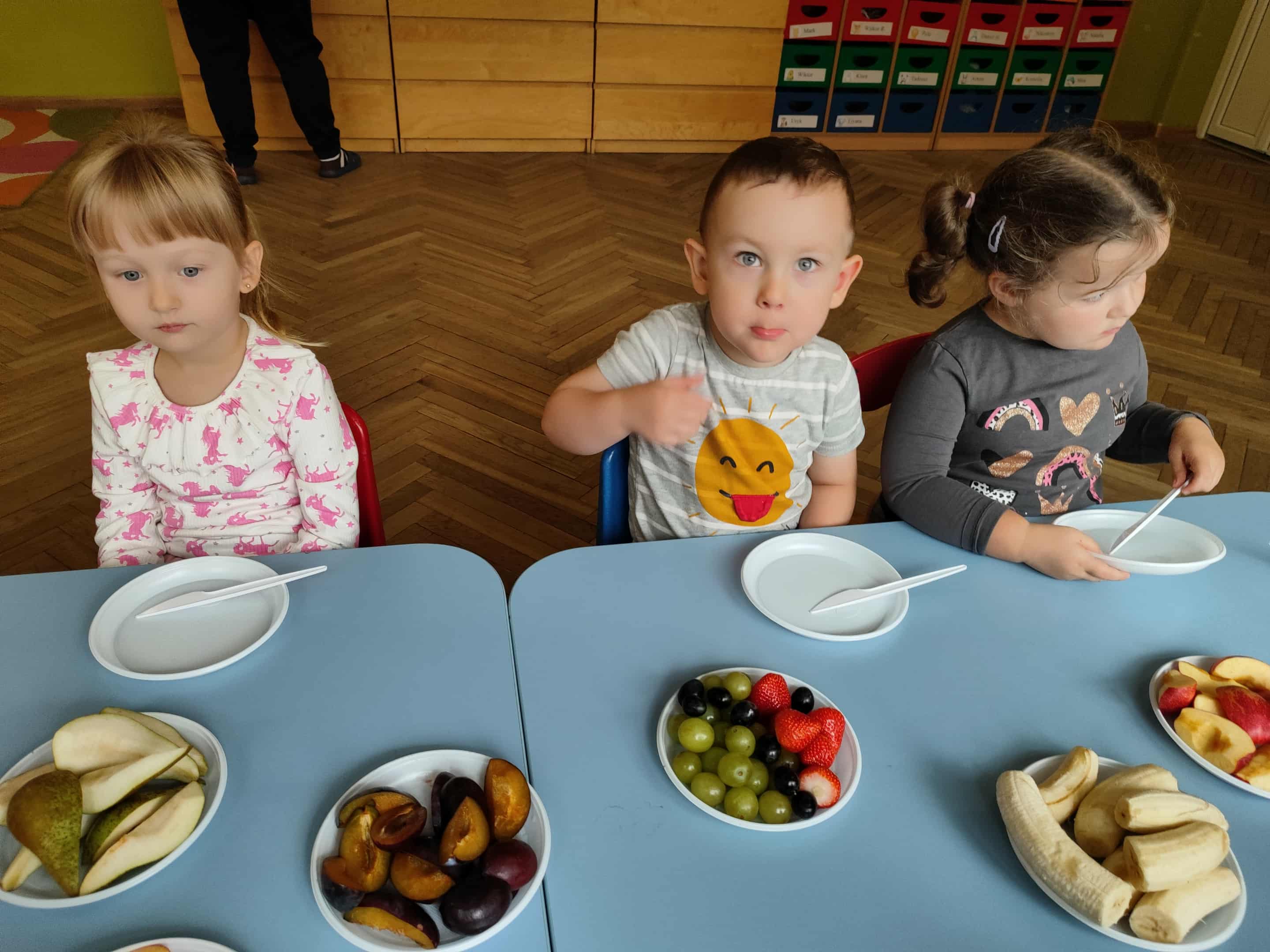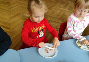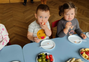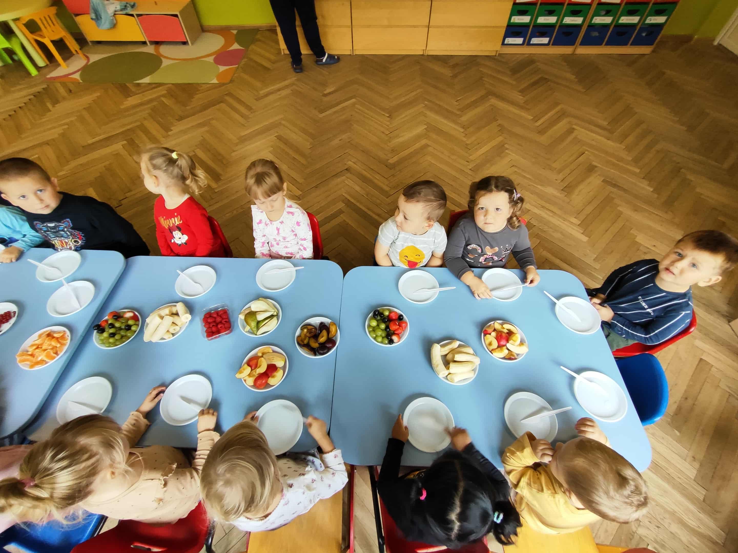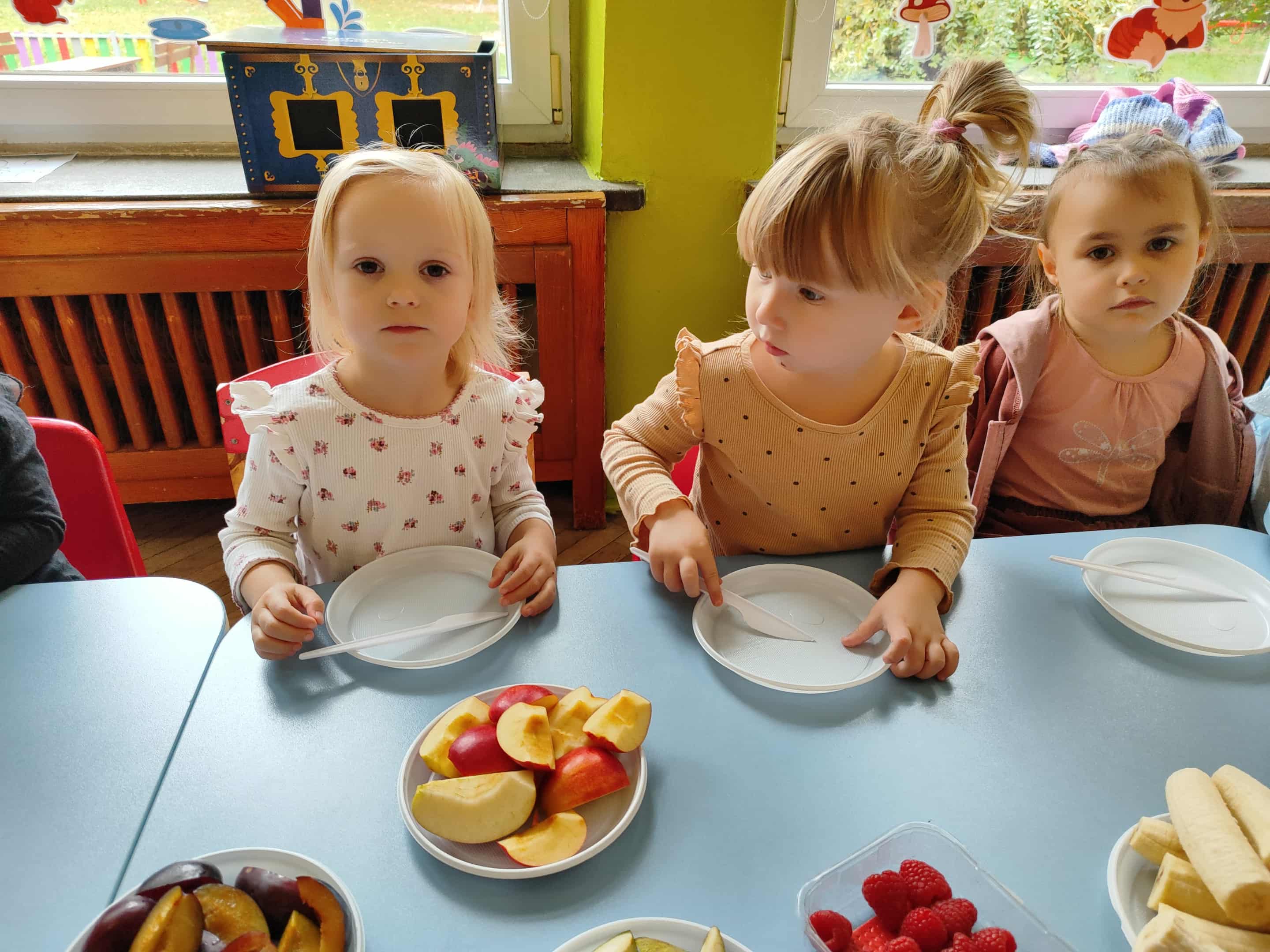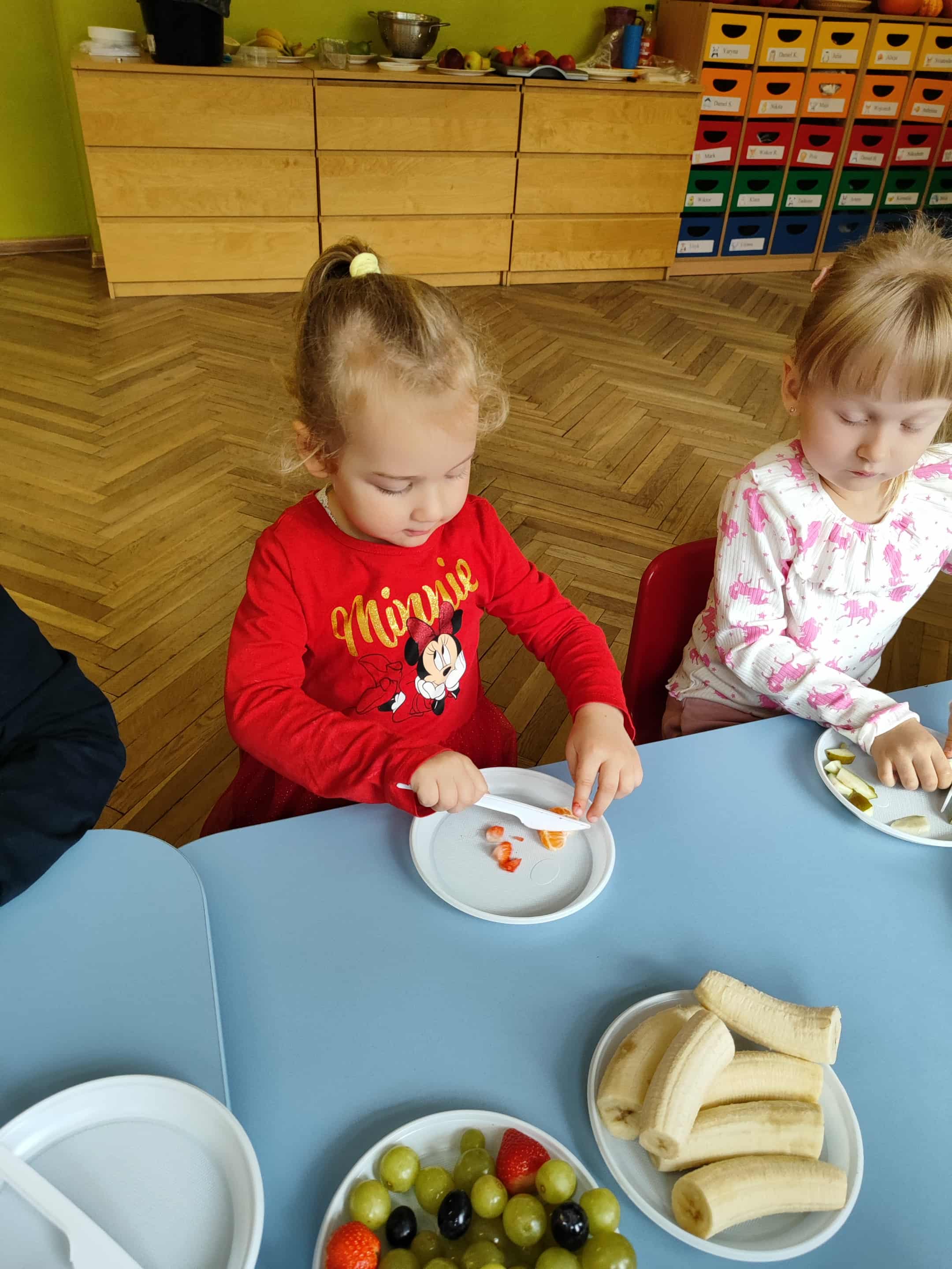 Dzieci samodzielnie kroiły i przyrządzały sałatkę owocową przestrzegając zasad bezpieczeństwa przy posługiwaniu się nożem. Własnoręcznie zrobiona sałatka wyśmienicie dzieciom smakowała.