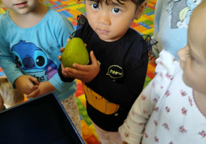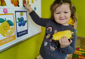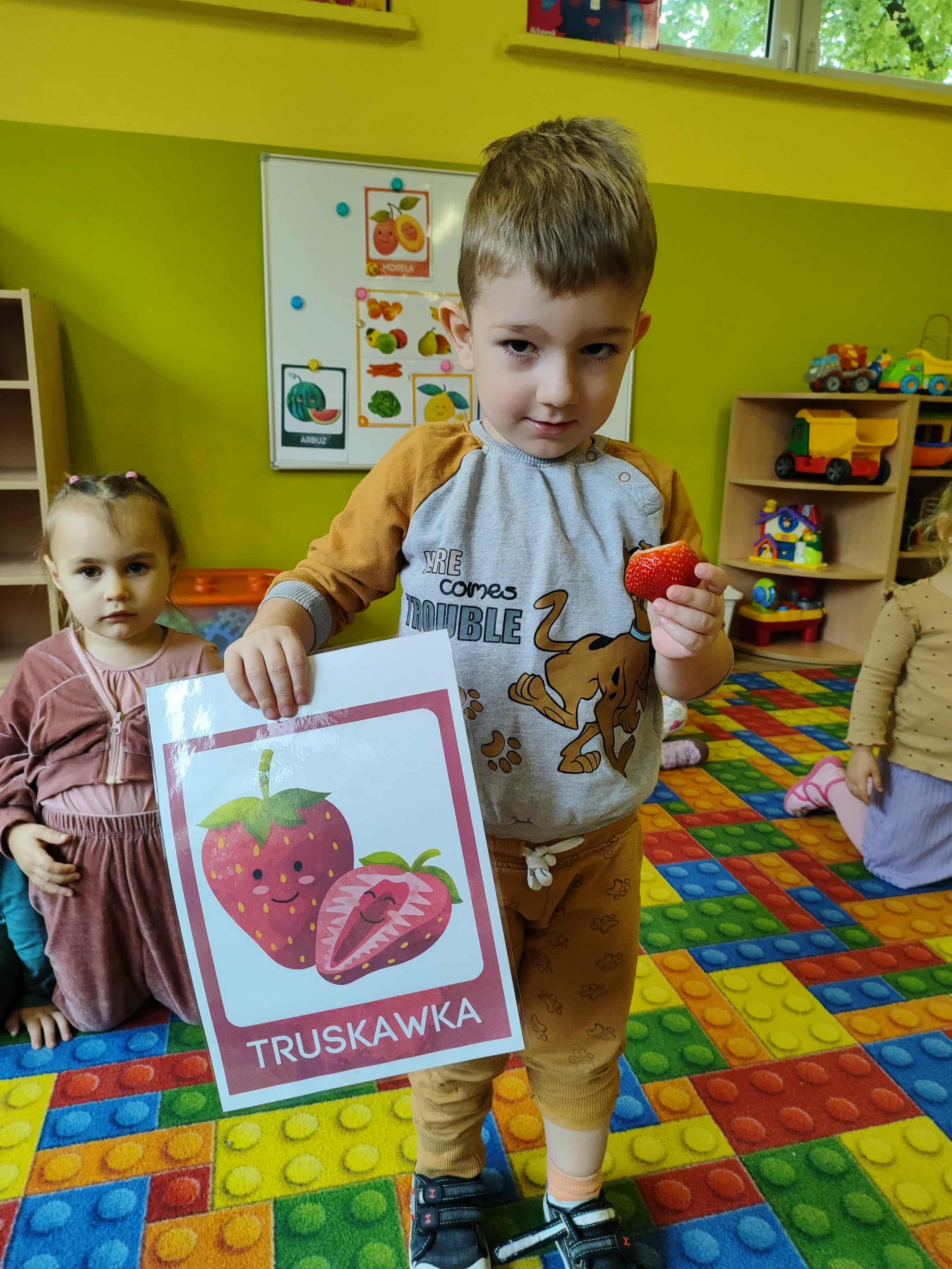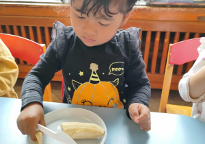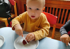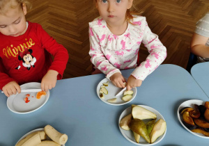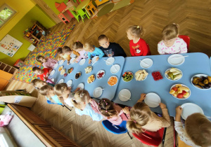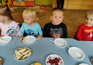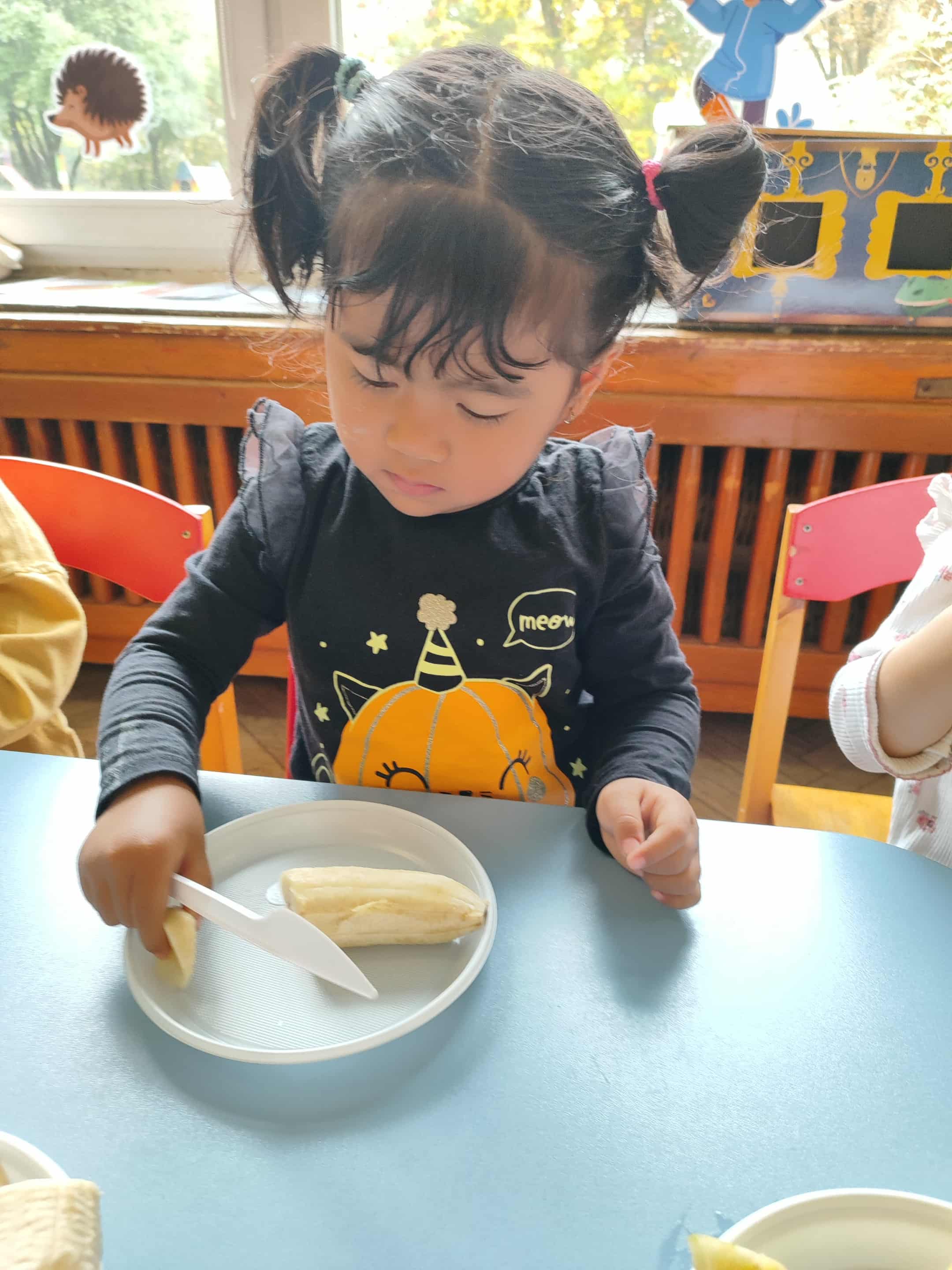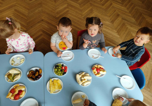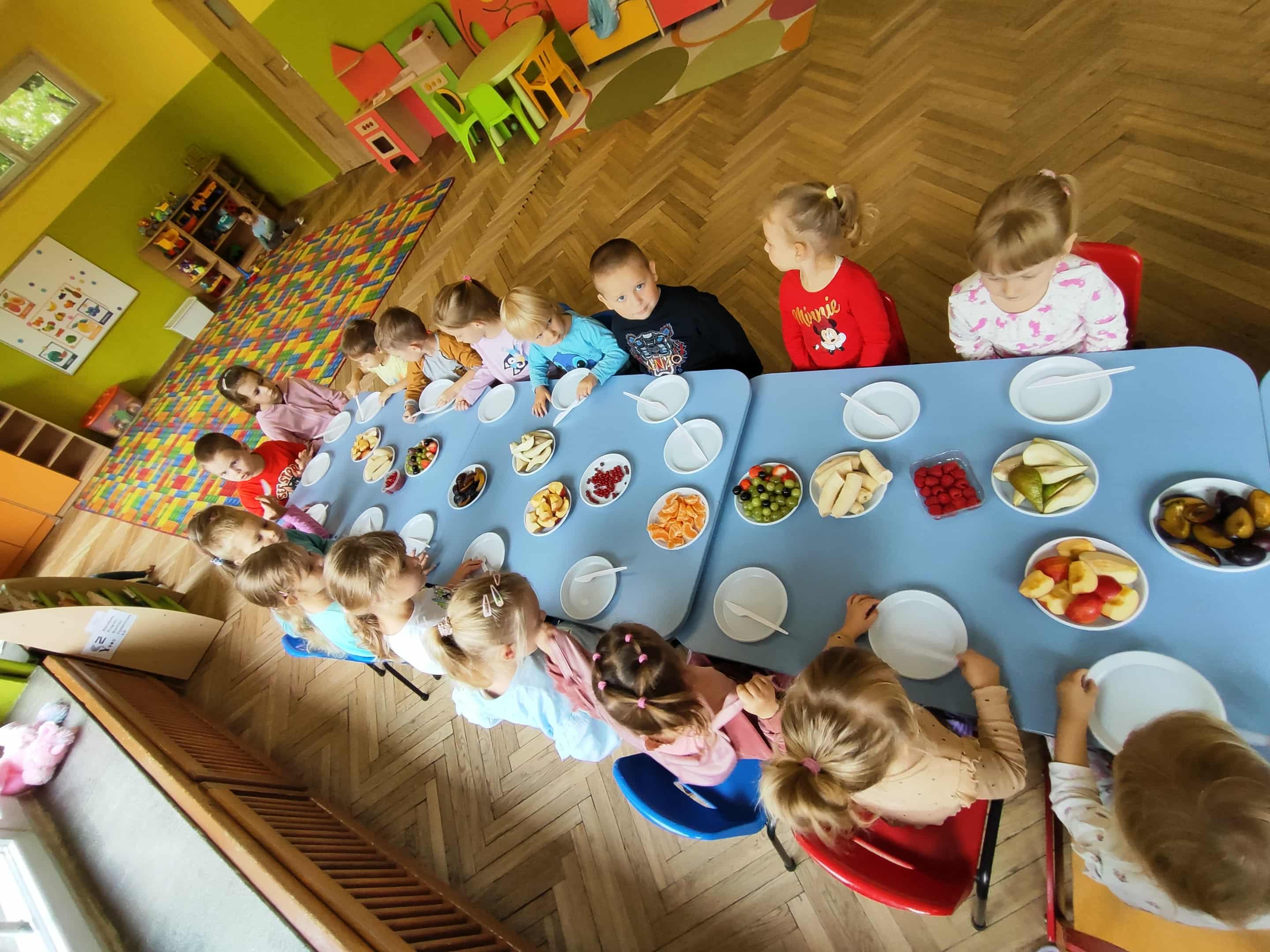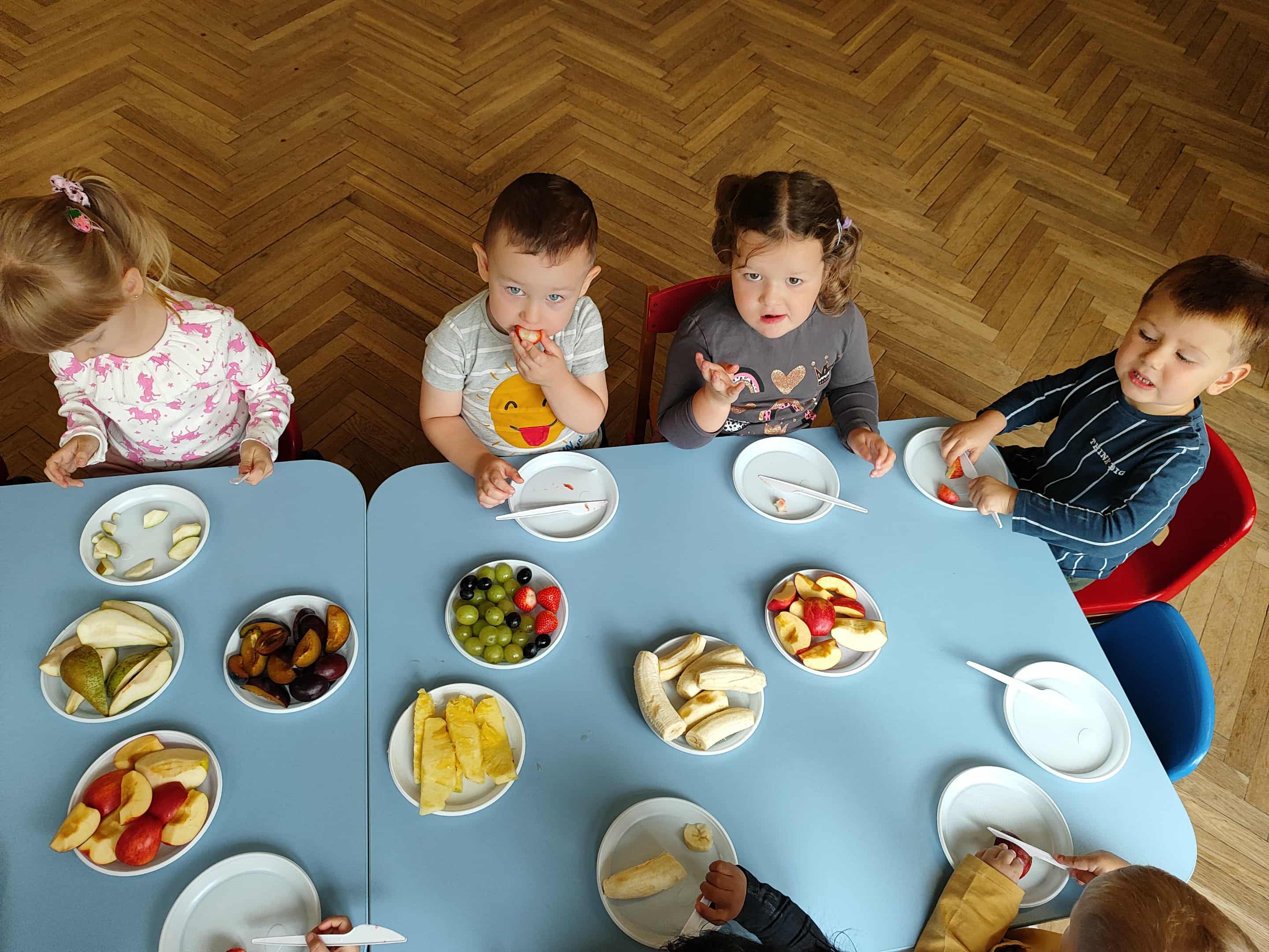 Dzieci samodzielnie kroiły i przyrządzały sałatkę owocową przestrzegając zasad bezpieczeństwa przy posługiwaniu się nożem. Własnoręcznie zrobiona sałatka wyśmienicie dzieciom smakowała.