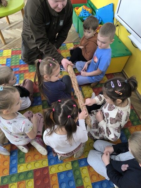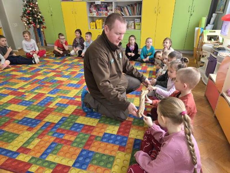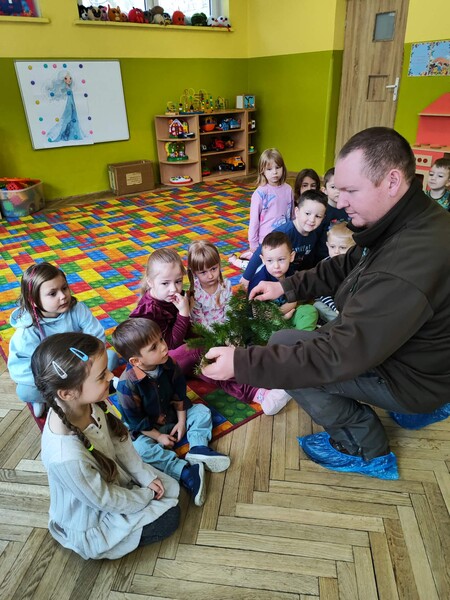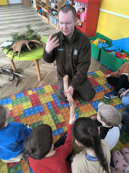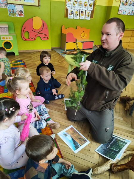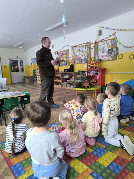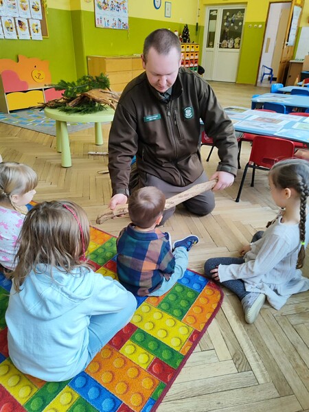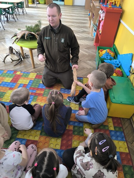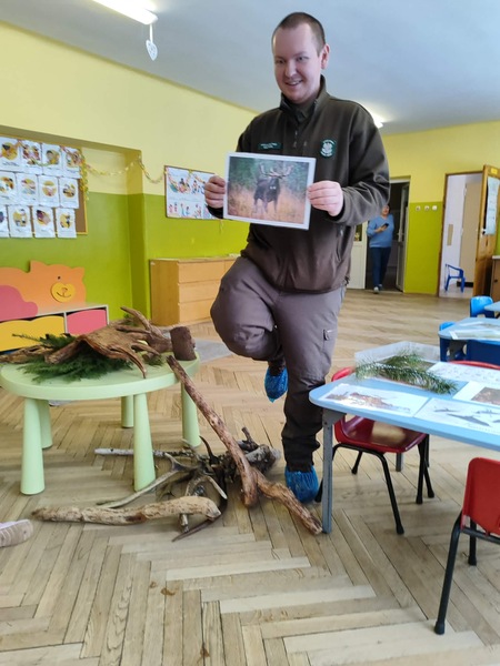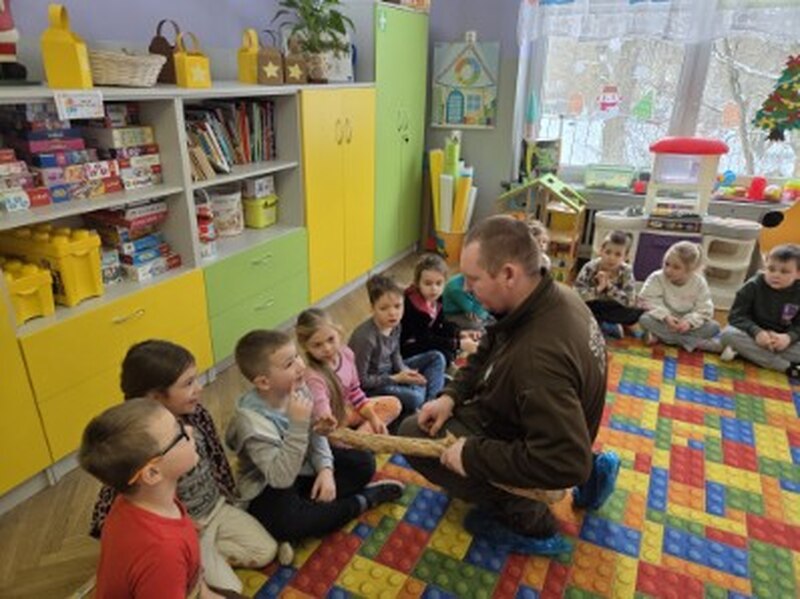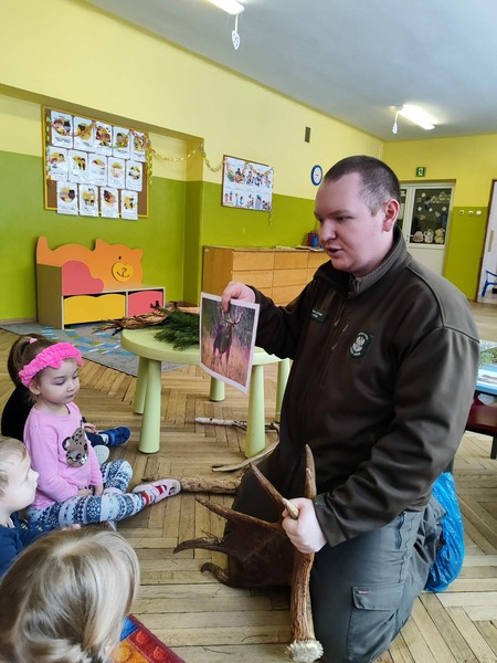 Do naszego przedszkola zawitał specjalny gość - Pan leśniczy pracujący w nadleśnictwie Grotniki. Celem tego spotkania było zapoznanie dzieci z pracą leśnika. Nasz gość opowiedział, a zarazem przypomniał dzieciom o zwierzętach występujących w lesie. Pan leśnik opowiedział również o sadzeniu lasu, przypomniał roślinność występującą w lesie oraz poszerzył nasze wiadomości o ochronie drzew przed szkodnikami. Przypomniał też, jak należy zachowywać się w lesie. Dzieci z dużym zainteresowaniem słuchały tych opowieści. Spotkanie upłynęło w miłej atmosferze, a wysłuchane ciekawostki i wiadomości poszerzyły wiedzę przyrodniczą przedszkolaków.