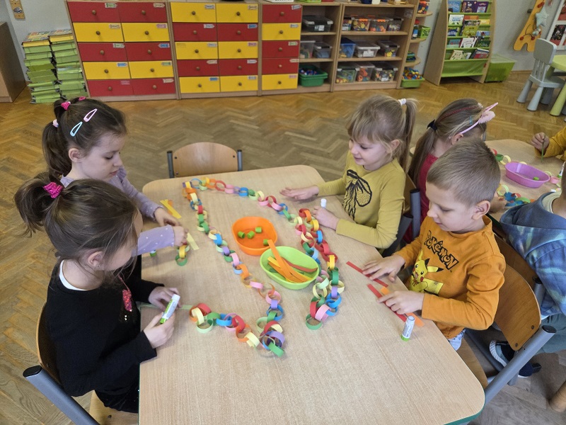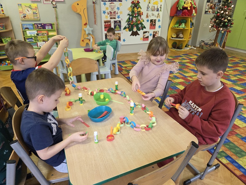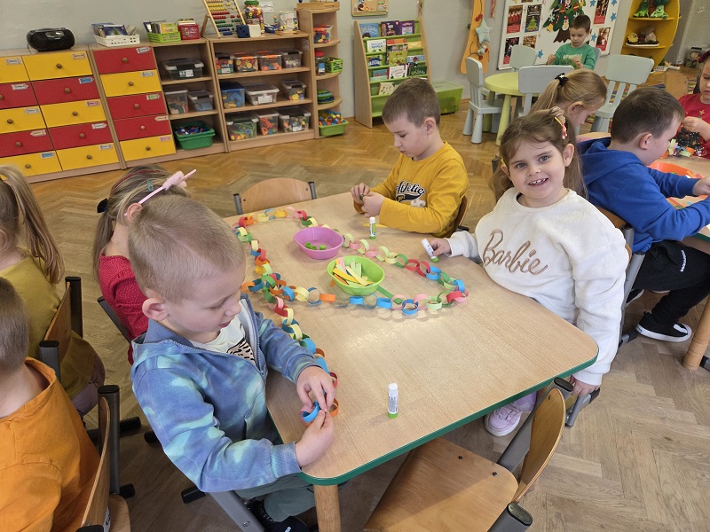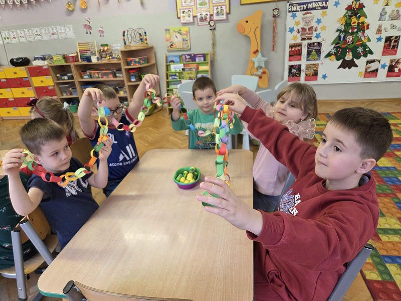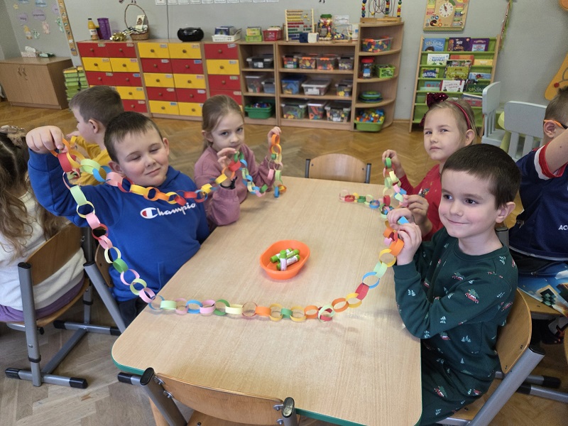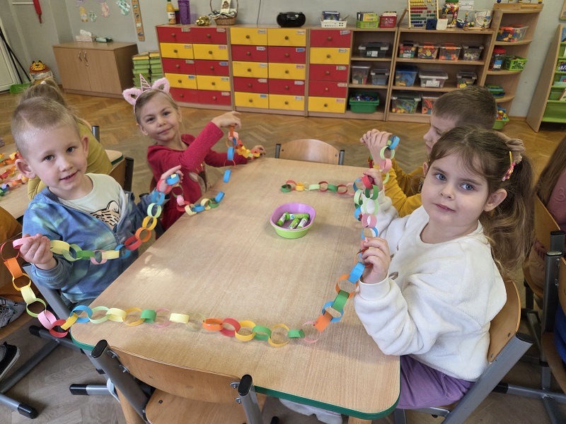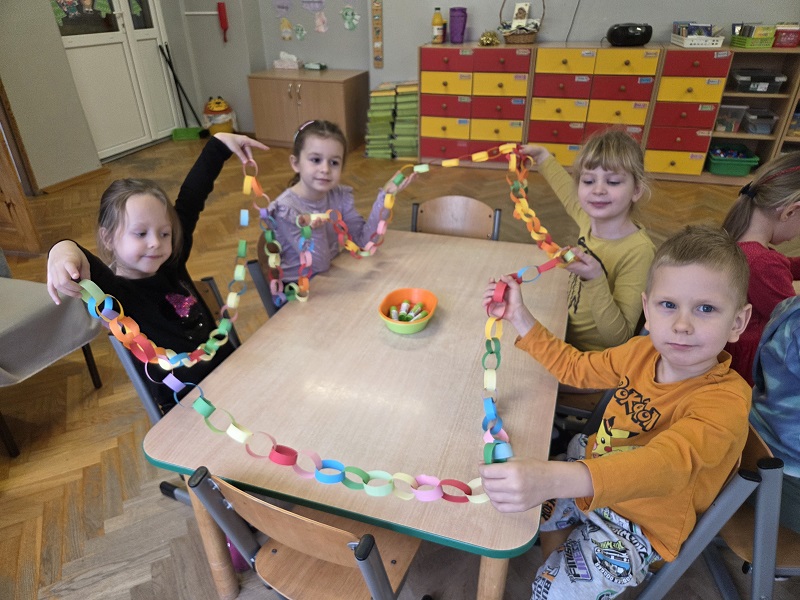 Tuż przed świętami Bożego Narodzenia grupa Biedronek postanowiła wykonać wspólnie kolorowy łańcuch, z różnokolorowych pasków papieru, W małych zespołach dzieci tworzyły małe łańcuchy, następnie wspólnie połączyły w jeden, który ozdobił naszą salę.