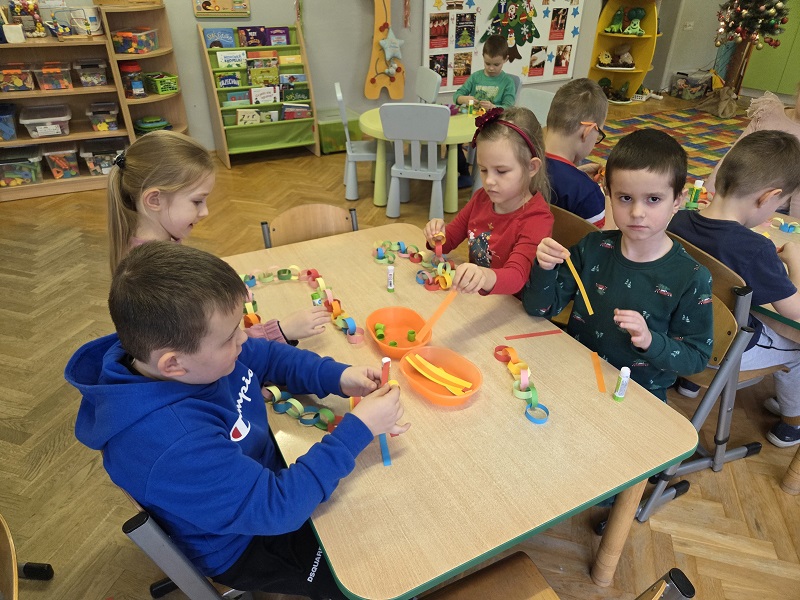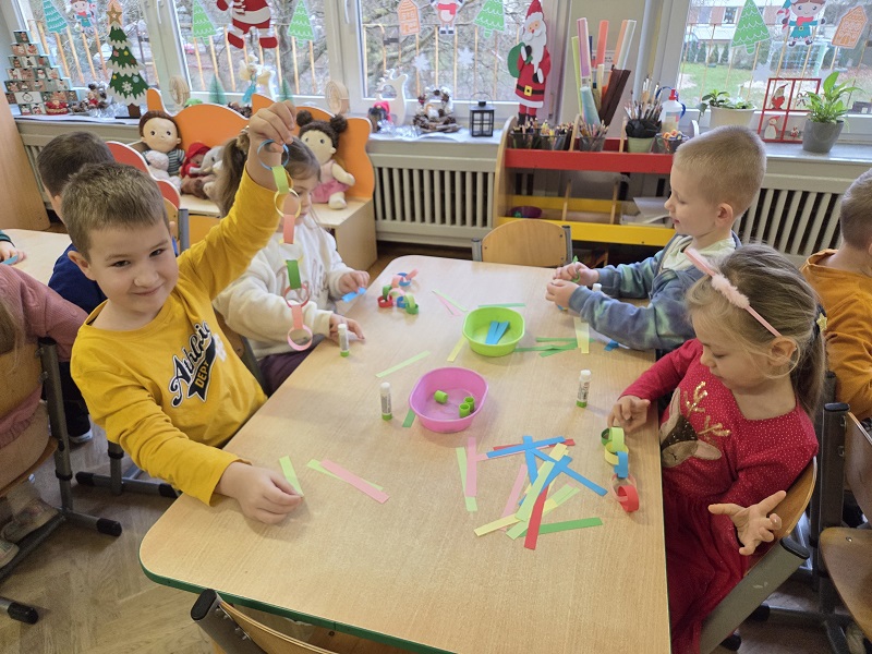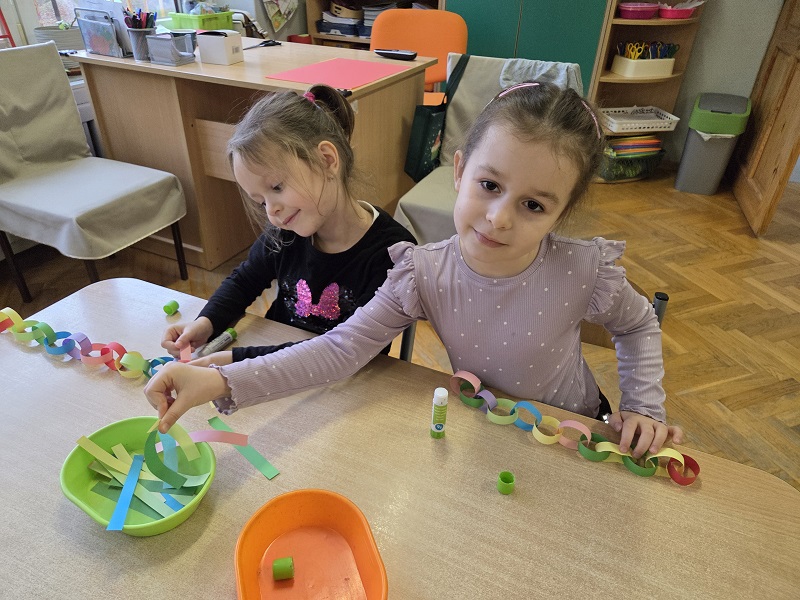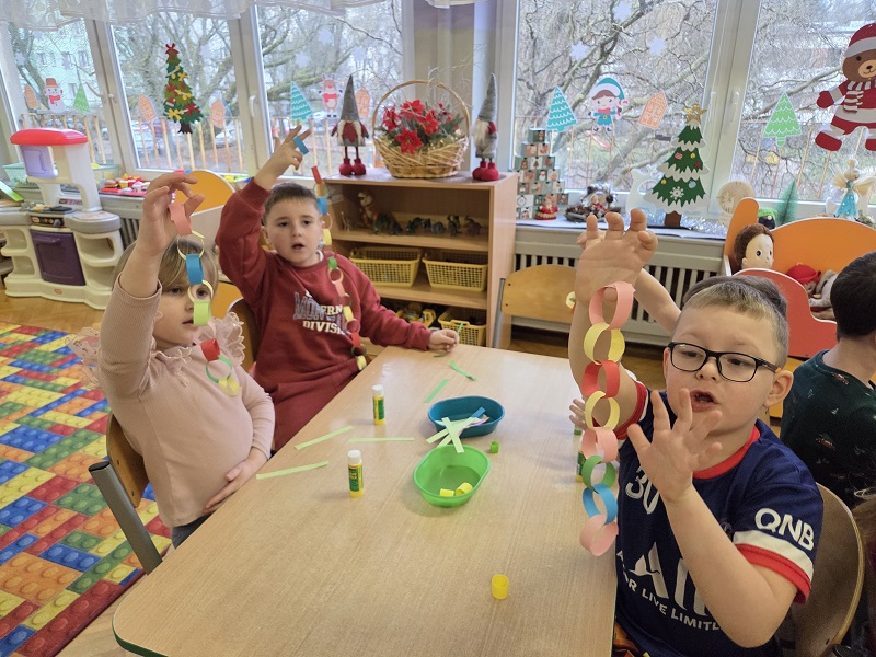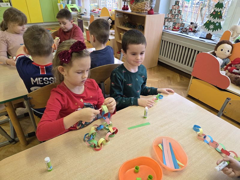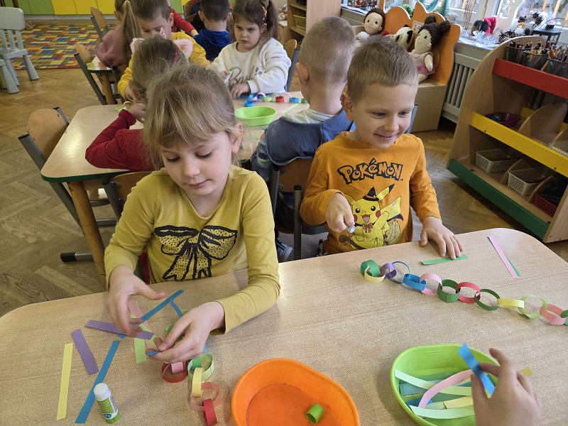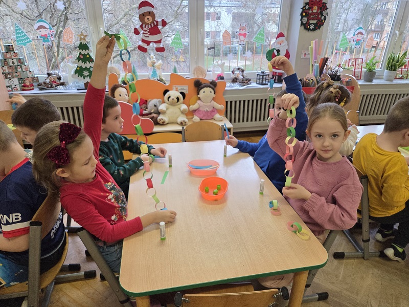 Tuż przed świętami Bożego Narodzenia grupa Biedronek postanowiła wykonać wspólnie kolorowy łańcuch, z różnokolorowych pasków papieru, W małych zespołach dzieci tworzyły małe łańcuchy, następnie wspólnie połączyły w jeden, który ozdobił naszą salę.