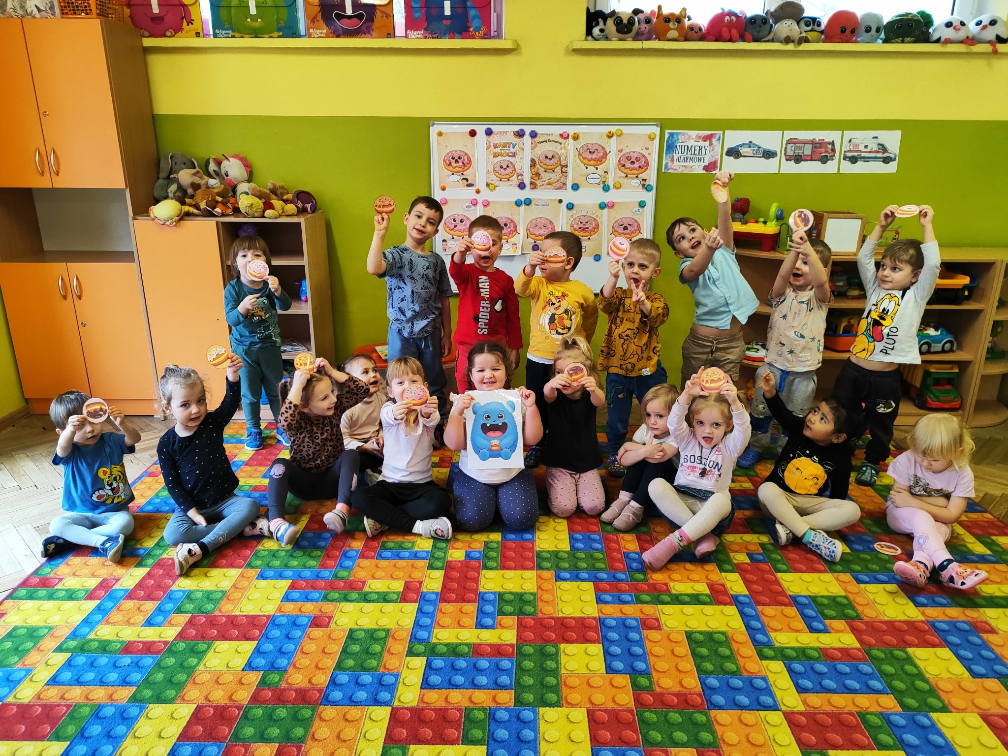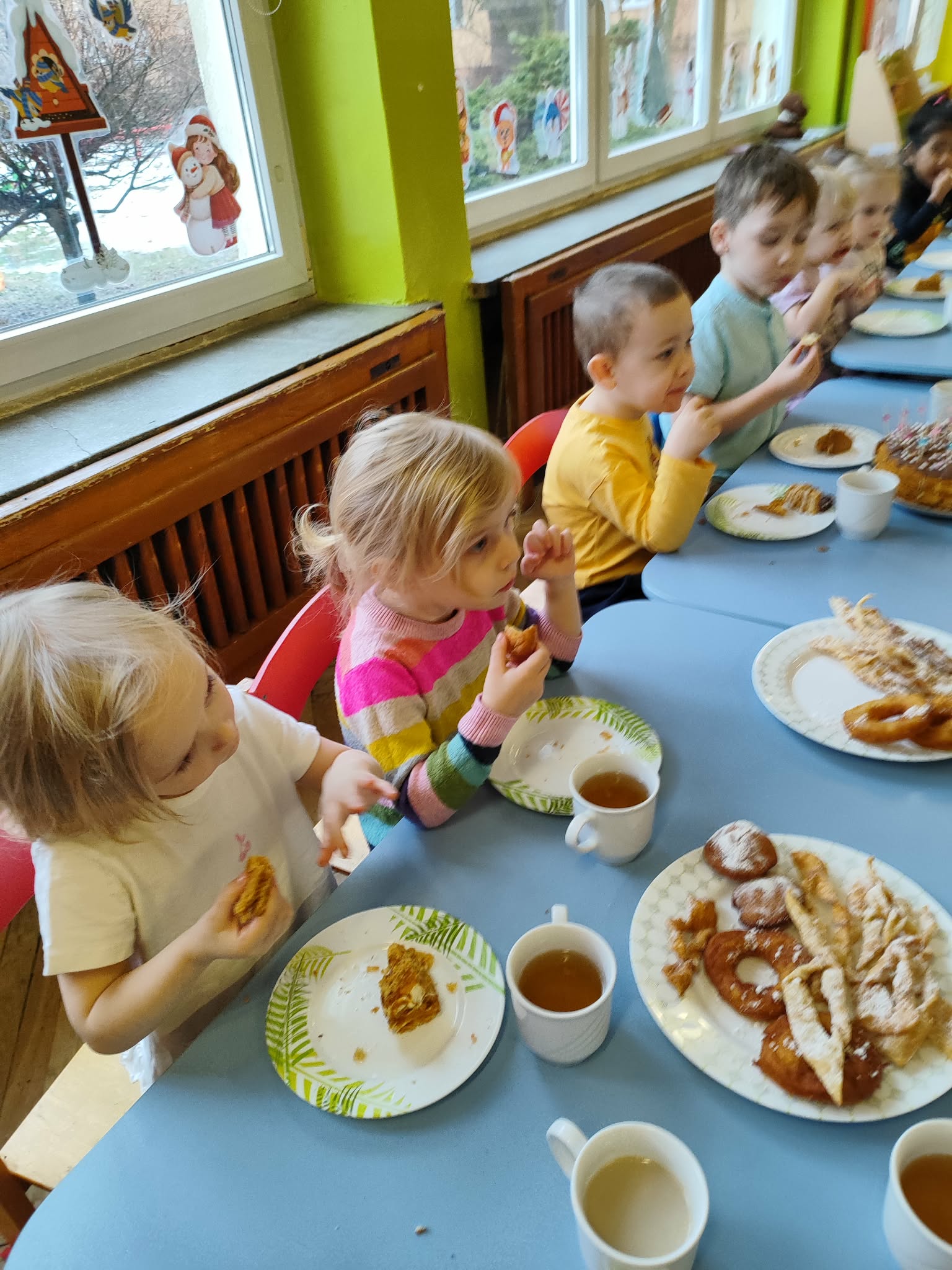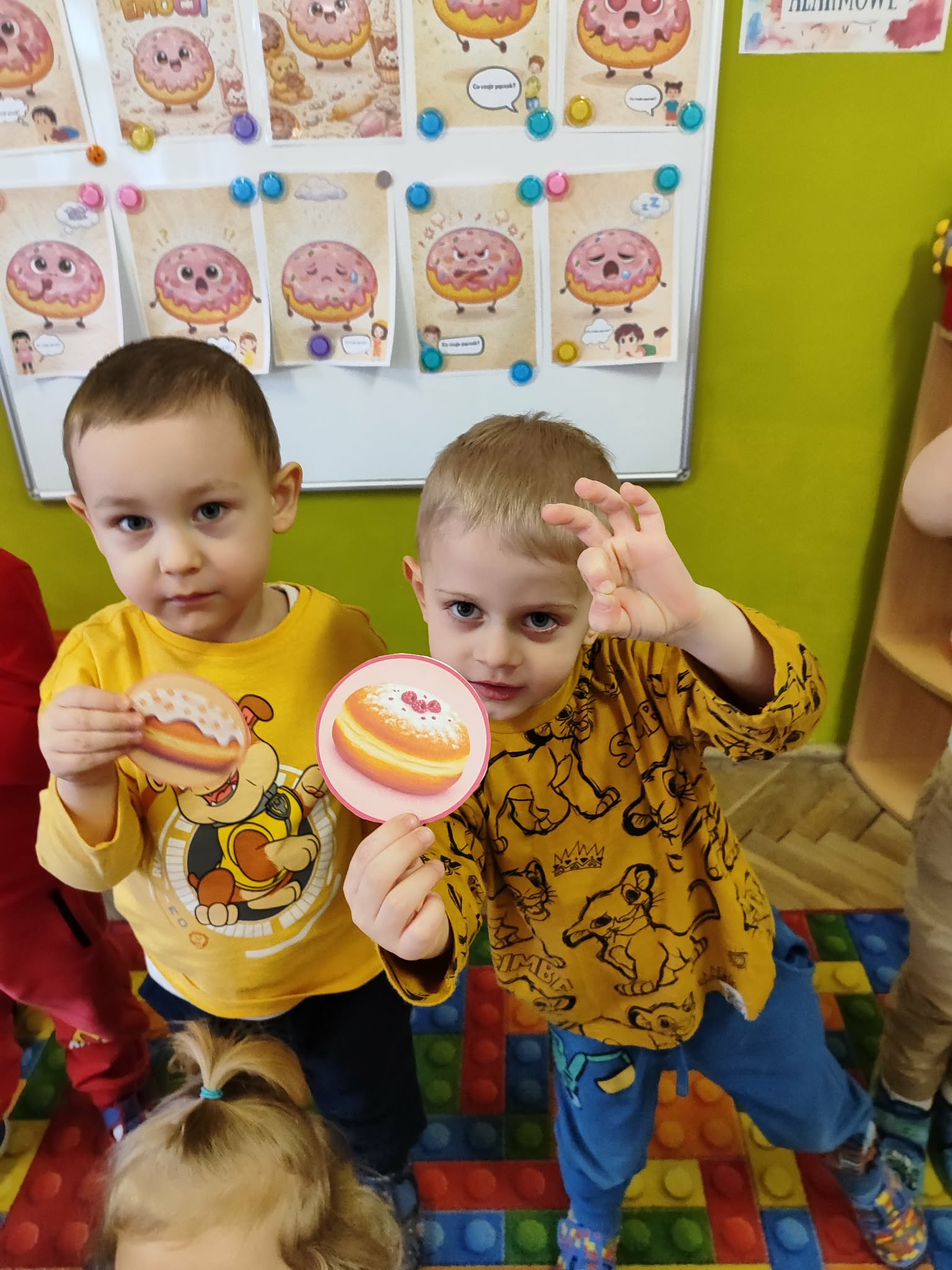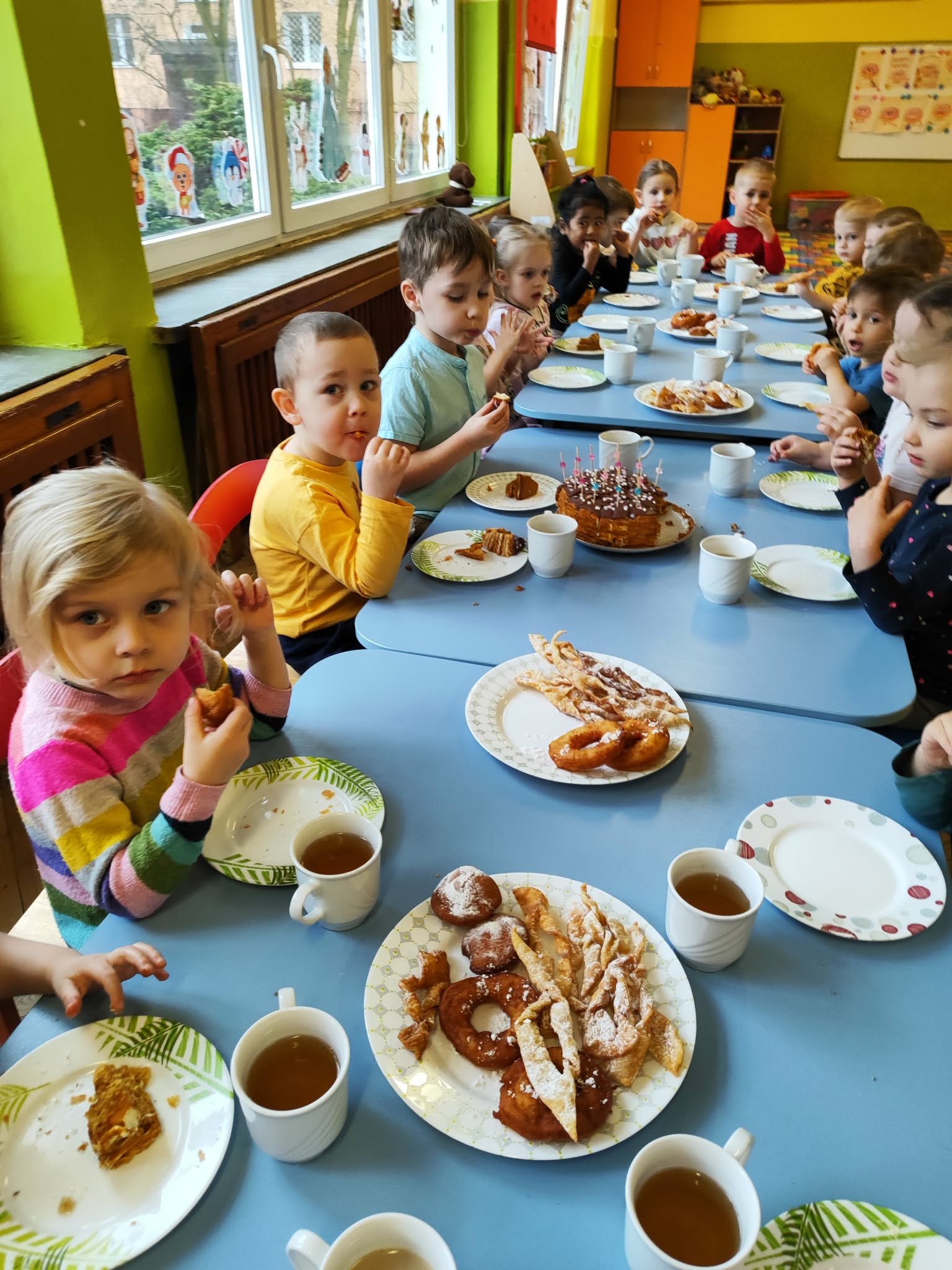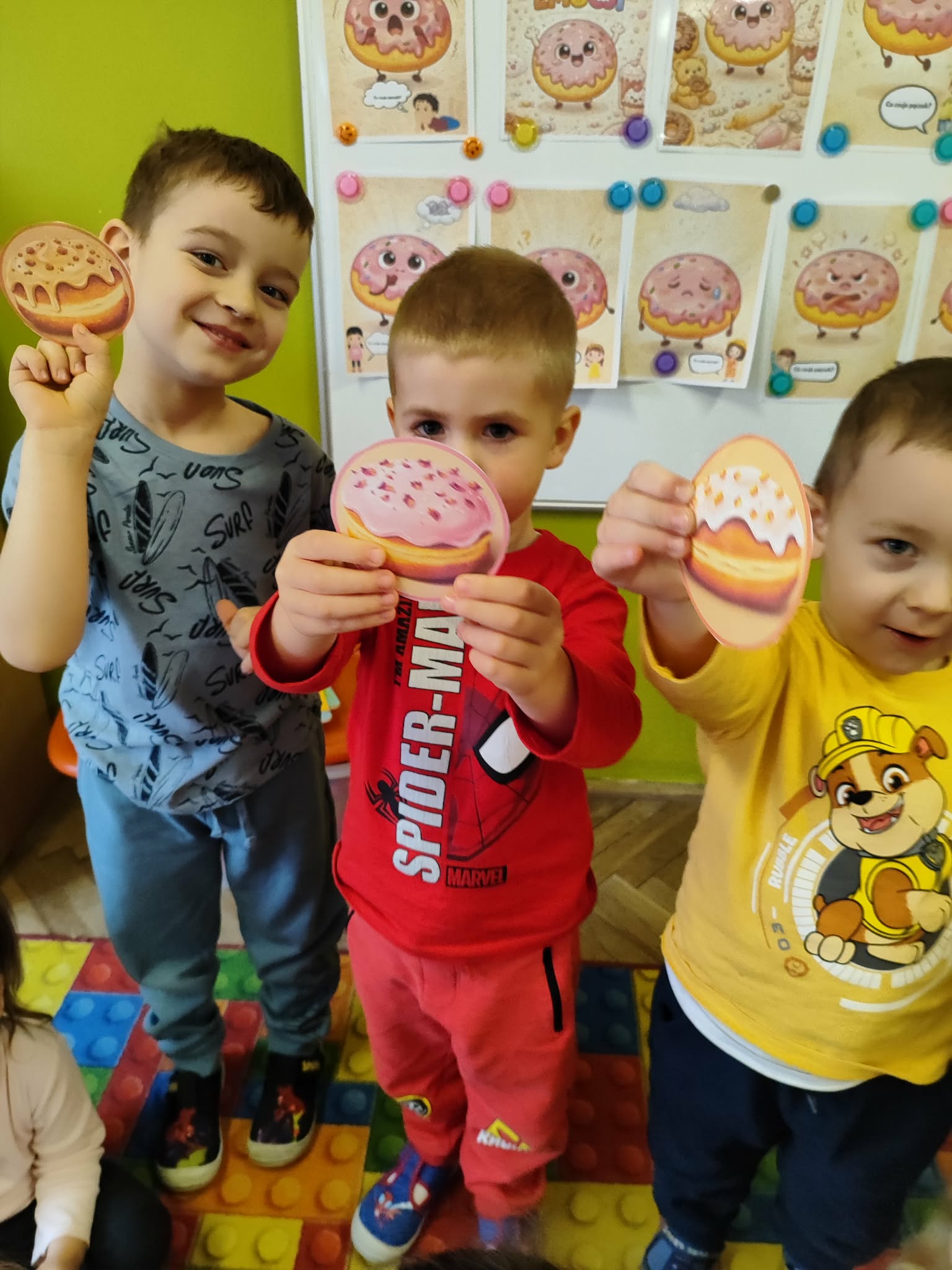Dzieci dowiedziały się skąd wzieła się tradycja Tłustego Czwartku i dlaczego w tym dniu jemy pączki bądź faworki. Przedszkolaki podczas pracy plastycznej ozdabiały duże plakaty słodkich oponek, tworzyły własne modele papierowych pączków oraz wiele innych kreatywnych dzieł. Dzień ten przepełniony był radosną atmosferą oraz świętem dla wszystkich łasuchów.