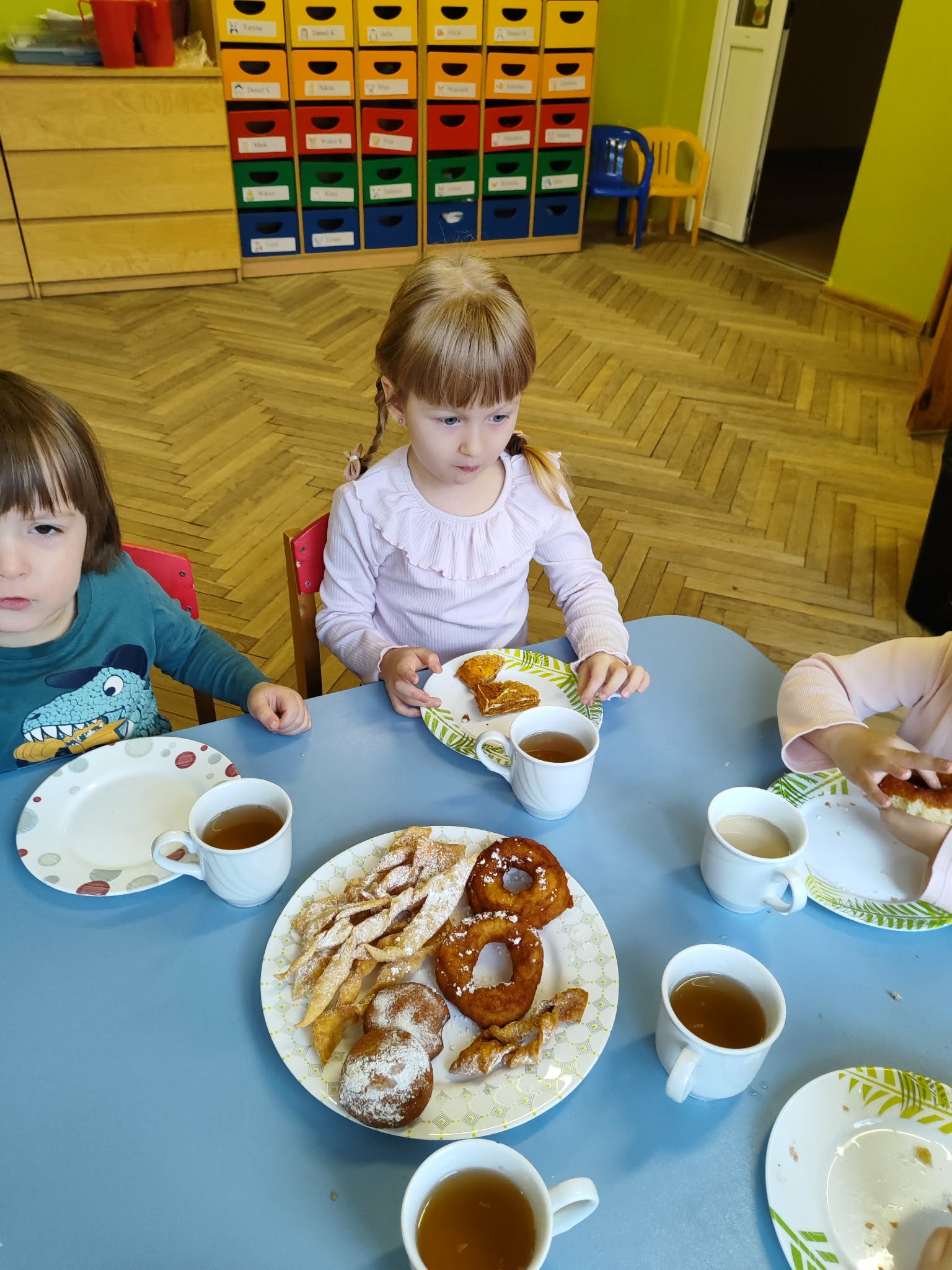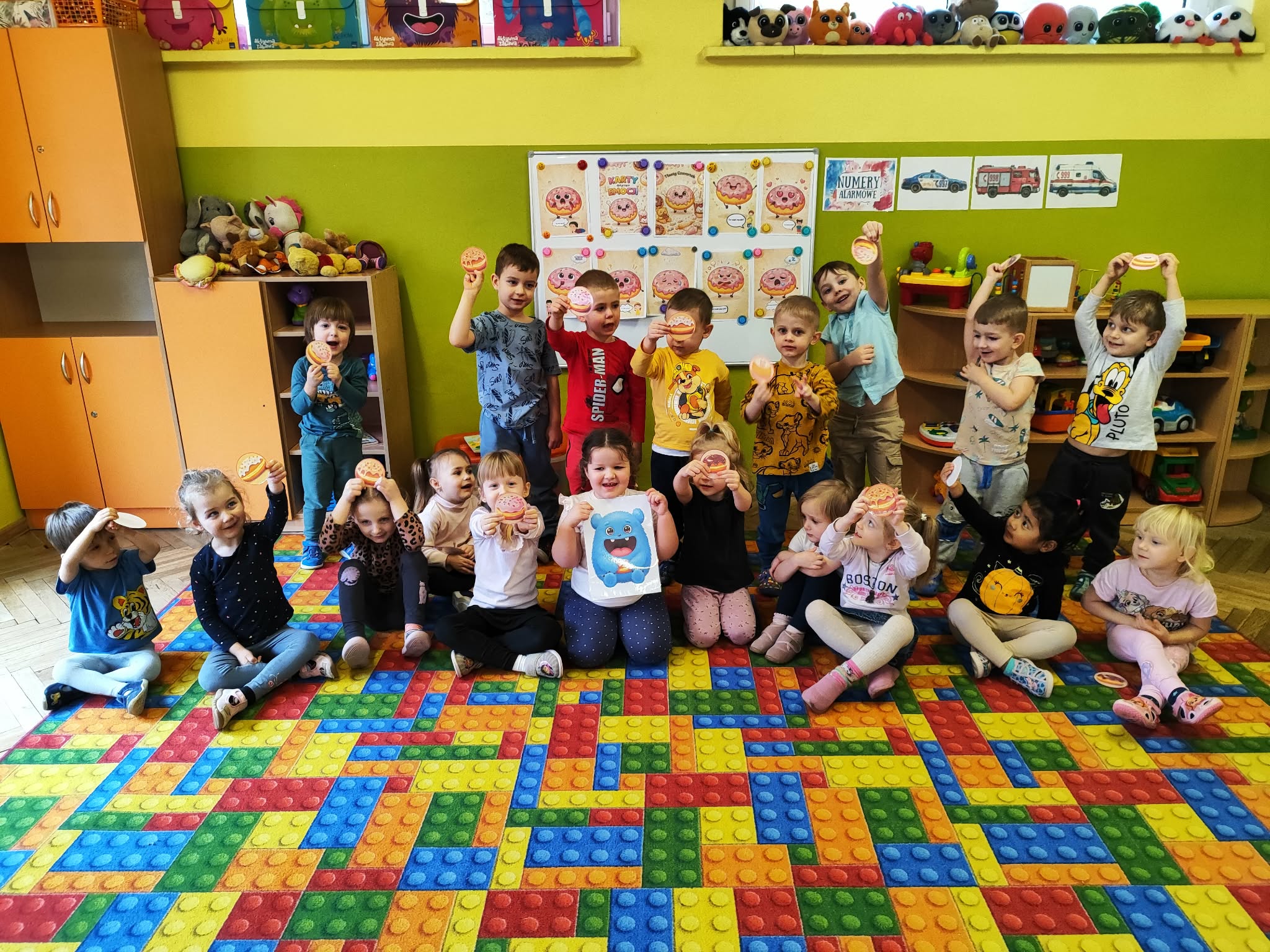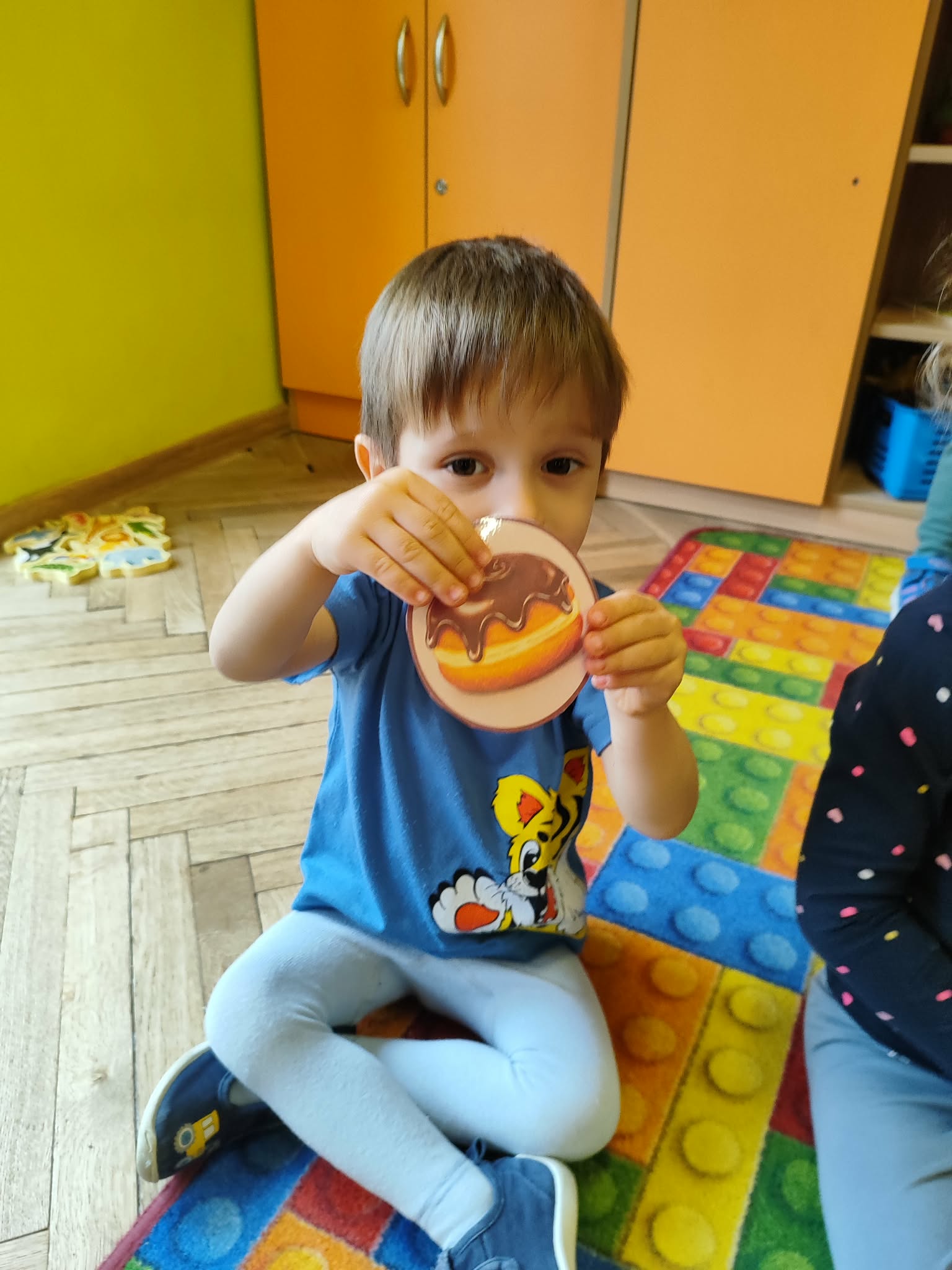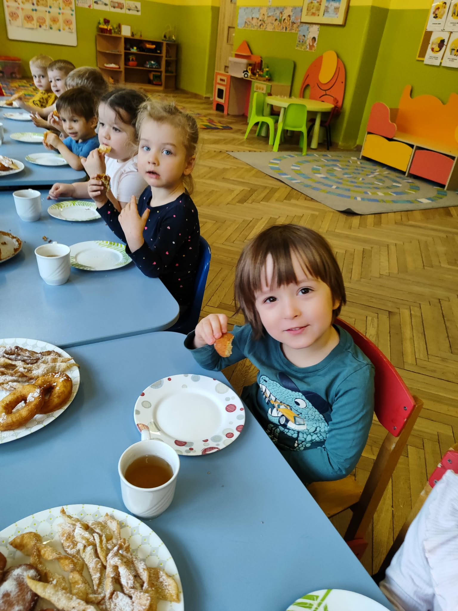 Dzieci dowiedziały się skąd wzieła się tradycja Tłustego Czwartku i dlaczego w tym dniu jemy pączki bądź faworki. Przedszkolaki podczas pracy plastycznej ozdabiały duże plakaty słodkich oponek, tworzyły własne modele papierowych pączków oraz wiele innych kreatywnych dzieł. Dzień ten przepełniony był radosną atmosferą oraz świętem dla wszystkich łasuchów.