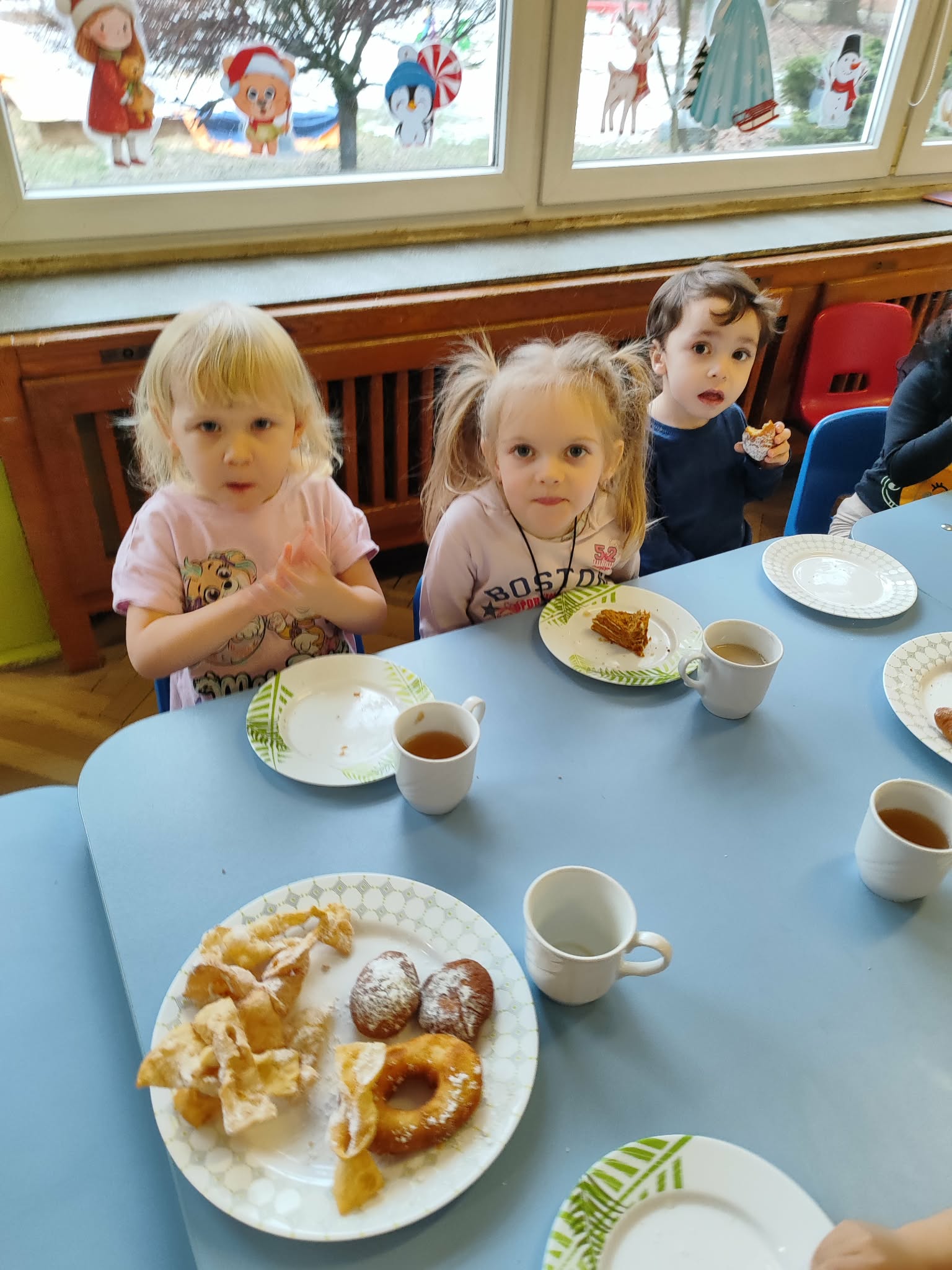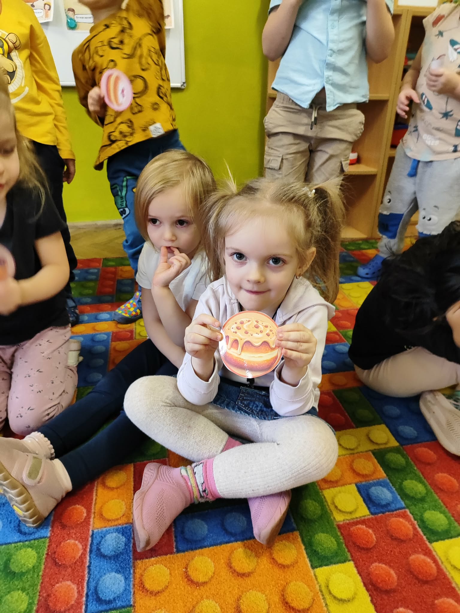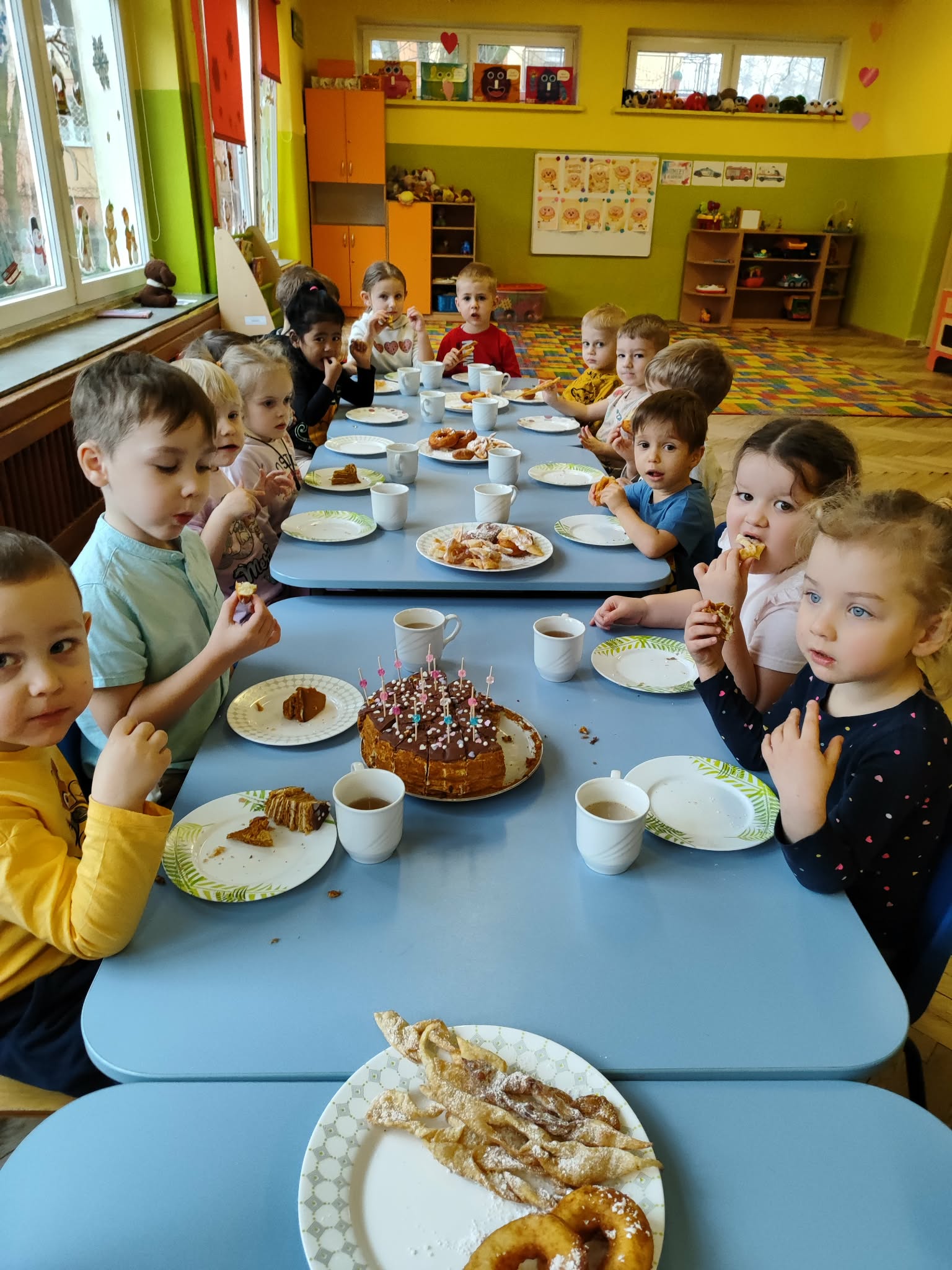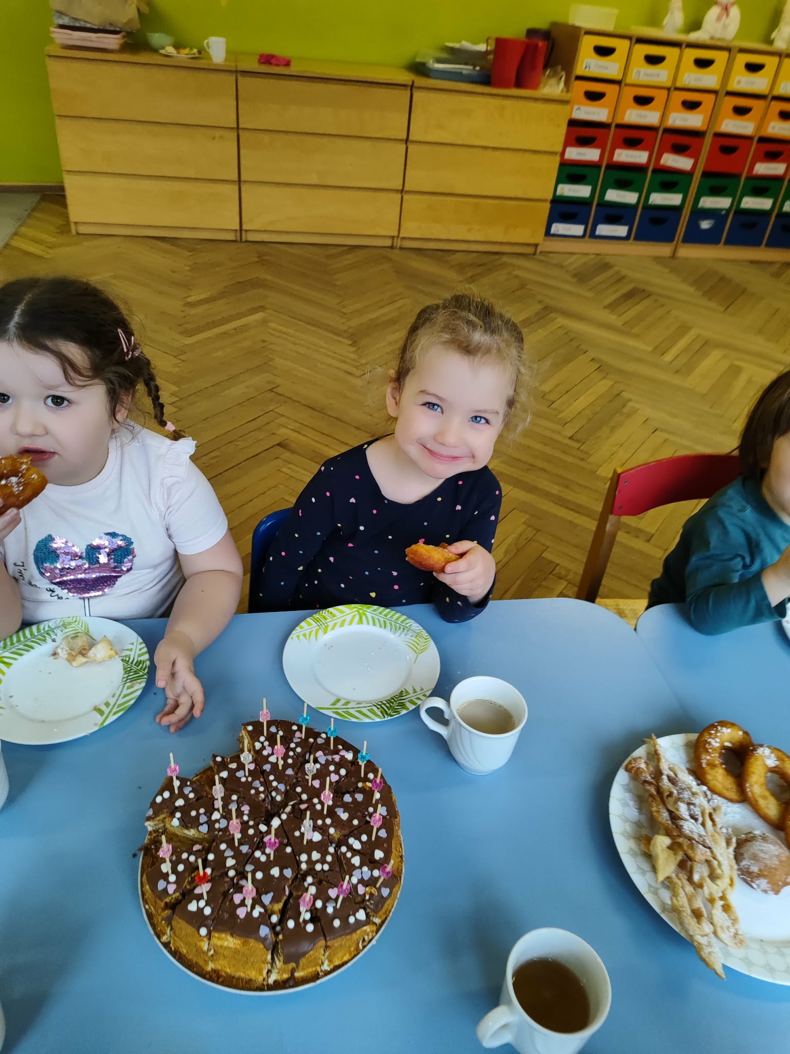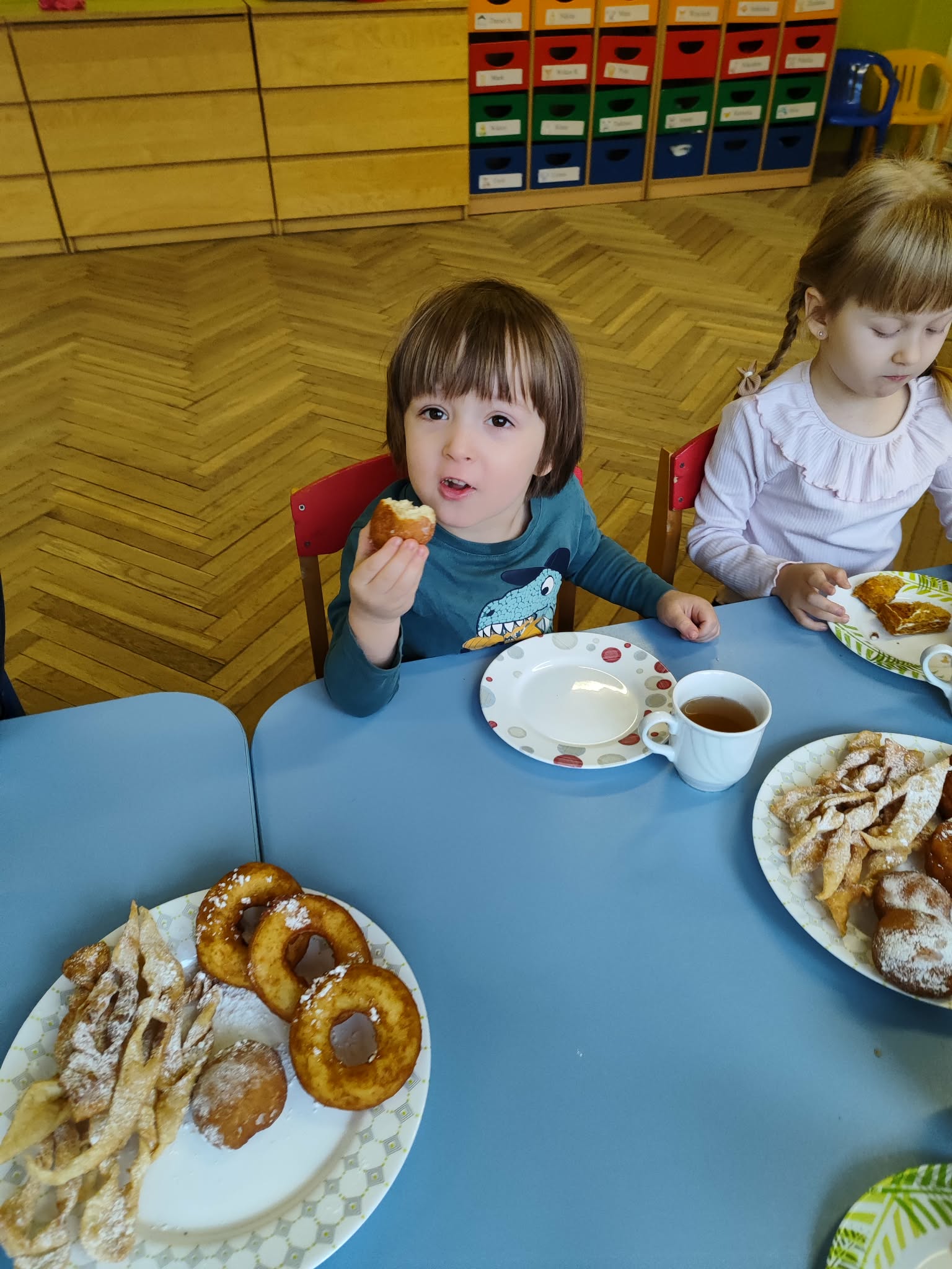 Dzieci dowiedziały się skąd wzieła się tradycja Tłustego Czwartku i dlaczego w tym dniu jemy pączki bądź faworki. Przedszkolaki podczas pracy plastycznej ozdabiały duże plakaty słodkich oponek, tworzyły własne modele papierowych pączków oraz wiele innych kreatywnych dzieł. Dzień ten przepełniony był radosną atmosferą oraz świętem dla wszystkich łasuchów.