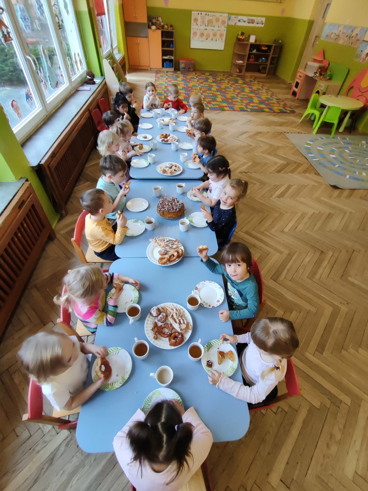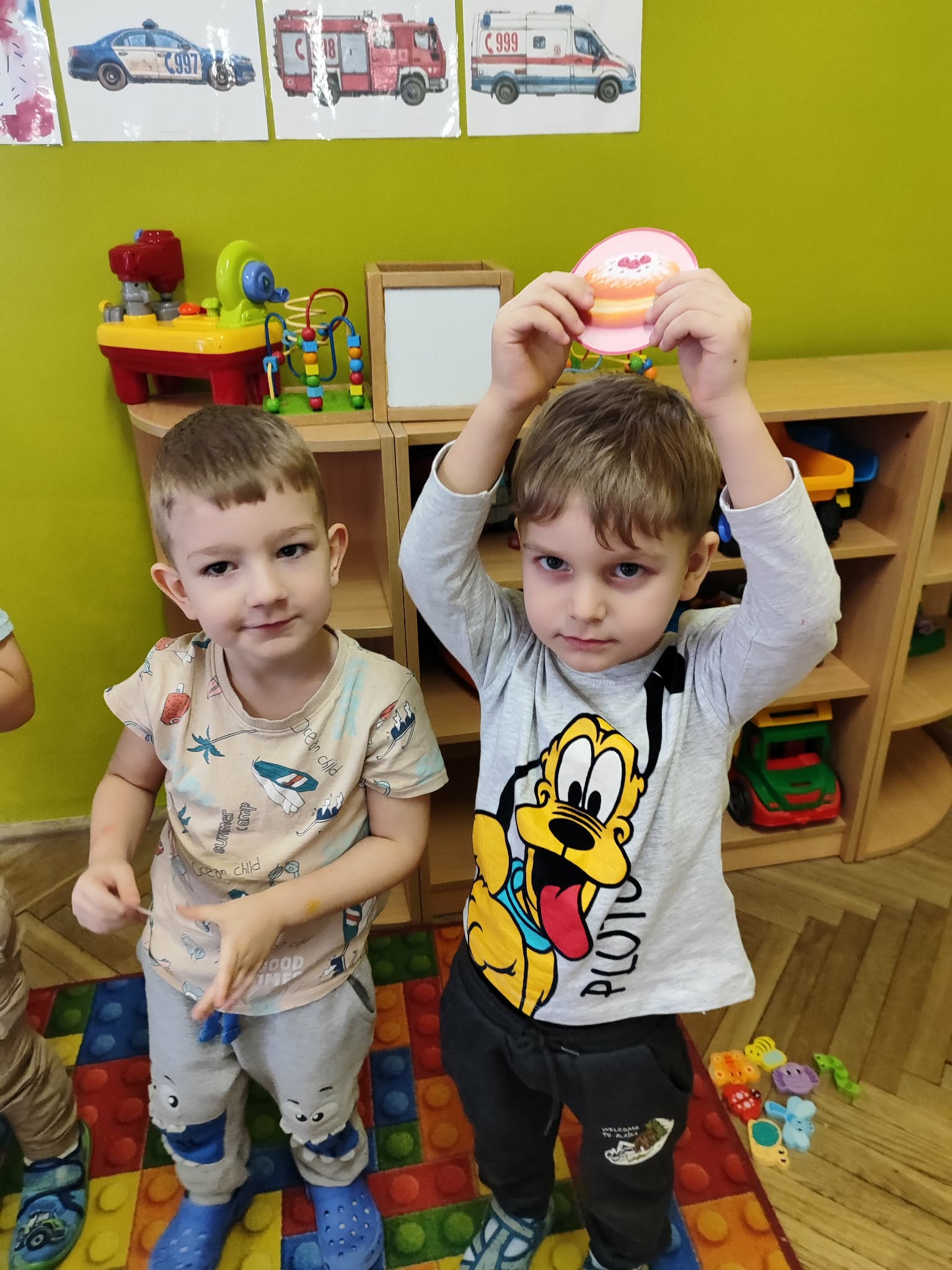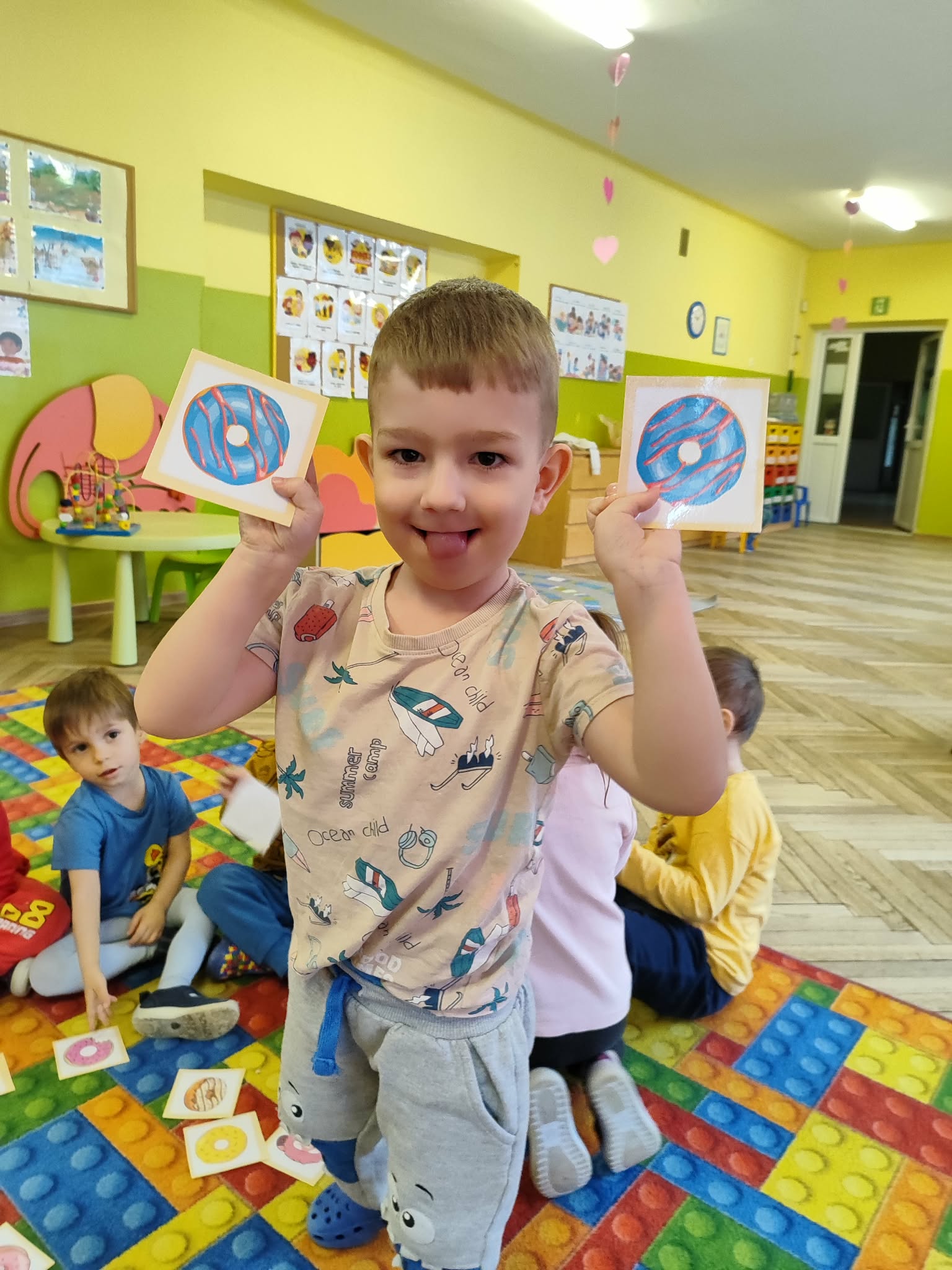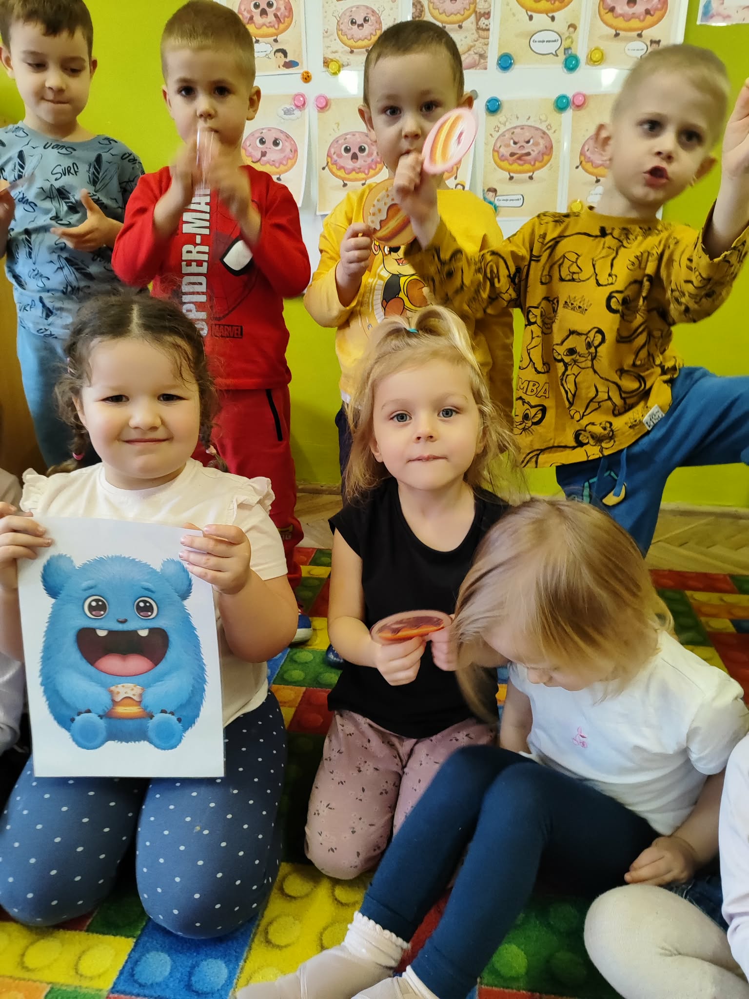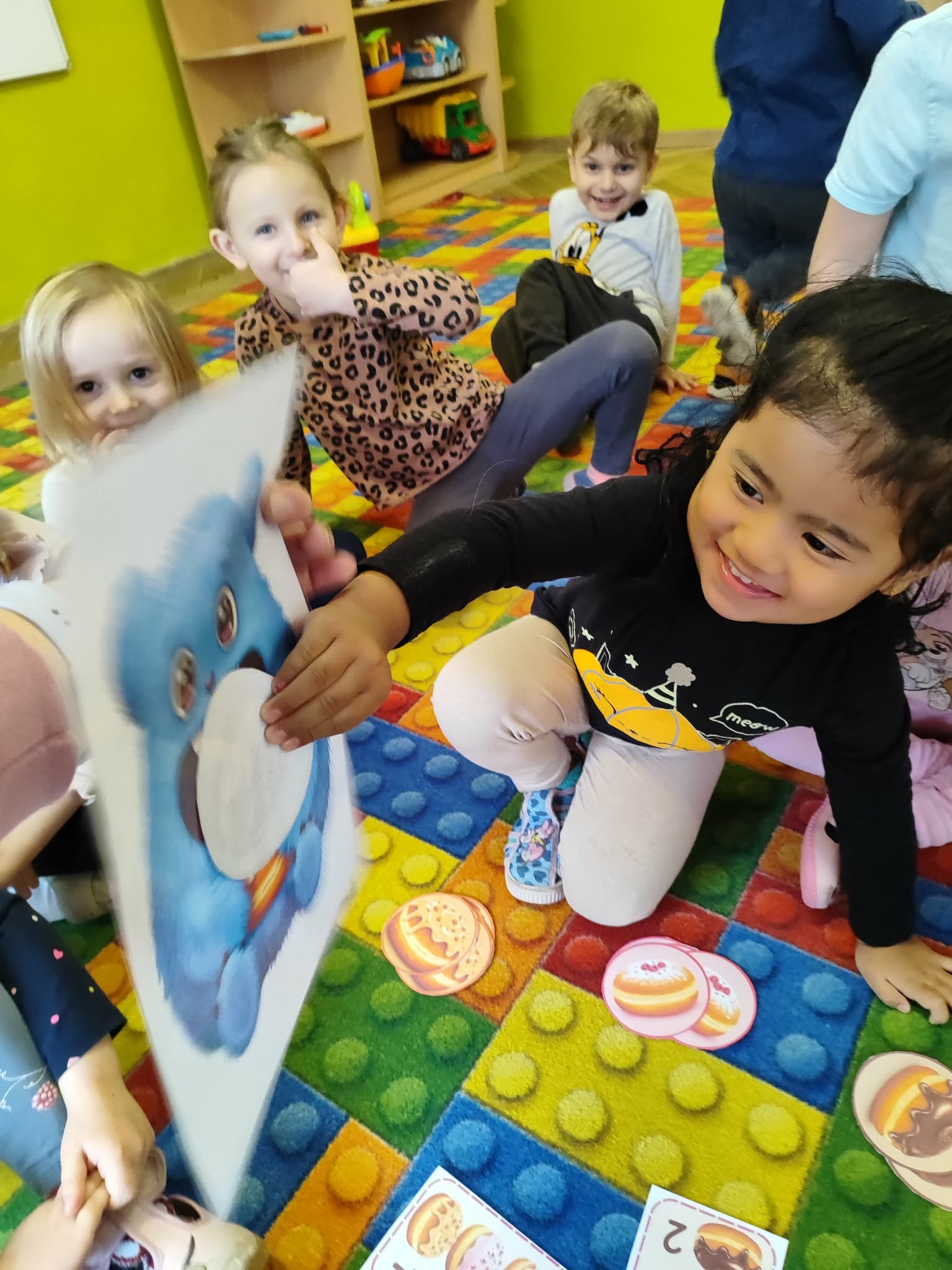 Dzieci dowiedziały się skąd wzieła się tradycja Tłustego Czwartku i dlaczego w tym dniu jemy pączki bądź faworki. Przedszkolaki podczas pracy plastycznej ozdabiały duże plakaty słodkich oponek, tworzyły własne modele papierowych pączków oraz wiele innych kreatywnych dzieł. Dzień ten przepełniony był radosną atmosferą oraz świętem dla wszystkich łasuchów.
