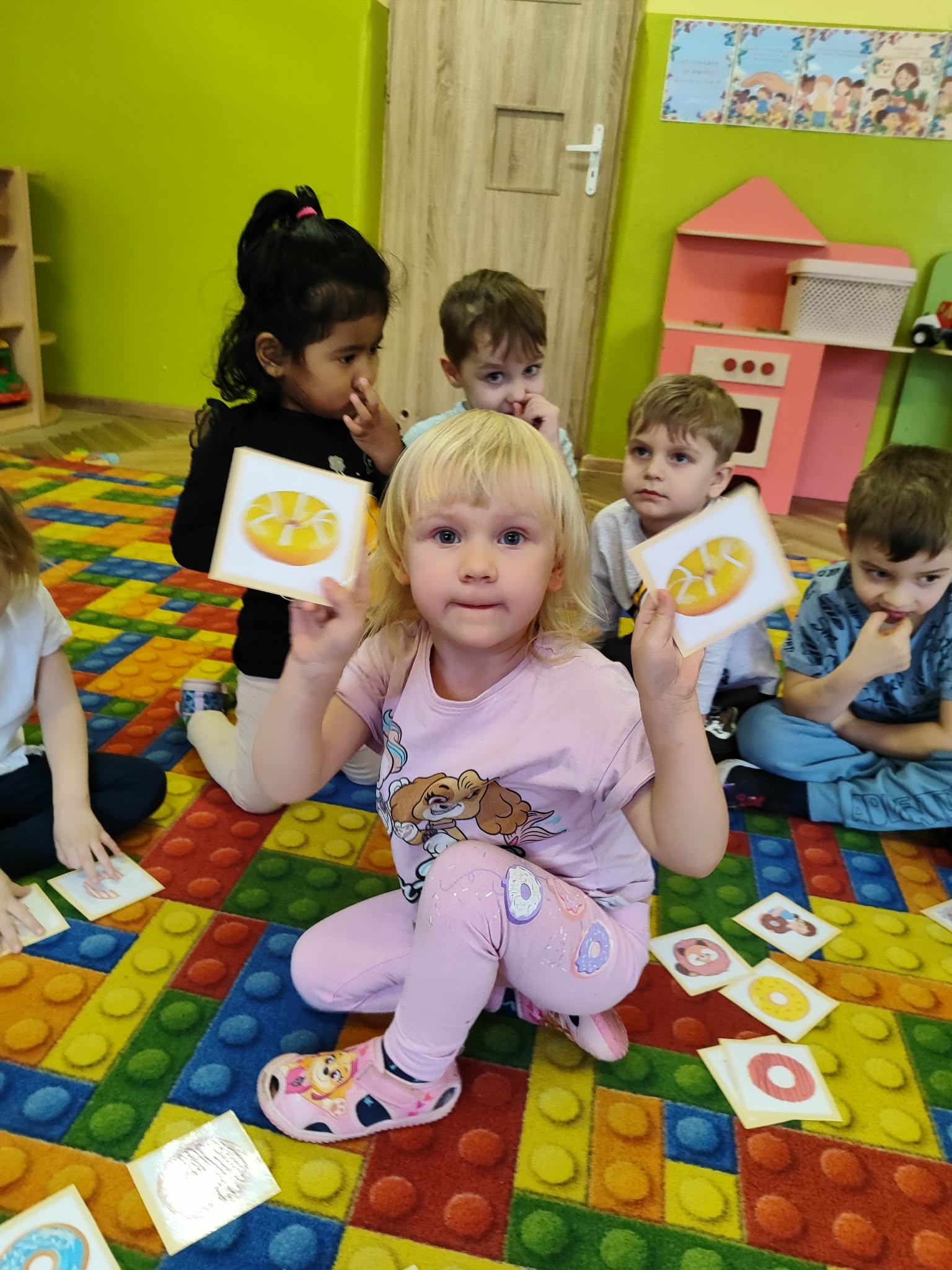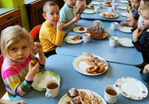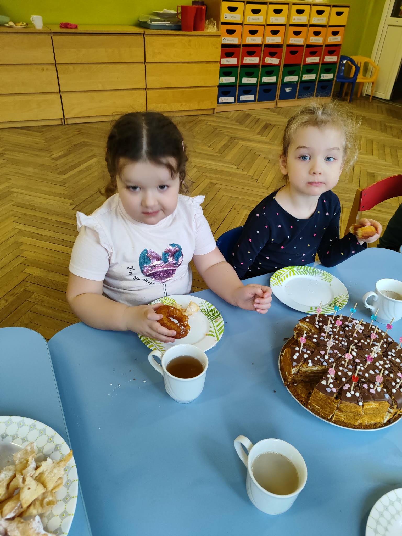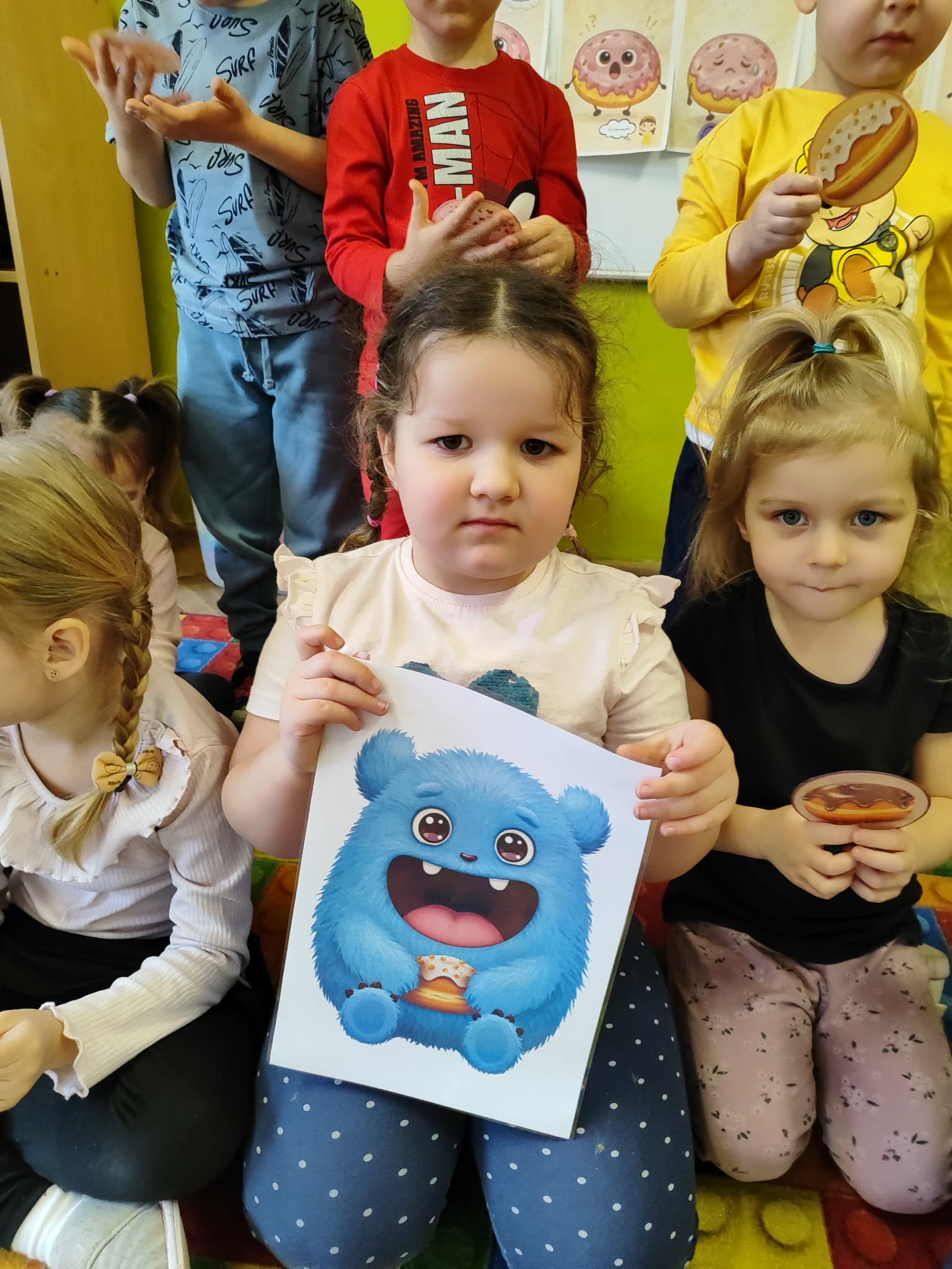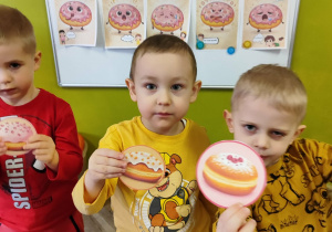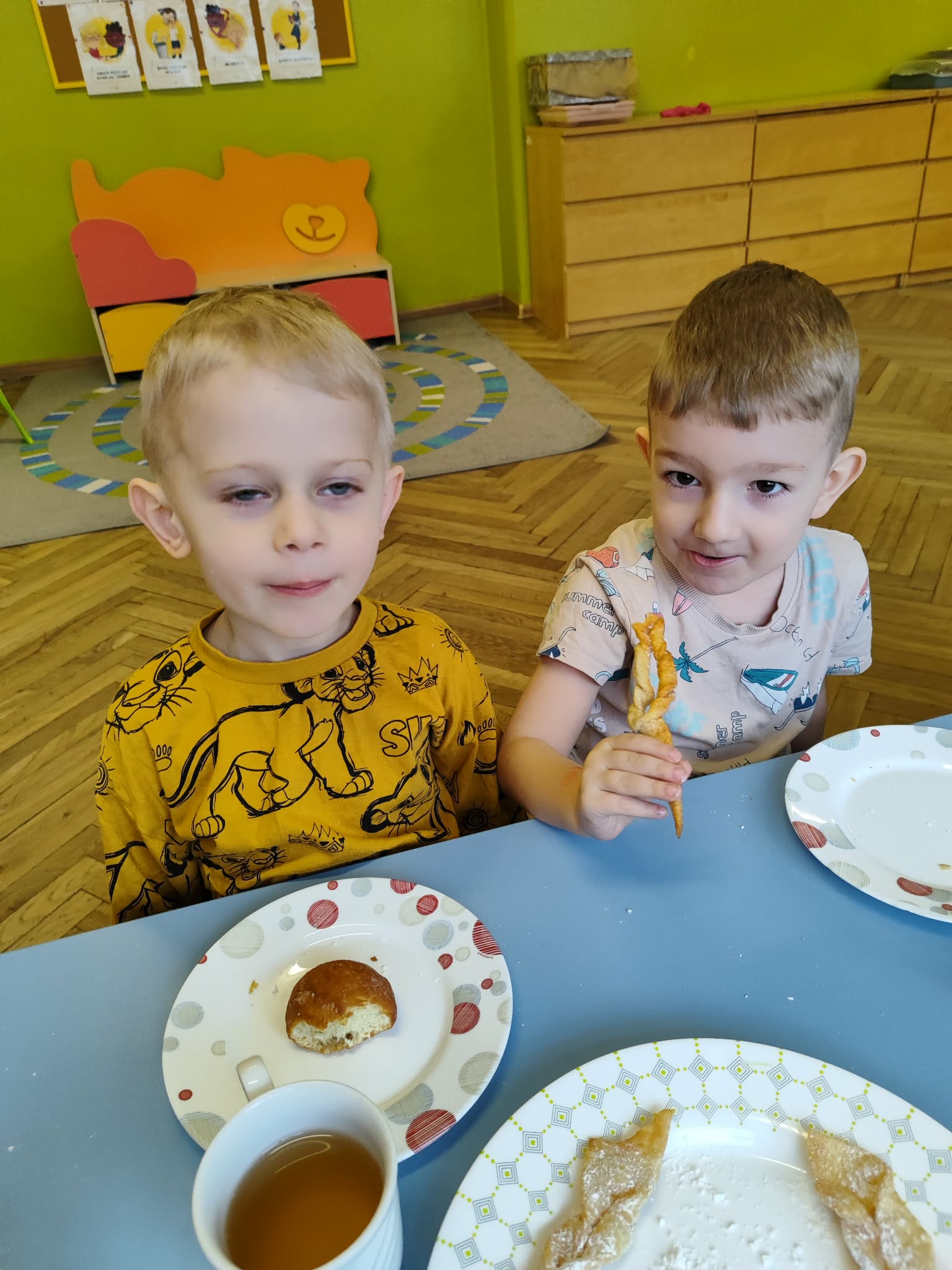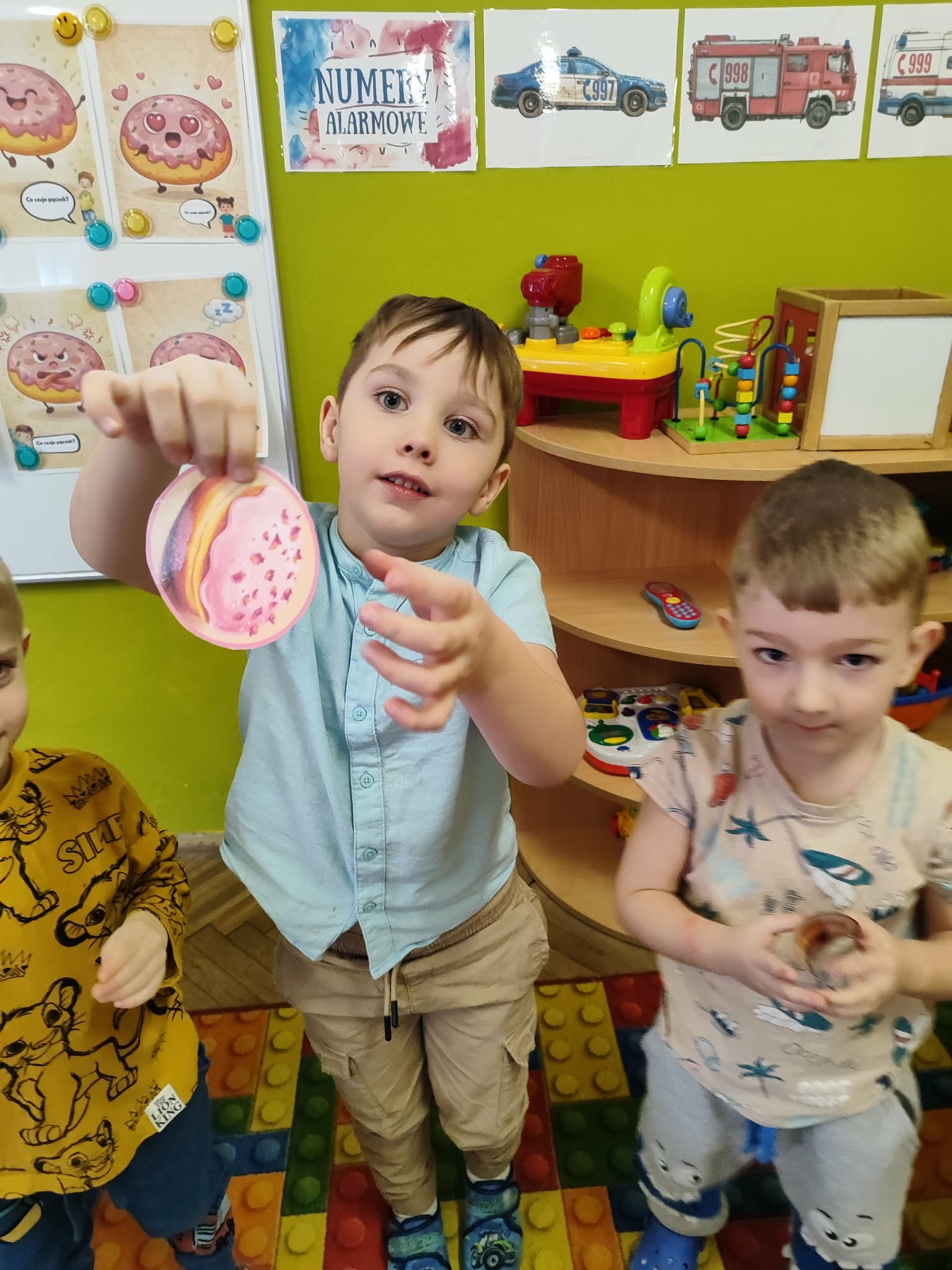 Dzieci dowiedziały się skąd wzieła się tradycja Tłustego Czwartku i dlaczego w tym dniu jemy pączki bądź faworki. Przedszkolaki podczas pracy plastycznej ozdabiały duże plakaty słodkich oponek, tworzyły własne modele papierowych pączków oraz wiele innych kreatywnych dzieł. Dzień ten przepełniony był radosną atmosferą oraz świętem dla wszystkich łasuchów.