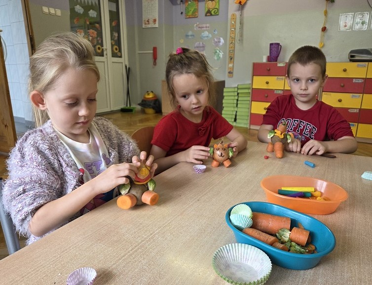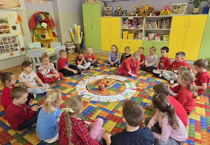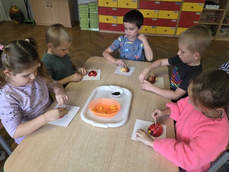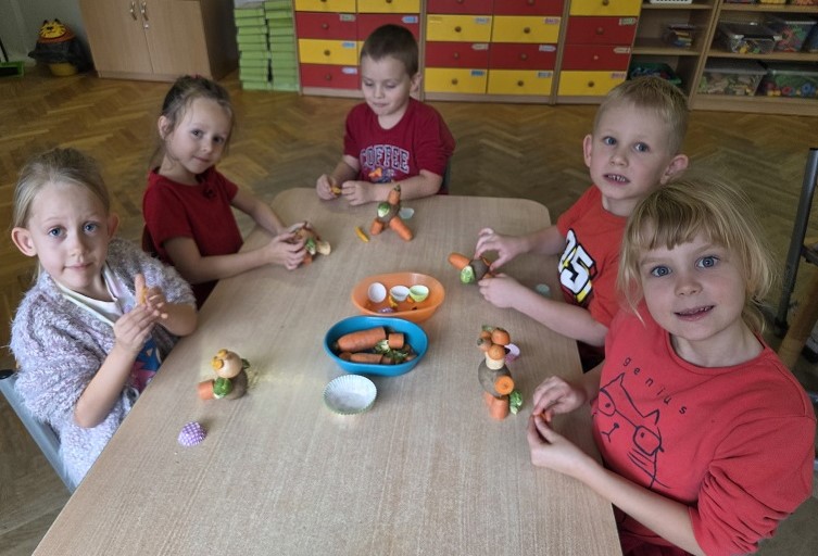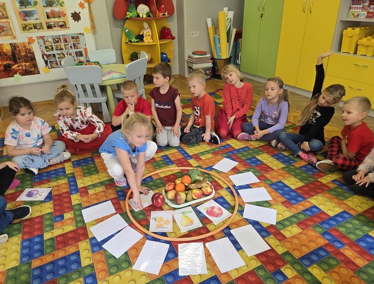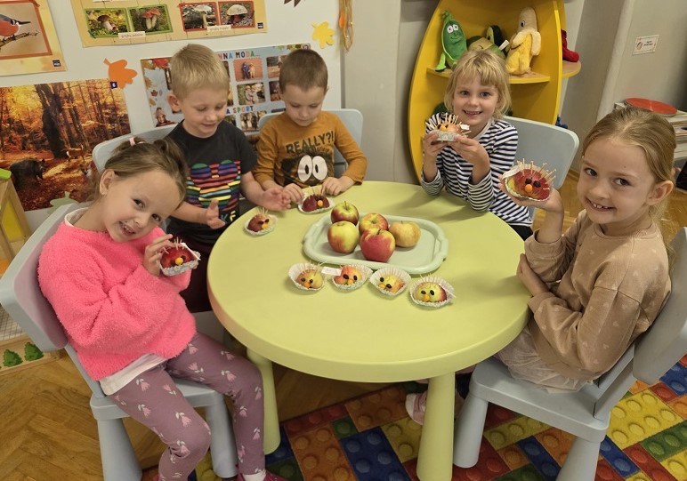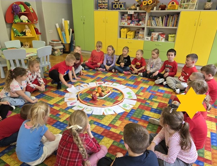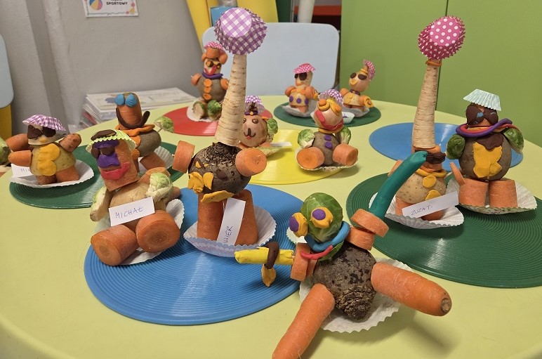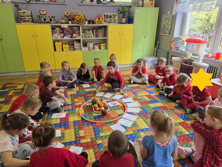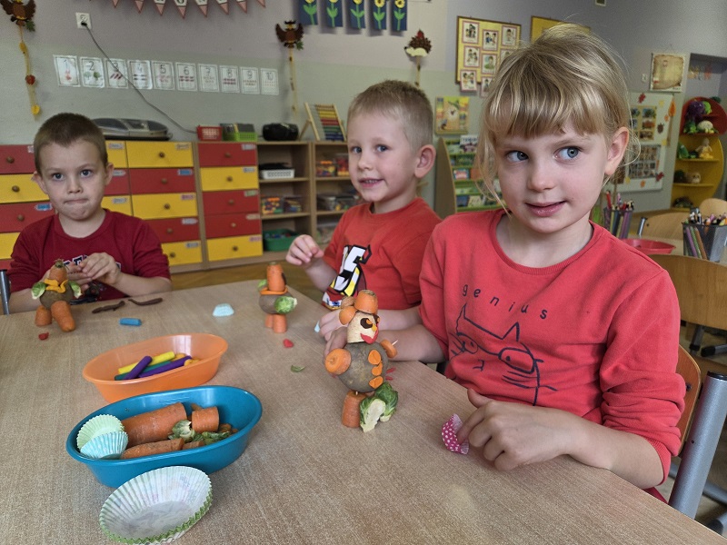 W dniach 6-9 października 2025r. grupa Biedronek wyruszyła w podróż po krainie Warzyw i Owoców. Przedszkolaki ćwiczyły do piosenki – Jarzynowa gimnastyka, poszukiwały ukrytych owoców i warzyw, rozpoznawały je po dotyku oraz segregowały według wylosowanego koloru. Każdego dnia rozmawialiśmy o wybranym warzywie lub owocu, promując zdrowe odżywianie. Ponadto przedszkolaki wykazały się pomysłowością i inwencją twórczą podczas, tworzenia i konstruowania ludzików, stworków oraz zwierząt z warzyw i owoców.