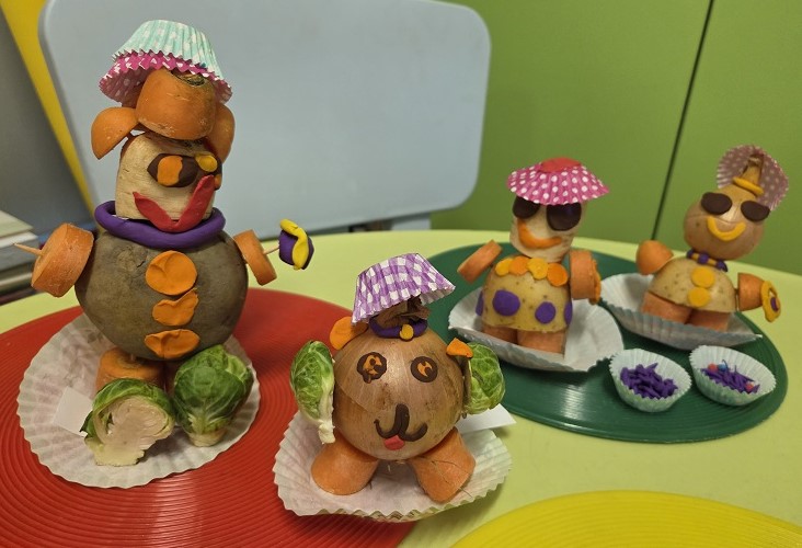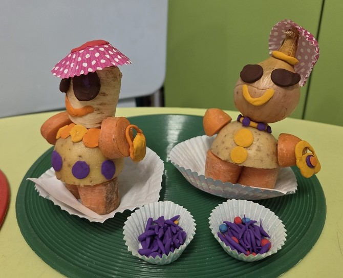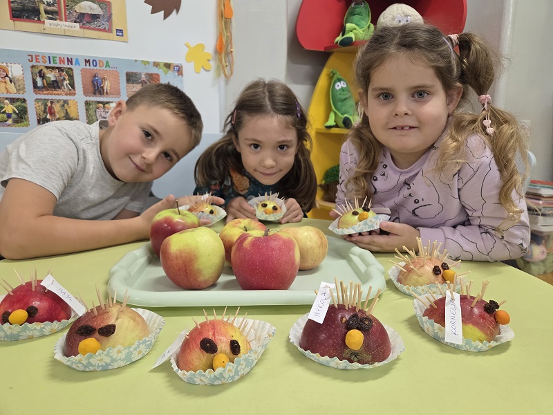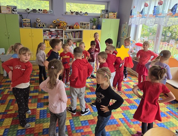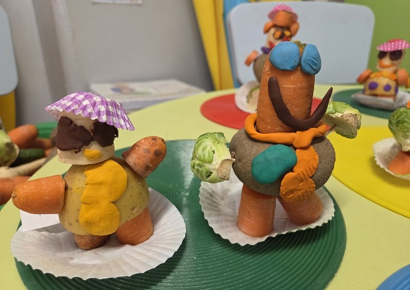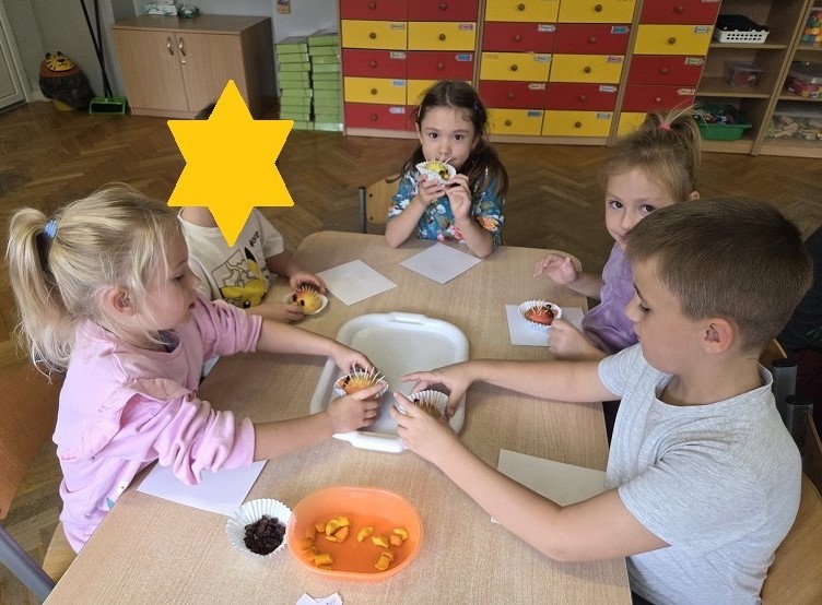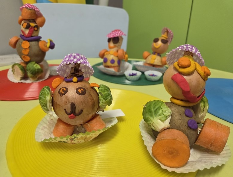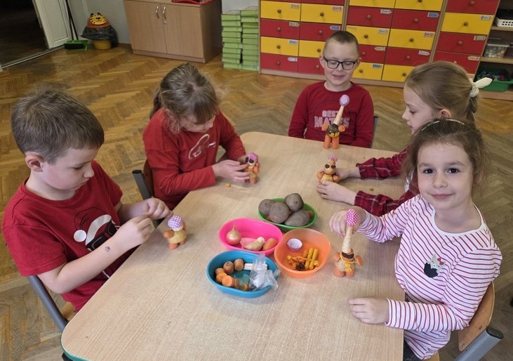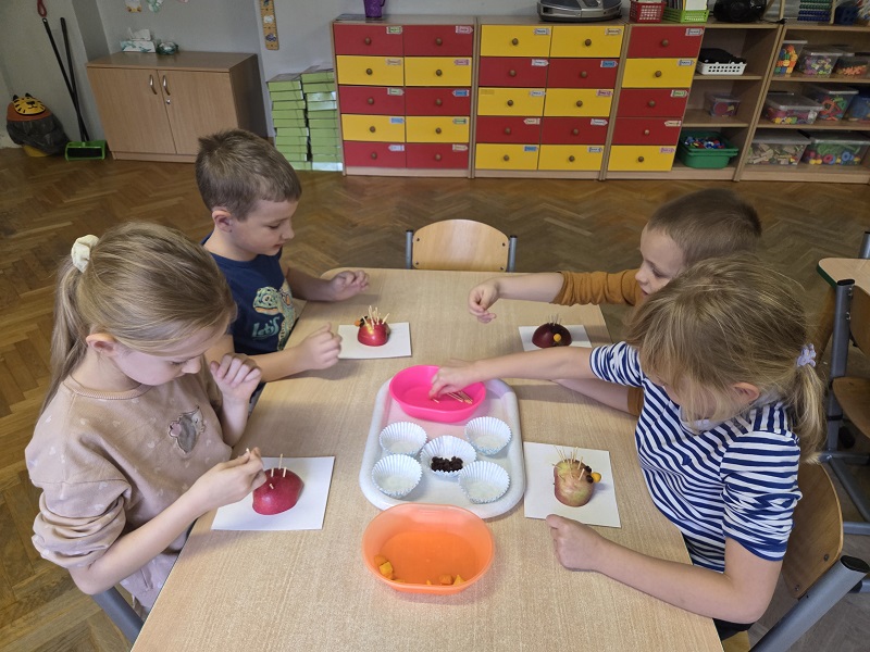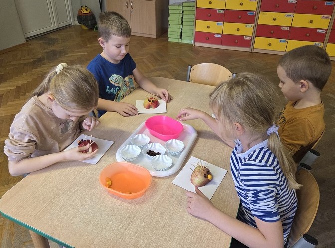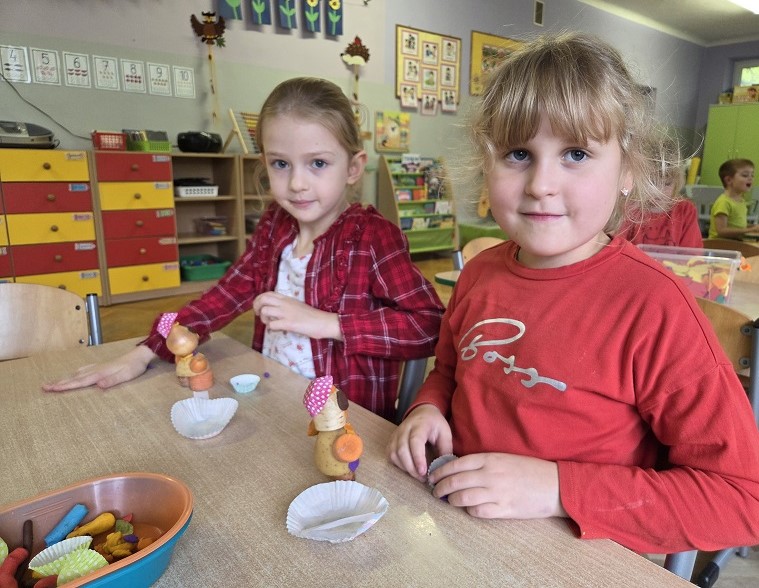 W dniach 6-9 października 2025r. grupa Biedronek wyruszyła w podróż po krainie Warzyw i Owoców. Przedszkolaki ćwiczyły do piosenki – Jarzynowa gimnastyka, poszukiwały ukrytych owoców i warzyw, rozpoznawały je po dotyku oraz segregowały według wylosowanego koloru. Każdego dnia rozmawialiśmy o wybranym warzywie lub owocu, promując zdrowe odżywianie. Ponadto przedszkolaki wykazały się pomysłowością i inwencją twórczą podczas, tworzenia i konstruowania ludzików, stworków oraz zwierząt z warzyw i owoców.