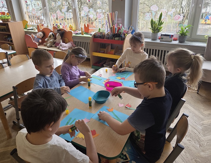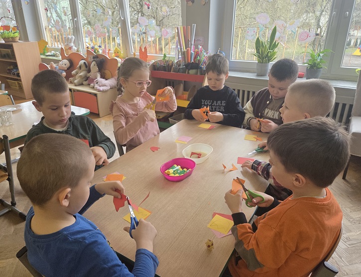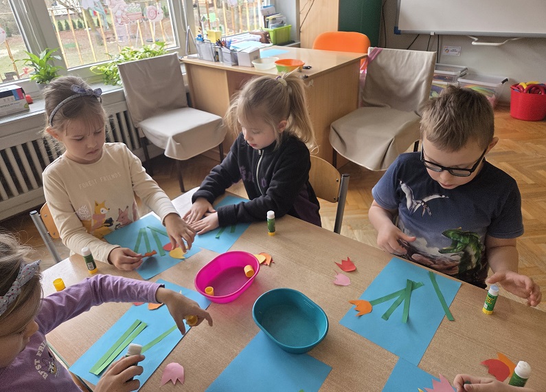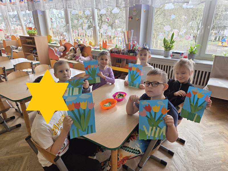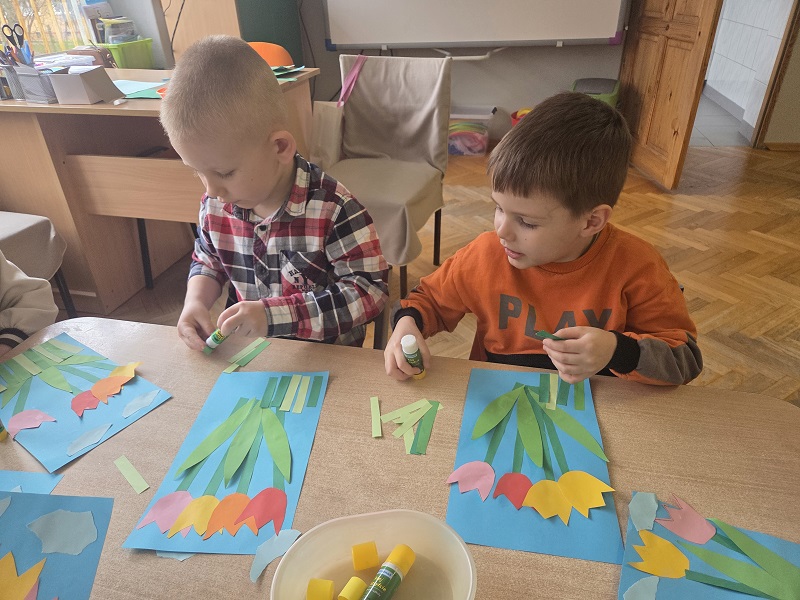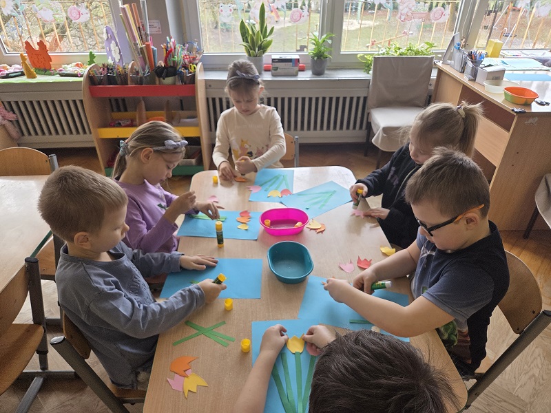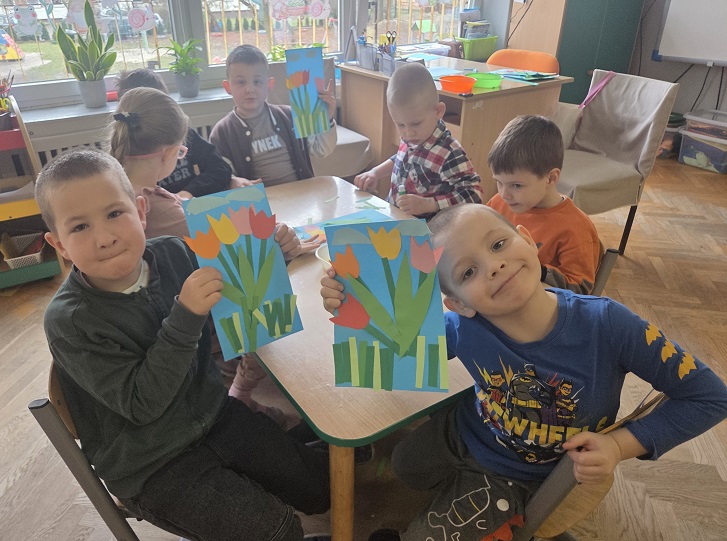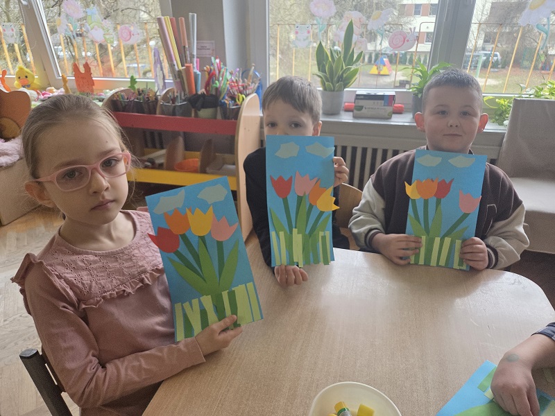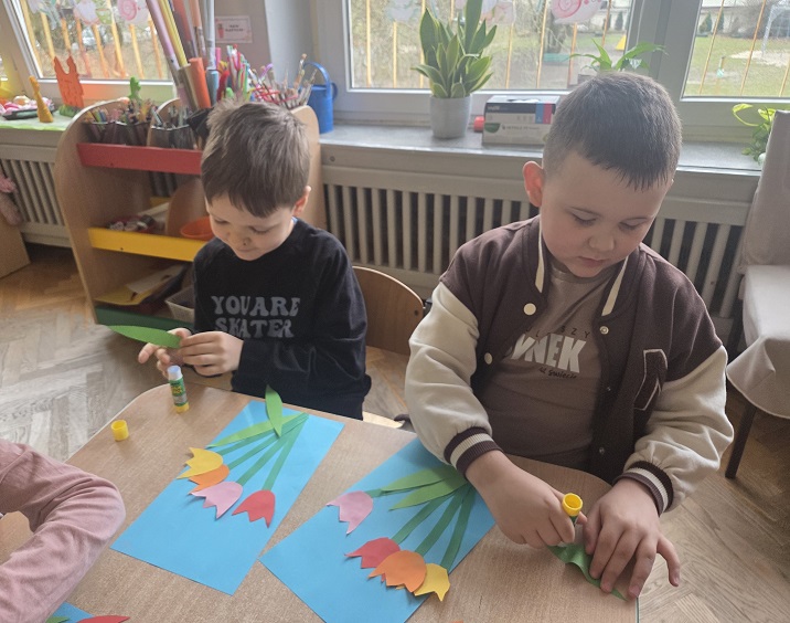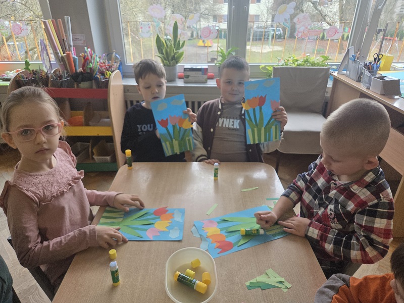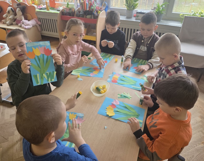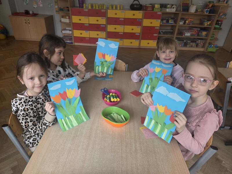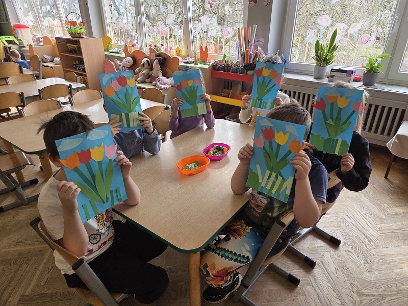 Przedszkolaki z grupy Biedronek w ramach zabaw plastycznych, stworzyły piękne kolorowe kwiaty. Z kolorowego papieru wycinały poszczególne elementy, naklejając i tworząc kompozycje, w ten sposób powstały wiosenne tulipany. Przedszkolaki wprowadziły do sali przedszkolnej prawdziwie wiosenny nastrój.