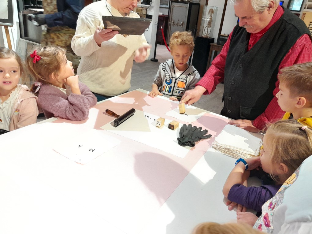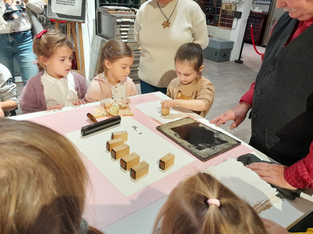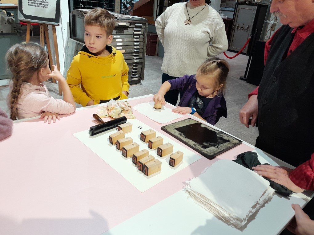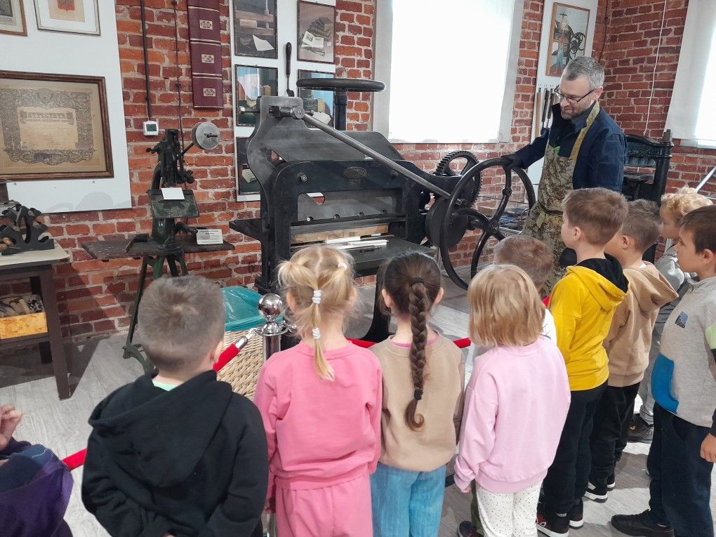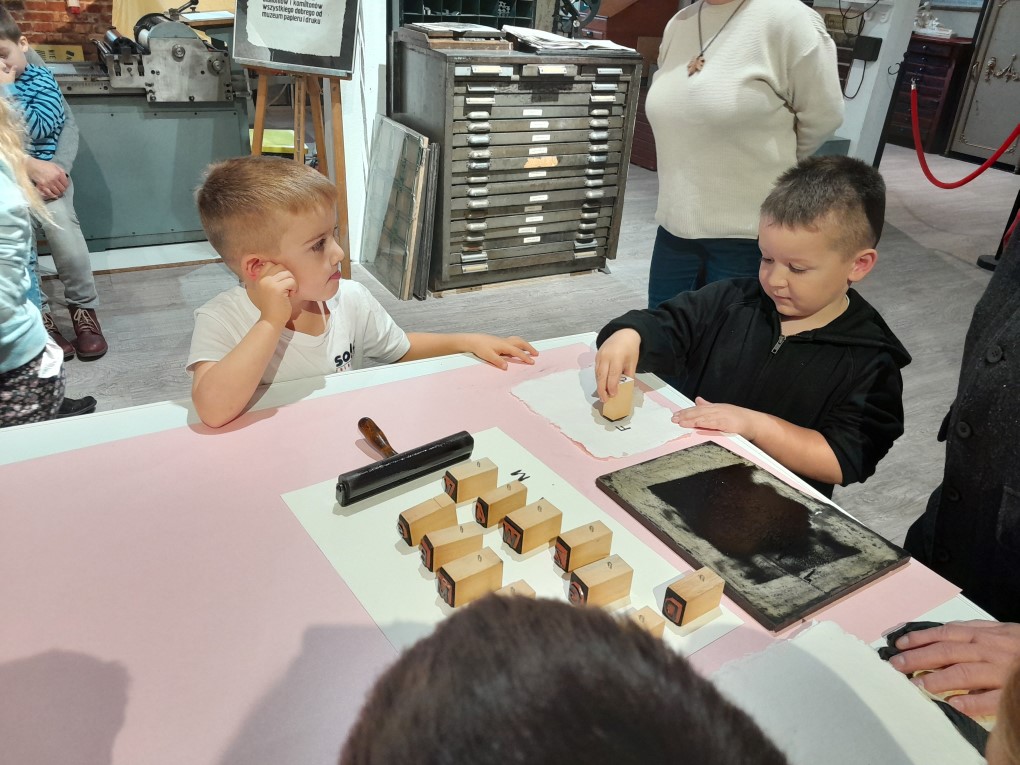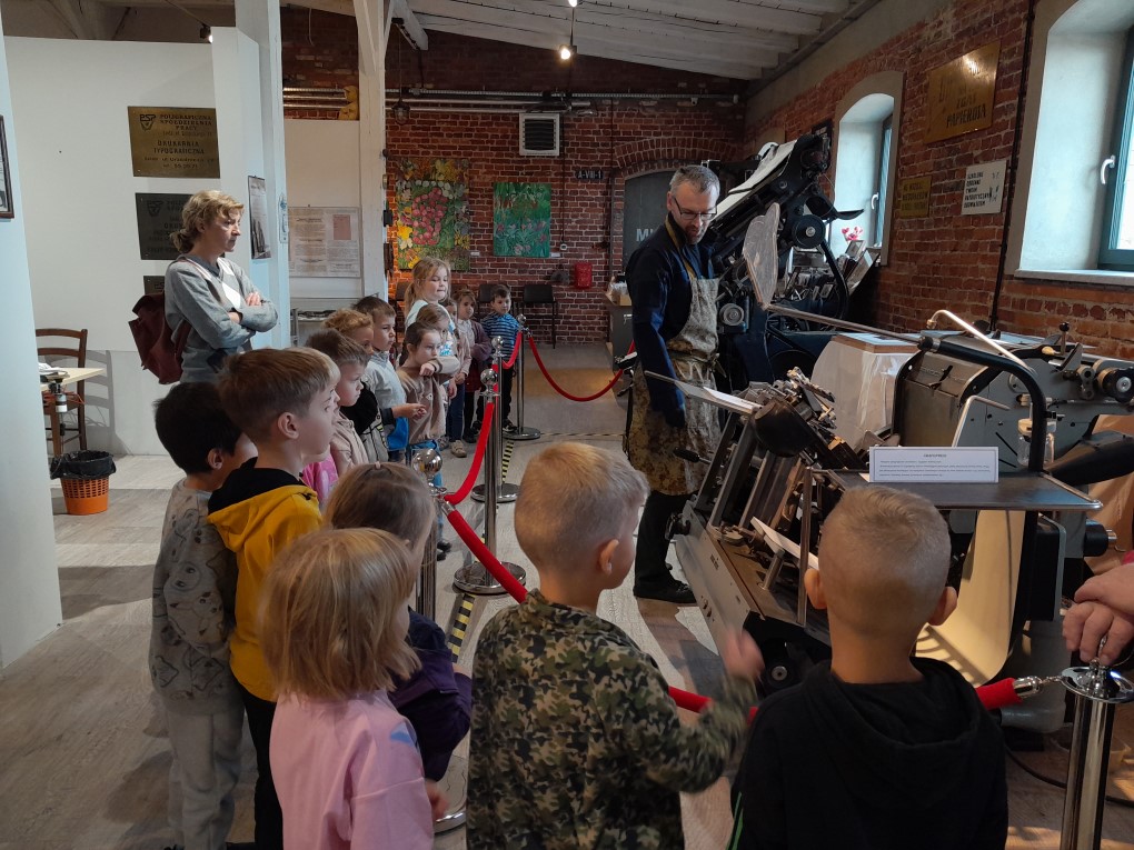 Podczas zwiedzania dzieci dowiedziały się, skąd bierze się papier i jak wyglądał proces jego tworzenia zanim pojawiły się nowoczesne maszyny. Poznały słowo "celuloza" i zobaczyły, jak z niej powstaje papier - nie tylko w teorii, ale także w praktyce. Każde dziecko mogło własnoręcznie stworzyć swój własny arkusz papieru czerpanego, zanurzając ramkę w pojemniku i z radością obserwując, jak powstaje coś z niczego! Kolejną atrakcją było odbijanie inicjałów za pomocą tradycyjnych czcionek drukarskich, które dzieci smarowały tuszem, a następnie odbijały na papierze. Na zakończenie wycieczki dzieci z zaciekawieniem obejrzały imponujące maszyny drukarskie zgromadzone w muzeum.