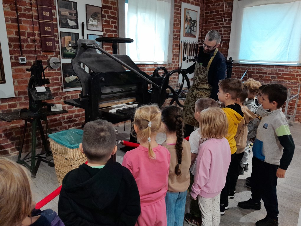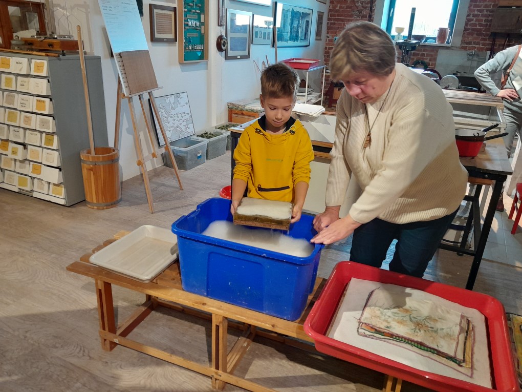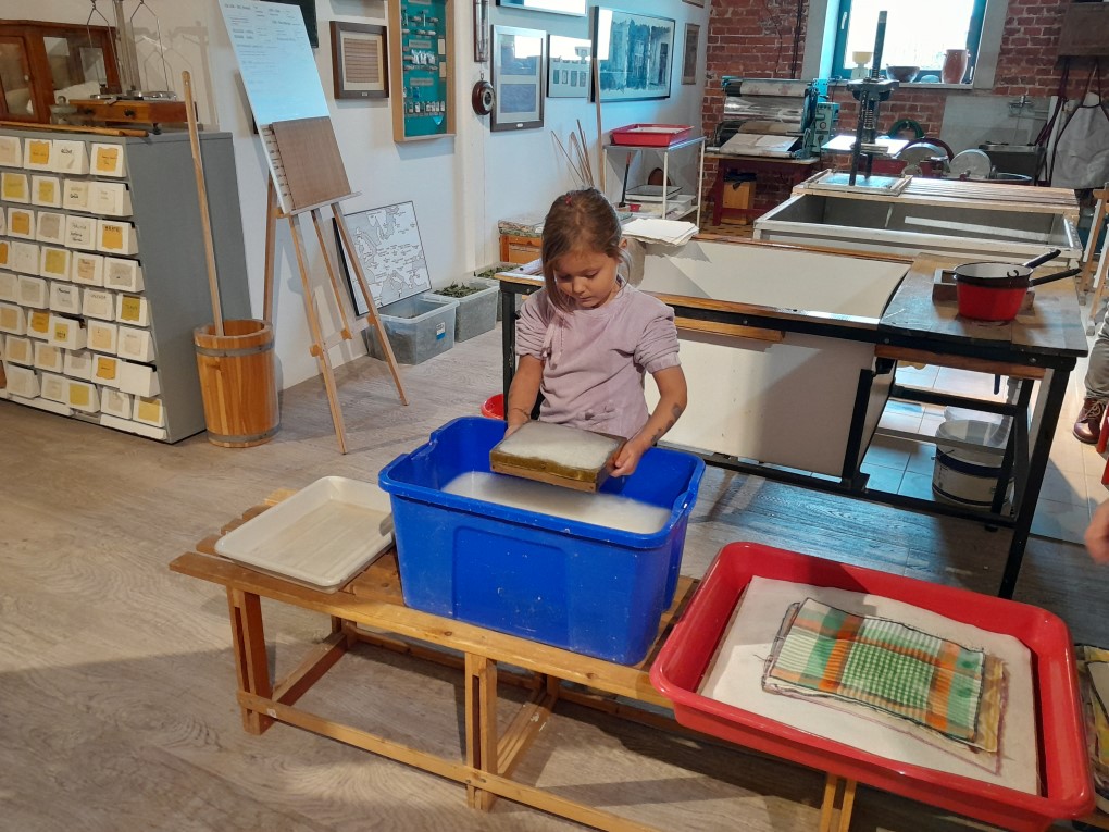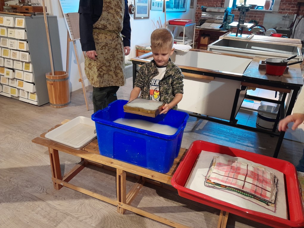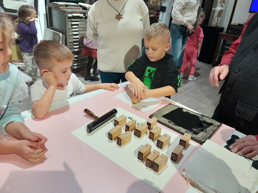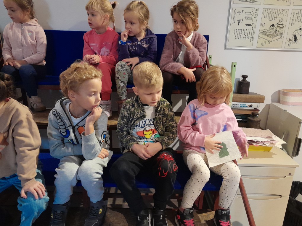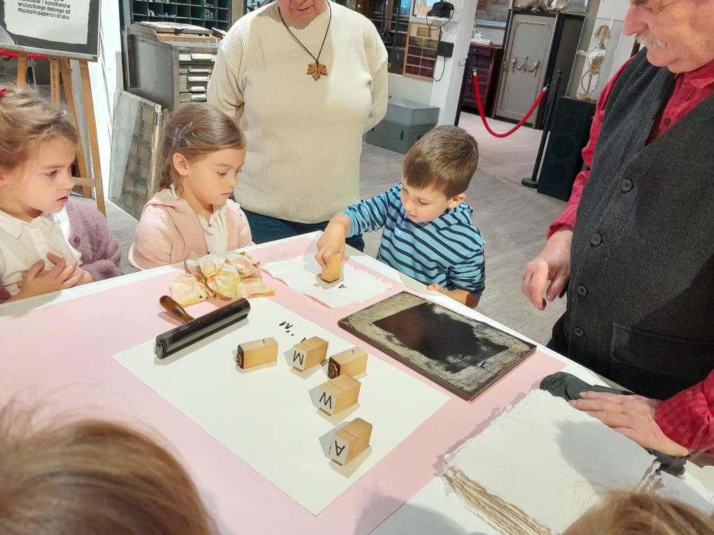 Podczas zwiedzania dzieci dowiedziały się, skąd bierze się papier i jak wyglądał proces jego tworzenia zanim pojawiły się nowoczesne maszyny. Poznały słowo "celuloza" i zobaczyły, jak z niej powstaje papier - nie tylko w teorii, ale także w praktyce. Każde dziecko mogło własnoręcznie stworzyć swój własny arkusz papieru czerpanego, zanurzając ramkę w pojemniku i z radością obserwując, jak powstaje coś z niczego! Kolejną atrakcją było odbijanie inicjałów za pomocą tradycyjnych czcionek drukarskich, które dzieci smarowały tuszem, a następnie odbijały na papierze. Na zakończenie wycieczki dzieci z zaciekawieniem obejrzały imponujące maszyny drukarskie zgromadzone w muzeum.