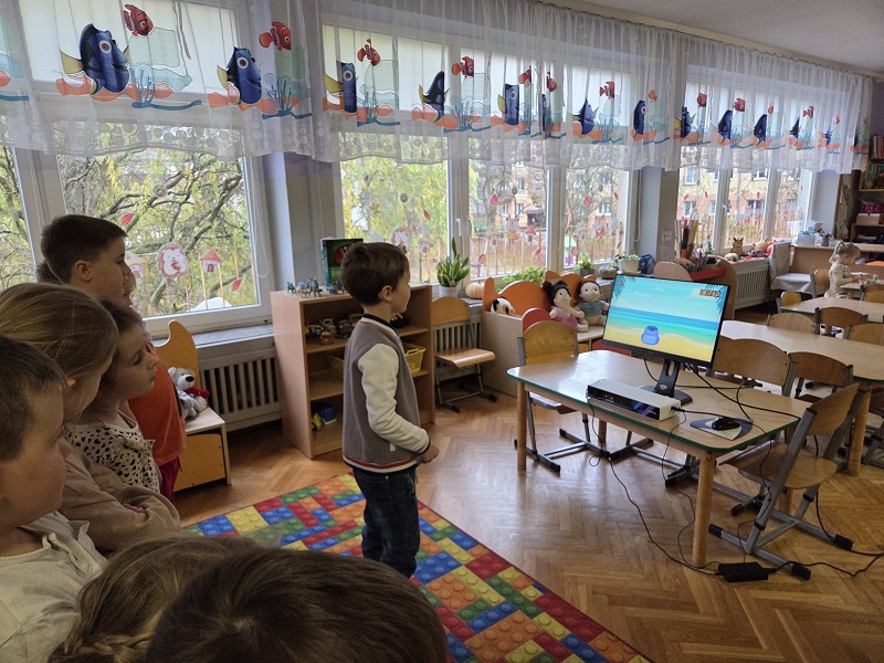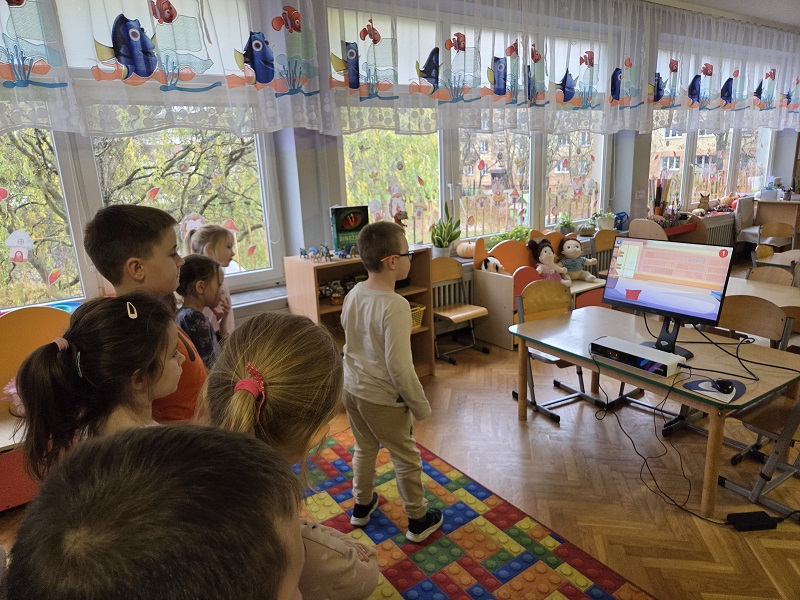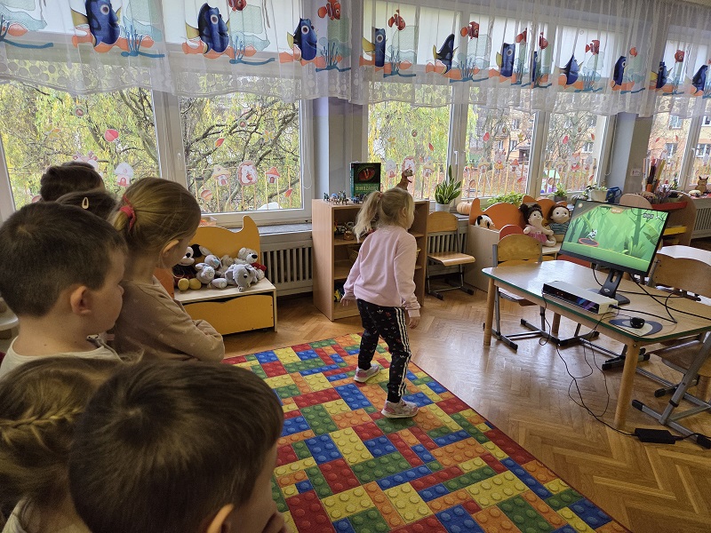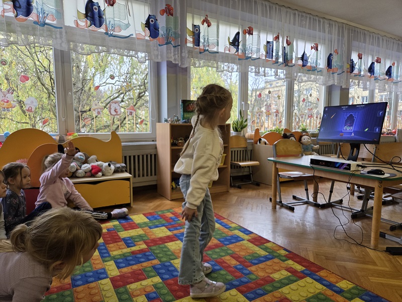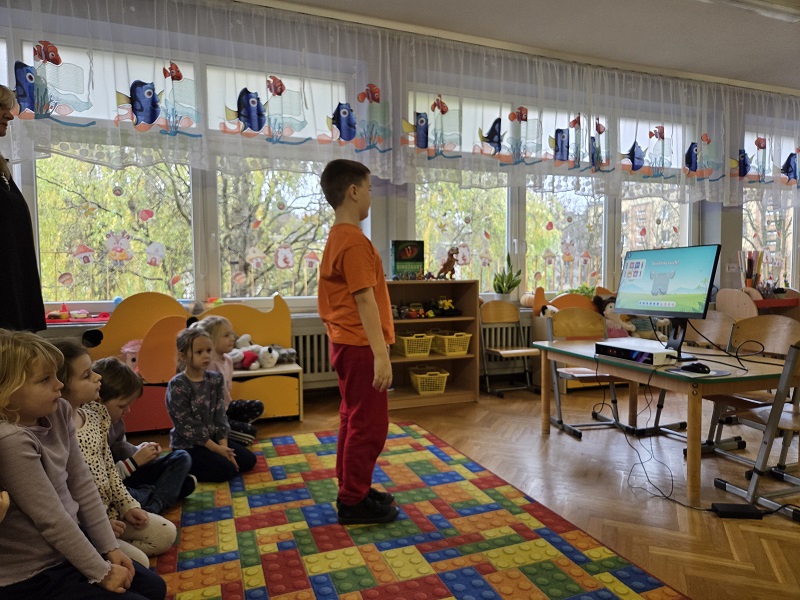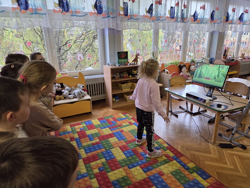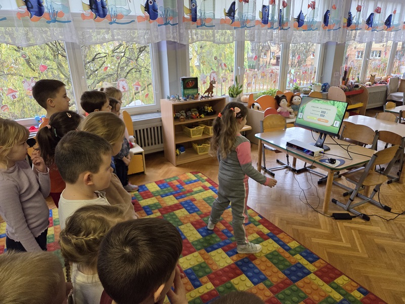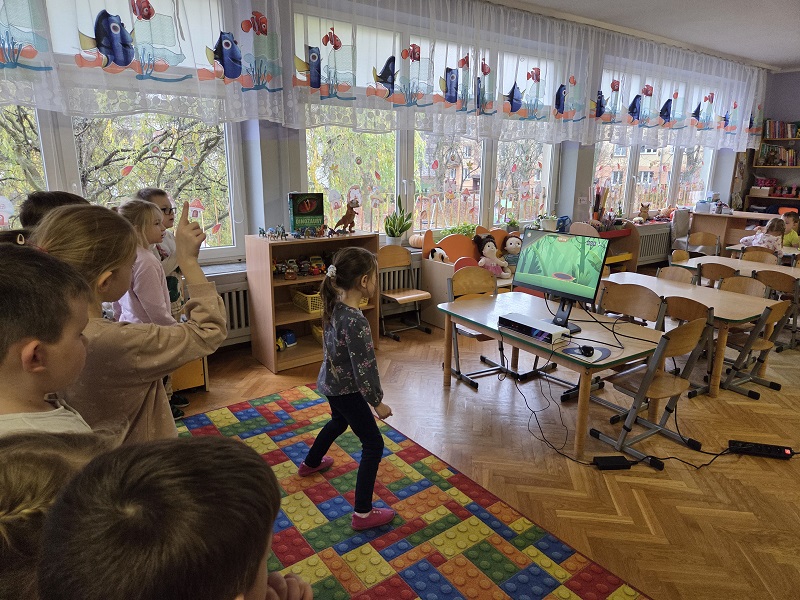W dniu 17 listopada 2025 r. grupa Biedronek uczestniczyła w zabawach interaktywnych – “Ale emocje”, “W stylu pandy”, “Na zakupach”, “Pogodowa moda”, “Małe historyjki – w ogrodzie zoologicznym” oraz “Cztery pory roku”, z wykorzystaniem urządzenia “MyWally”. To nowoczesna konsola edukacyjna do gier sterowana ruchem, wykorzystująca zaawansowane technologię śledzenia ruchu, umożliwiająca intuicyjne sterowanie obrazem za pomocą gestów ciała - rąk, nóg i tułowia. Dzieci bardzo chętnie uczestniczyły w zabawach rozwijając motorykę dużą, koordynację wzrokowo-ruchową, logiczne myślenie, kompetencje językowe i matematyczne.