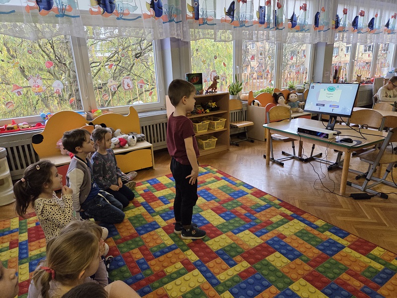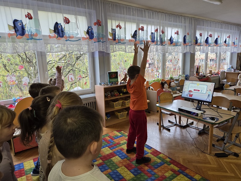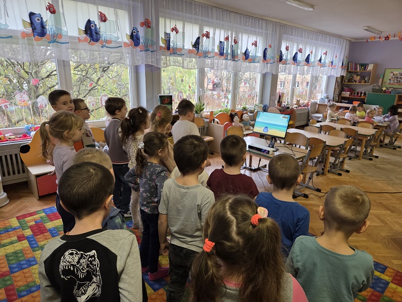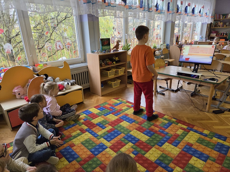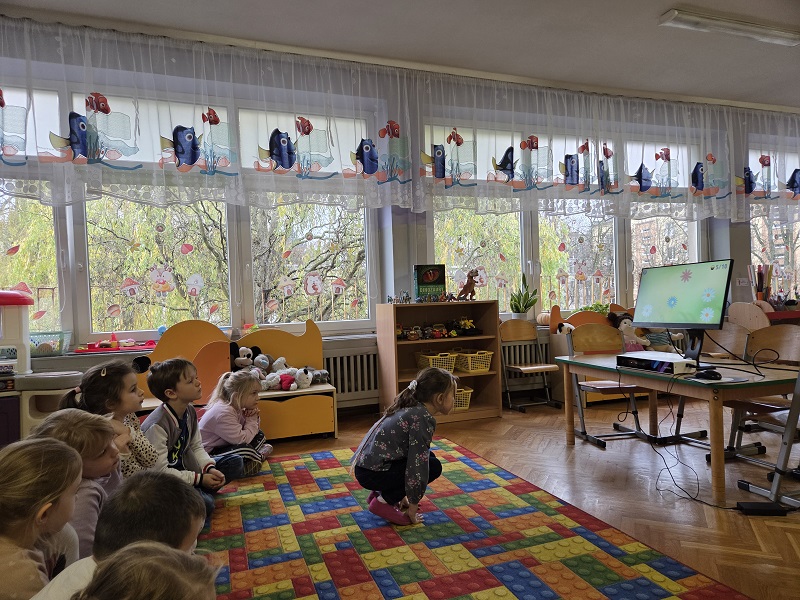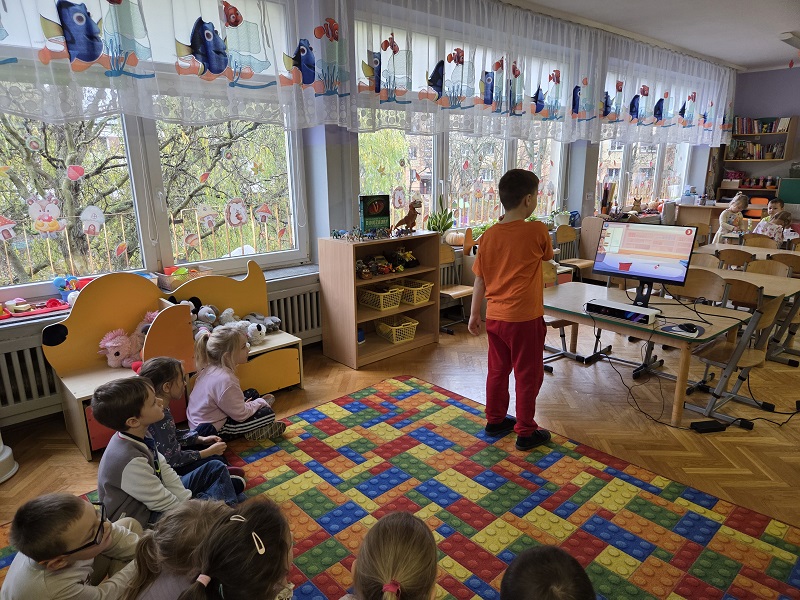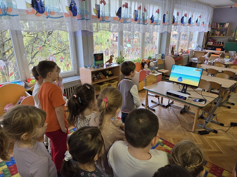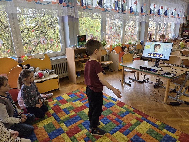 W dniu 17 listopada 2025 r. grupa Biedronek uczestniczyła w zabawach interaktywnych – “Ale emocje”, “W stylu pandy”, “Na zakupach”, “Pogodowa moda”, “Małe historyjki – w ogrodzie zoologicznym” oraz “Cztery pory roku”, z wykorzystaniem urządzenia “MyWally”. To nowoczesna konsola edukacyjna do gier sterowana ruchem, wykorzystująca zaawansowane technologię śledzenia ruchu, umożliwiająca intuicyjne sterowanie obrazem za pomocą gestów ciała - rąk, nóg i tułowia. Dzieci bardzo chętnie uczestniczyły w zabawach rozwijając motorykę dużą, koordynację wzrokowo-ruchową, logiczne myślenie, kompetencje językowe i matematyczne.